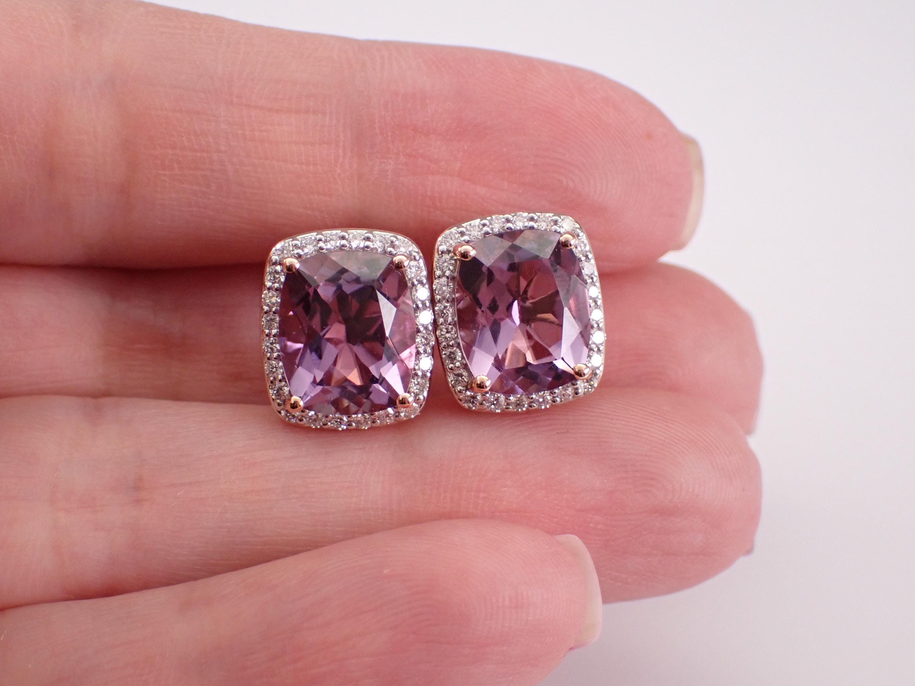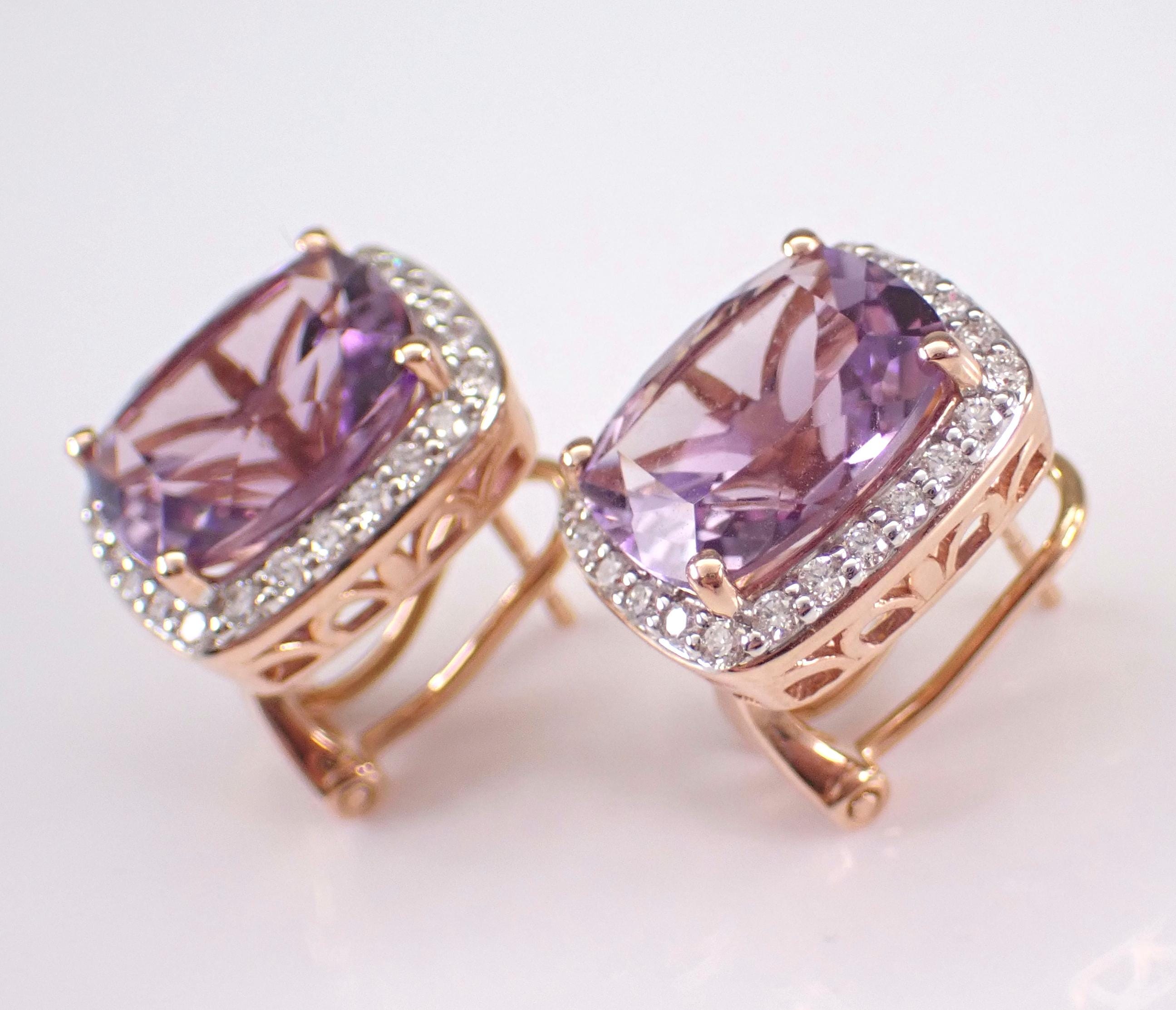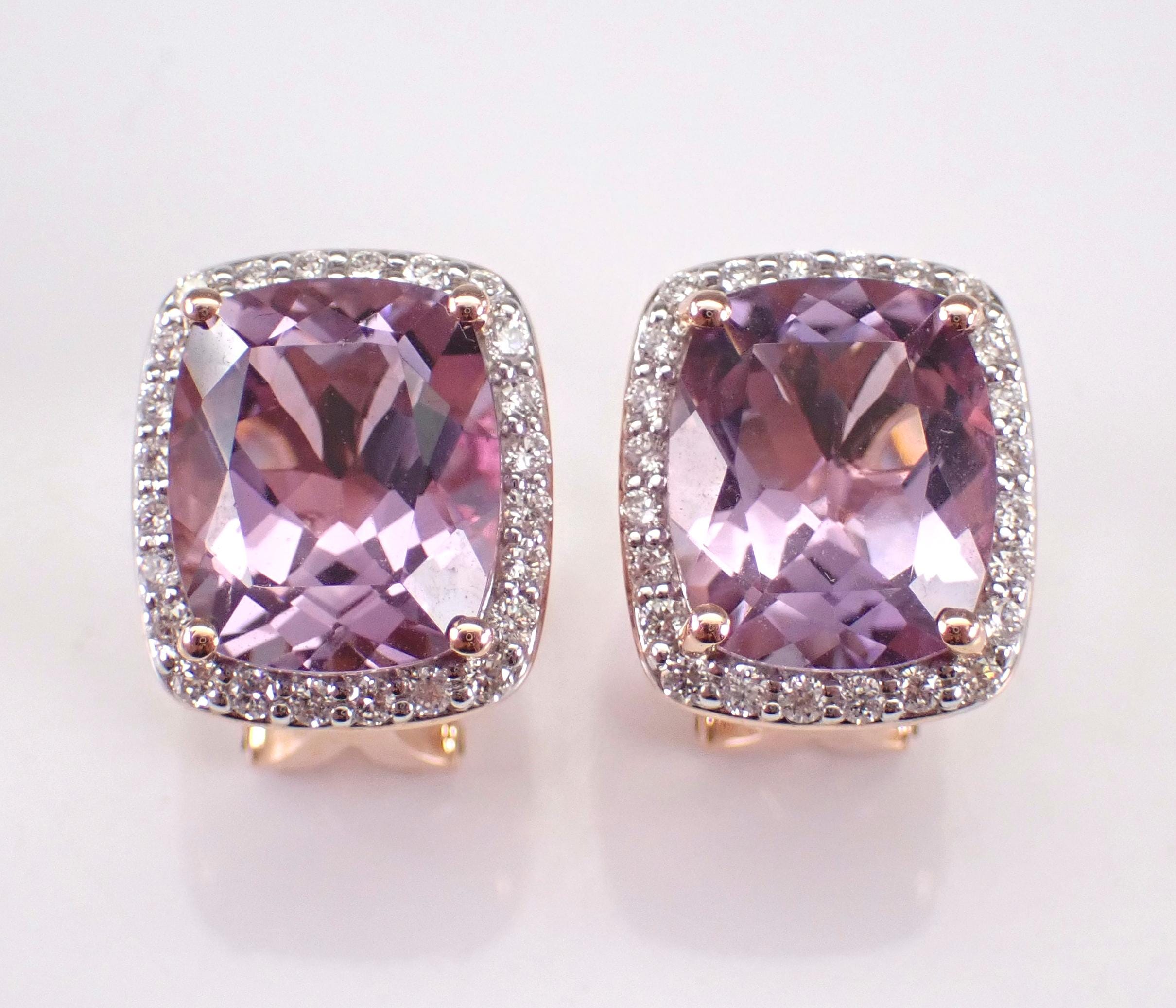 14K Rose Gold Diamond and Amethyst Earrings. These earrings are set with two genuine Cushion Cut Amethysts and forty-eight natural Round Brilliant Diamonds. These diamonds are G color, SI clarity and weigh a total of 1/2 carat. The Amethysts in these earrings are a beautiful Lavender color, measure 11 X 9 mm in each and weigh a total of 7 carats. These earrings are 14KT Rose Gold and weigh a total of 6.6 grams. The earrings measure 13.5 X 11.5 mm each, are for pierced ears and have very secure Omega clasps. These earrings will be accompanied by an appraisal written by a GIA Certified Diamond Grader with the retail replacement value of $3,495.00. I will ship these earrings promptly in a gift box.