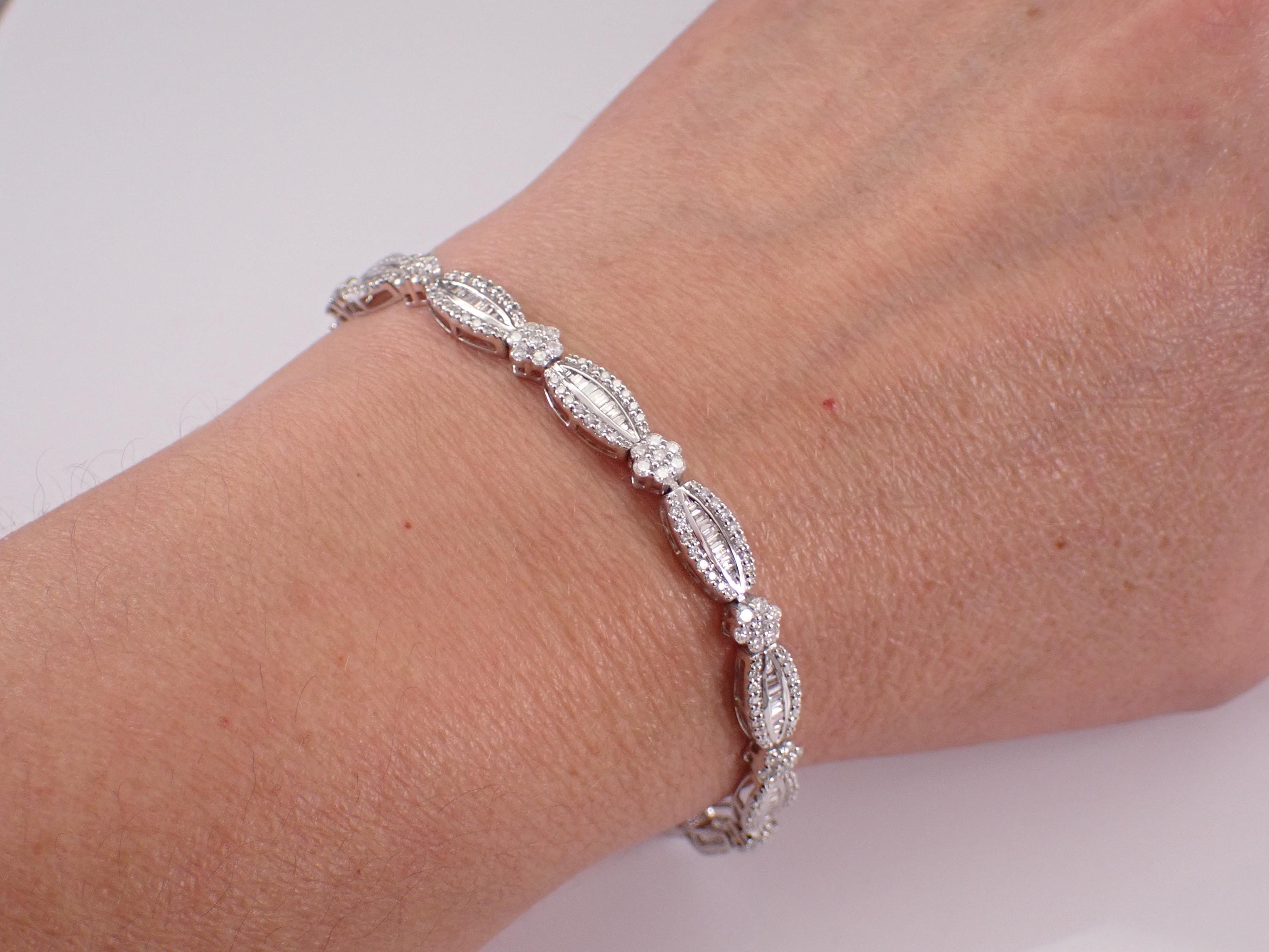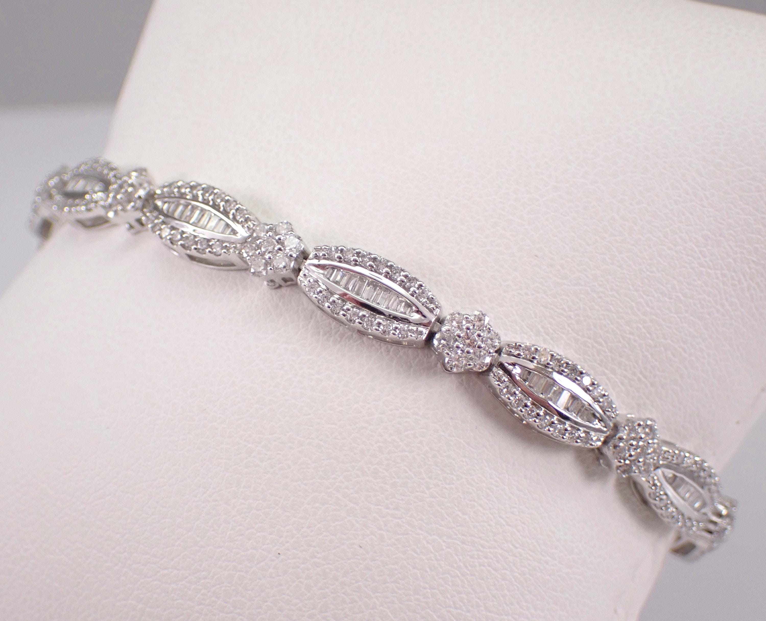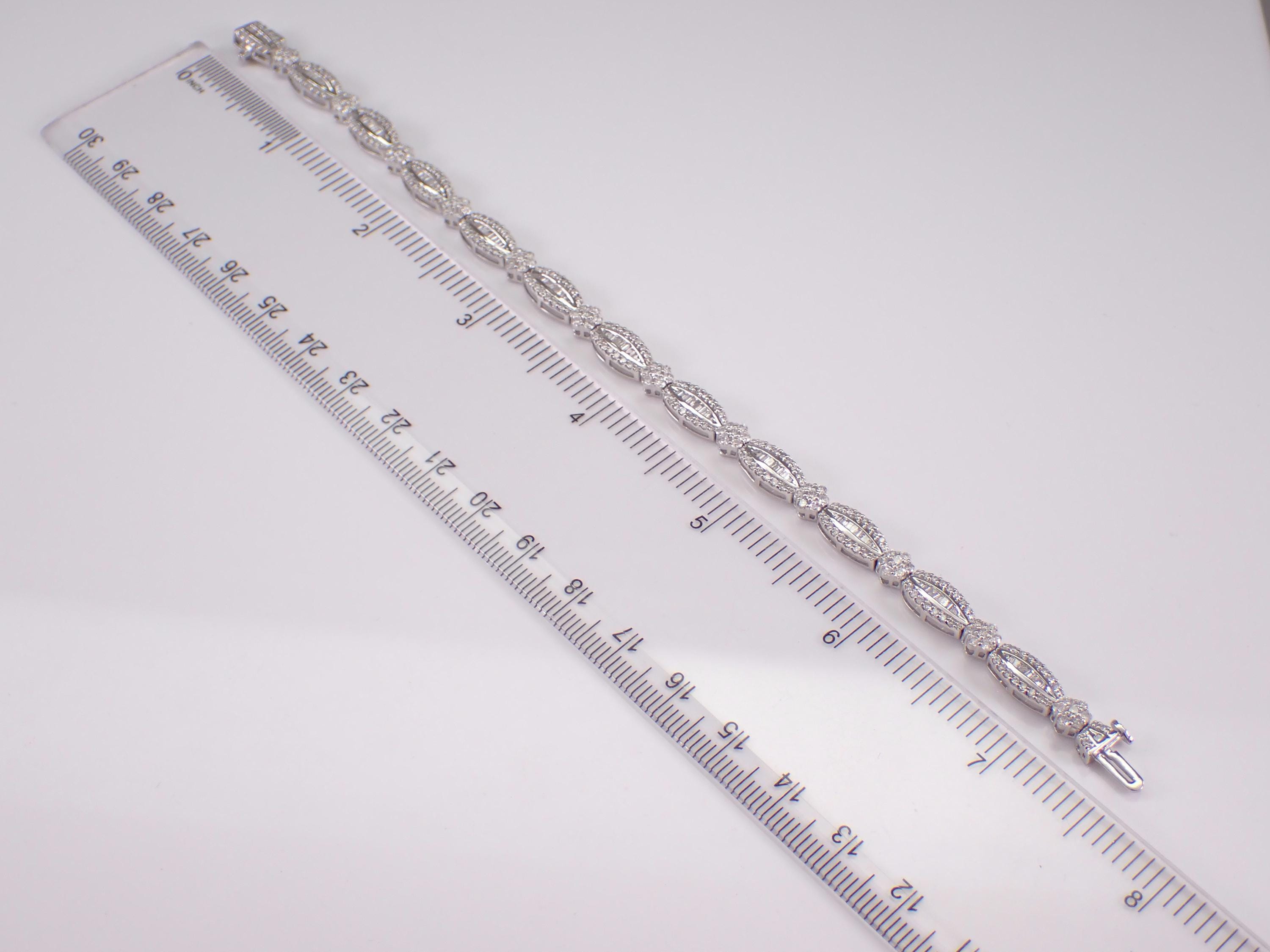 White Gold Diamond Tennis Bracelet. This bracelet is set with one hundred and eight (108) natural Baguette Diamonds and two hundred and fifty-two (252) genuine Round Brilliant Diamonds. These diamonds are H color, SI/I1 clarity and weigh a total of 3.00 carats. This bracelet is 10K White Gold, weighs 10.6 grams, measures 6 mm in width and 7" in length. This bracelet will be accompanied by an appraisal by a GIA Certified Diamond Grader with the retail replacement value of $7,495.00. I will ship this bracelet promptly in a gift box.