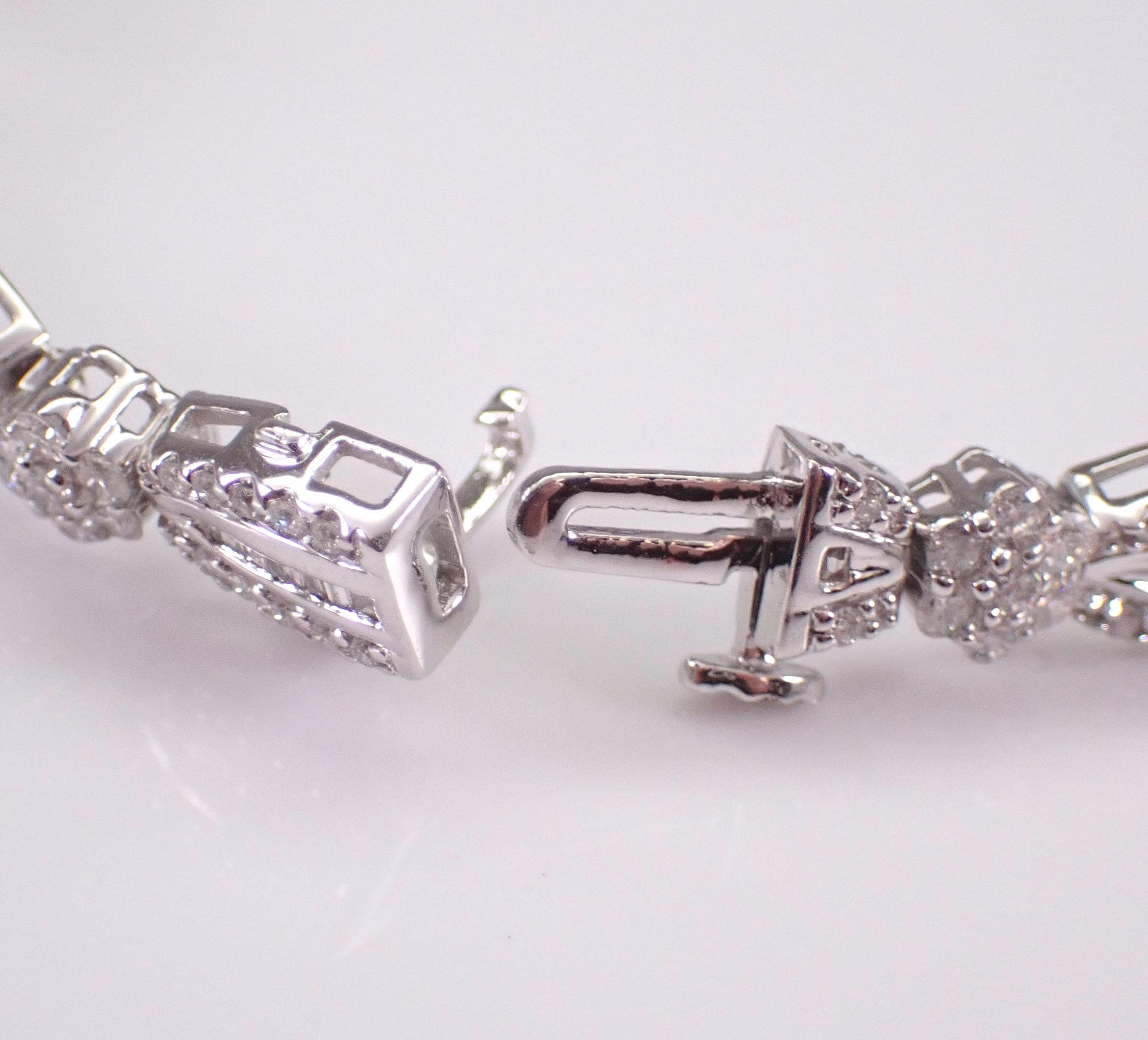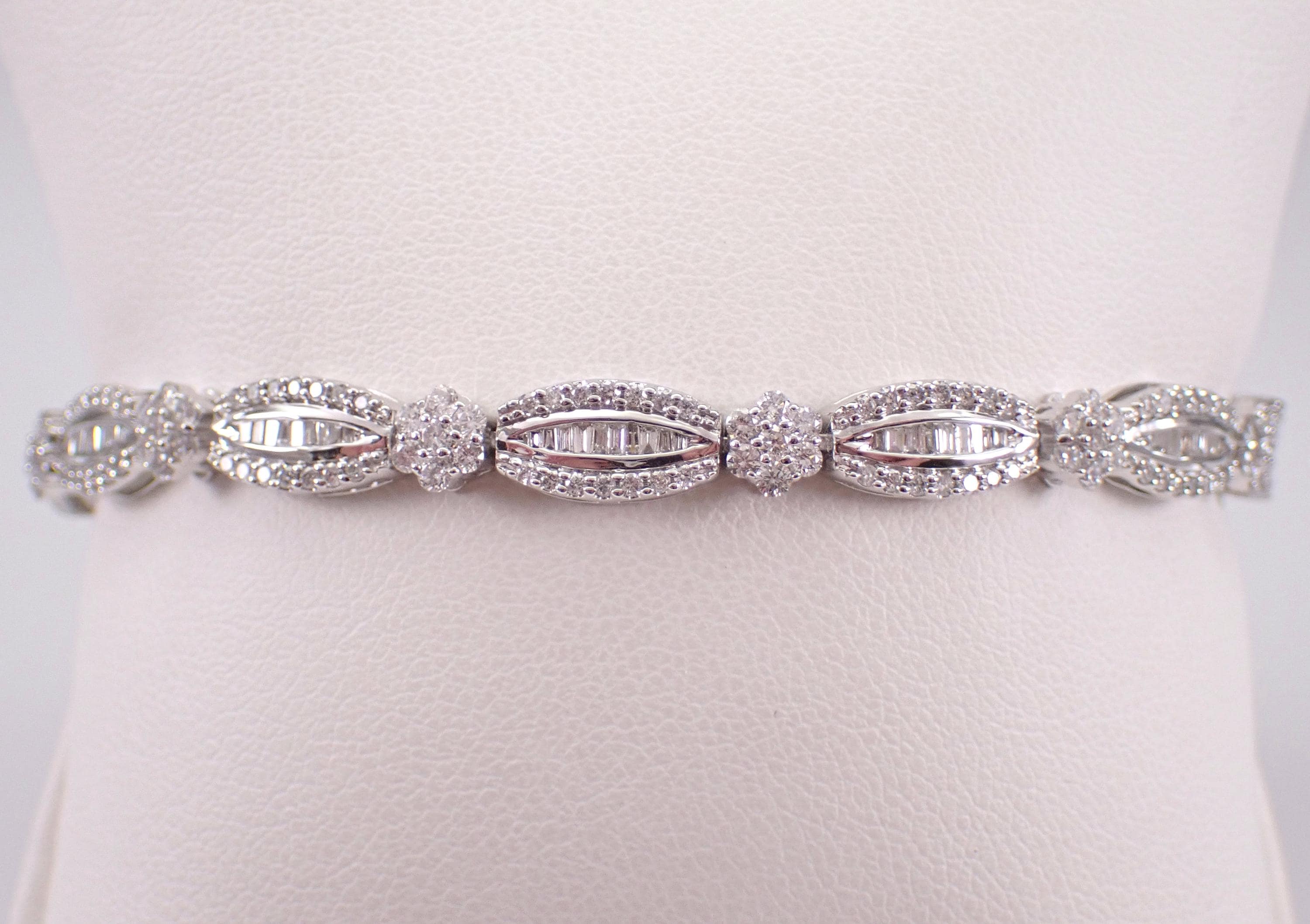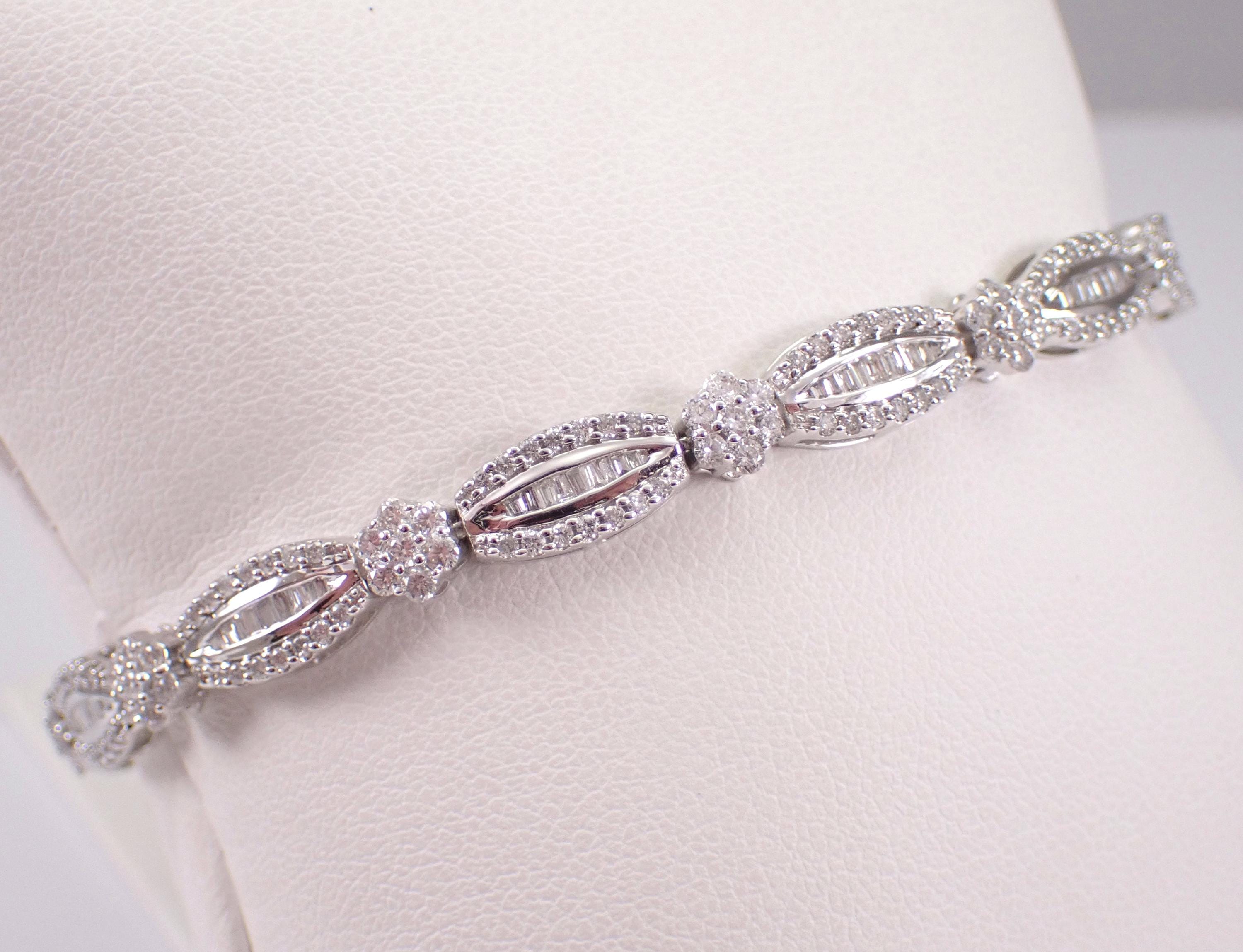 White Gold Diamond Tennis Bracelet. This bracelet is set with one hundred and eight (108) natural Baguette Diamonds and two hundred and fifty-two (252) genuine Round Brilliant Diamonds. These diamonds are H color, SI/I1 clarity and weigh a total of 3.00 carats. This bracelet is 10K White Gold, weighs 10.6 grams, measures 6 mm in width and 7" in length. This bracelet will be accompanied by an appraisal by a GIA Certified Diamond Grader with the retail replacement value of $7,495.00. I will ship this bracelet promptly in a gift box.