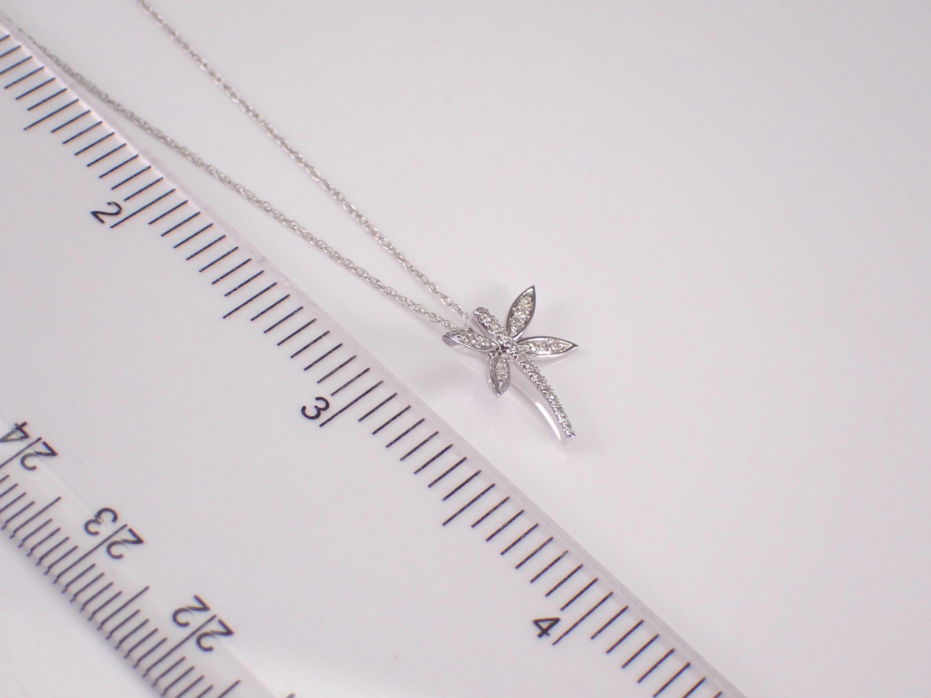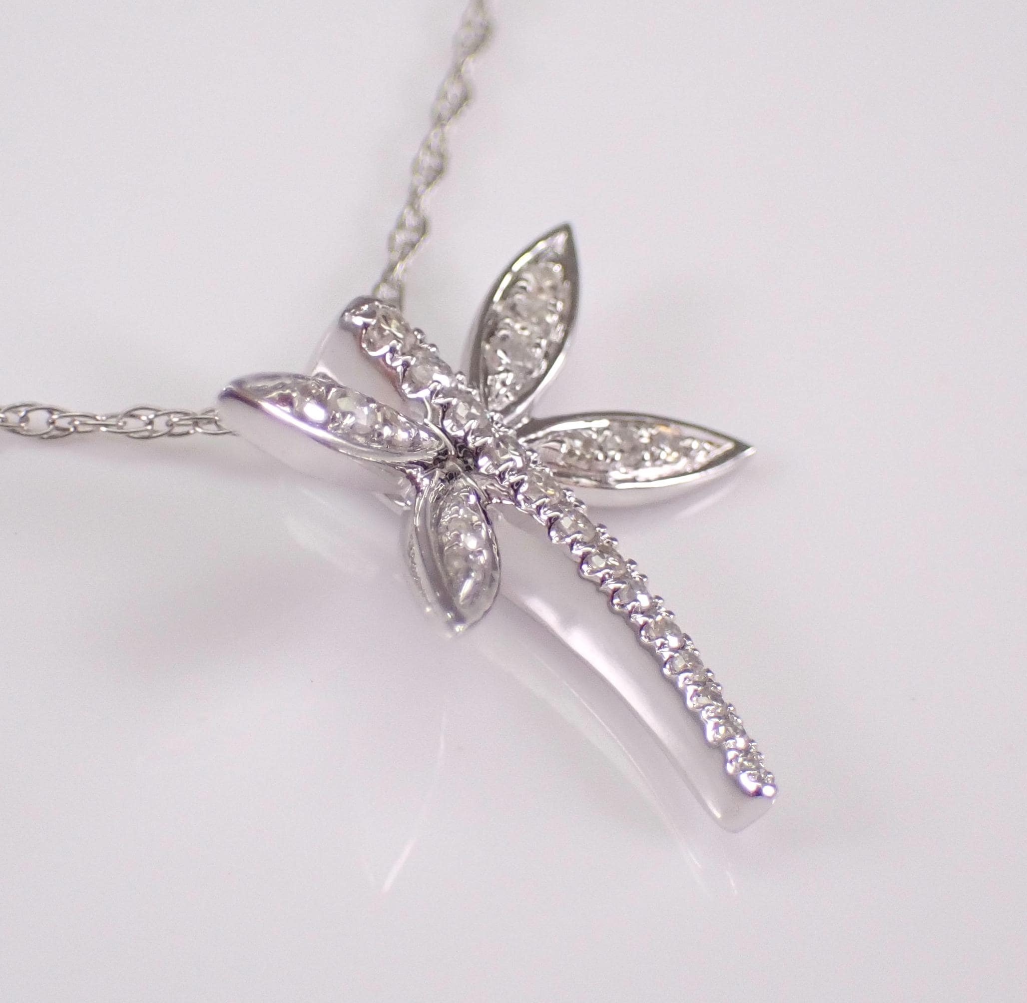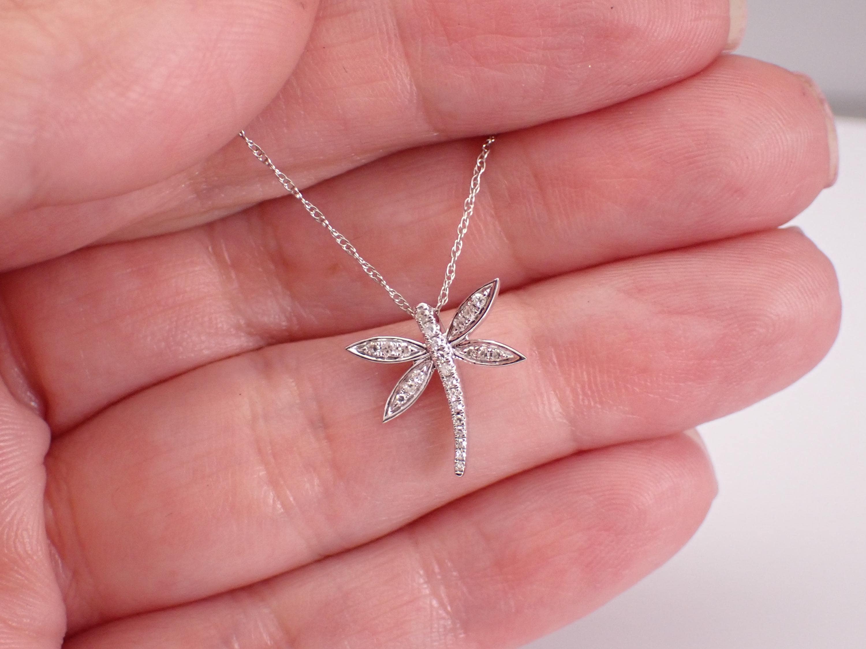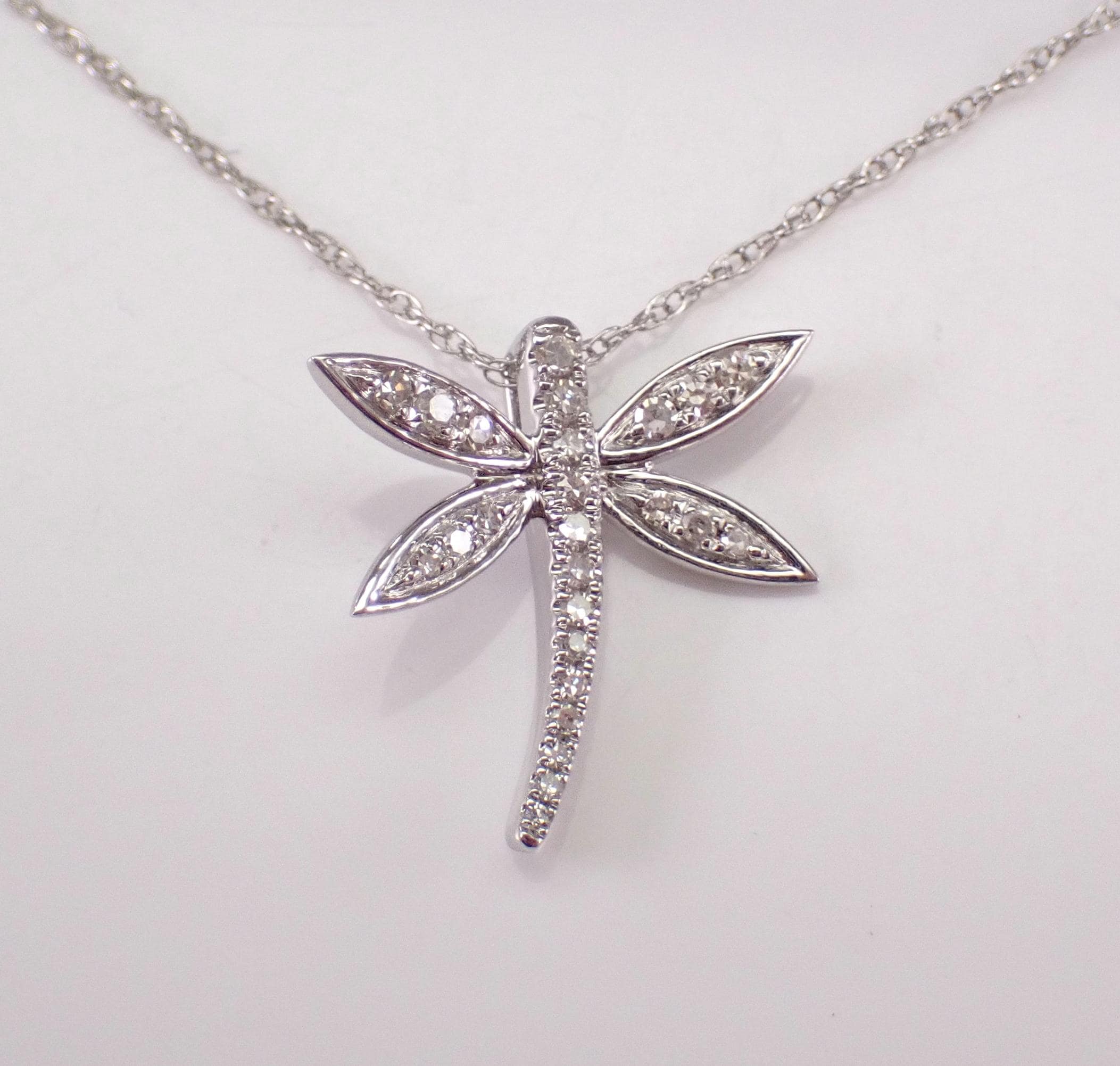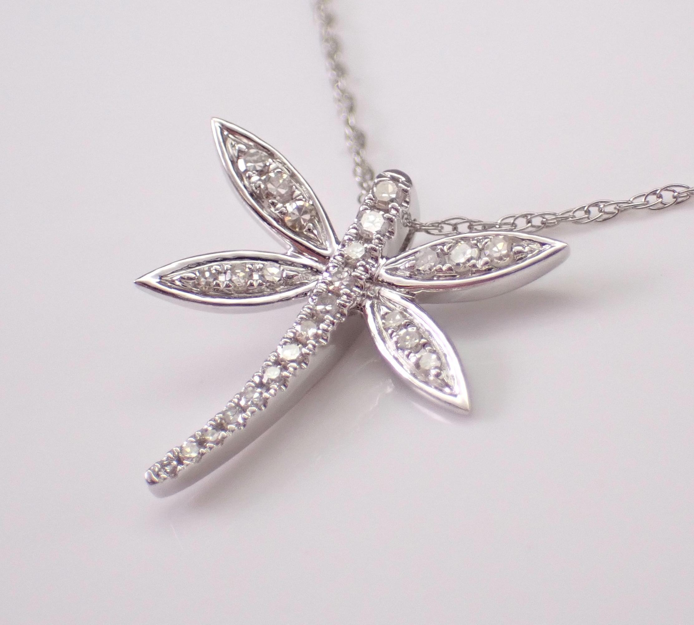 Solid White Gold Diamond Dragonfly Pendant Necklace with Chain. This pendant is set with twenty-five genuine round brilliant diamonds. These diamonds are G color, SI clarity and weigh a total of .12 carat. This pendant is 10KT White Gold and comes with an 18" 10KT White Gold chain. Both the pendant and chain weigh a total of 1.2 grams and the dragonfly measures 13.5 X 13.5 mm. I will ship this necklace promptly in a beautiful gift box.