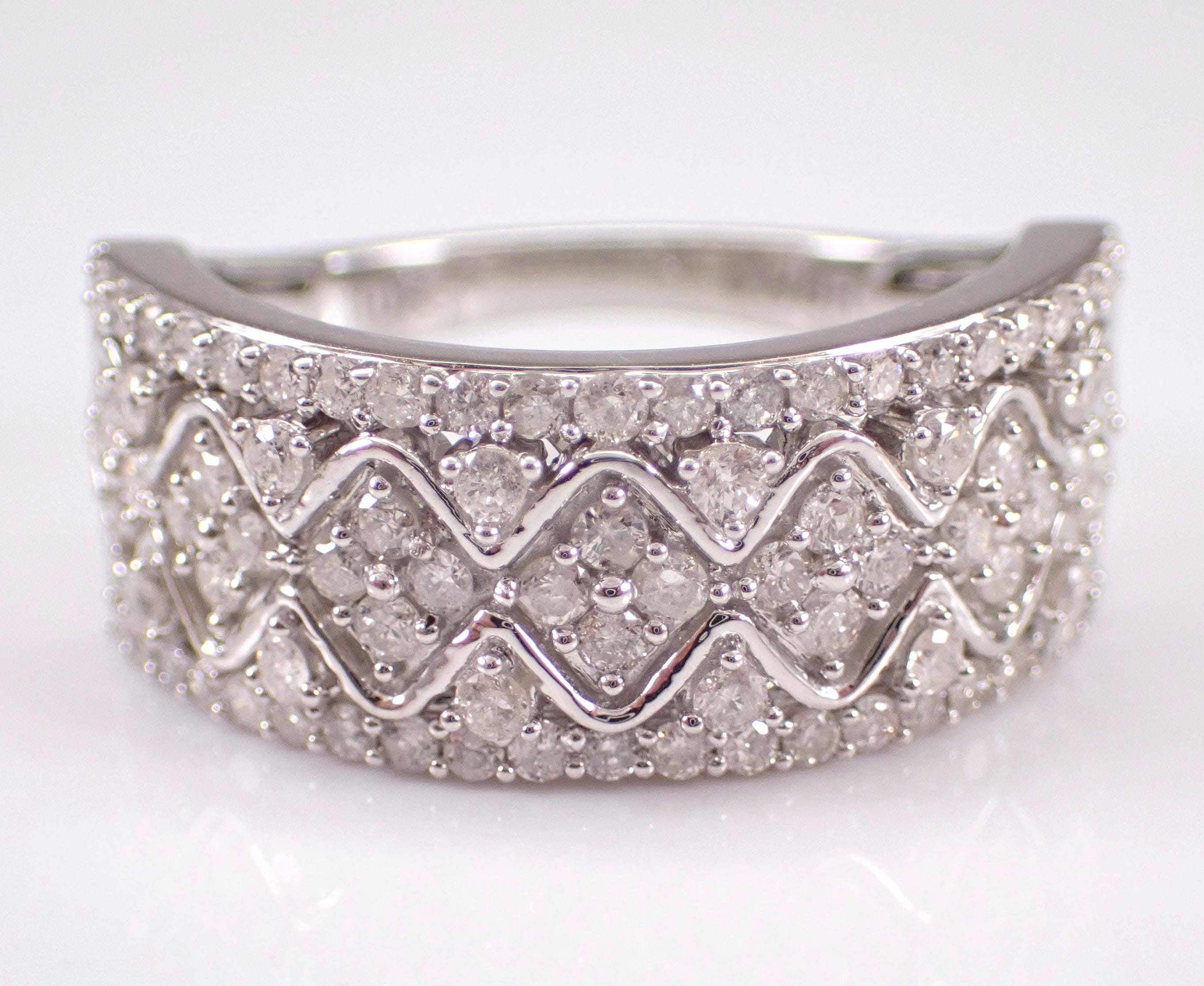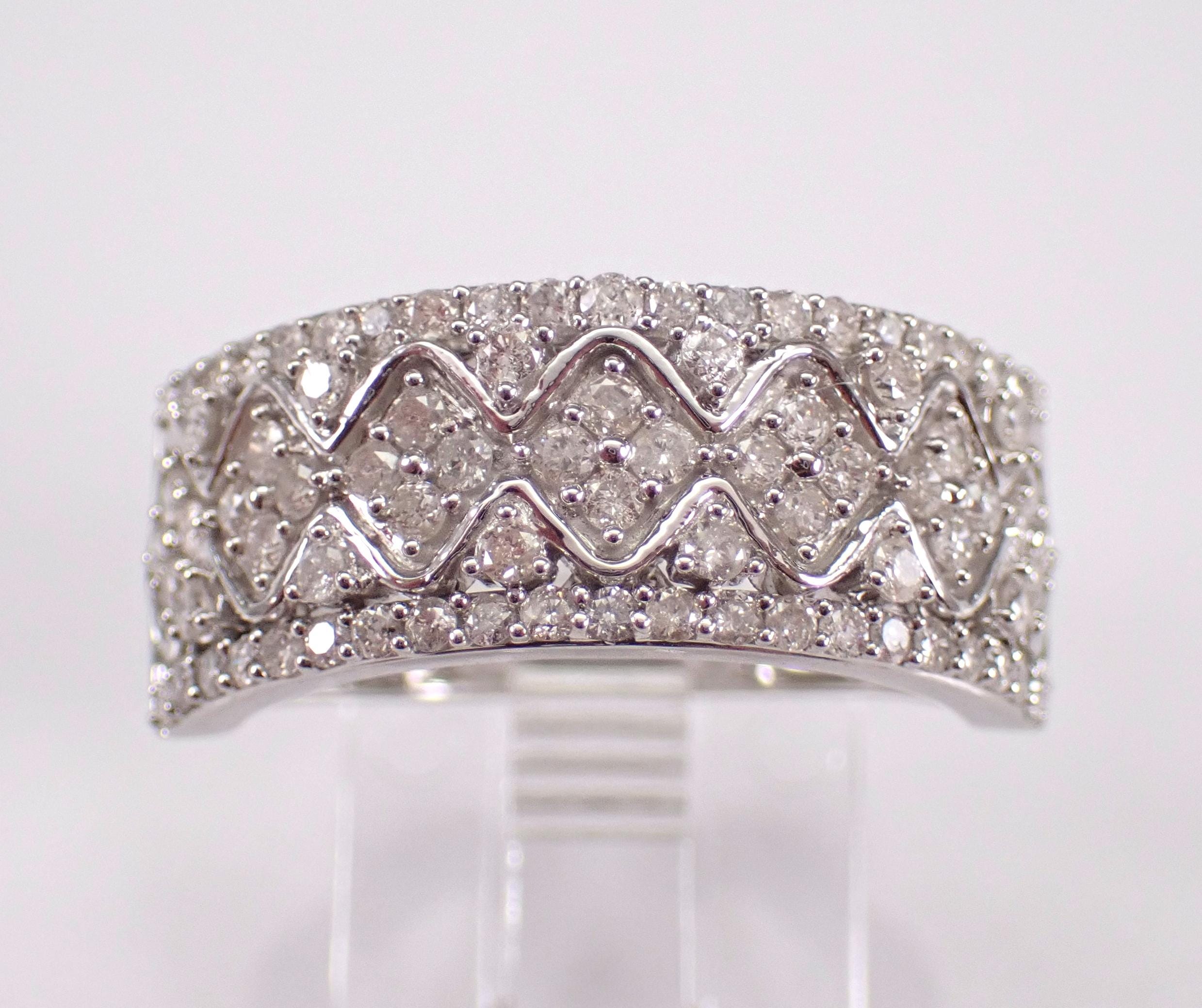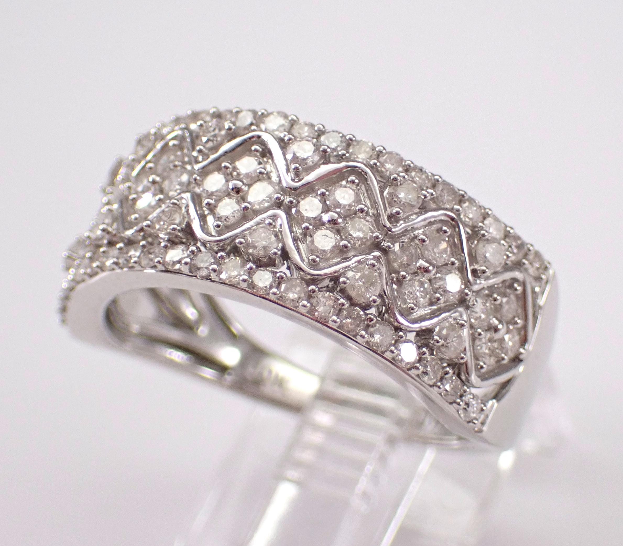 White Gold Diamond Wedding Ring Anniversary Band. This ring is set with eighty-two genuine round brilliant diamonds. These diamonds are H color, SI/I1 clarity and weigh a total of 3/4 carat. This ring is solid 10KT White Gold, weighs 4.2 grams, measures 8.5 mm in width and is a finger size 7, can be resized (please inquire about sizing with the finger size you need). This ring will be accompanied by an appraisal written by a GIA Certified Diamond Grader with the retail replacement value of $2,095.00. I will ship this ring promptly in a beautiful gift box.