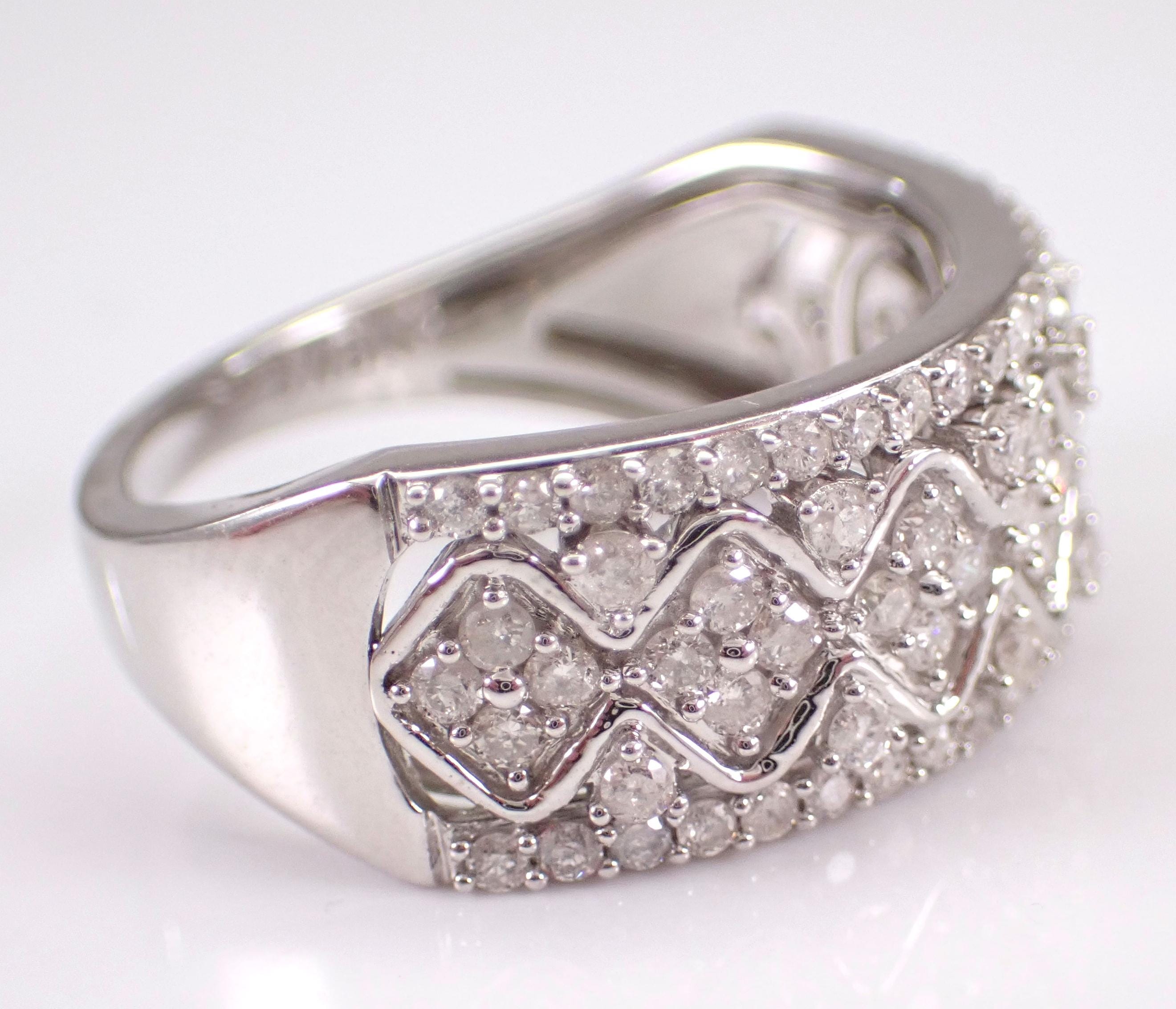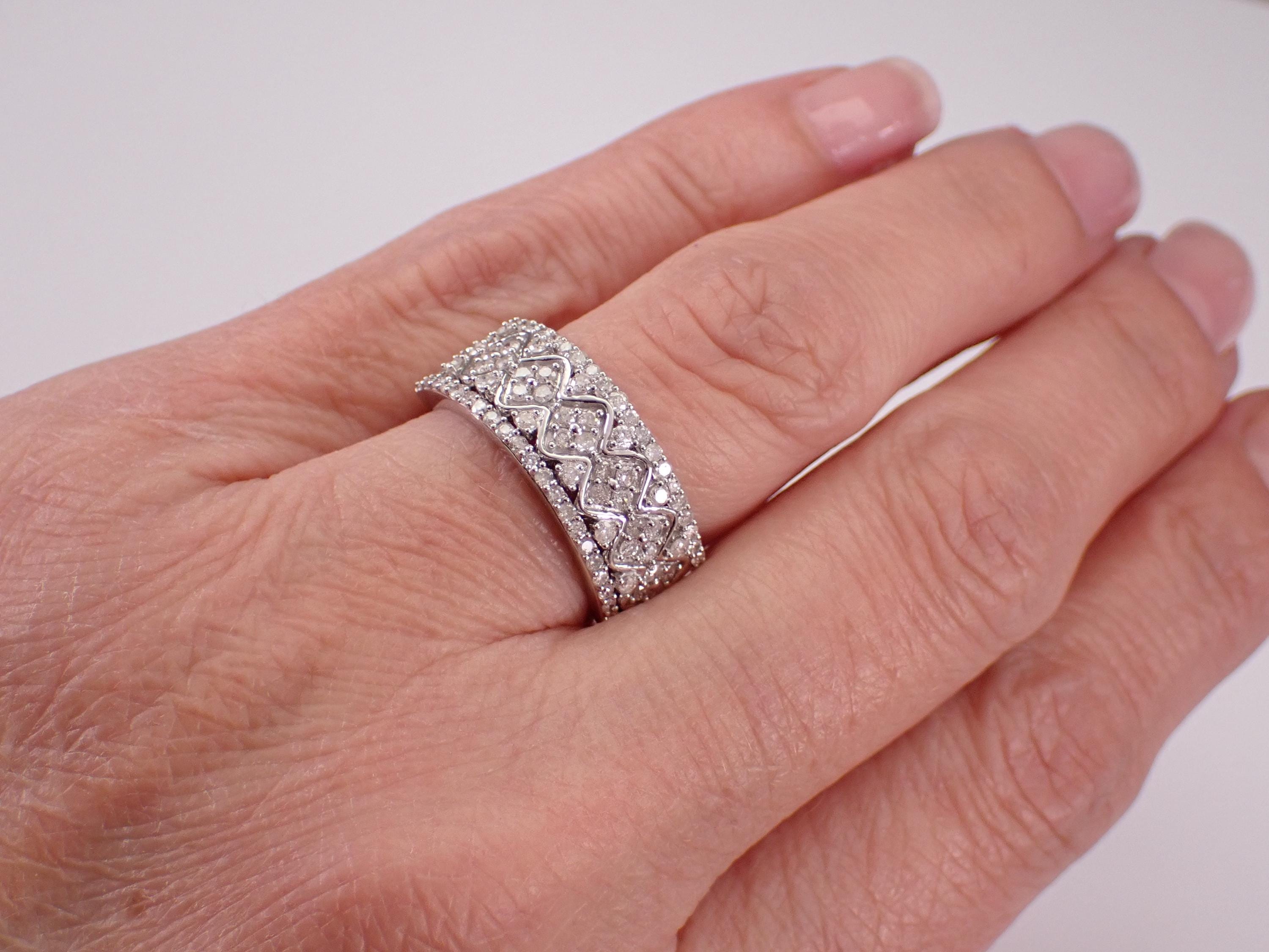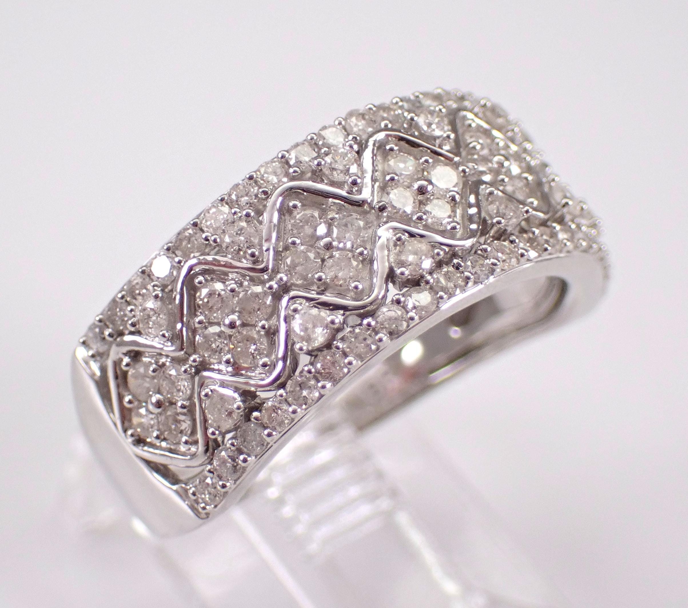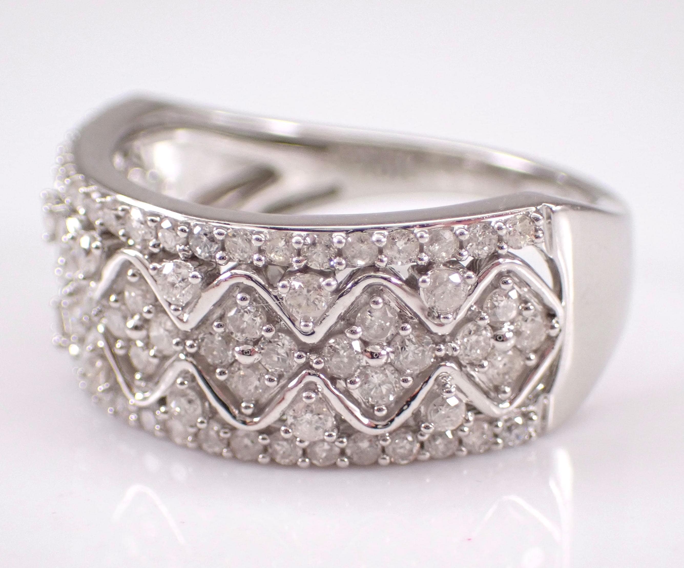 White Gold Diamond Wedding Ring Anniversary Band. This ring is set with eighty-two genuine round brilliant diamonds. These diamonds are H color, SI/I1 clarity and weigh a total of 3/4 carat. This ring is solid 10KT White Gold, weighs 4.2 grams, measures 8.5 mm in width and is a finger size 7, can be resized (please inquire about sizing with the finger size you need). This ring will be accompanied by an appraisal written by a GIA Certified Diamond Grader with the retail replacement value of $2,095.00. I will ship this ring promptly in a beautiful gift box.