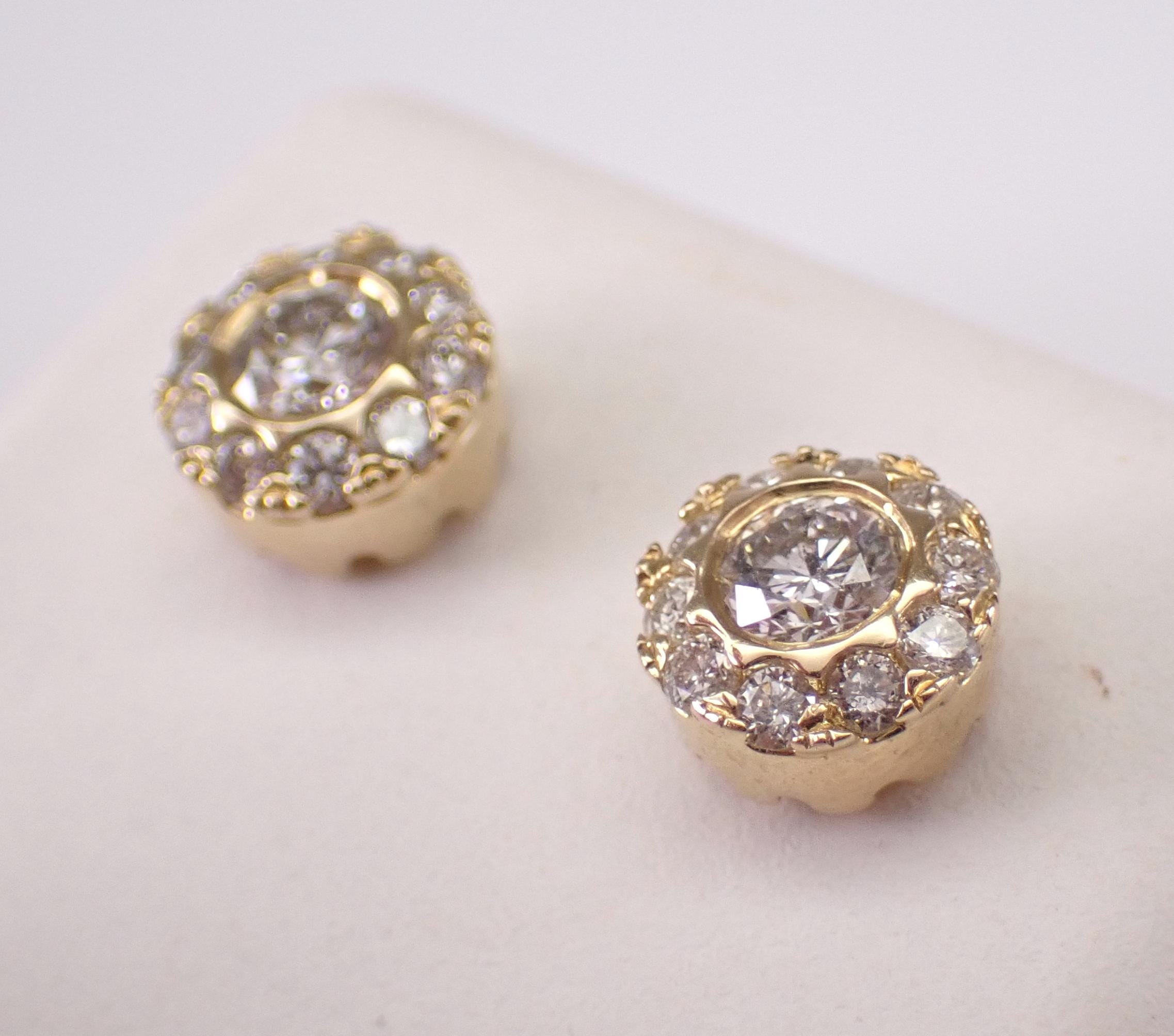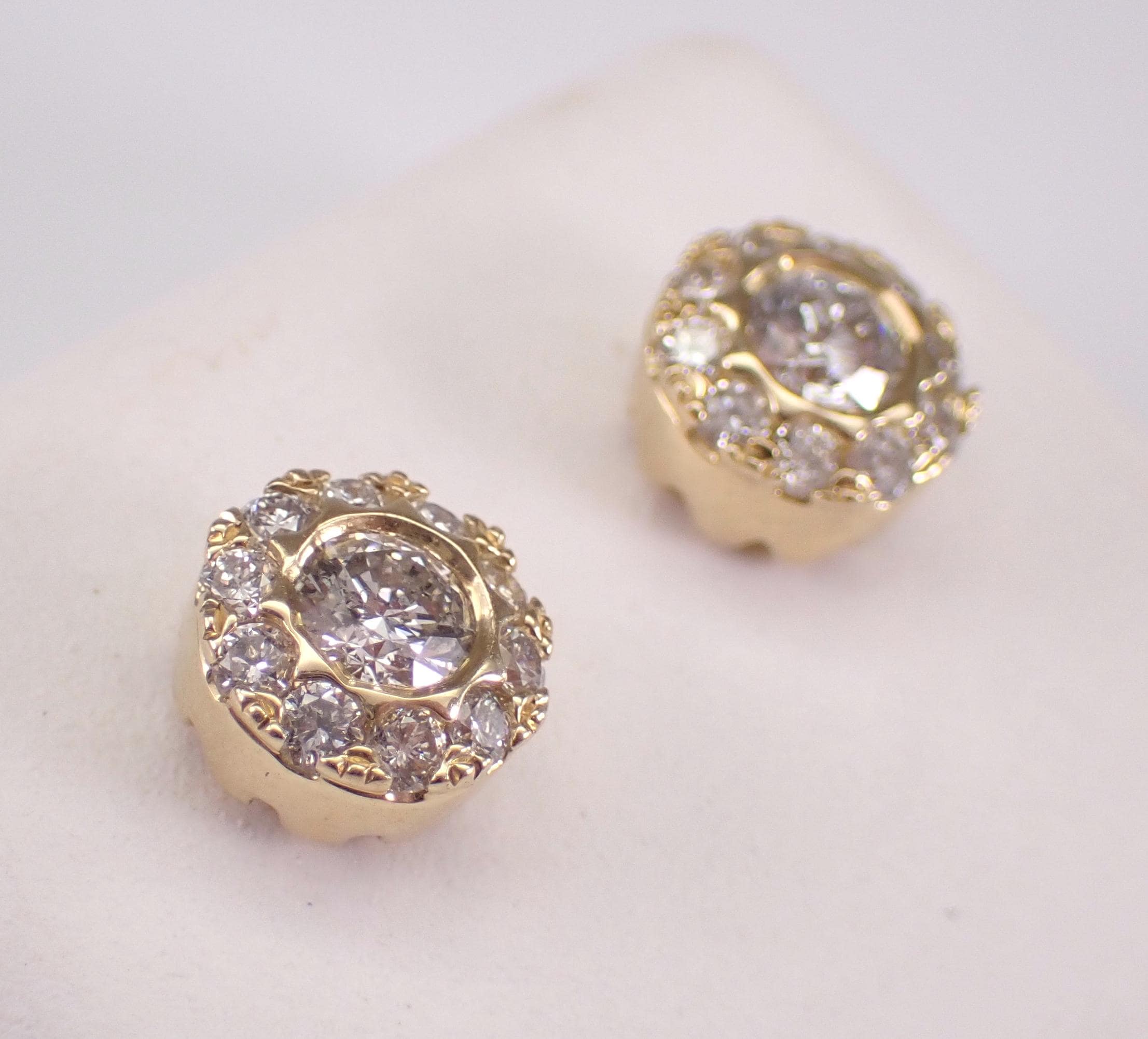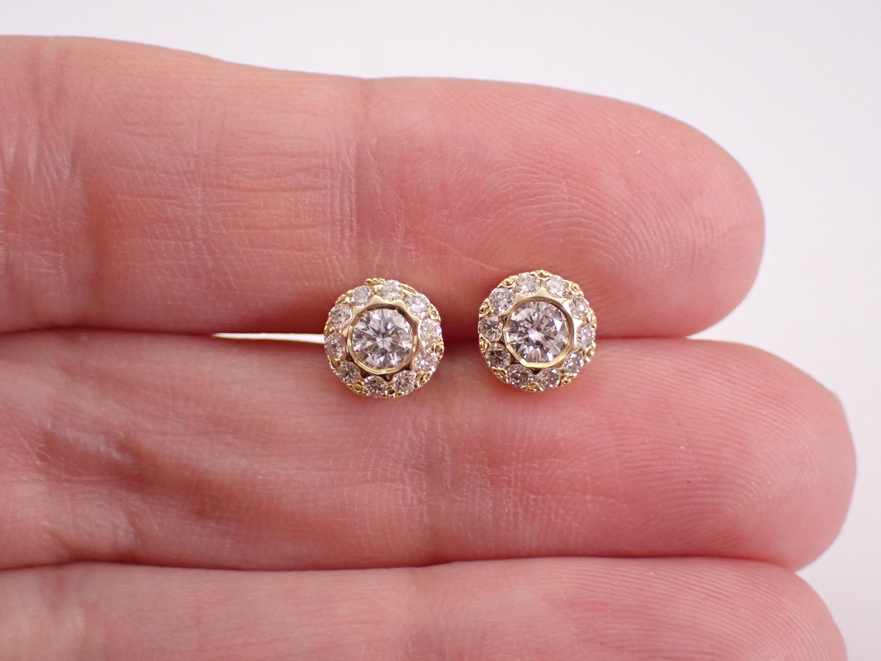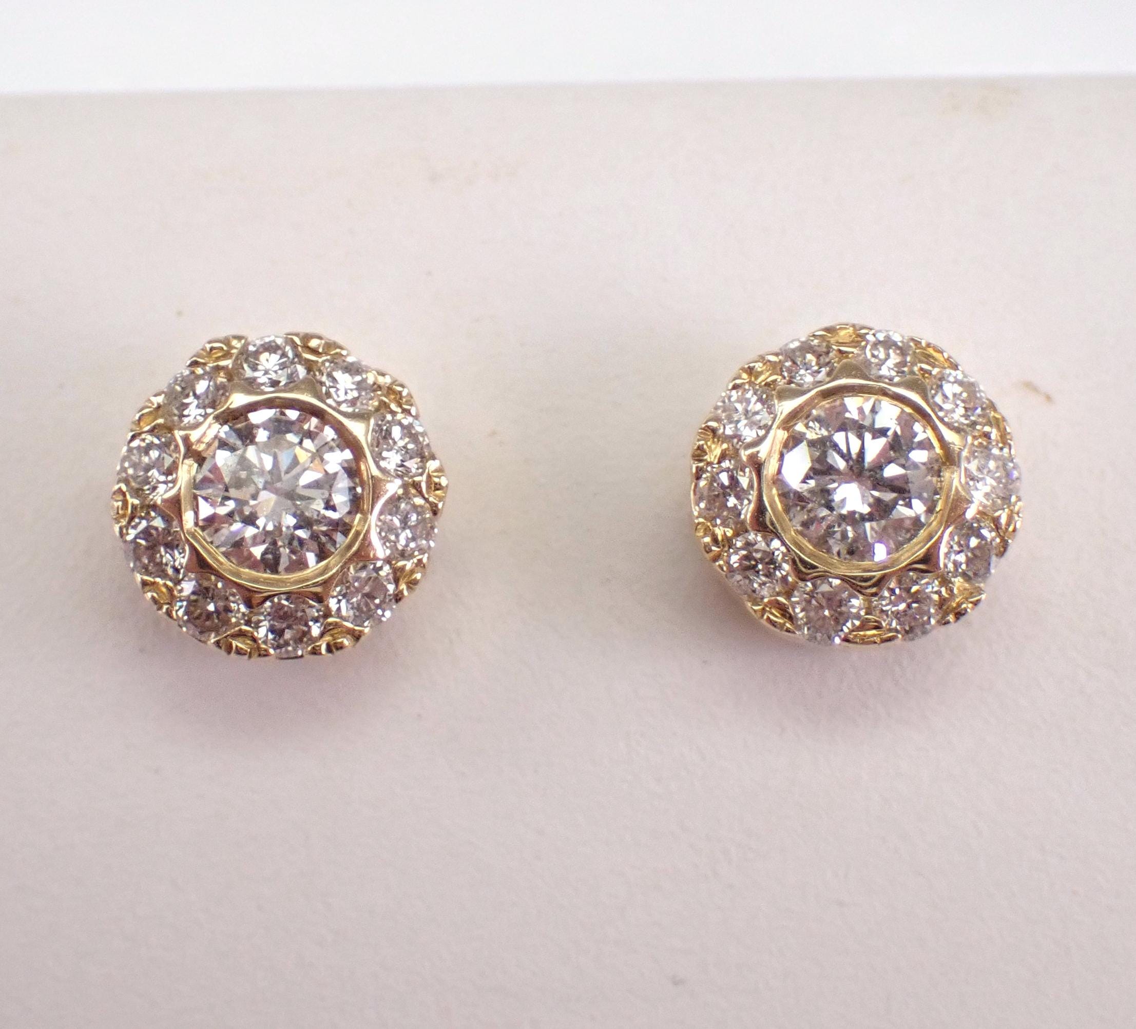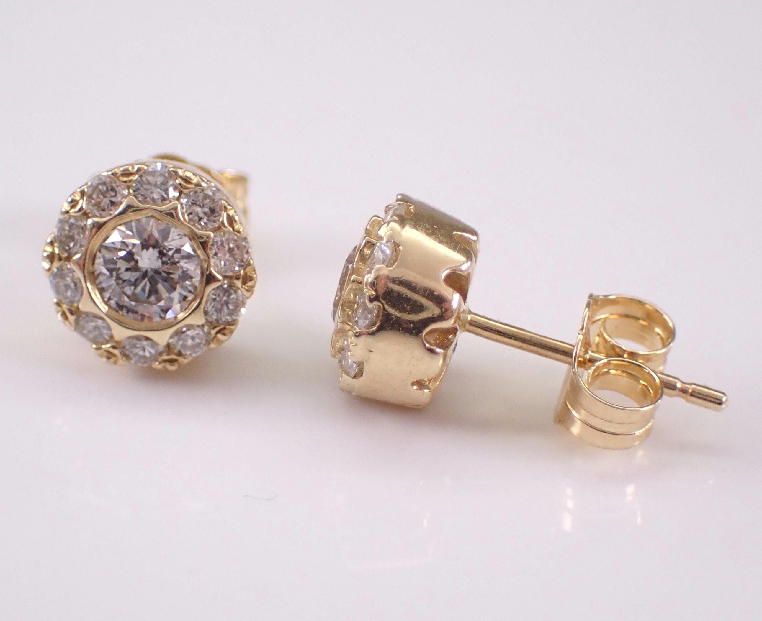 14K Yellow Gold Diamond Halo Stud Earrings. These earrings are set with two center Round Brilliant Diamonds and twenty natural Round Brilliant Diamonds in the halo. The center diamonds are G color, I1 clarity and weigh a total of .30 carats. All the diamonds in these earrings amount to a total weight of 3/4 carat. These earrings are 14K Yellow Gold, weigh 2.2 grams and measure 7 mm in diameter each. These earrings are for pierced ears and the earrings have secure friction back posts. These earrings will be accompanied by an appraisal written by a GIA Certified Diamond Grader with the retail replacement value of $3,495.00. I will ship these earrings promptly in a gift box.