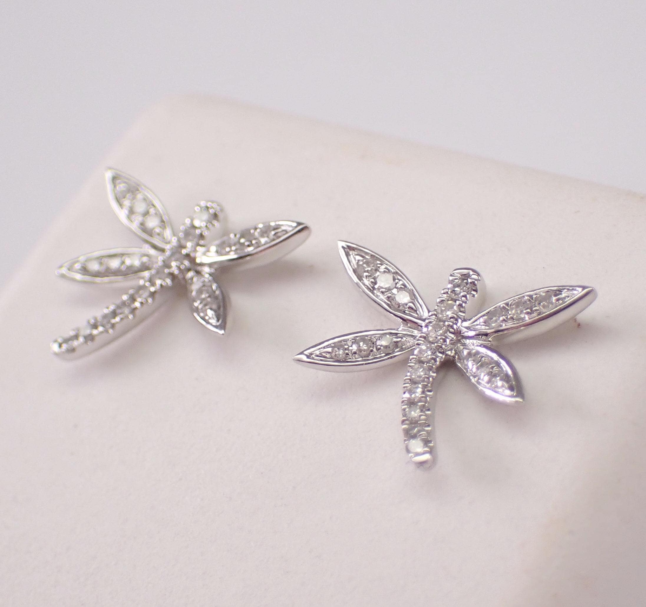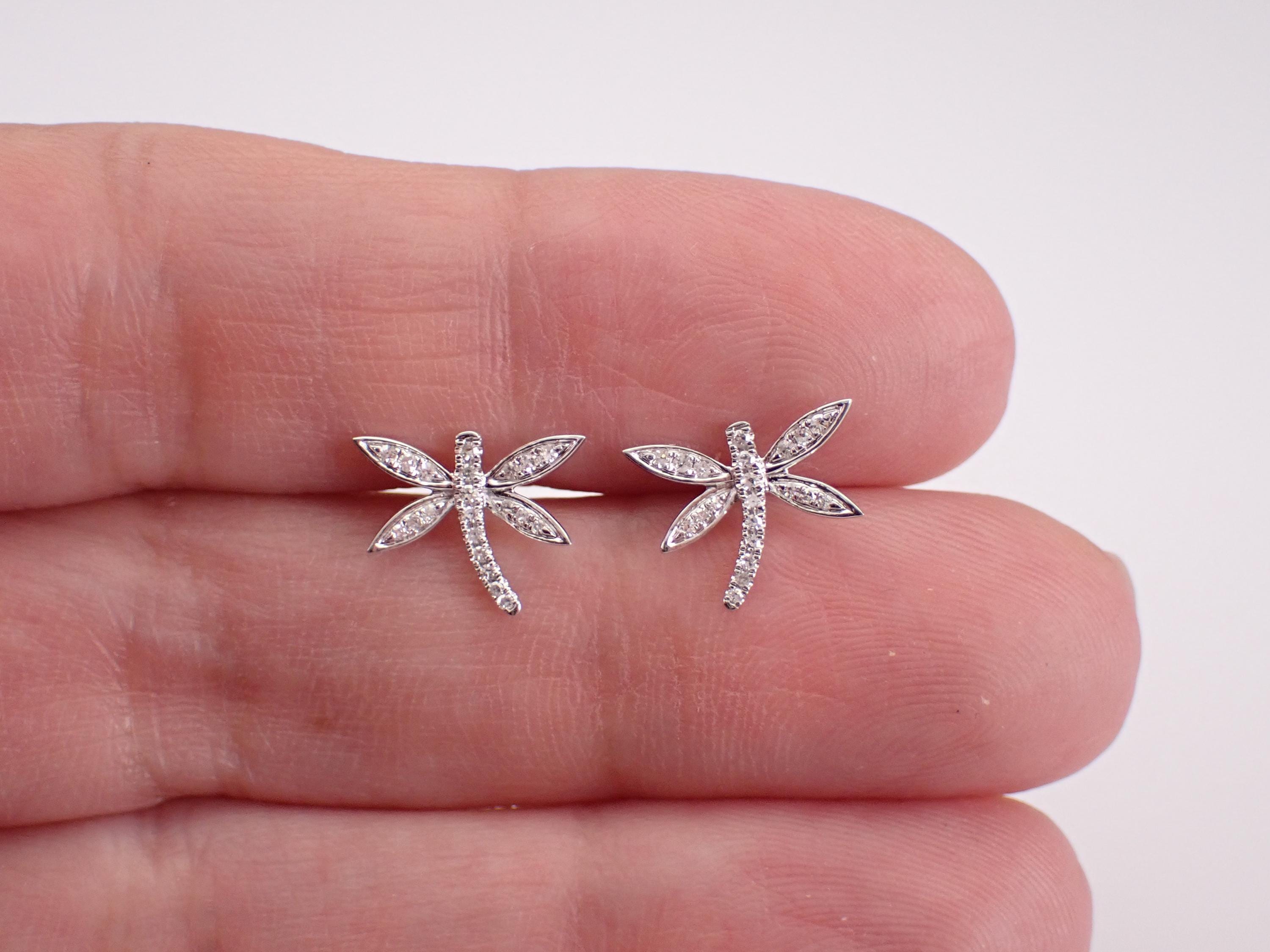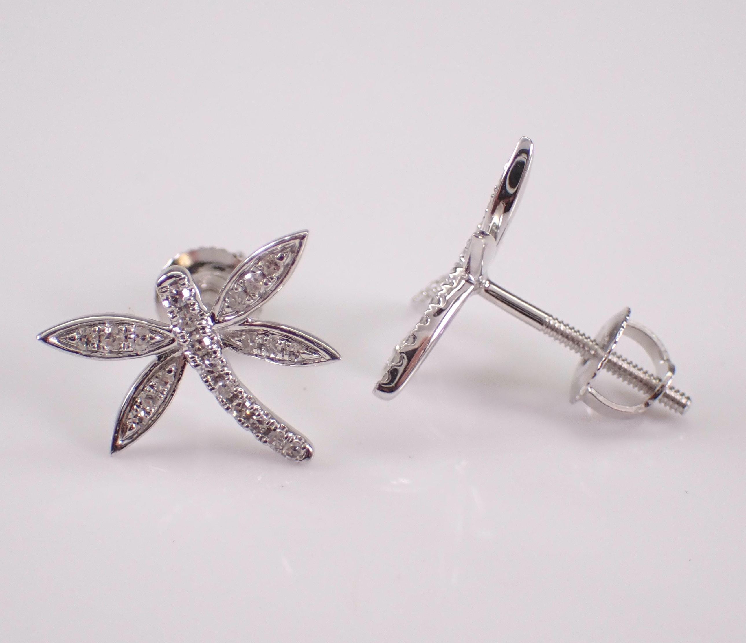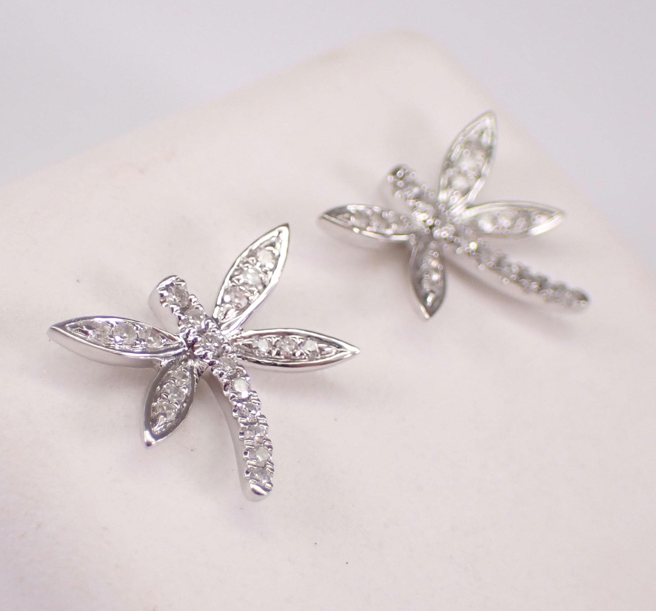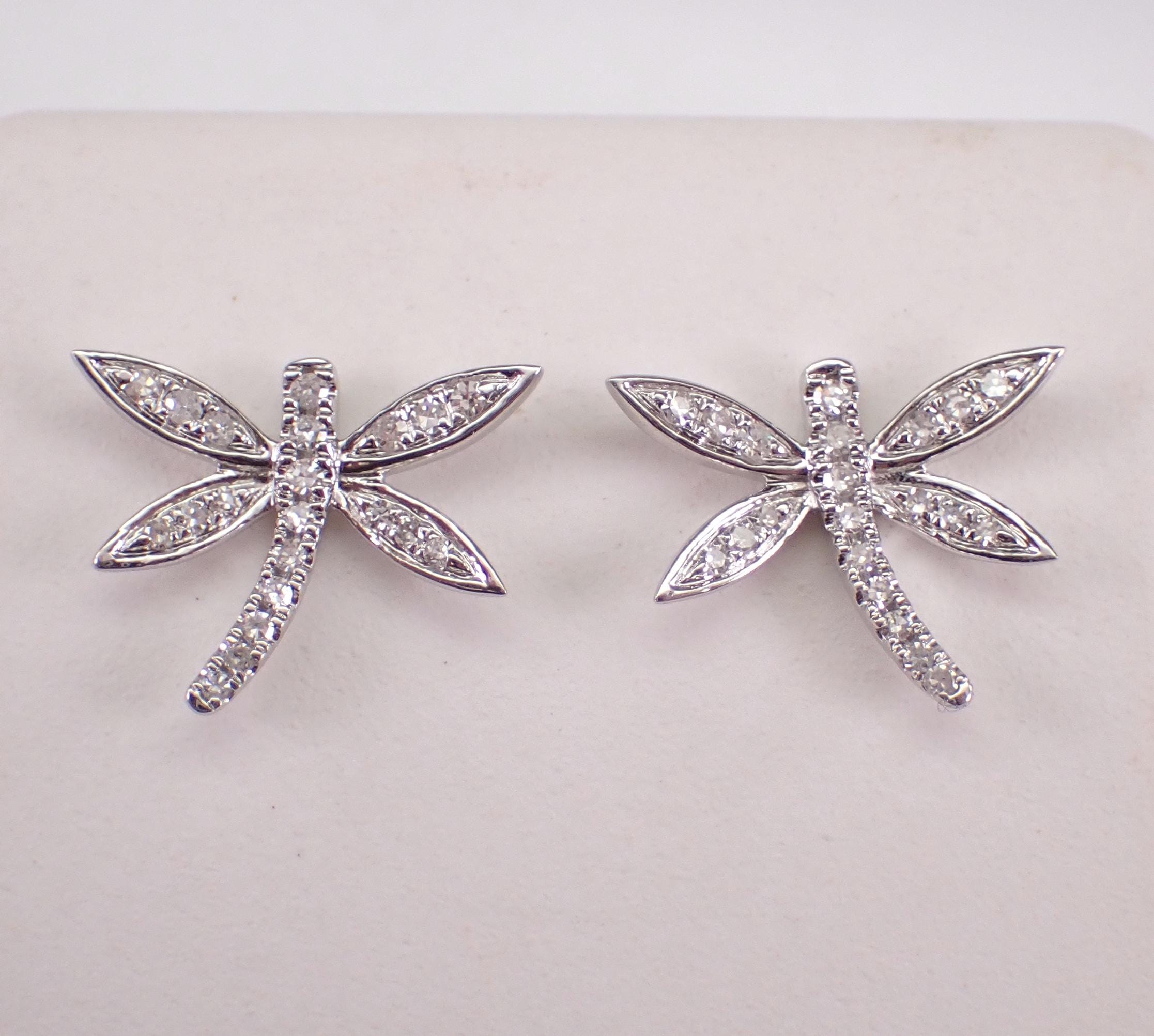 White Gold Diamond Butterfly Stud Earrings. These earrings are set with twenty-one natural Round Brilliant Diamonds in EACH earring. These Diamonds are G color, SI clarity and amount to a total weight of .15 carat. These earrings are 10K White Gold, weigh 1.2 grams and measure 9 X 11 mm. These earrings are for pierced ears and the earrings have screw back clasps. These earrings will be accompanied by an appraisal written by a GIA Certified Diamond Grader with the retail replacement value of $1,285.00. I will ship these earrings promptly in a gift box.