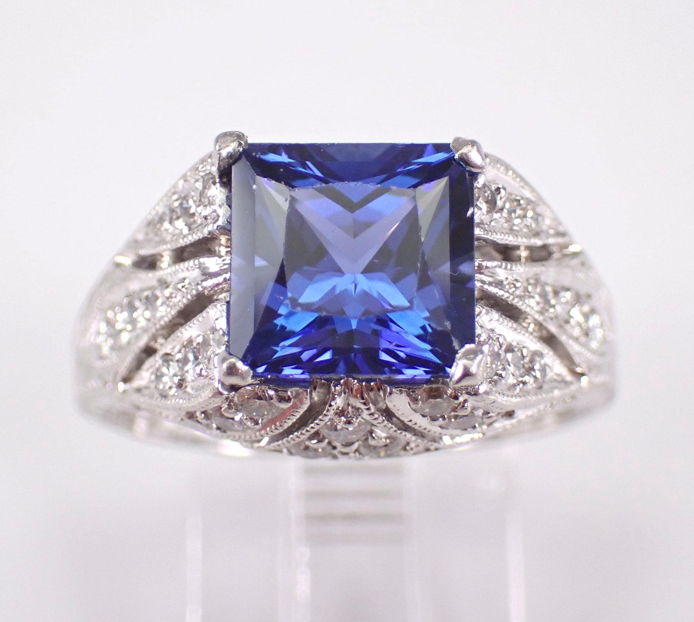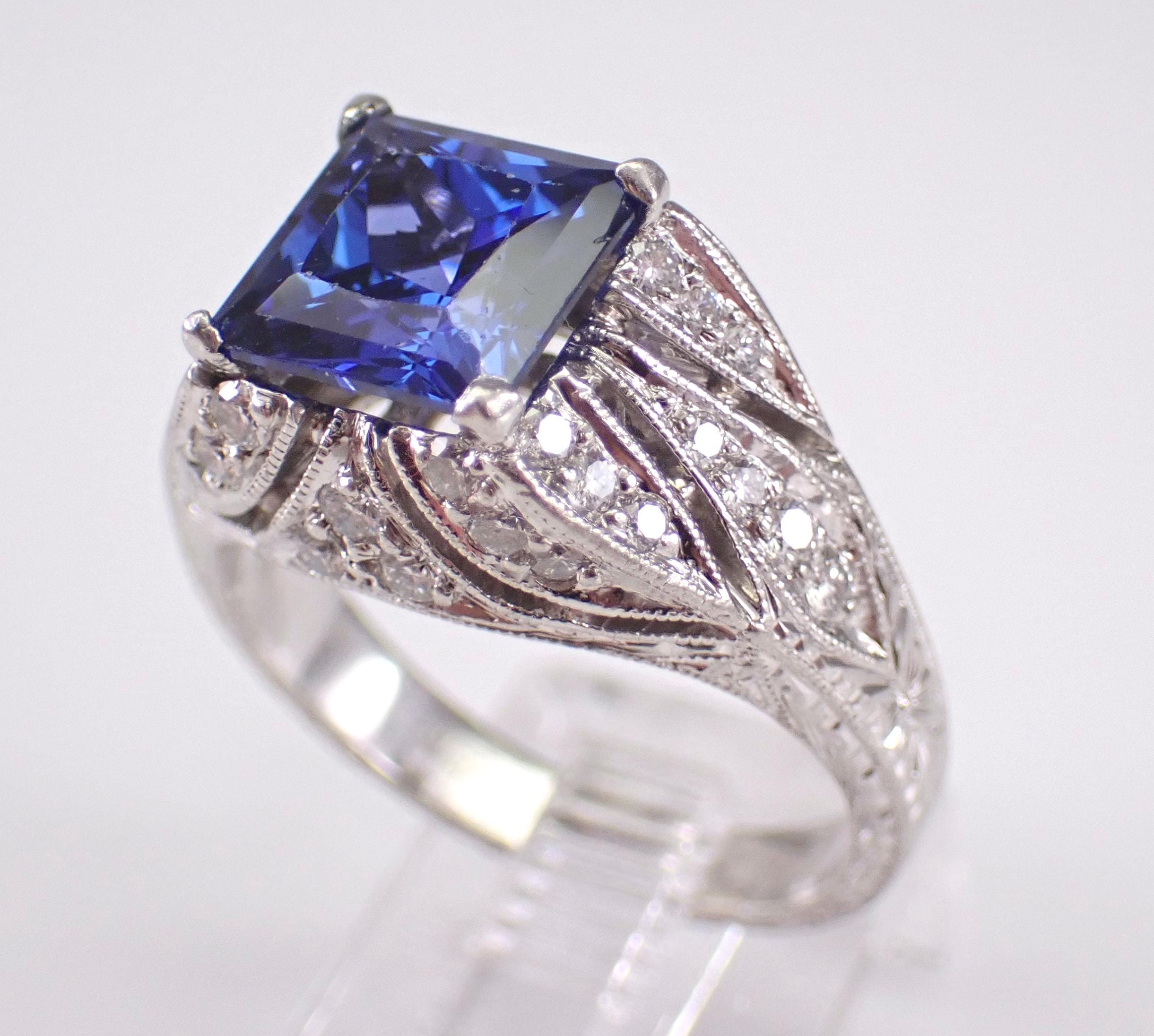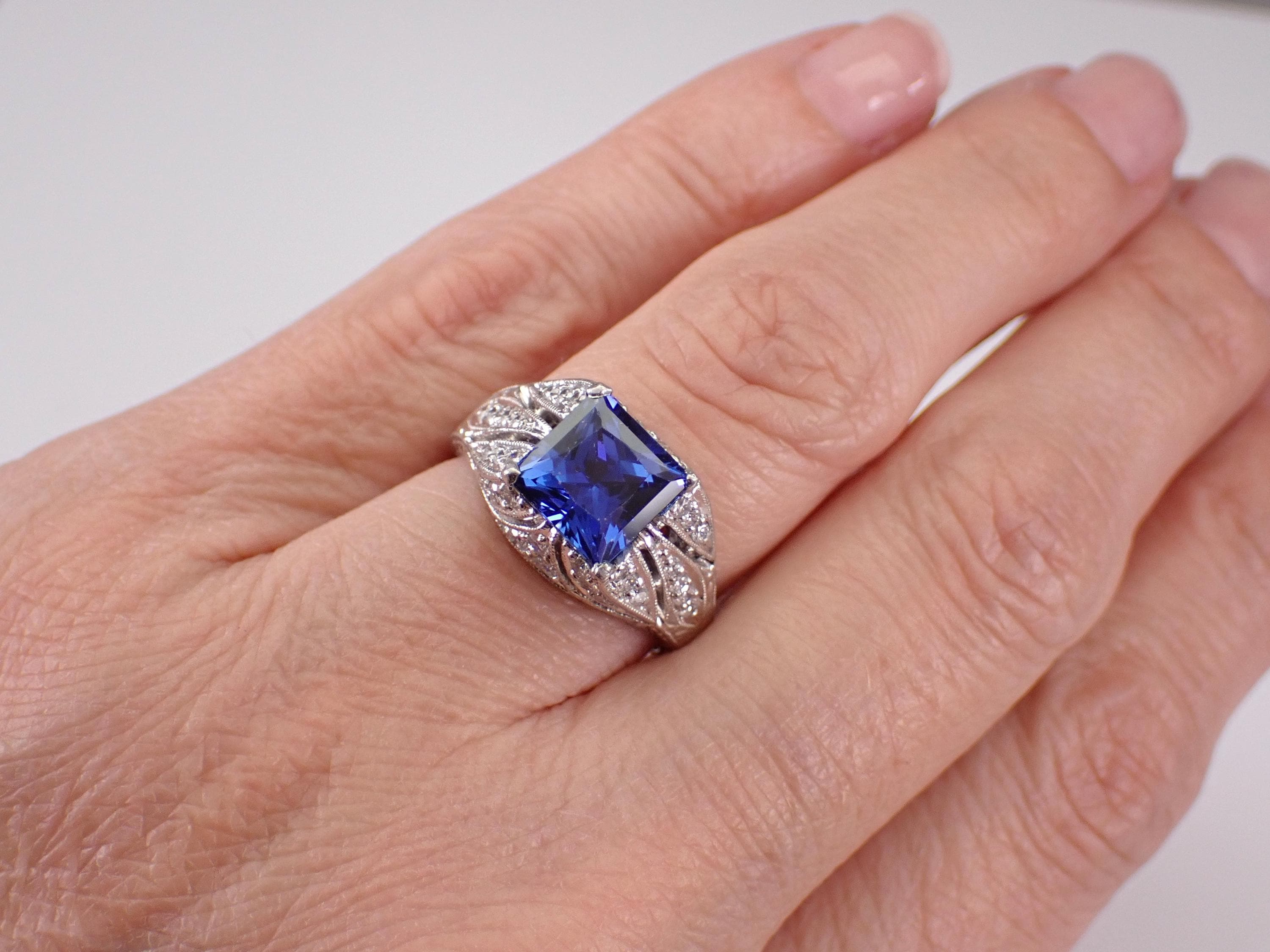 Platinum Diamond and Sapphire Engagement Ring. This ring is set with one Princess Cut Chatham Sapphire in the center. This Sapphire is a beautiful blue color, measures 8 X 8 mm and weighs approximately 3 carats. There are thirty-eight genuine Round Brilliant Diamonds set in this ring. These diamonds are G color, VS/SI1 clarity and weigh a total of .63 carat. This ring is Platinum, weighs 11.8 grams and is a finger size 7, which can be resized (please inquire about sizing with the finger size you need). This ring will also be accompanied by an appraisal by a GIA Certified Diamond Grader with the replacement value of $6,485.00. I will ship this ring promptly in a beautiful gift box.