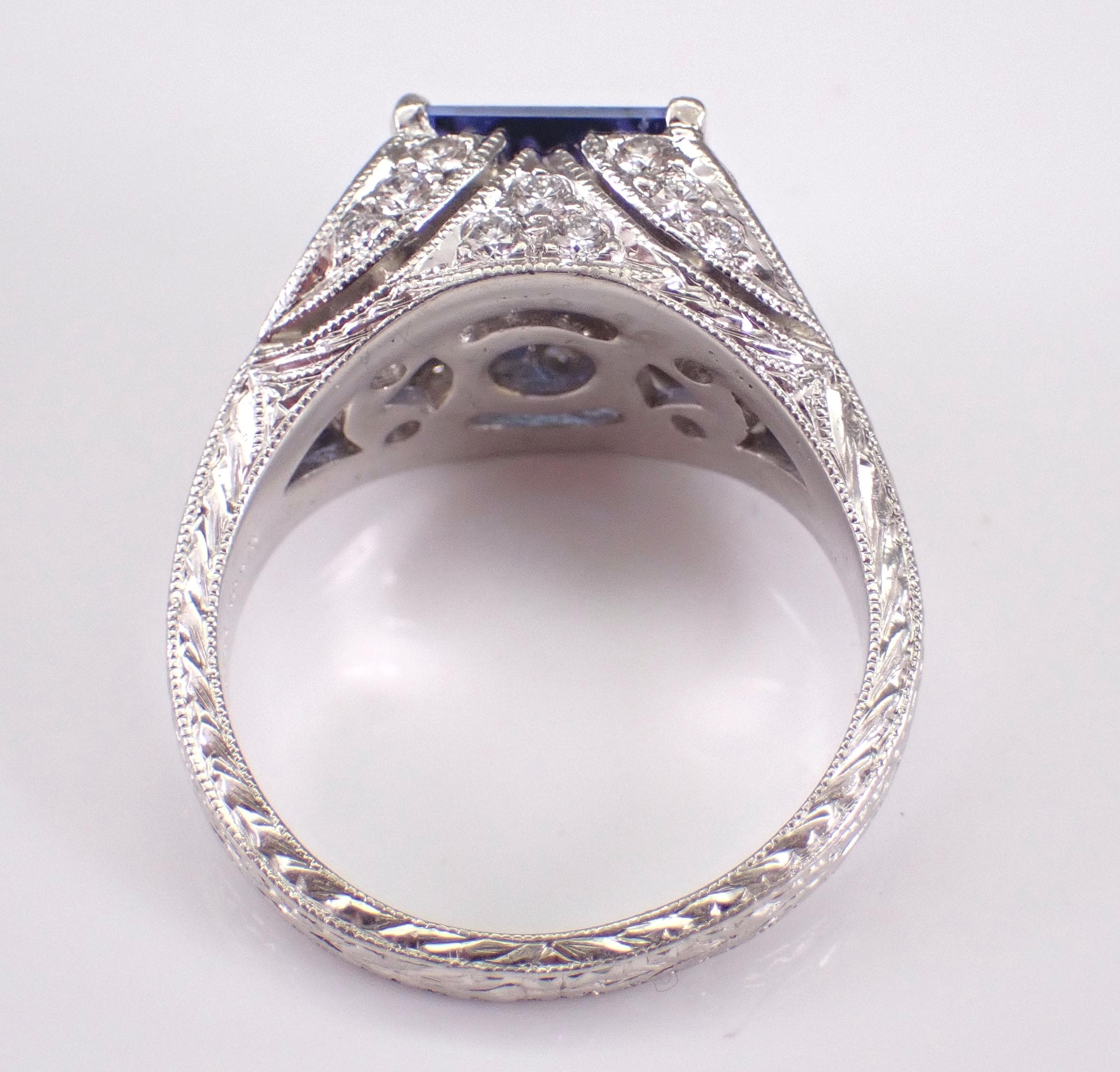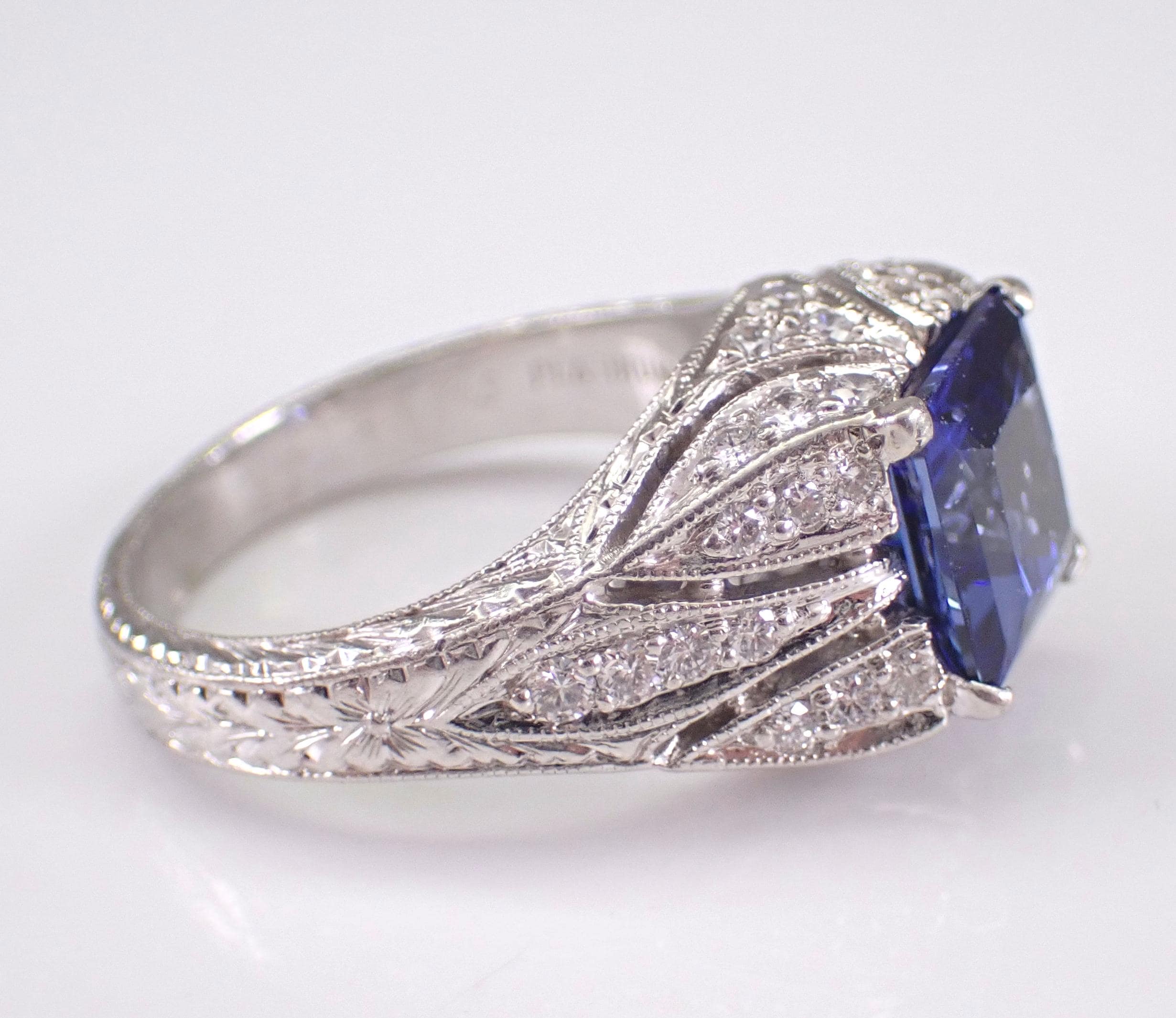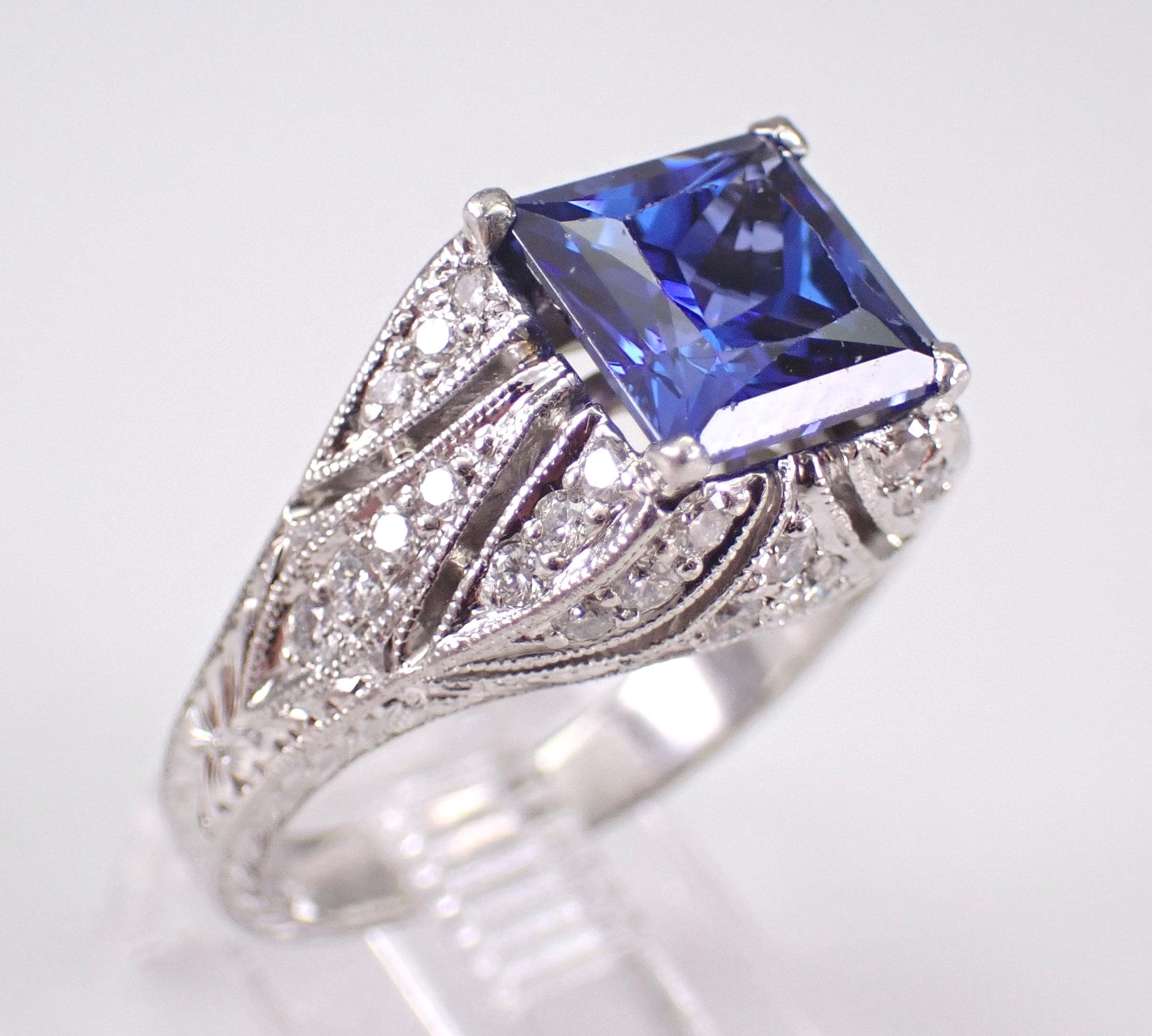 Platinum Diamond and Sapphire Engagement Ring. This ring is set with one Princess Cut Chatham Sapphire in the center. This Sapphire is a beautiful blue color, measures 8 X 8 mm and weighs approximately 3 carats. There are thirty-eight genuine Round Brilliant Diamonds set in this ring. These diamonds are G color, VS/SI1 clarity and weigh a total of .63 carat. This ring is Platinum, weighs 11.8 grams and is a finger size 7, which can be resized (please inquire about sizing with the finger size you need). This ring will also be accompanied by an appraisal by a GIA Certified Diamond Grader with the replacement value of $6,485.00. I will ship this ring promptly in a beautiful gift box.