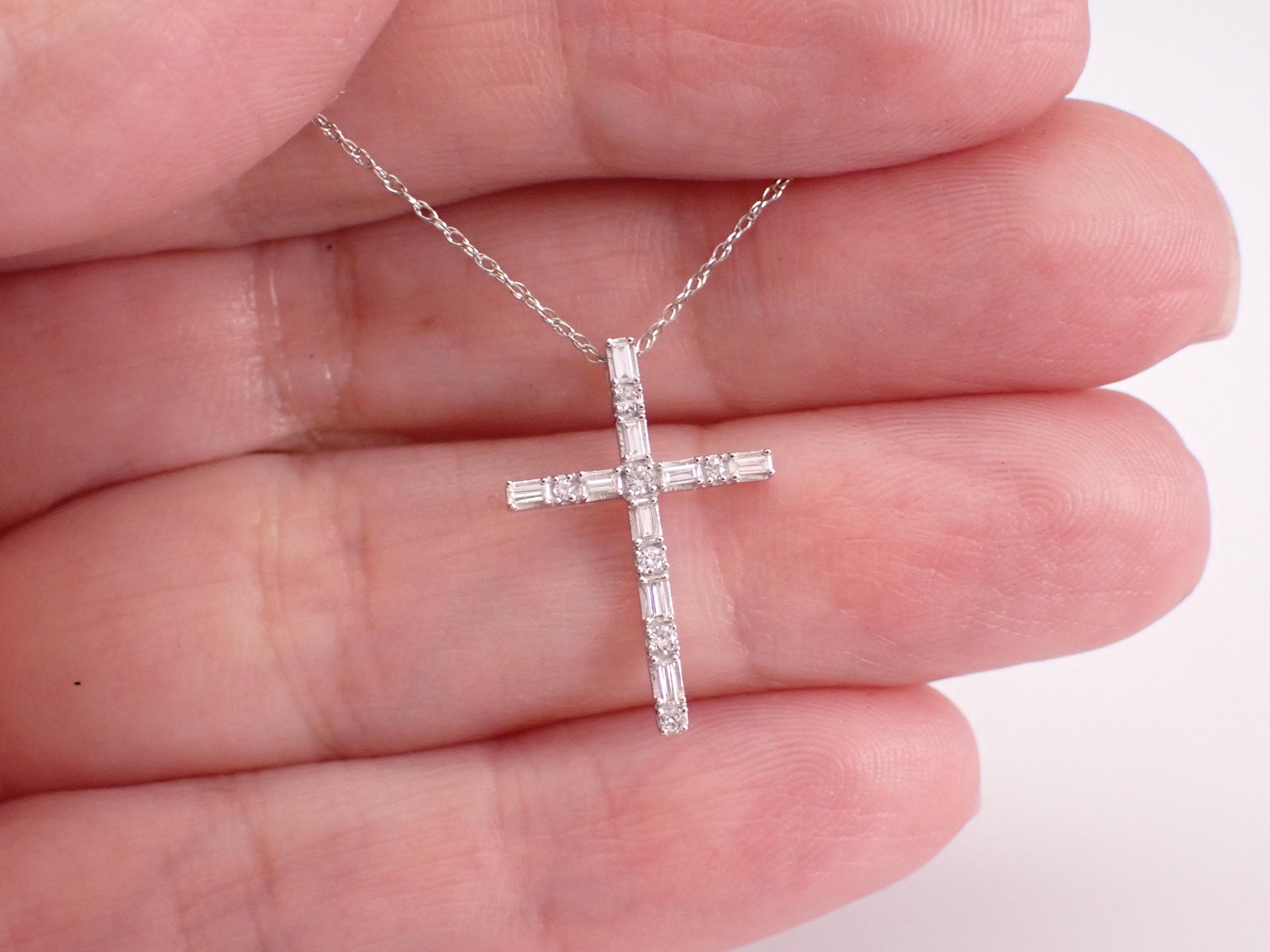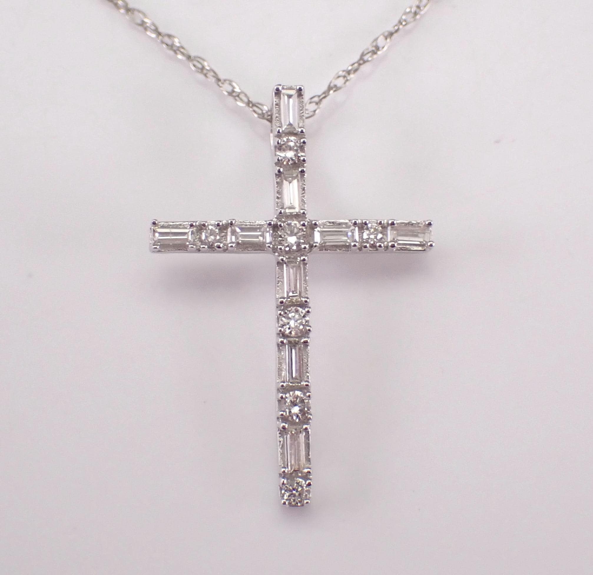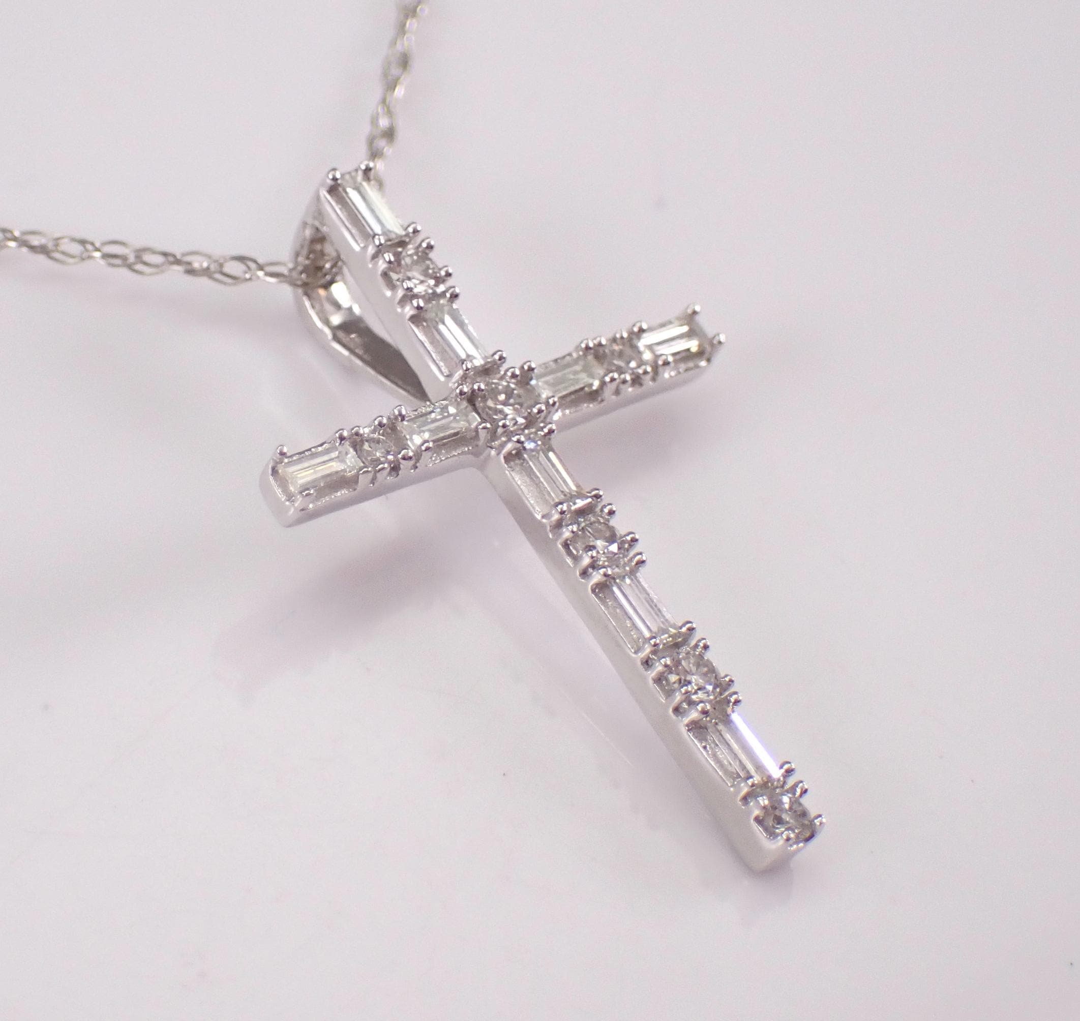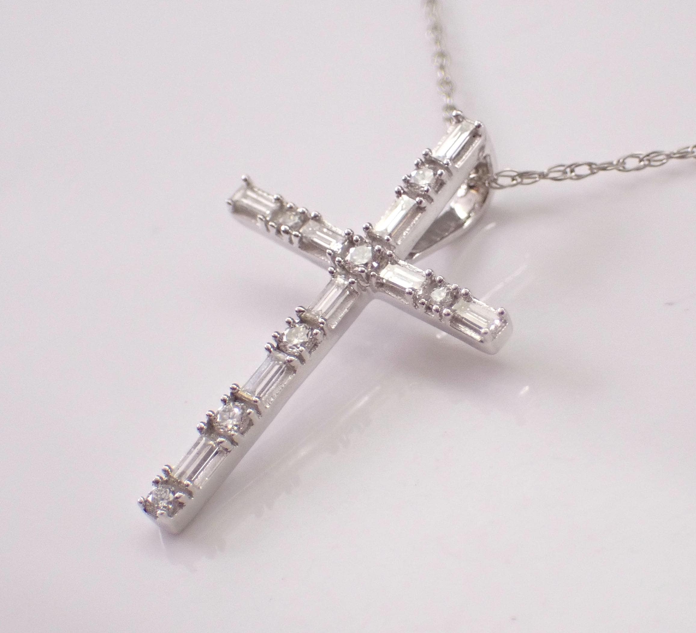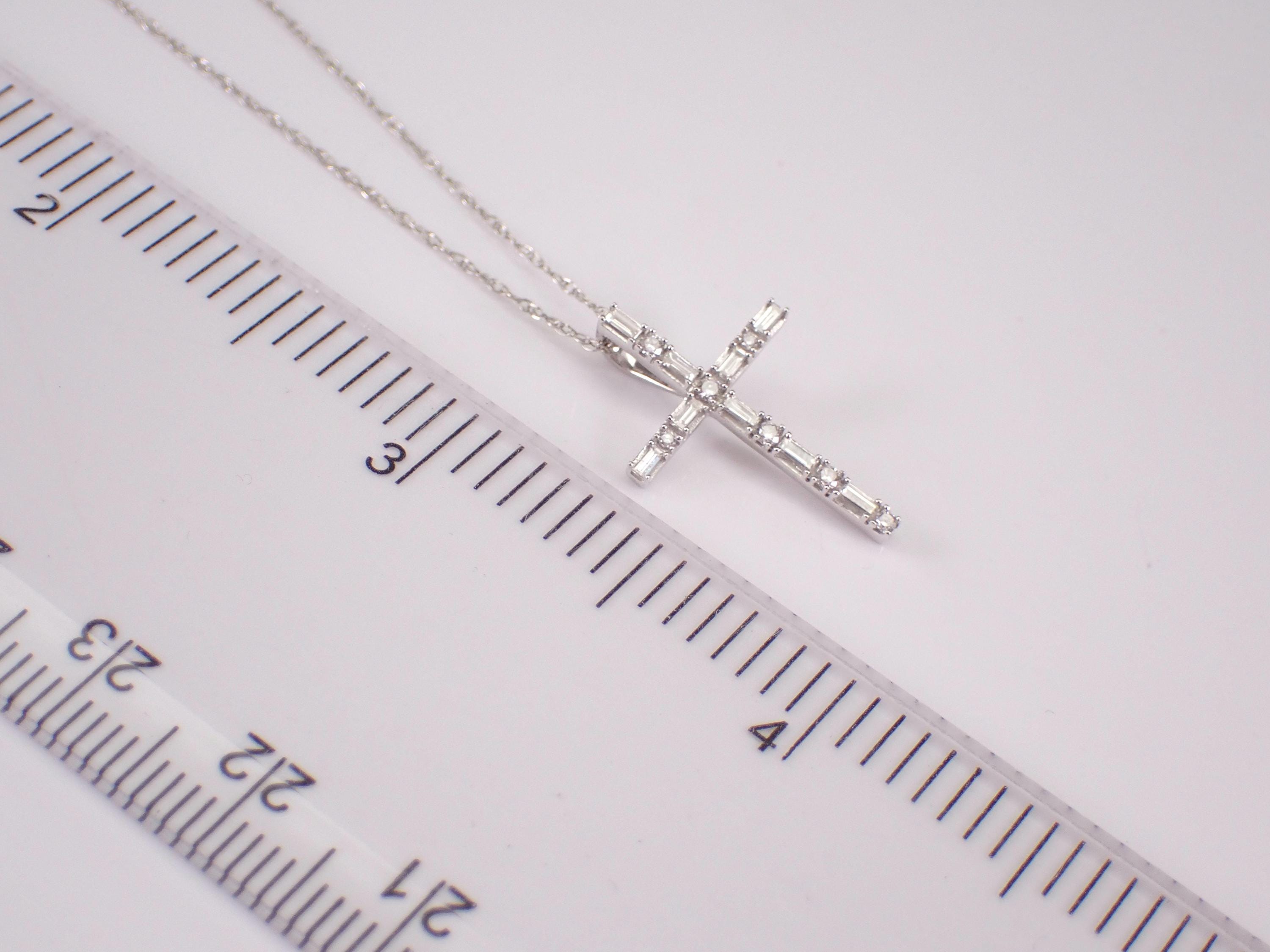 14K White Gold Diamond Cross Pendant Necklace. This cross pendant is set with six genuine Round Brilliant Diamonds and nine Baguette Diamonds. These diamonds are G color, SI/VS clarity and weigh a total of .25 carat. This pendant is 14KT White Gold, comes with an 18" 14K White Gold chain and together with the chain weighs 1.2 grams. This cross measures 20 X 13.5 mm. This cross will be accompanied by an appraisal by a GIA Certified Diamond Grader with the retail replacement value of $1,495.00. I will ship this pendant promptly in a beautiful gift box.