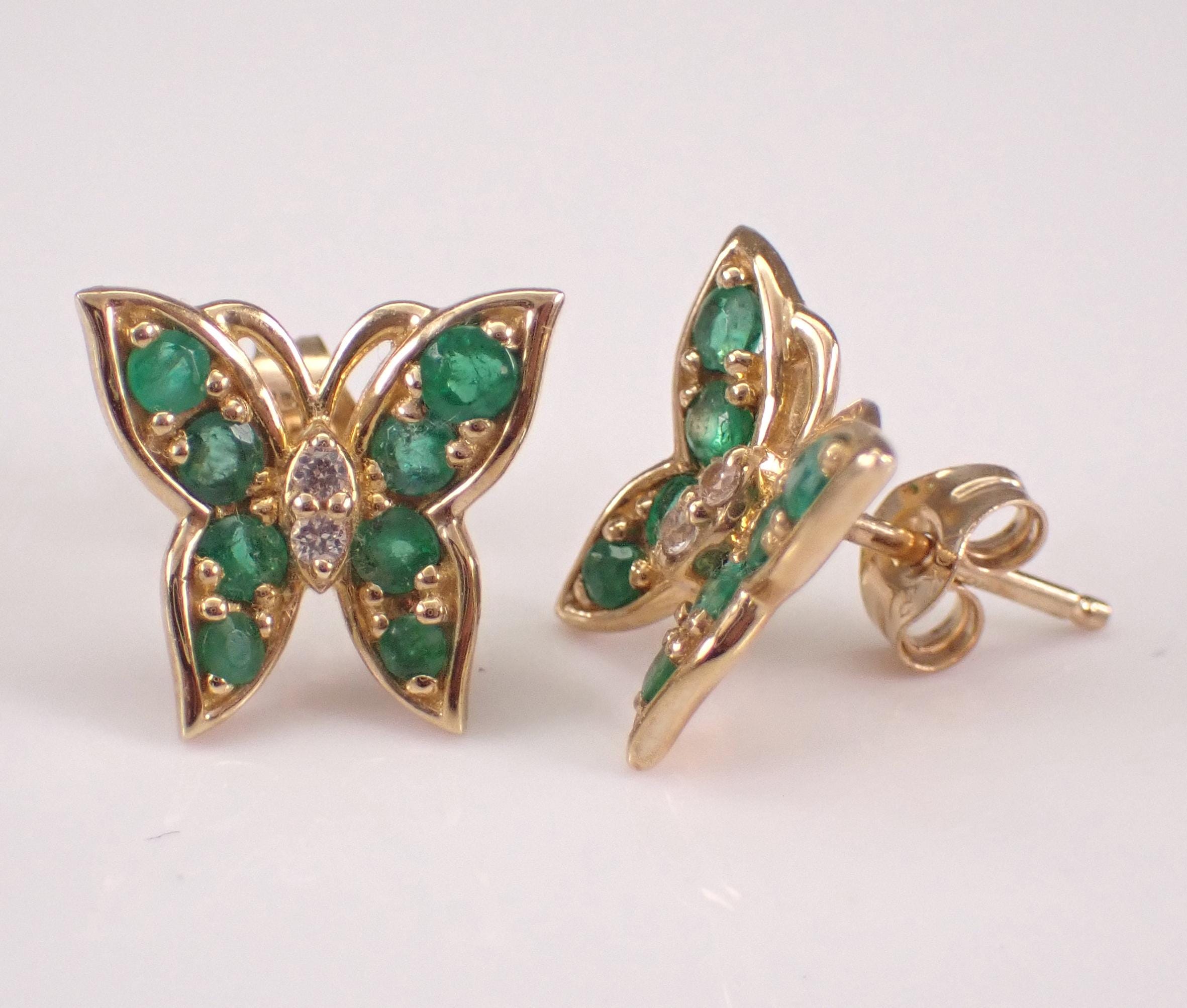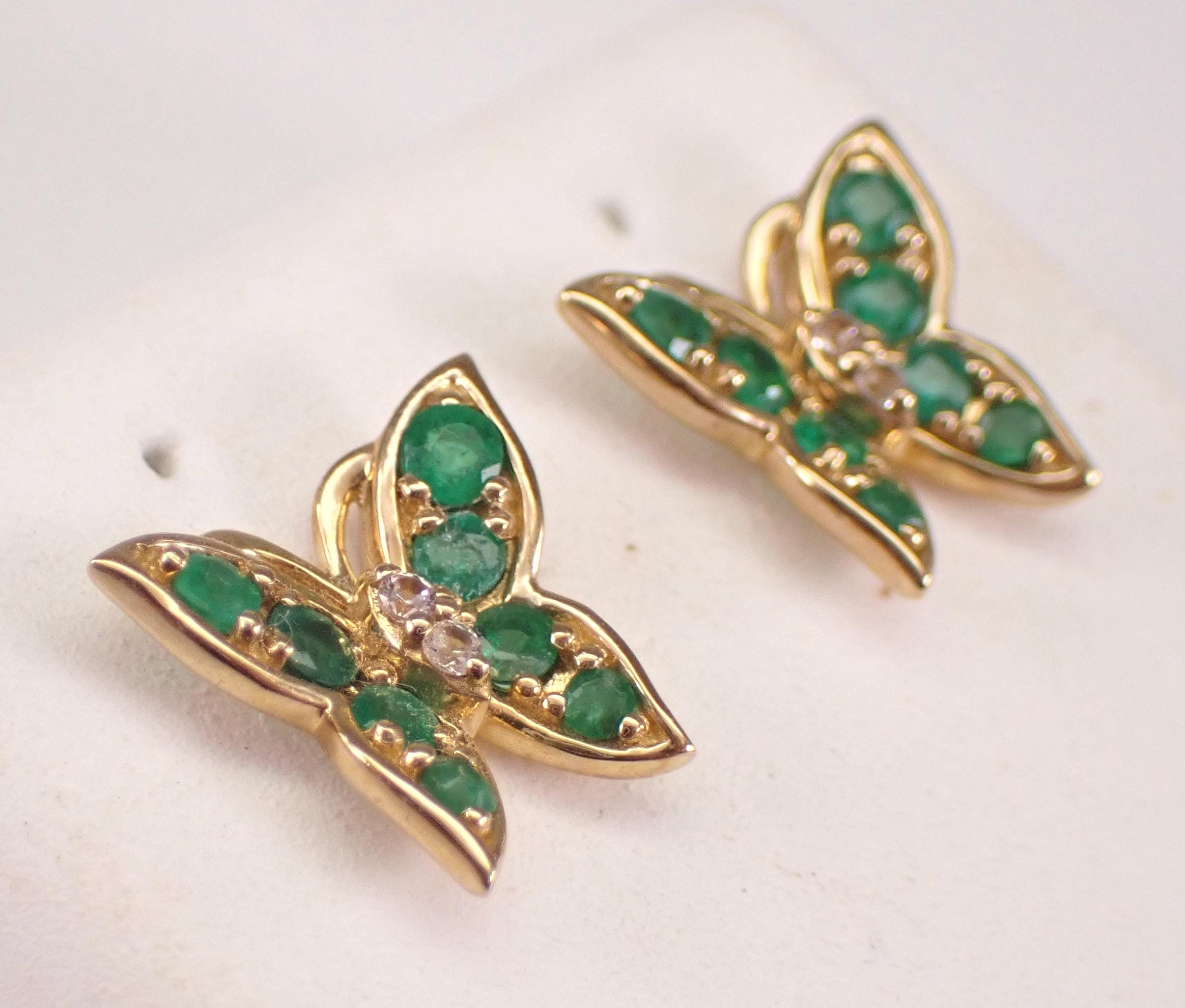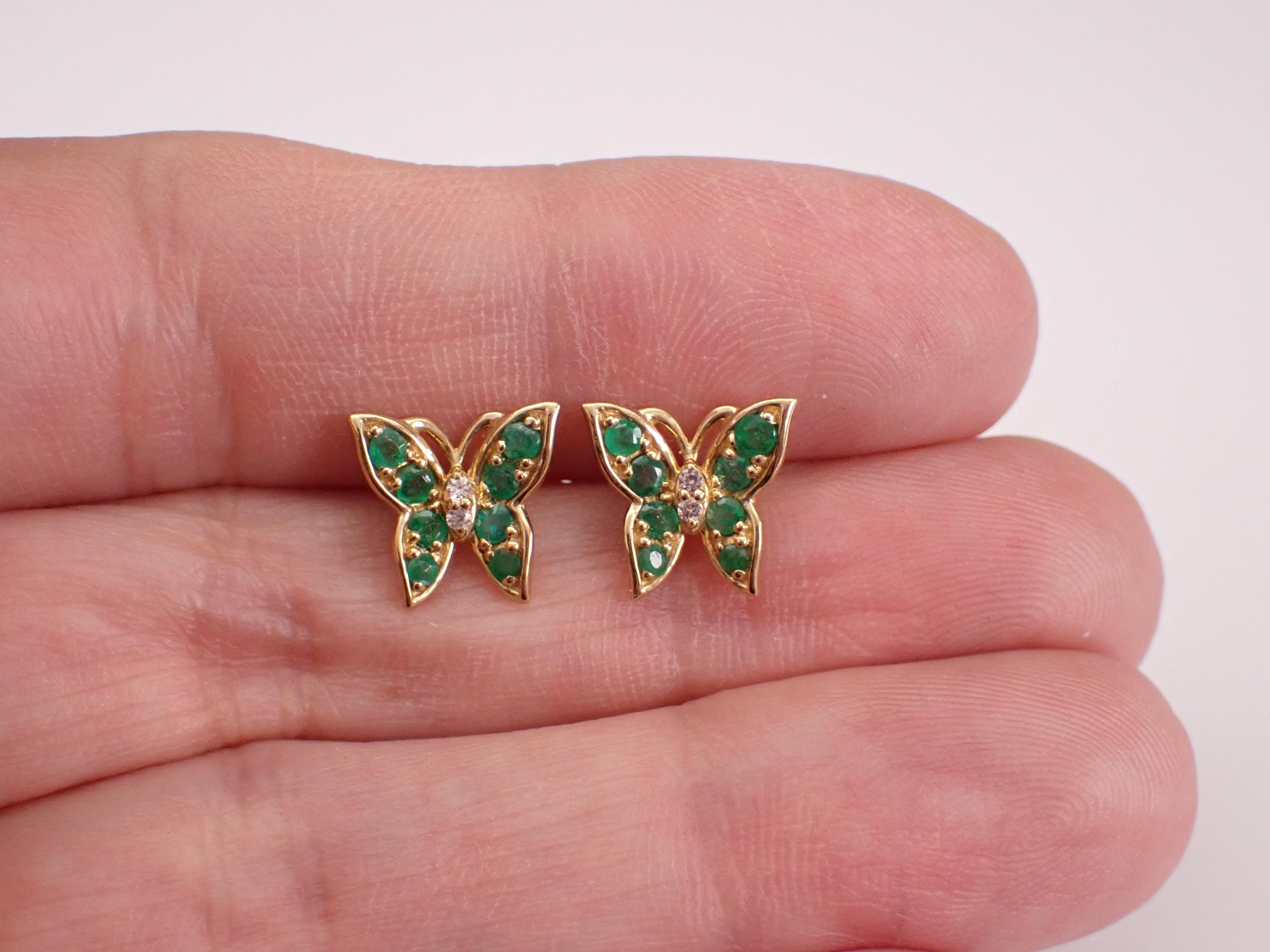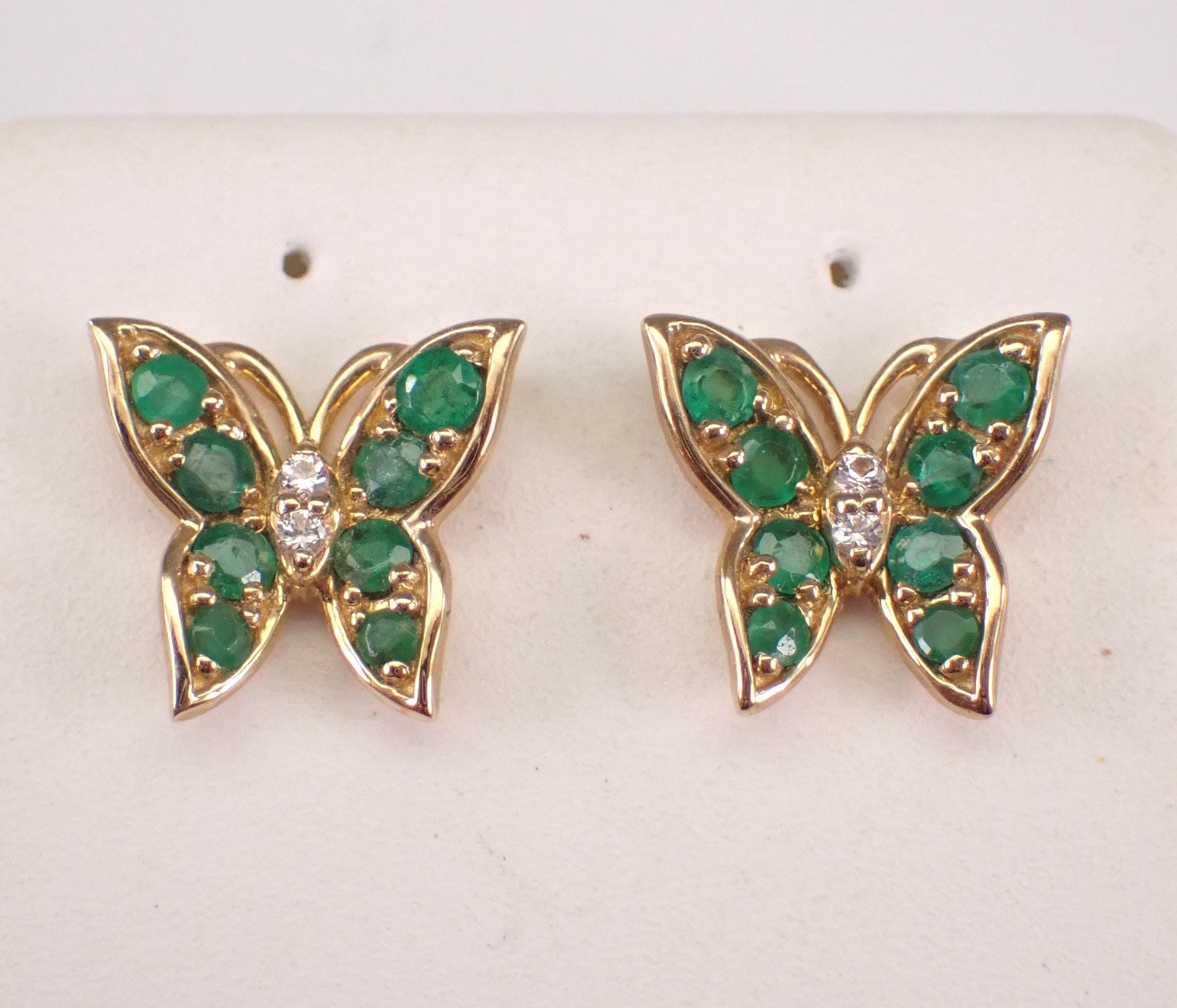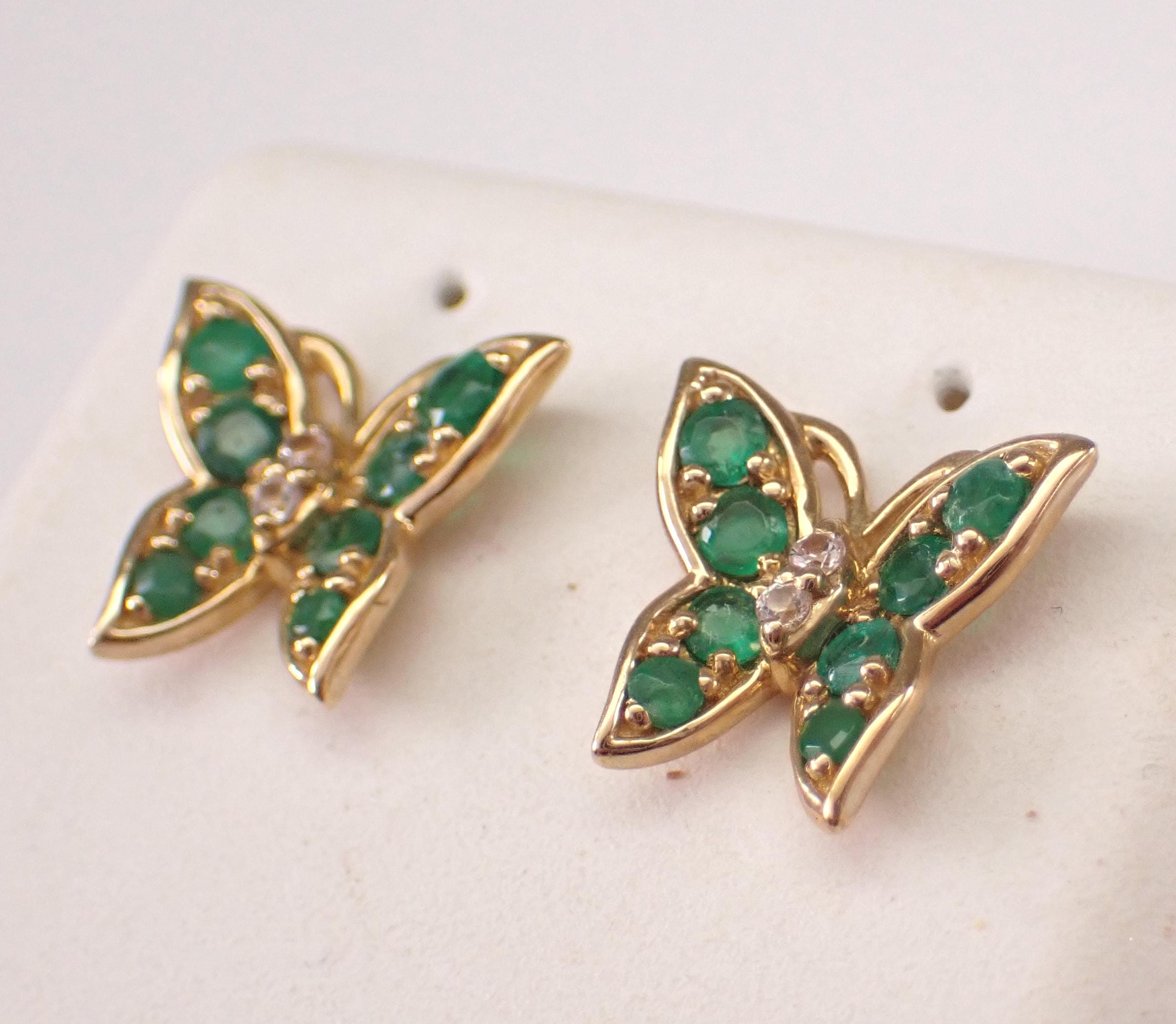 Yellow Gold Emerald Butterfly Stud Earrings. These earrings are set with two Round White Sapphires and eight genuine Round Emeralds in EACH earring. These Emeralds weigh a total of 1/2 carat. These earrings are 10K Yellow Gold, weigh 1.6 grams and measure 10 X 9.5 mm each. These earrings are for pierced ears and the earrings have friction post backs. I will ship these earrings promptly in a gift box.