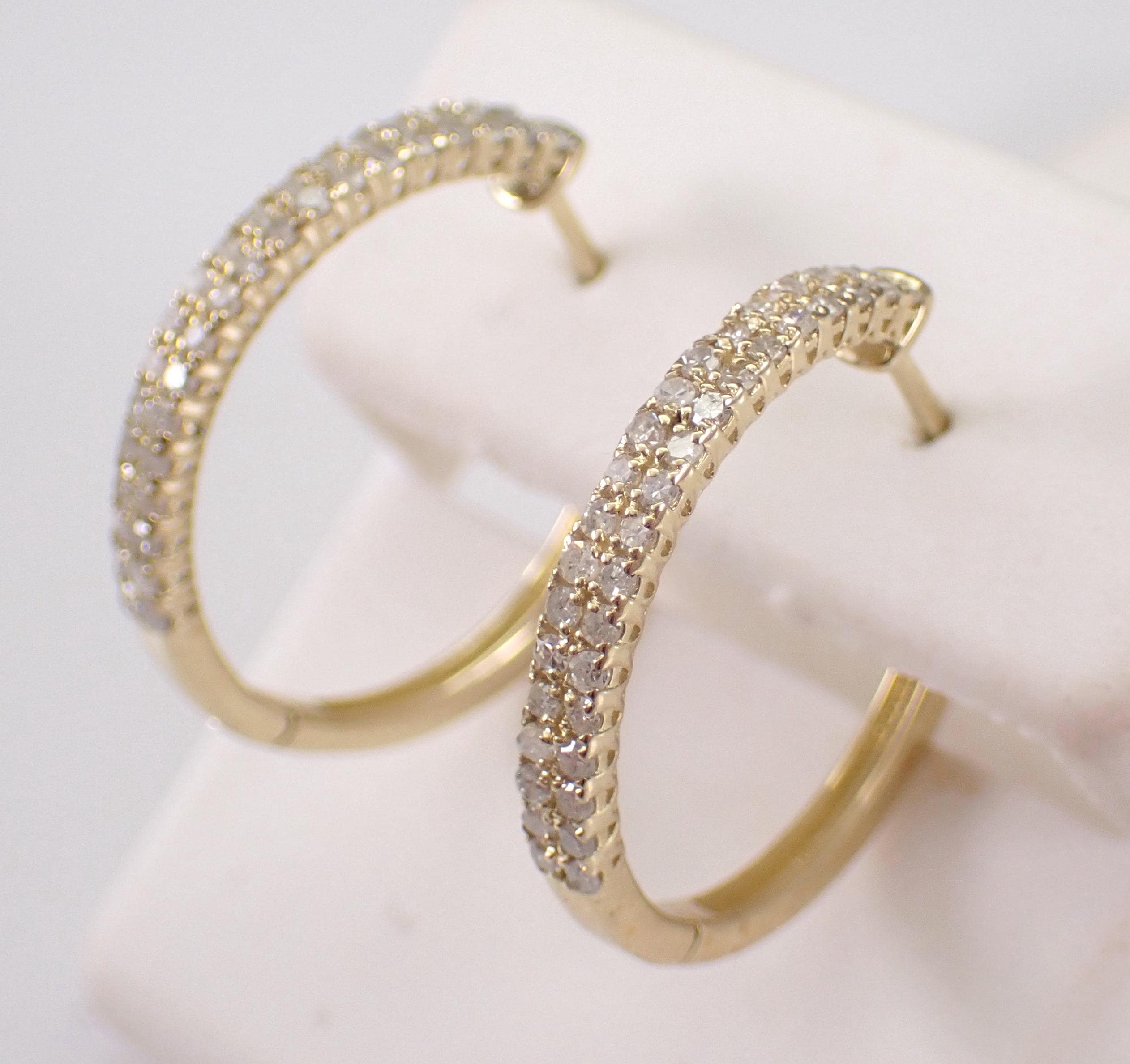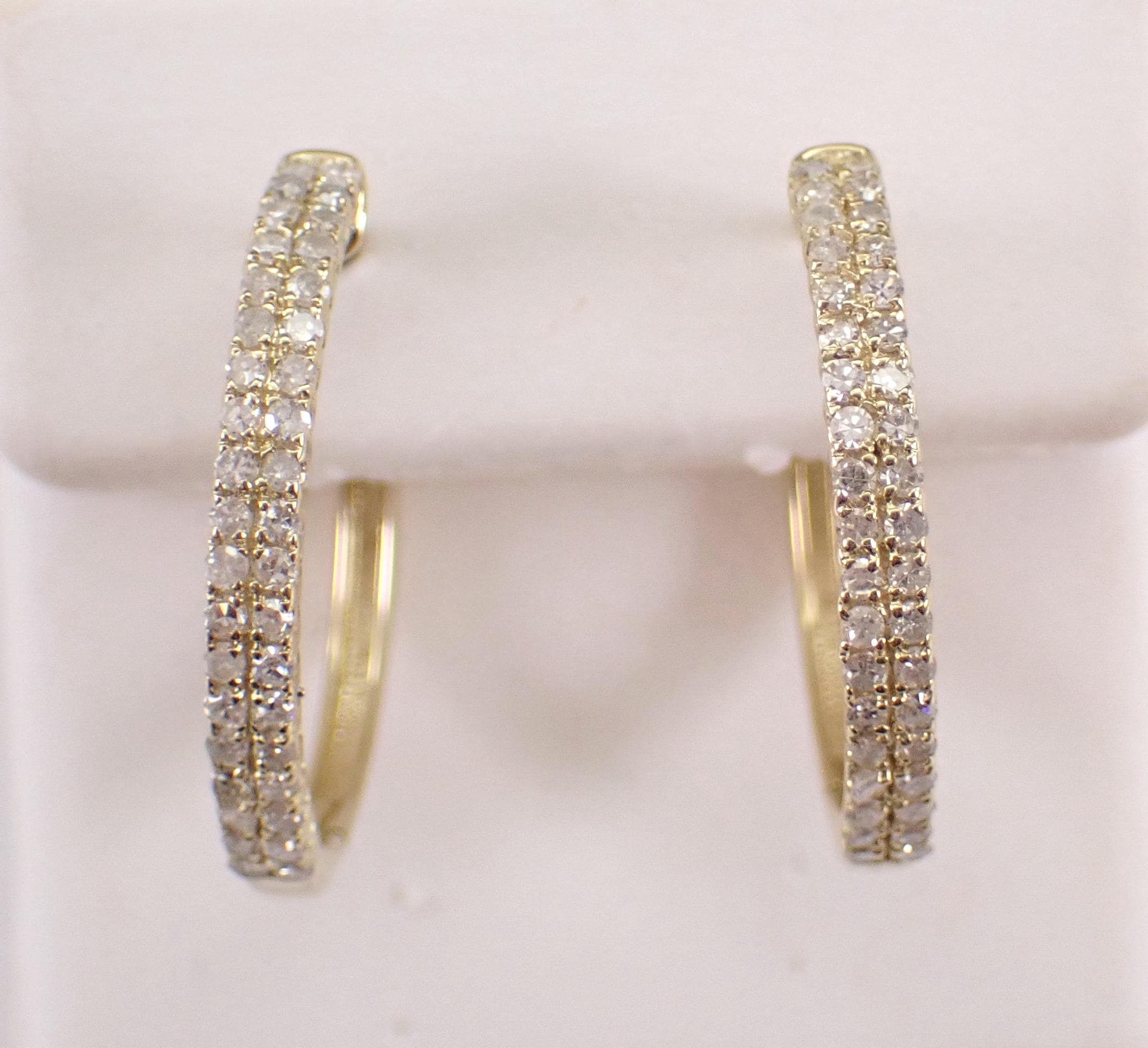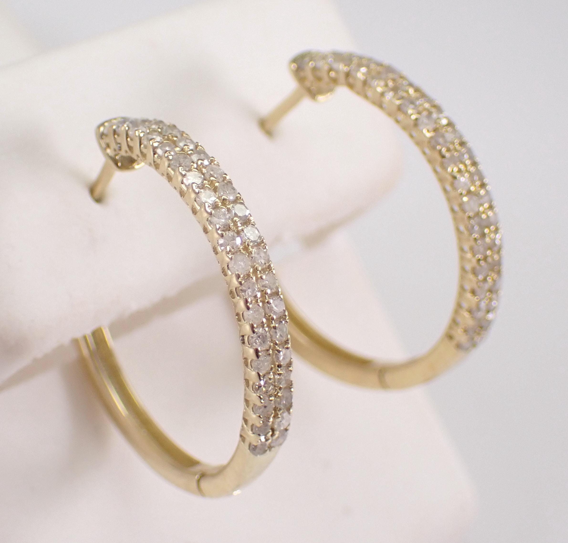 Yellow Gold Diamond Hoop Earrings. These earrings are set with thirty-eight genuine Round Brilliant Diamonds in EACH earring. These diamonds are H color, I1 clarity and weigh a total of 1/2 carat. These earrings are 10K Yellow Gold and weigh a total of 2.6 grams. These earrings are for pierced ears and measure 21 mm in diameter. These earrings will be accompanied by an appraisal written by a GIA Certified Diamond Grader with the retail replacement value of $1,785.00. I will ship these earrings promptly in a gift box.