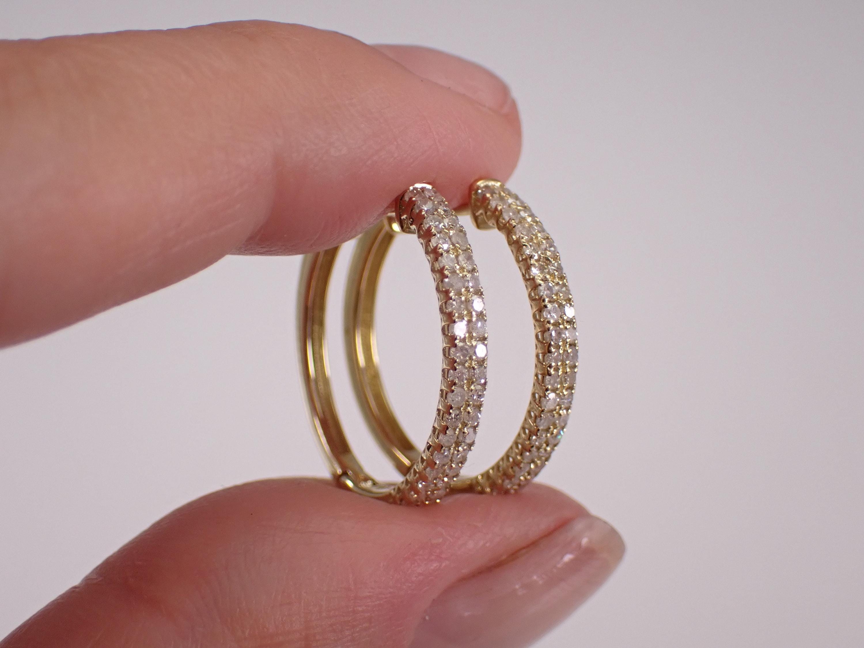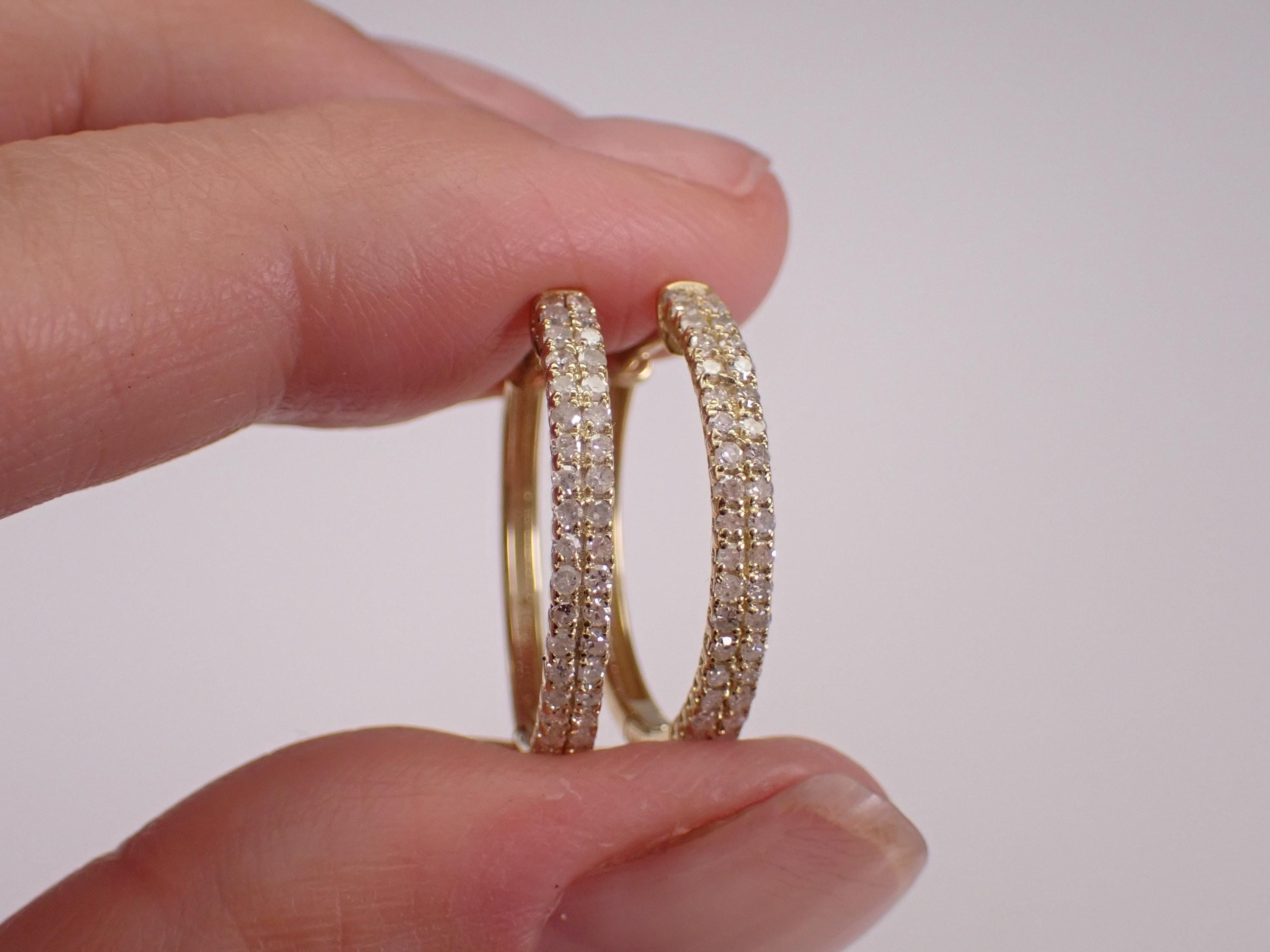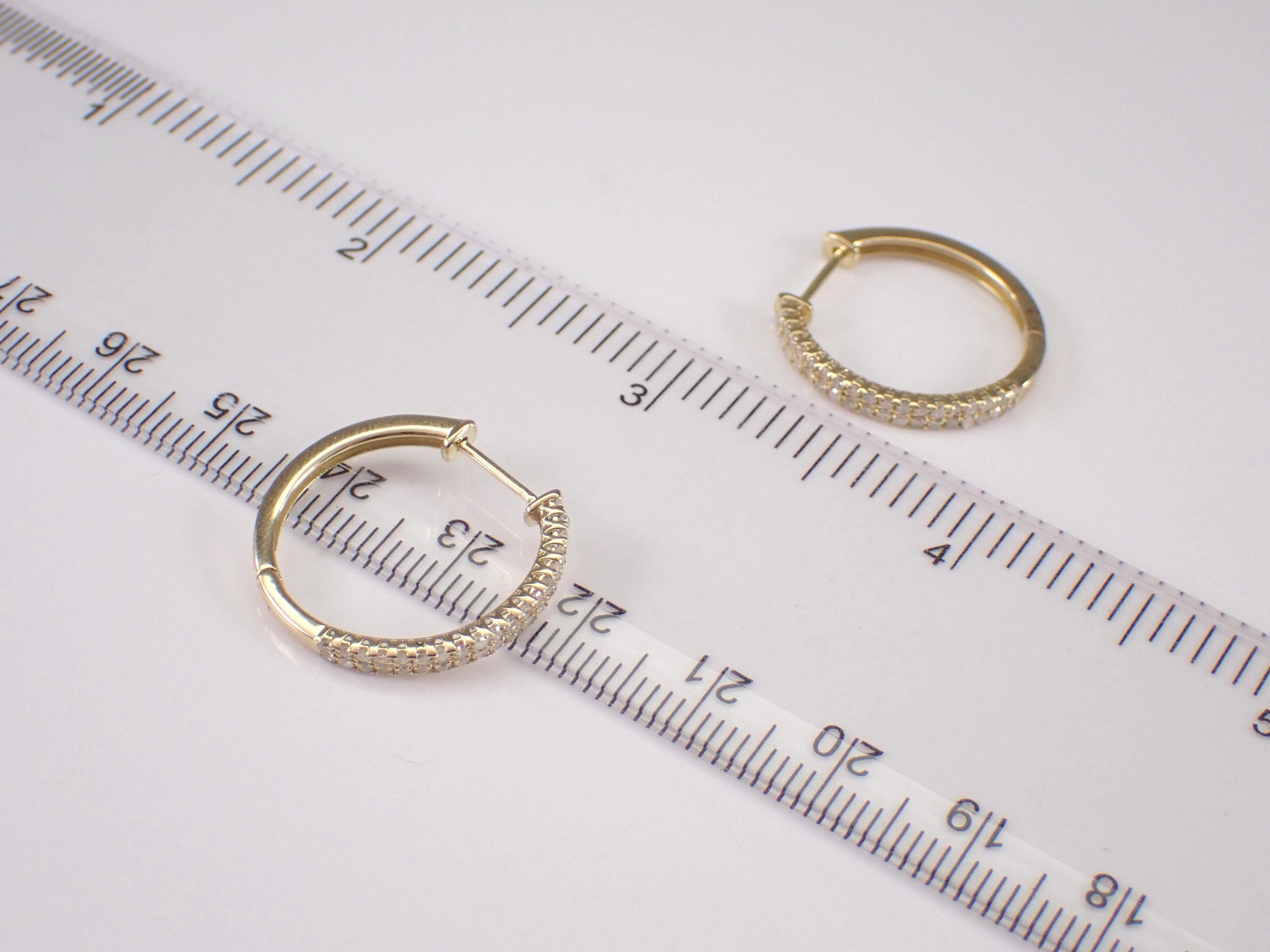 Yellow Gold Diamond Hoop Earrings. These earrings are set with thirty-eight genuine Round Brilliant Diamonds in EACH earring. These diamonds are H color, I1 clarity and weigh a total of 1/2 carat. These earrings are 10K Yellow Gold and weigh a total of 2.6 grams. These earrings are for pierced ears and measure 21 mm in diameter. These earrings will be accompanied by an appraisal written by a GIA Certified Diamond Grader with the retail replacement value of $1,785.00. I will ship these earrings promptly in a gift box.