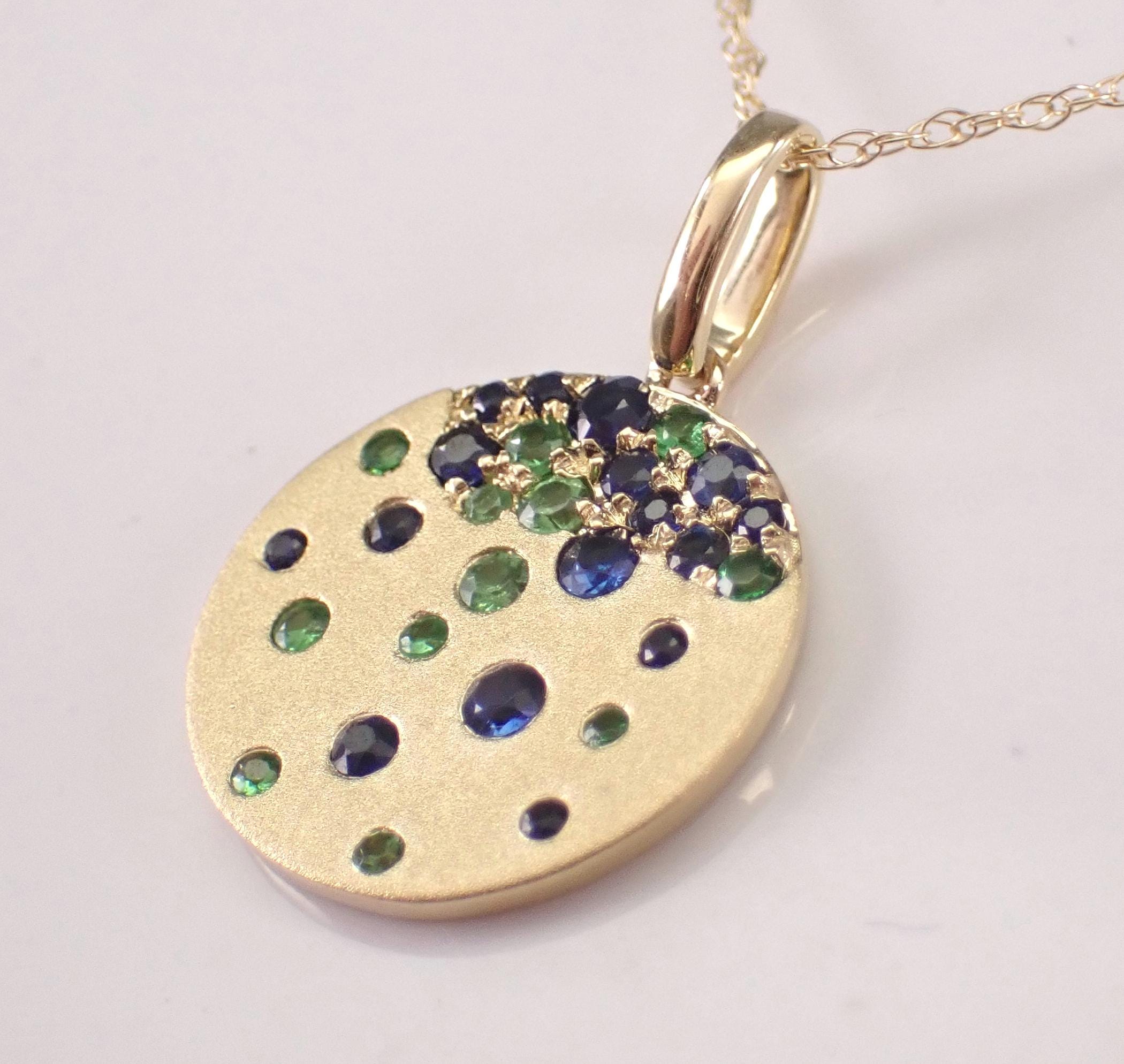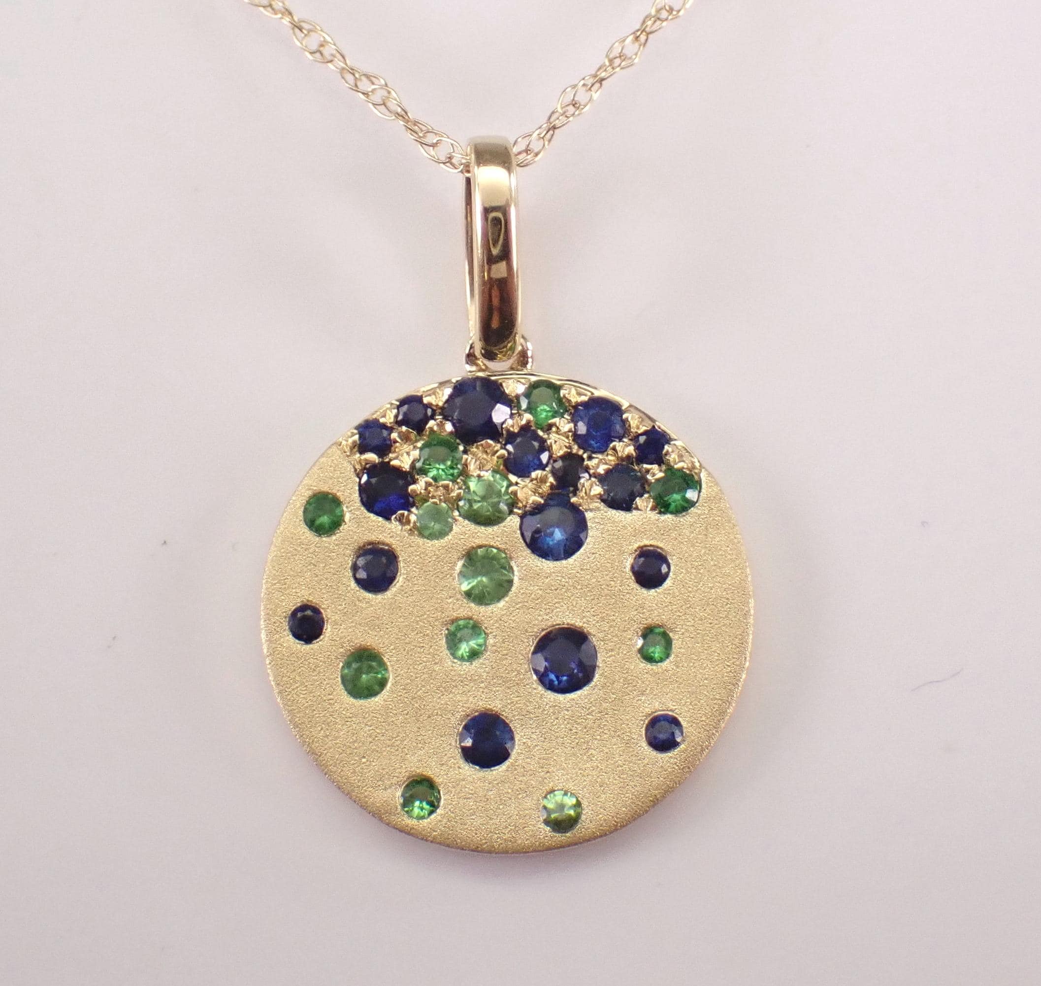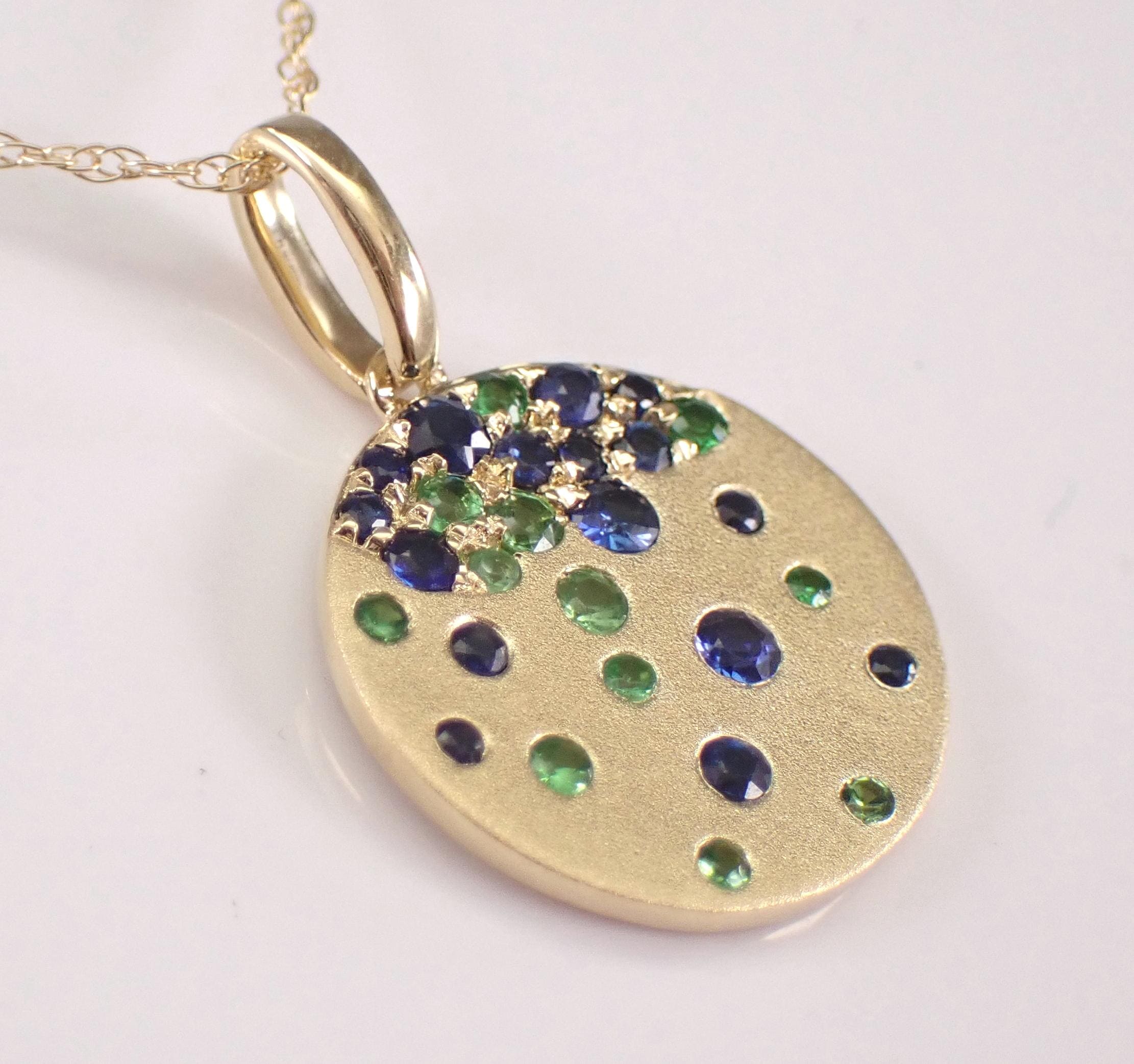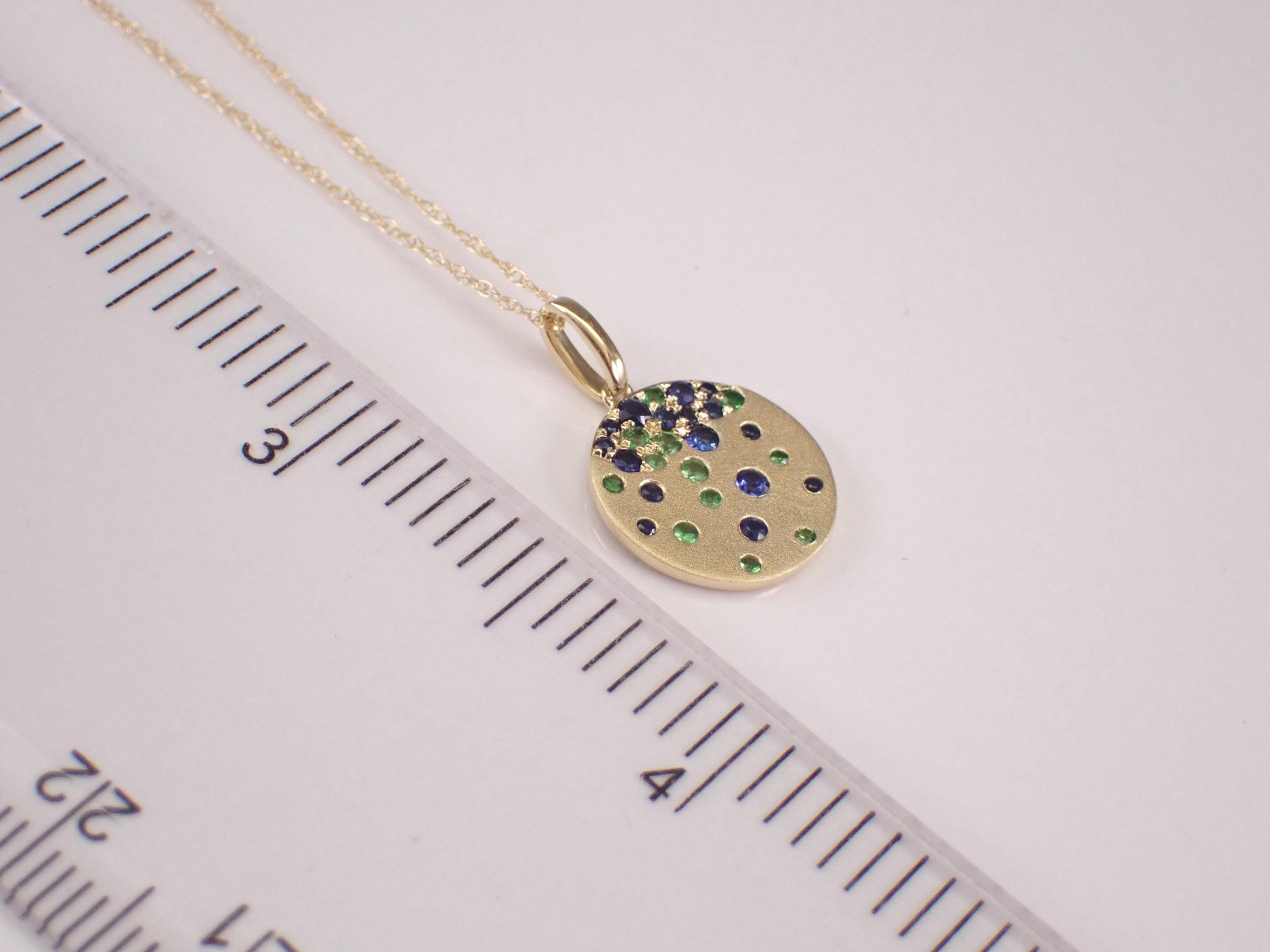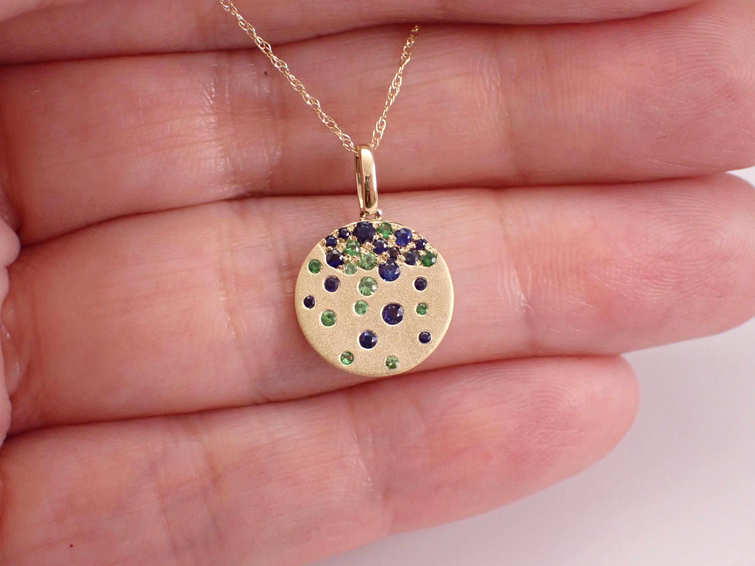 Yellow Gold Sapphire and Emerald Pendant Necklace. This necklace is set with sixteen genuine Round Sapphires and twelve natural Round Emeralds. These gemstones amount to a total weight of 1/2 carat. This necklace is 10KT Yellow Gold and comes with an 18" 10KT Yellow Gold chain. This necklace weighs 1.7 grams and the pendant measures 12.5 mm in diameter without the bail. This necklace will be accompanied by an appraisal by a GIA Certified Diamond Grader with the retail replacement value of $1,395.00. I will ship this necklace promptly in a beautiful gift box.