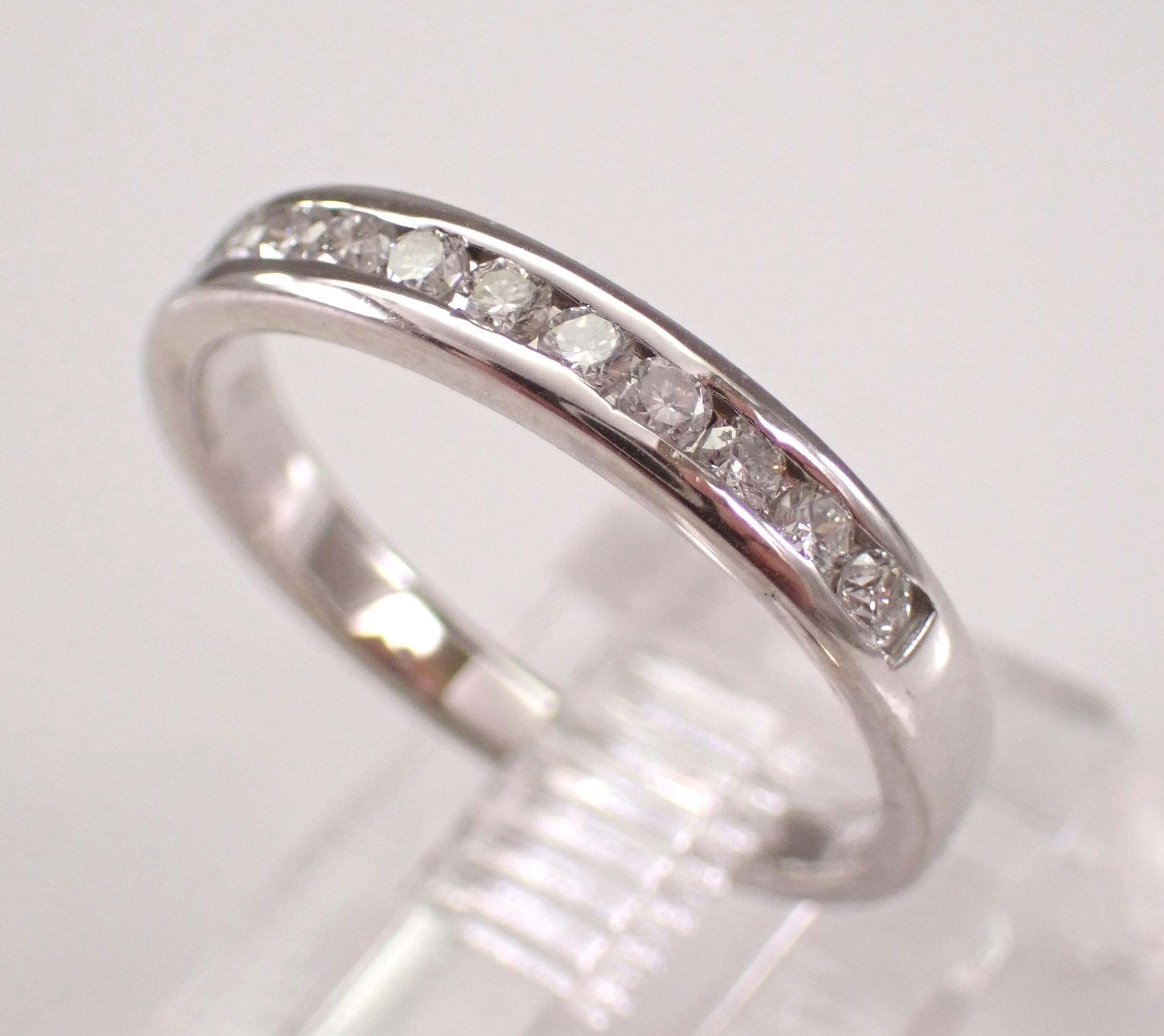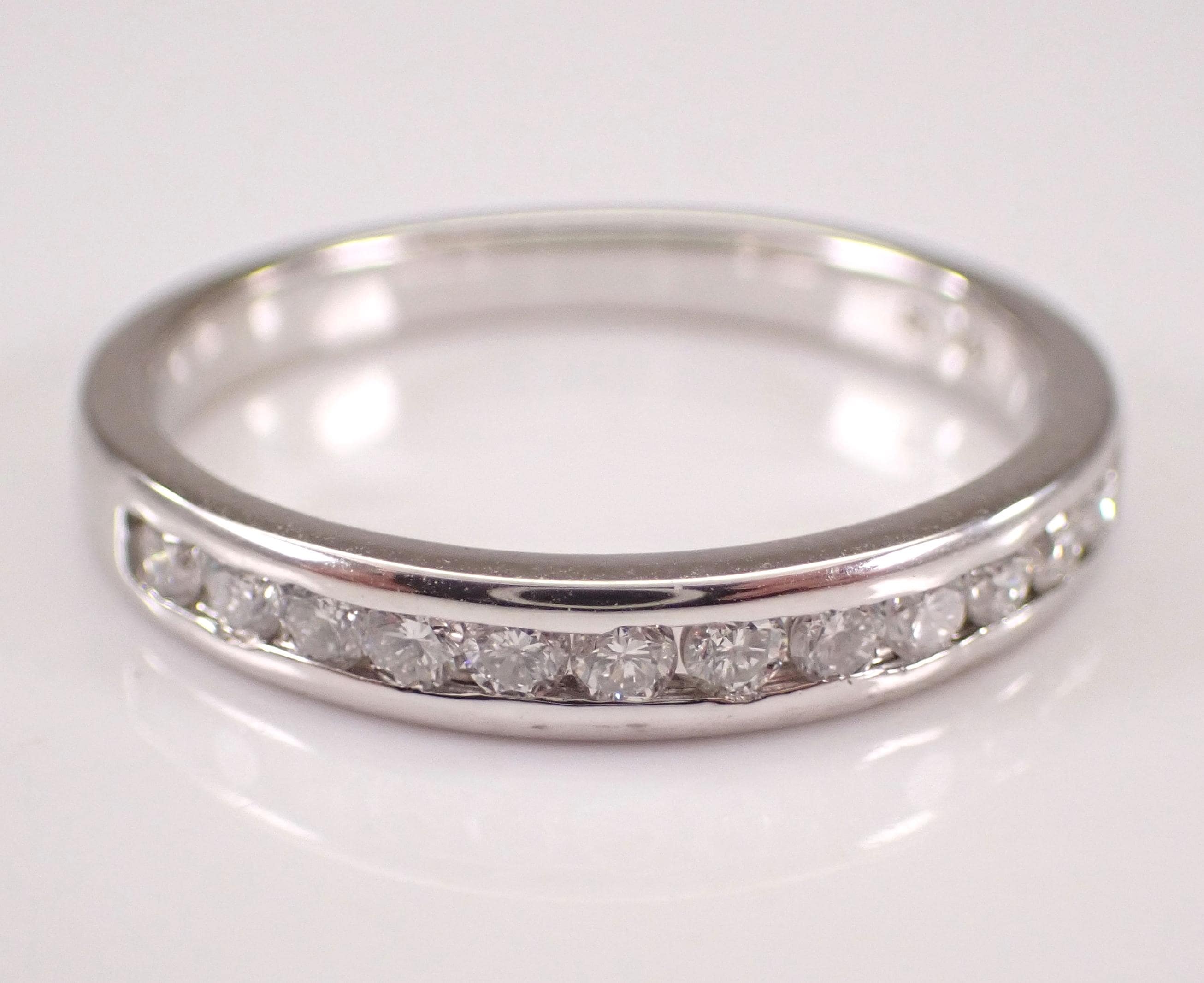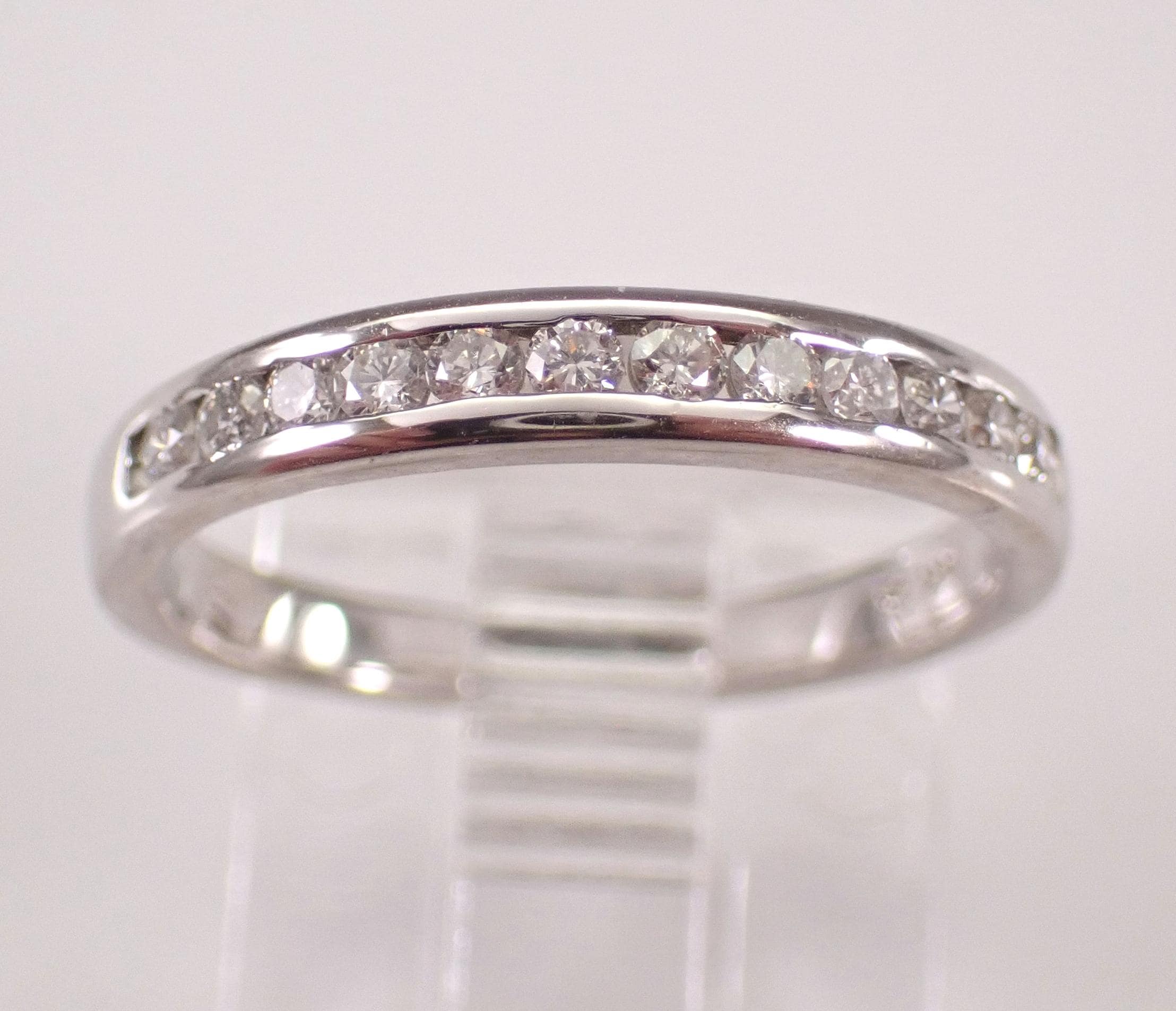 14K White Gold Diamond Wedding Ring Anniversary Band. This ring is set with twelve genuine round brilliant diamonds. These diamonds are H color, SI1 clarity and weigh a total of .20 carat. This ring is 14KT White Gold, weighs 1.7 grams, measures 2.5 mm in width and is a finger size 4, can be resized (please inquire about sizing with the finger size you need). This ring will be accompanied by an appraisal written by a GIA Certified Diamond Grader with the retail replacement value of $1,385.00. I will ship this ring promptly in a beautiful gift box.