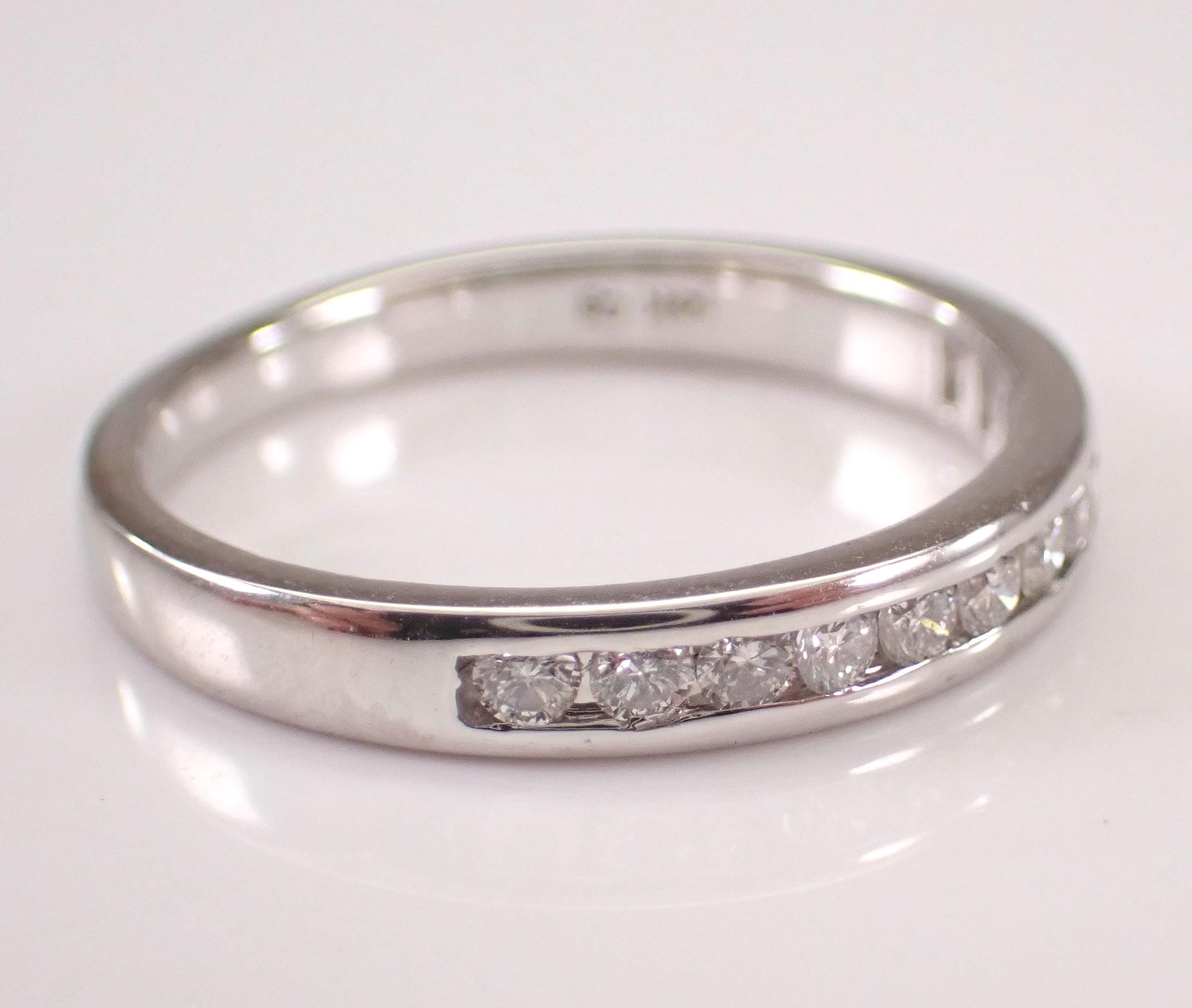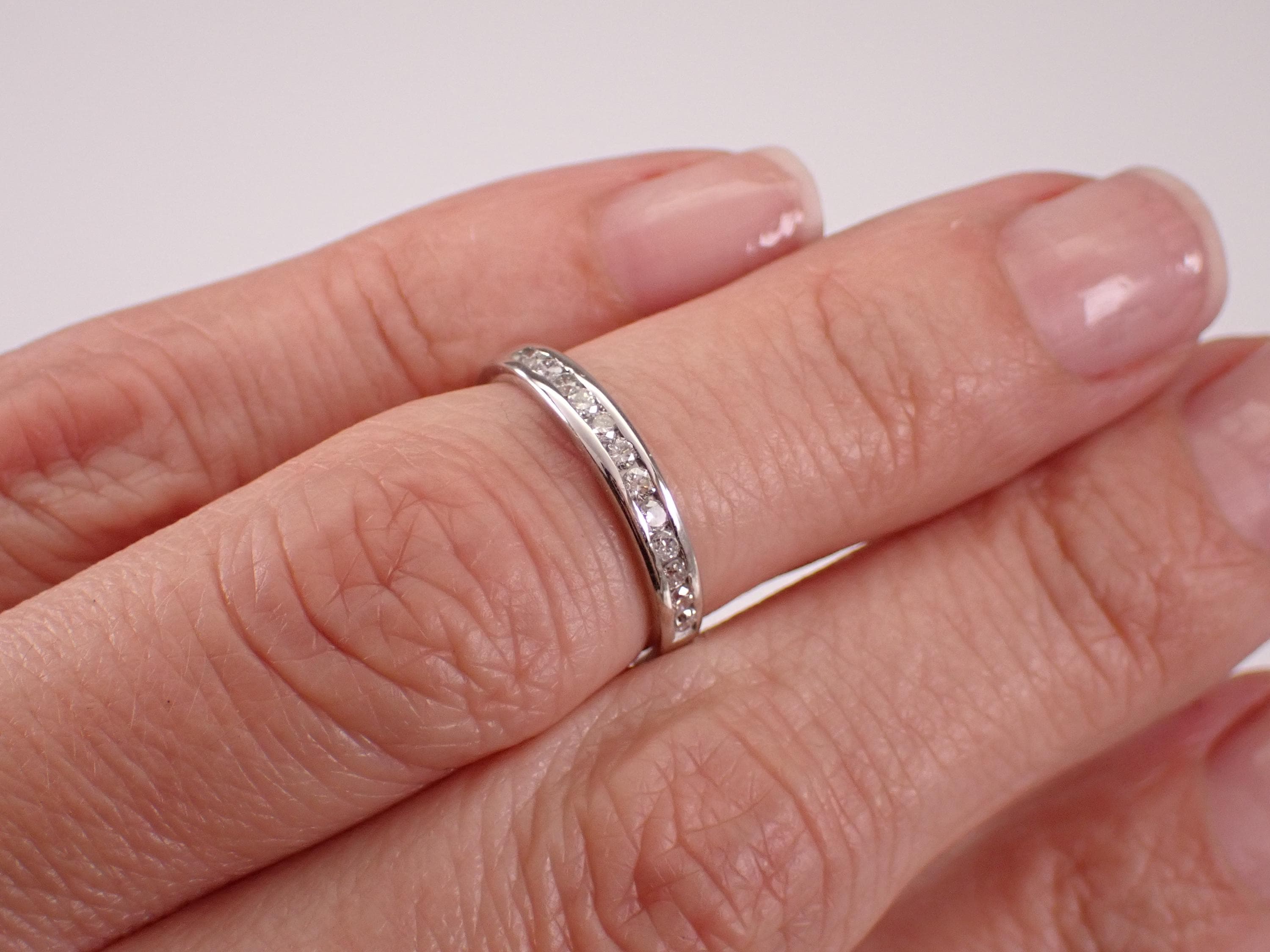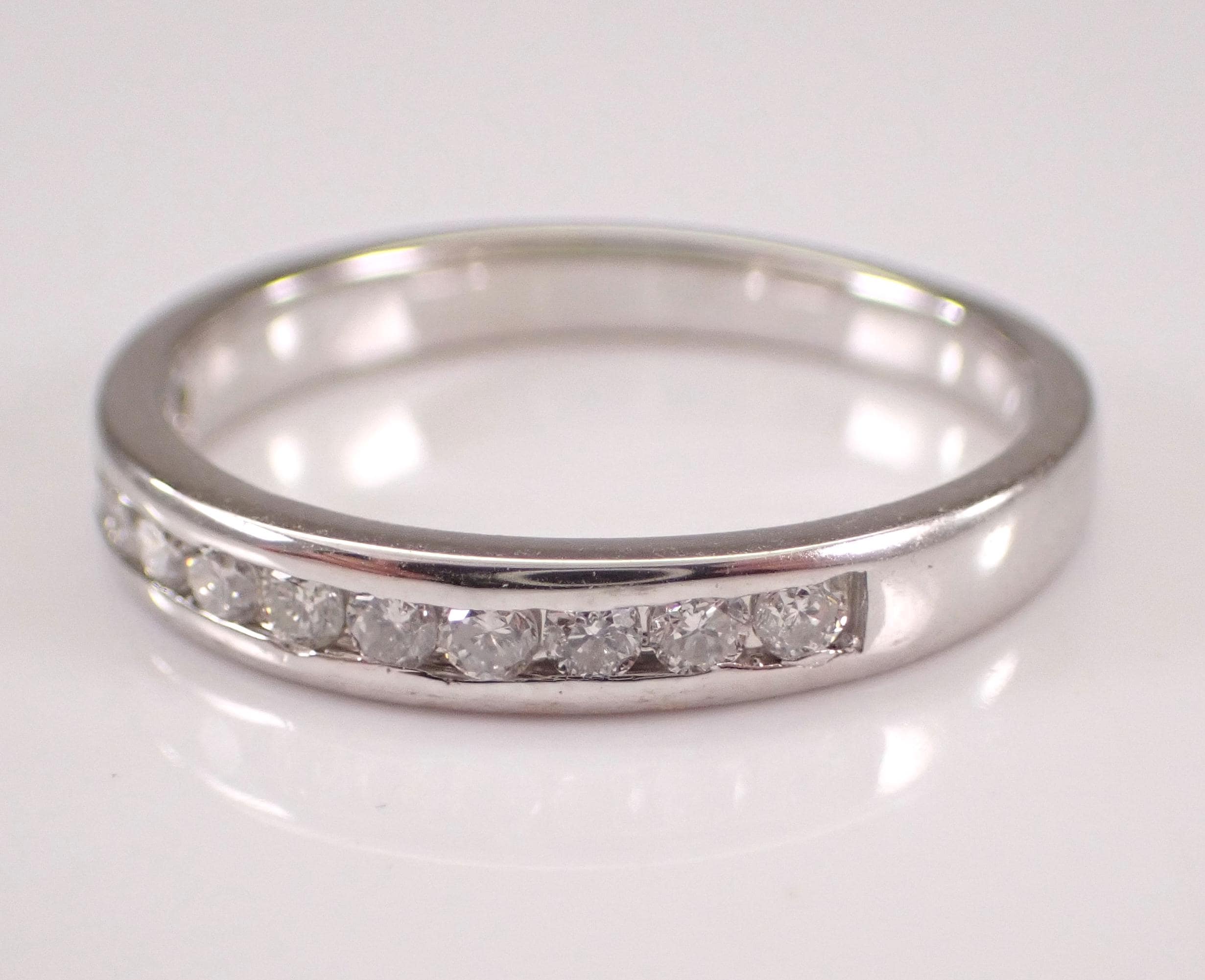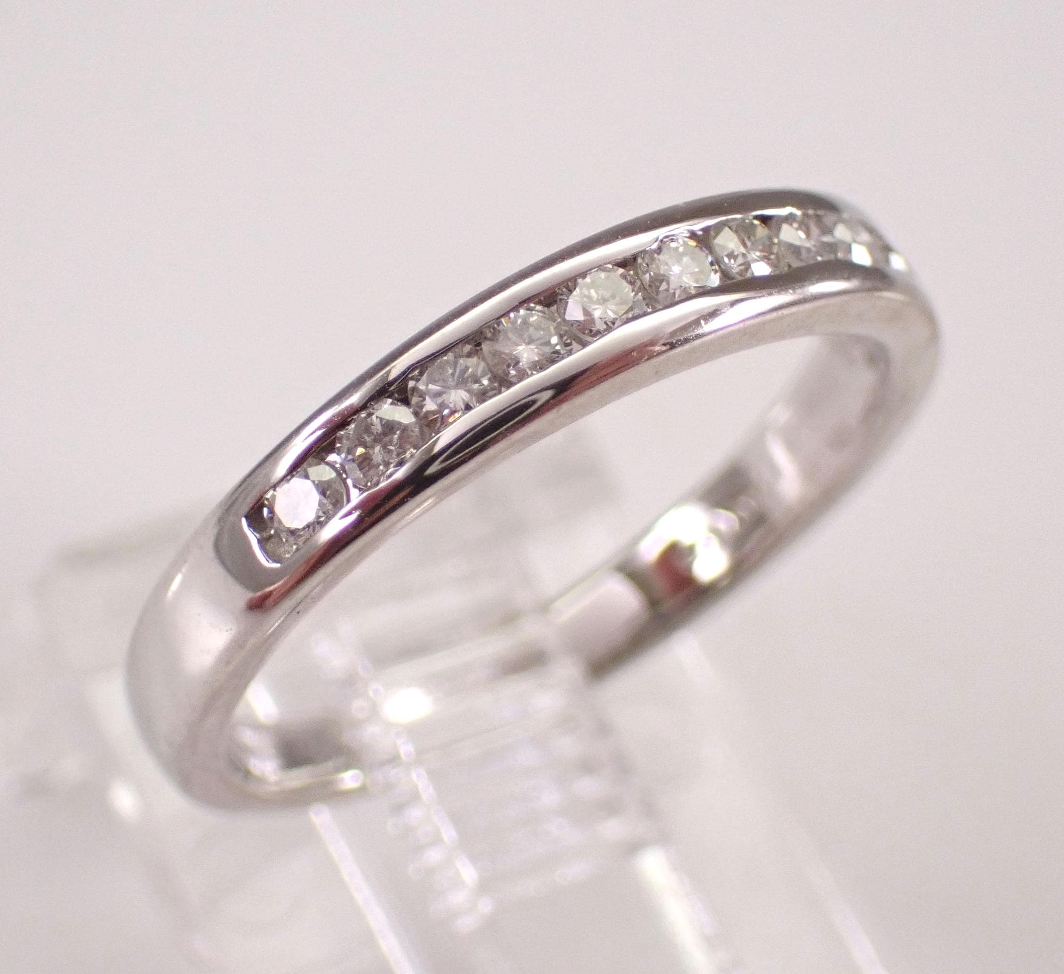 14K White Gold Diamond Wedding Ring Anniversary Band. This ring is set with twelve genuine round brilliant diamonds. These diamonds are H color, SI1 clarity and weigh a total of .20 carat. This ring is 14KT White Gold, weighs 1.7 grams, measures 2.5 mm in width and is a finger size 4, can be resized (please inquire about sizing with the finger size you need). This ring will be accompanied by an appraisal written by a GIA Certified Diamond Grader with the retail replacement value of $1,385.00. I will ship this ring promptly in a beautiful gift box.