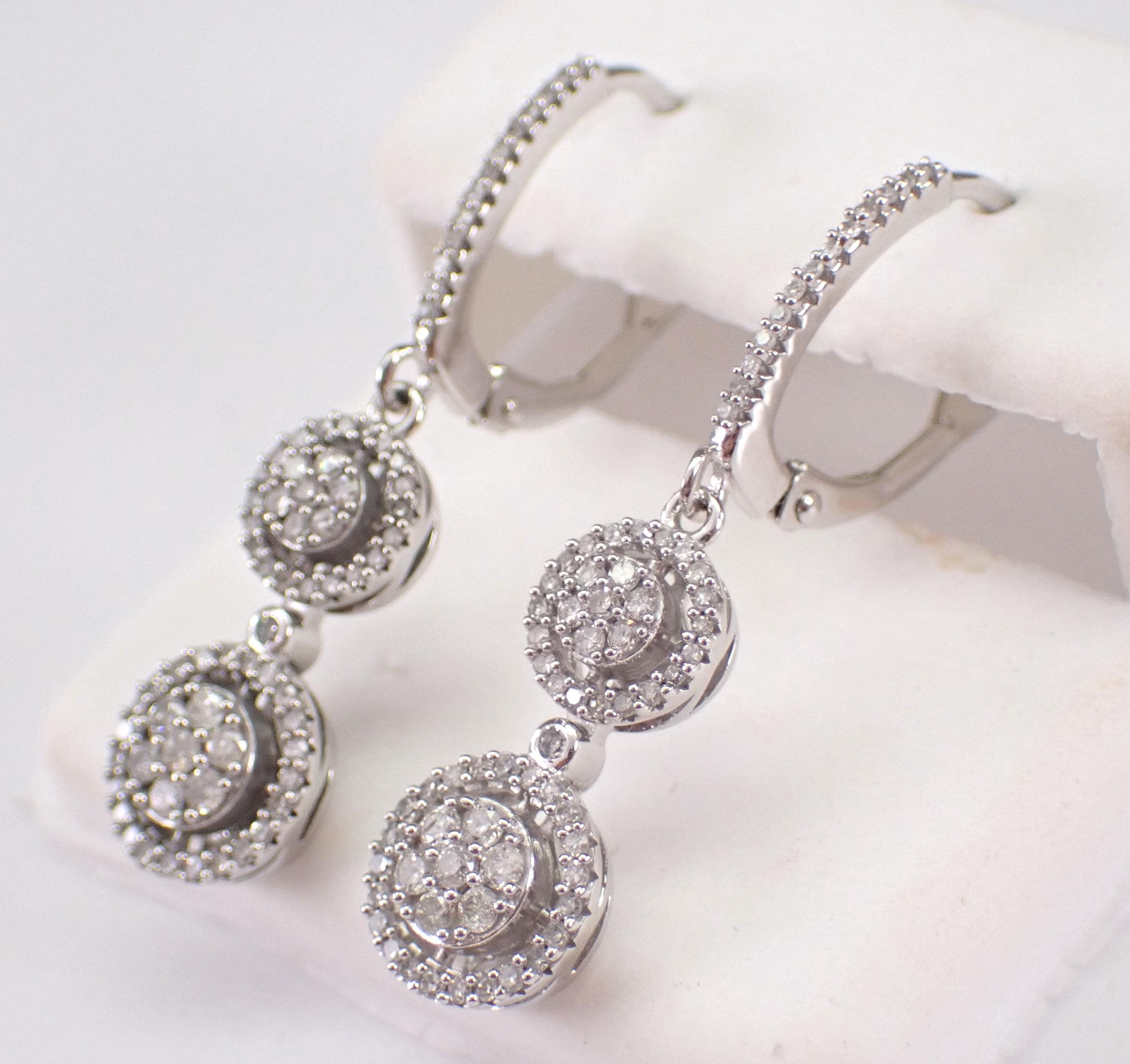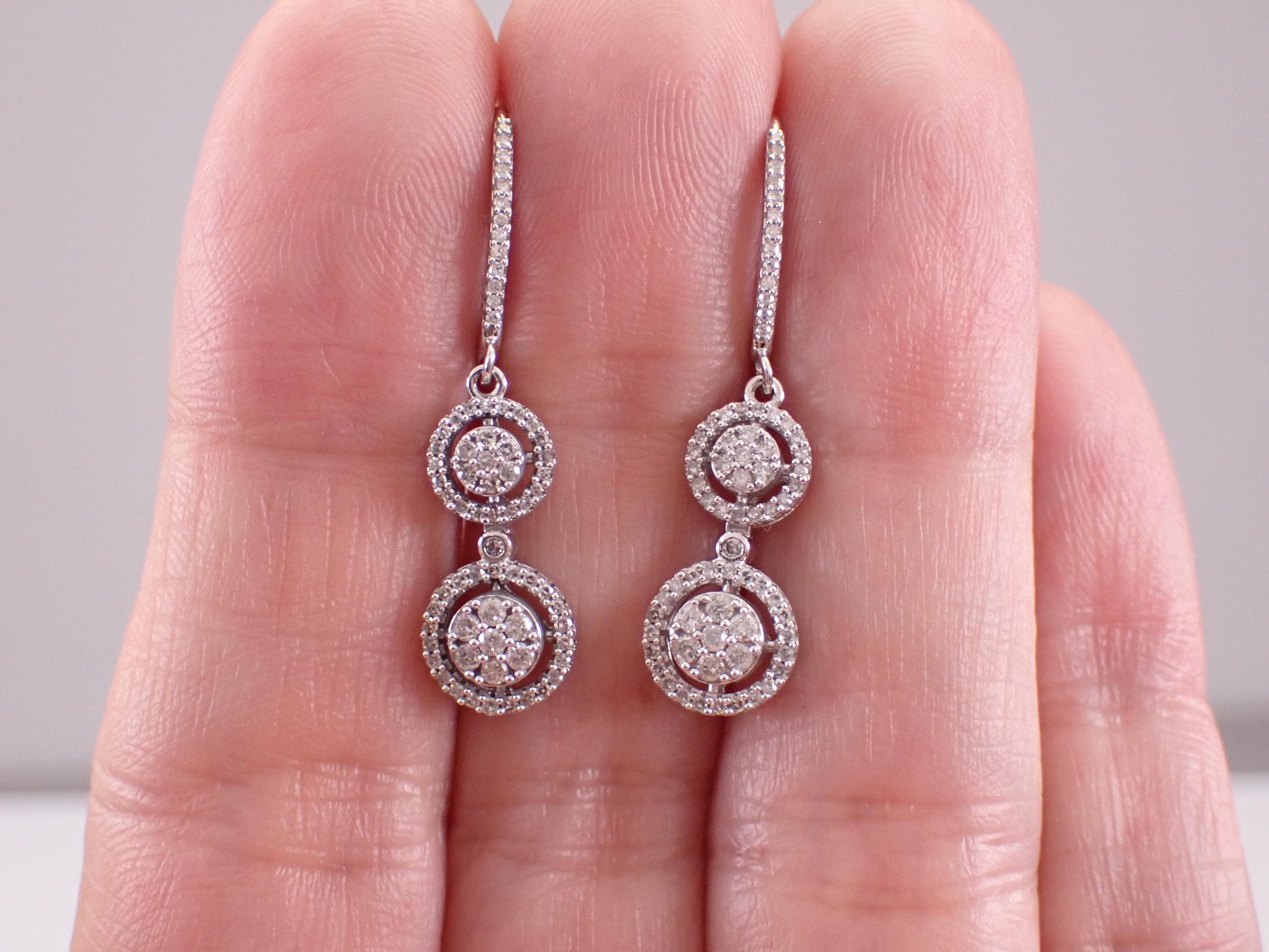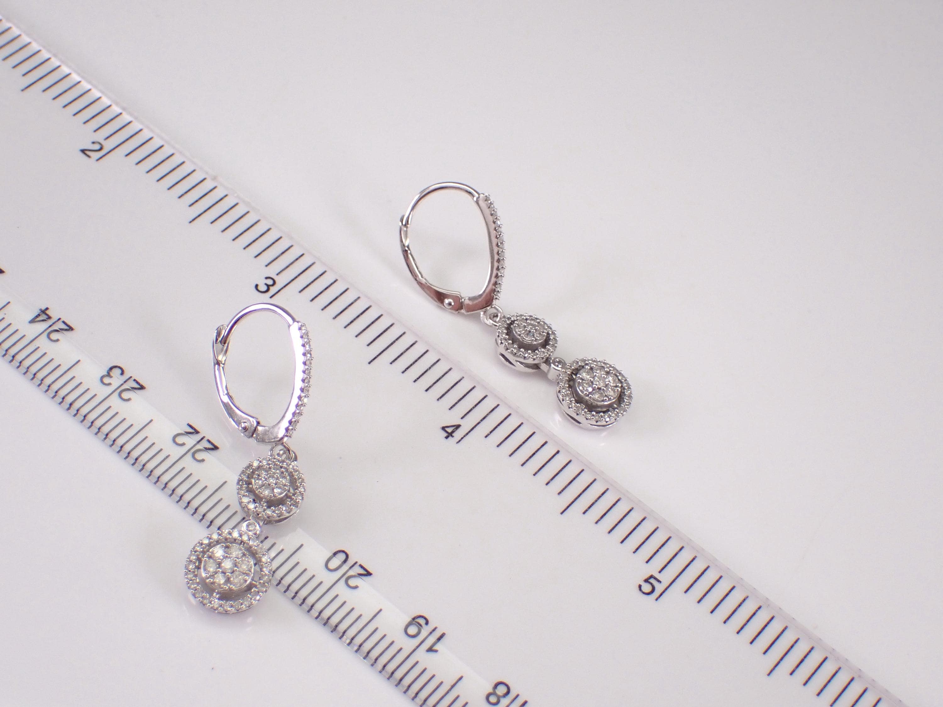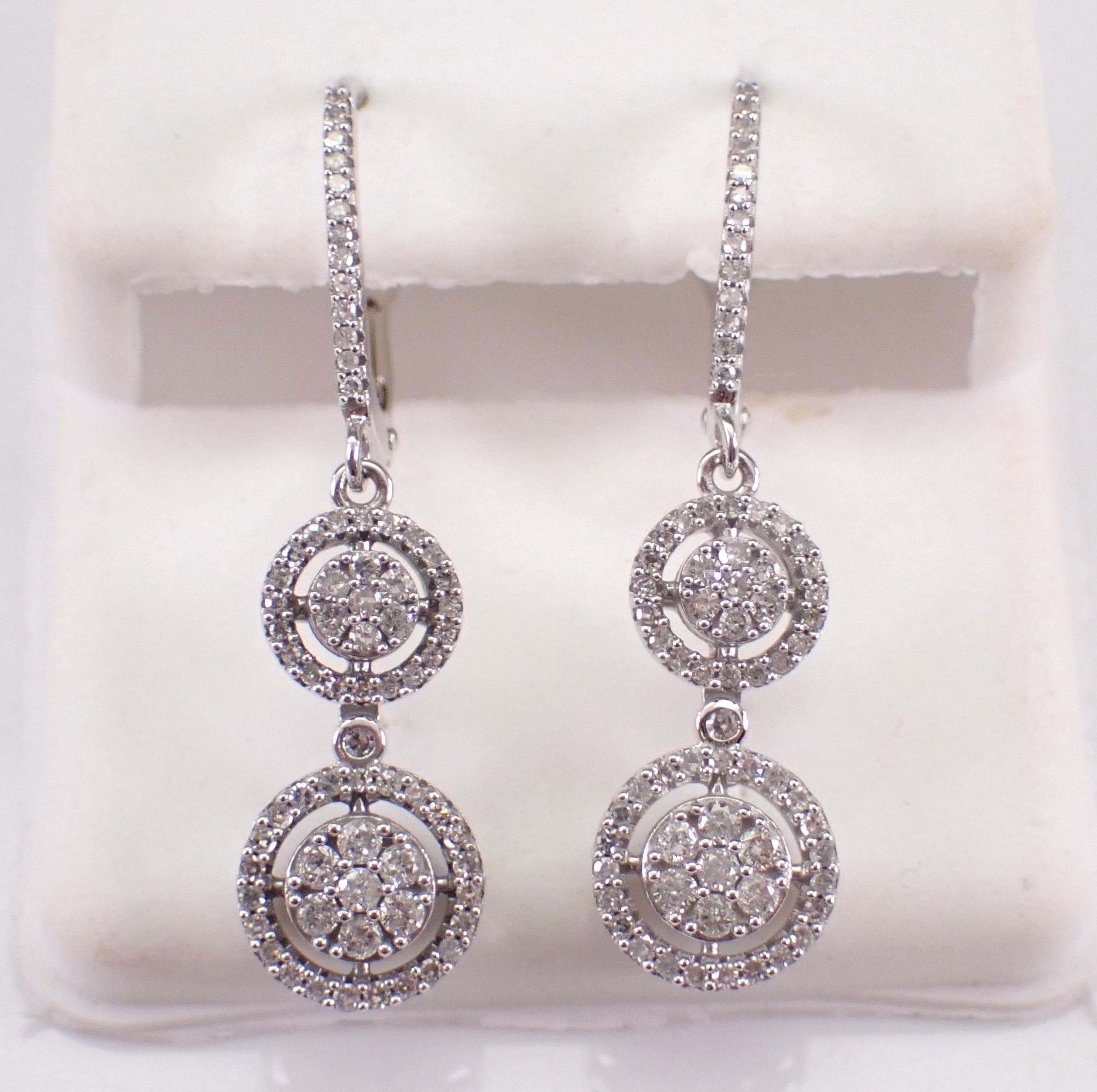 14K White Gold Diamond Dangle Earrings. These earrings are set with seventy-one natural Round Brilliant Diamonds in EACH earring. These diamonds are H color, SI/I1 clarity and weigh a total of 1/2 carat. These earrings are 14KT White Gold and weigh a total of 3.4 grams. These earrings are for pierced ears, measure 33.5 mm in length and have lever back closures. These earrings will be accompanied by an appraisal with the retail replacement value of $2,395.00. I will ship these earrings promptly in a gift box.