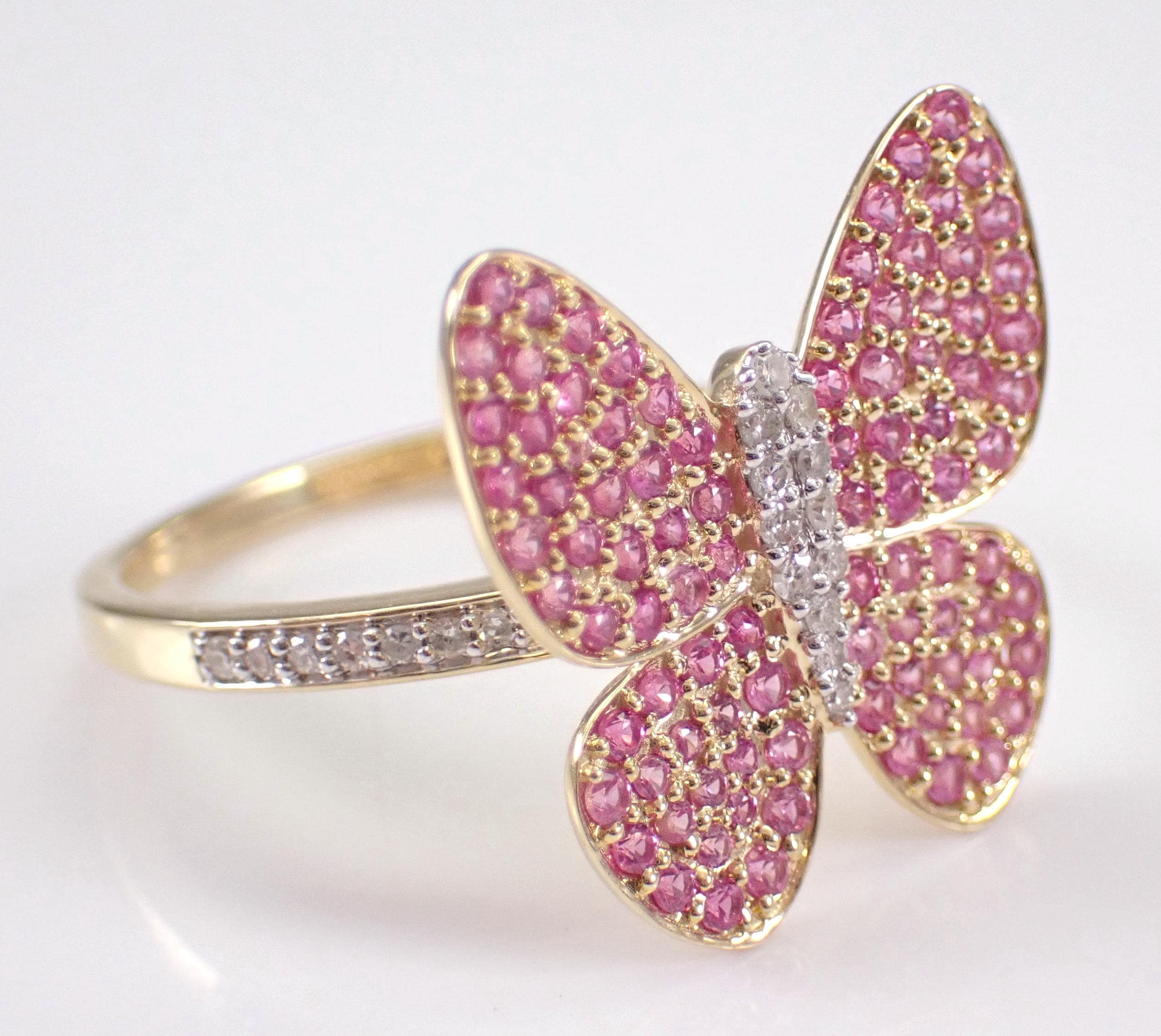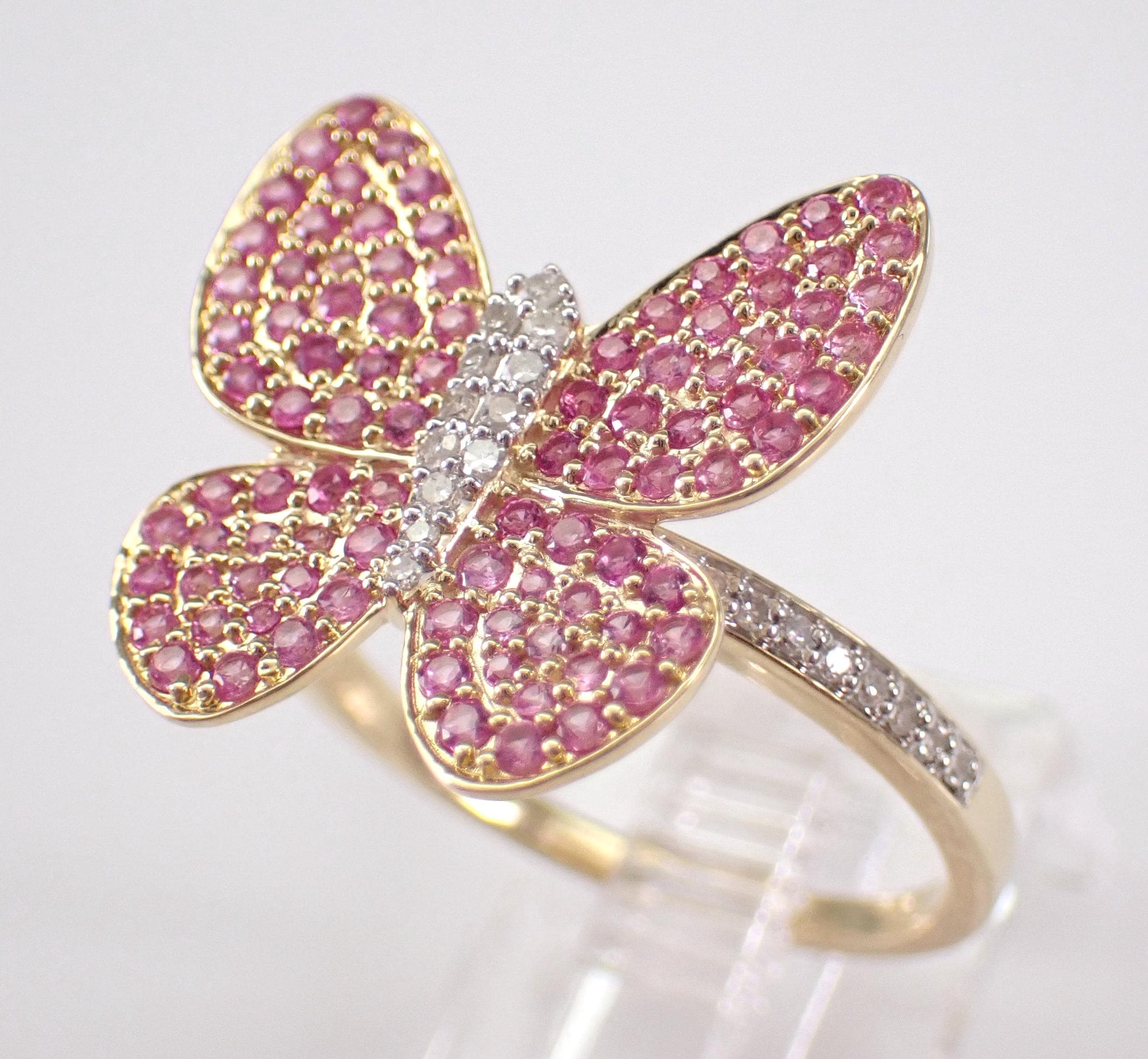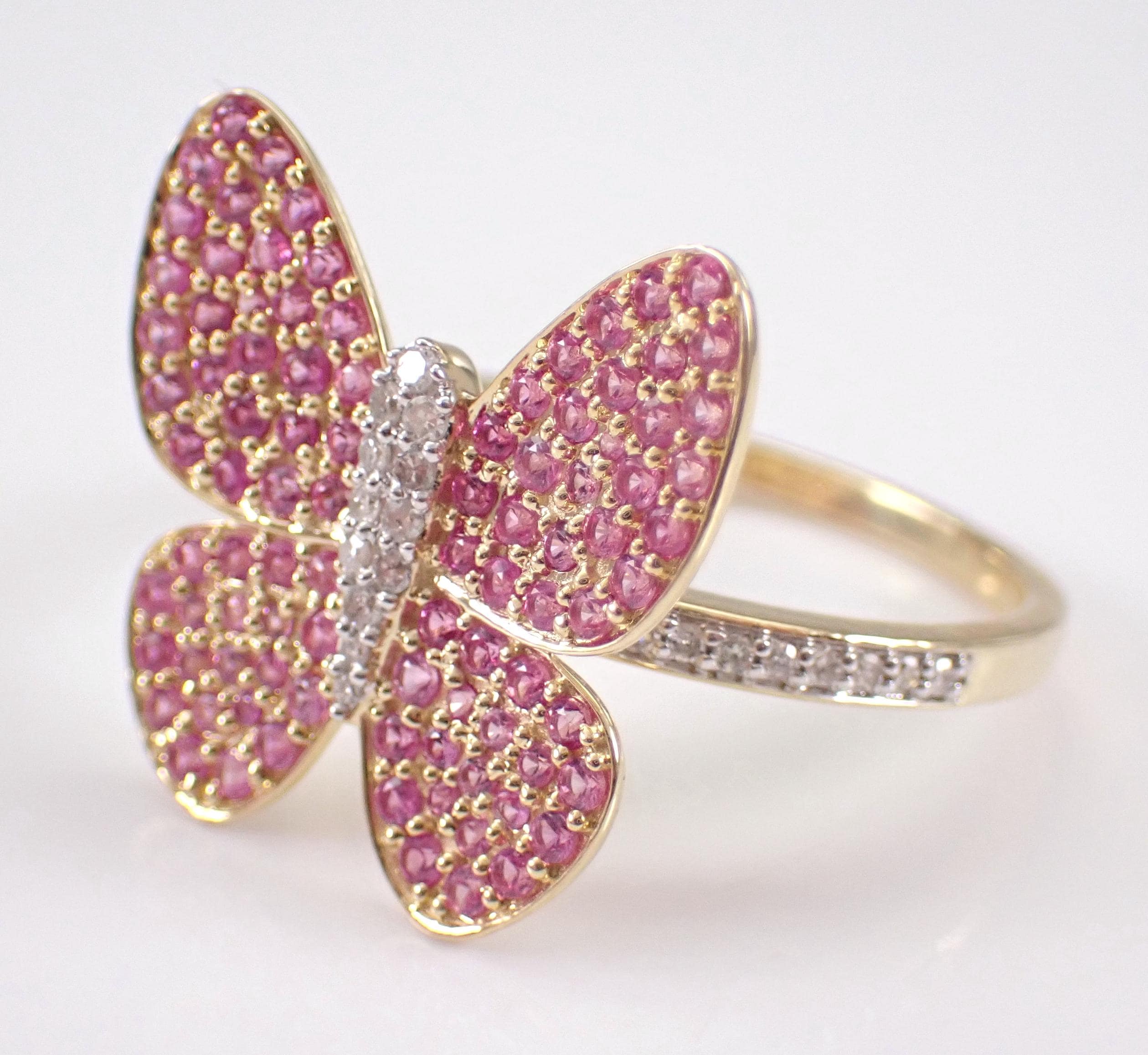 Yellow Gold Pink Sapphire and Diamond Butterfly Ring. This ring is set with ninety-four genuine Round Pink Sapphires and thirty-four natural Round Brilliant Diamonds.  These diamonds are H color, SI clarity and weigh a total of .25 carat. The Pink Sapphires in this ring amount to a total weight of 1 1/4 carat.  This ring is solid 10KT Yellow Gold, weighs 3.6 grams and is a finger size 7, which can be resized free of charge (please inquire about sizing with the finger size you need). The butterfly measures 17 X 17.5 mm.  This ring will be accompanied by an appraisal with the retail replacement value of $2,395.00.  I will ship this ring promptly in a gift box.