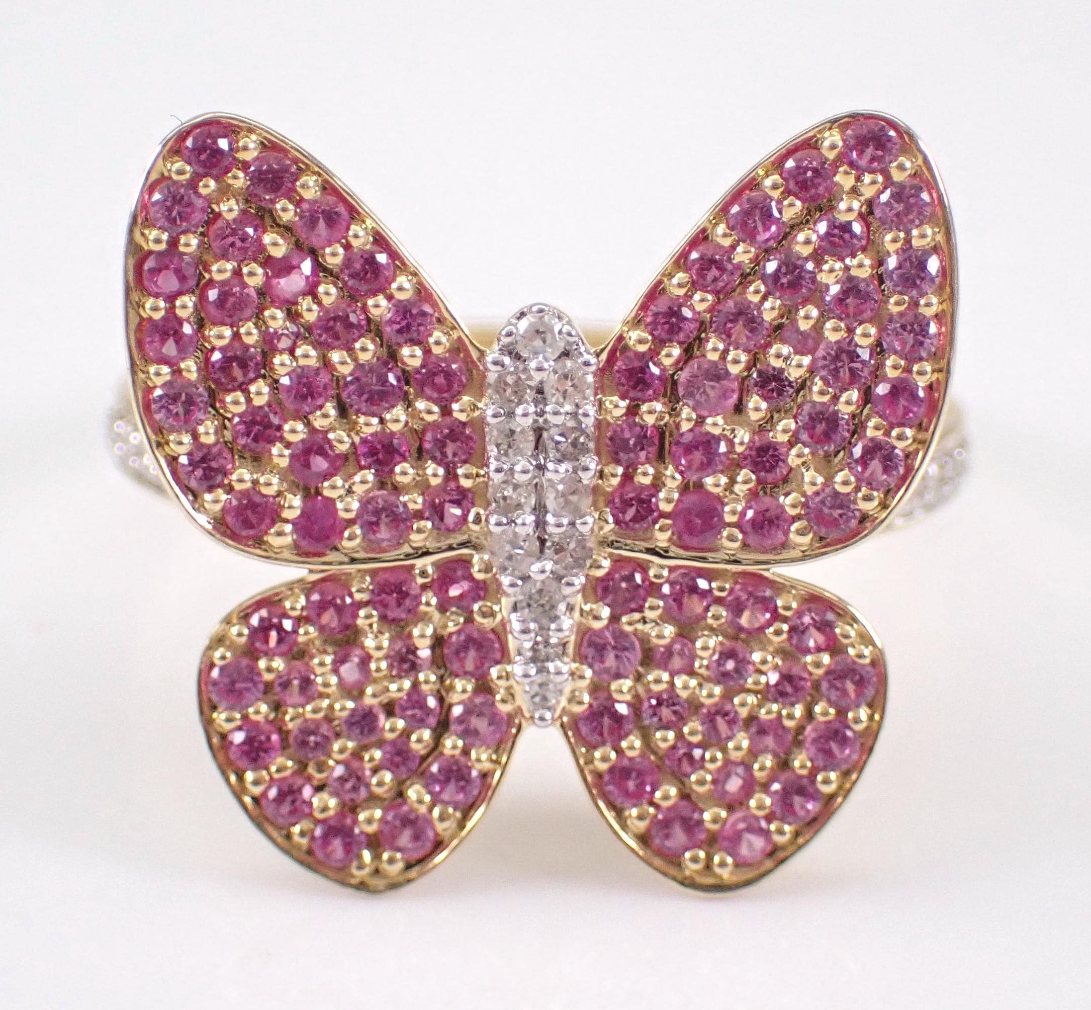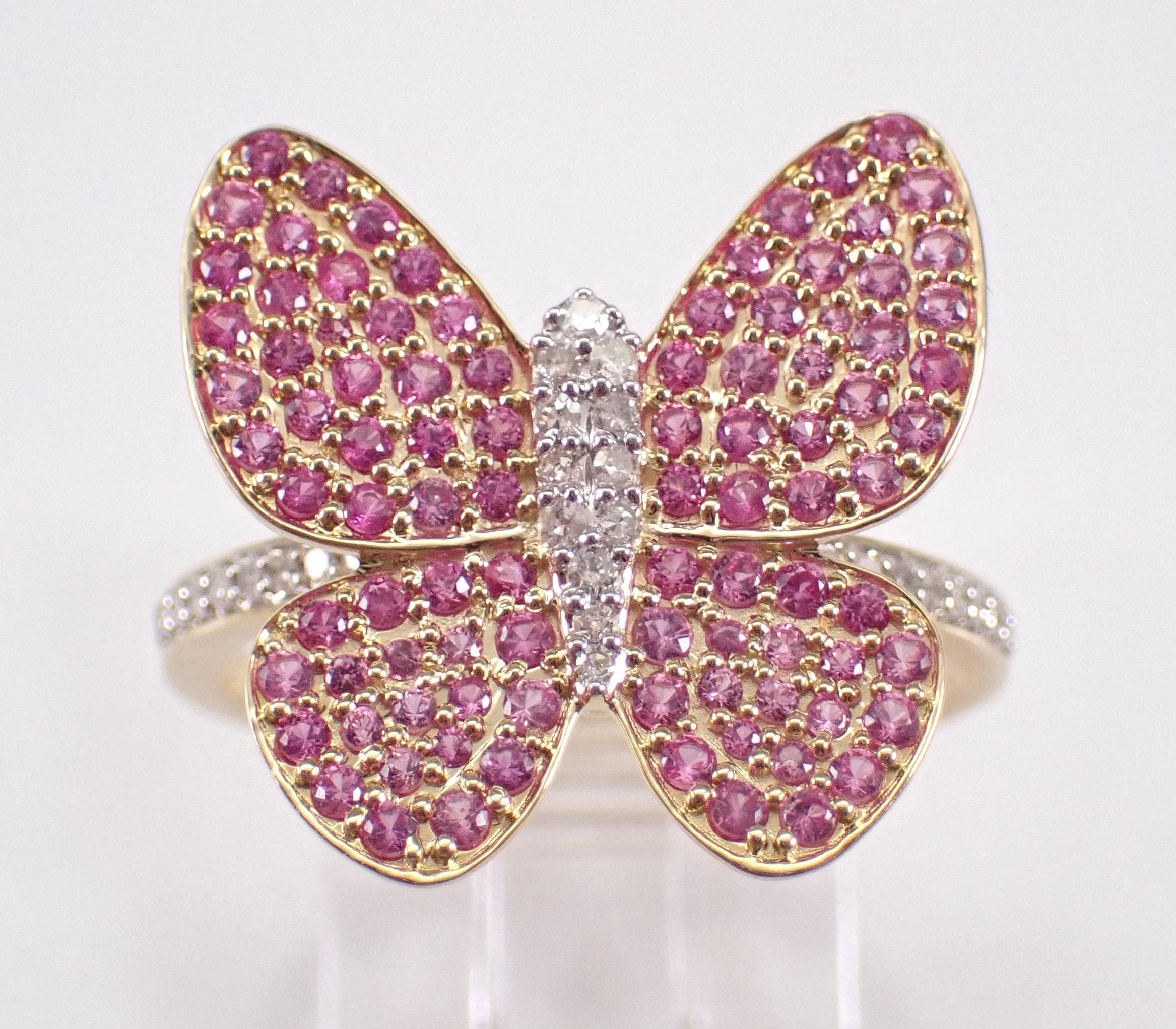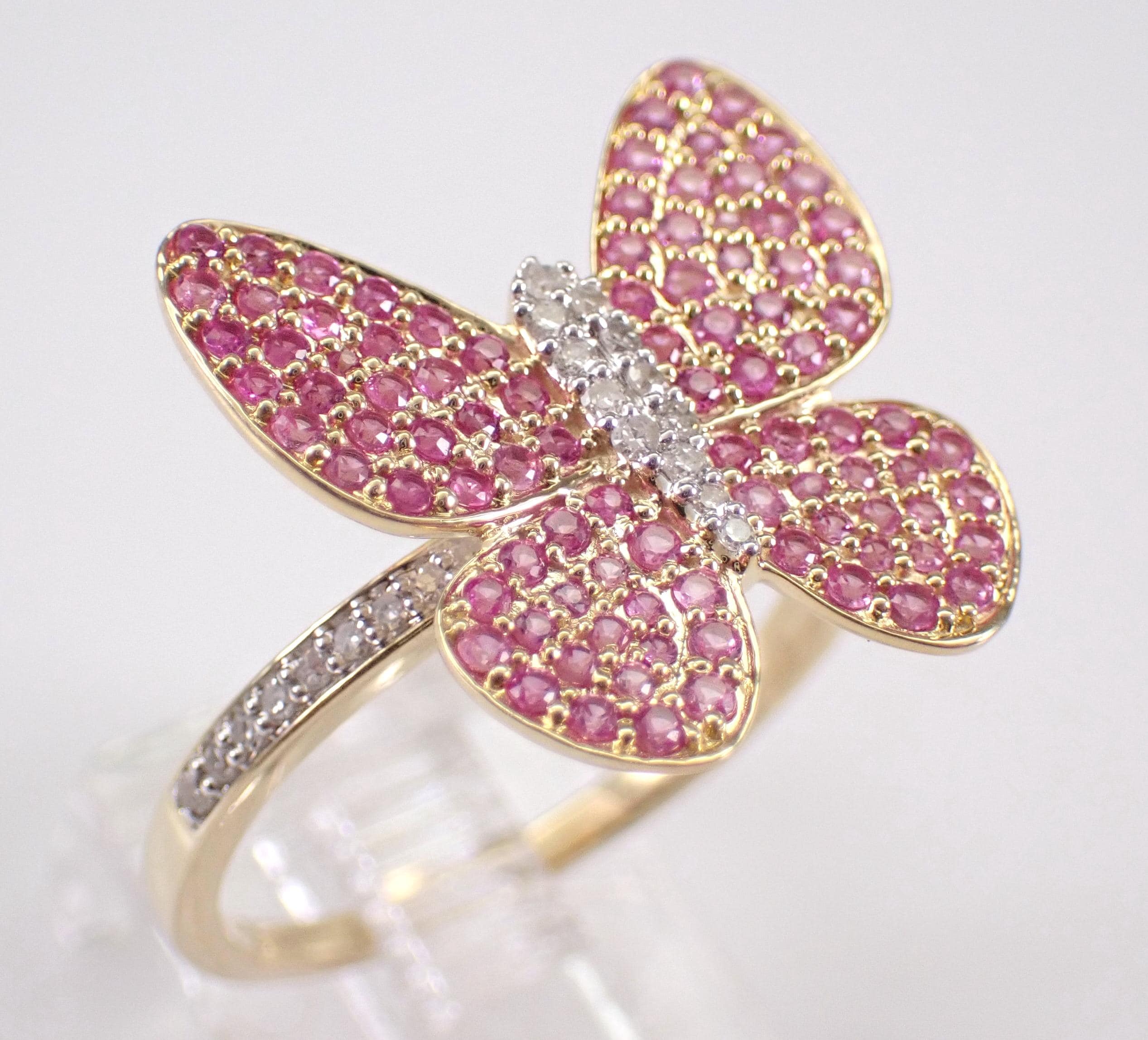 Yellow Gold Pink Sapphire and Diamond Butterfly Ring. This ring is set with ninety-four genuine Round Pink Sapphires and thirty-four natural Round Brilliant Diamonds.  These diamonds are H color, SI clarity and weigh a total of .25 carat. The Pink Sapphires in this ring amount to a total weight of 1 1/4 carat.  This ring is solid 10KT Yellow Gold, weighs 3.6 grams and is a finger size 7, which can be resized free of charge (please inquire about sizing with the finger size you need). The butterfly measures 17 X 17.5 mm.  This ring will be accompanied by an appraisal with the retail replacement value of $2,395.00.  I will ship this ring promptly in a gift box.