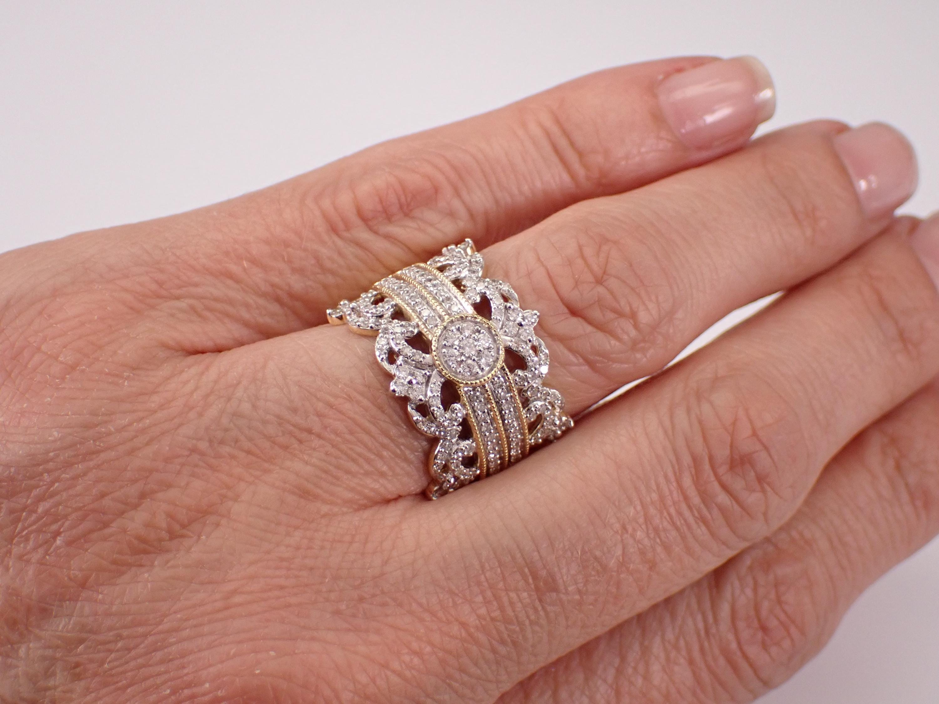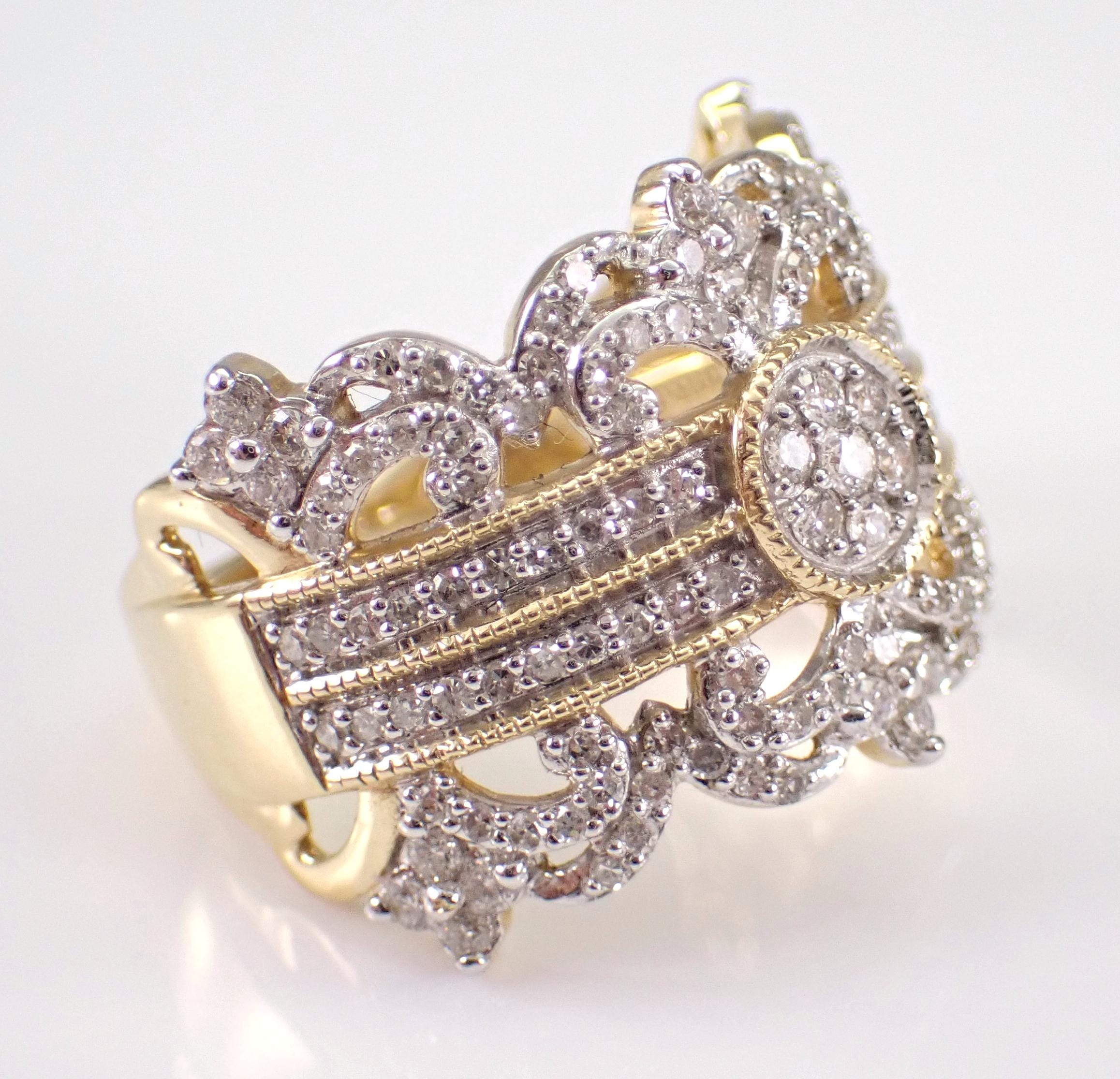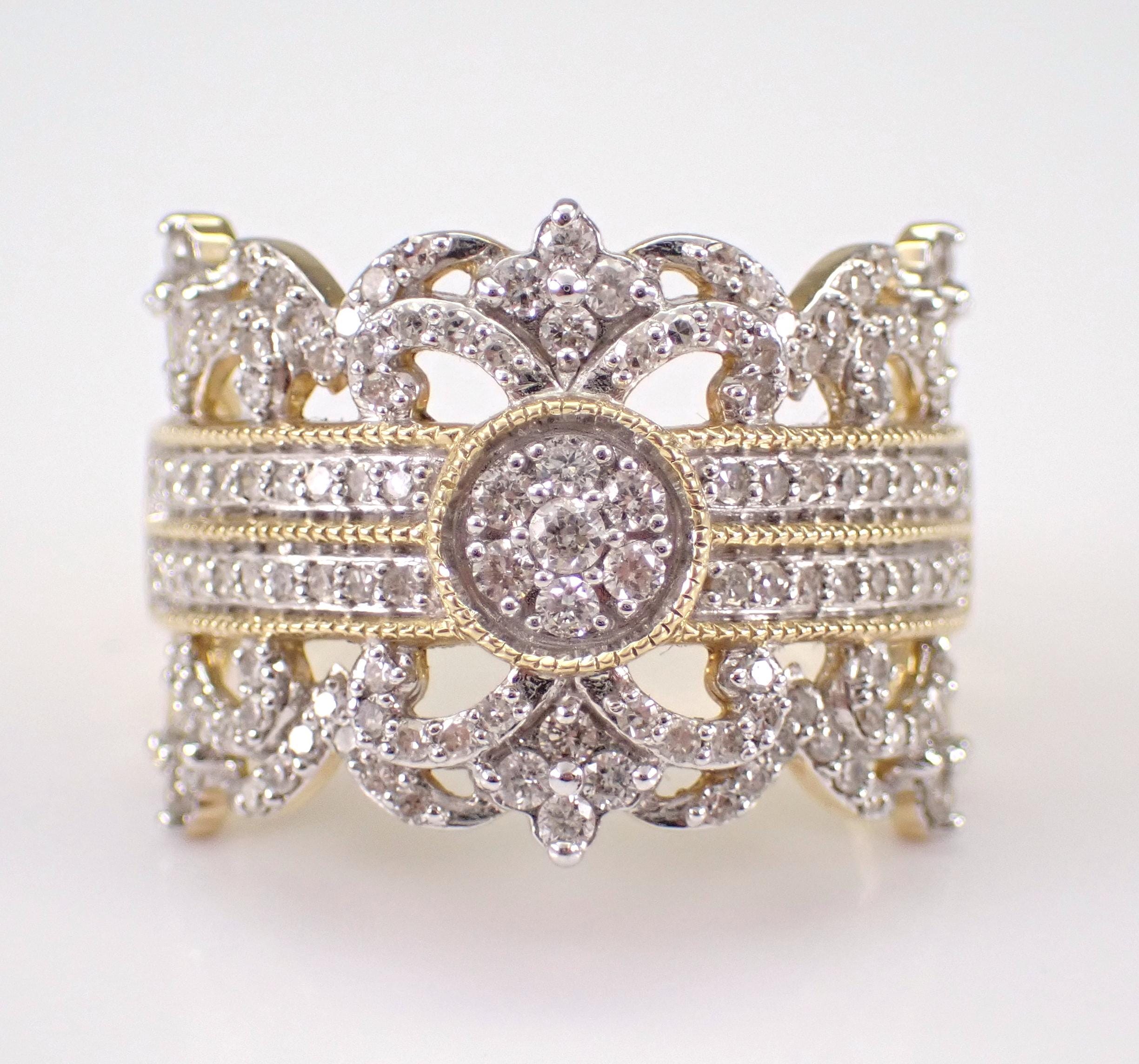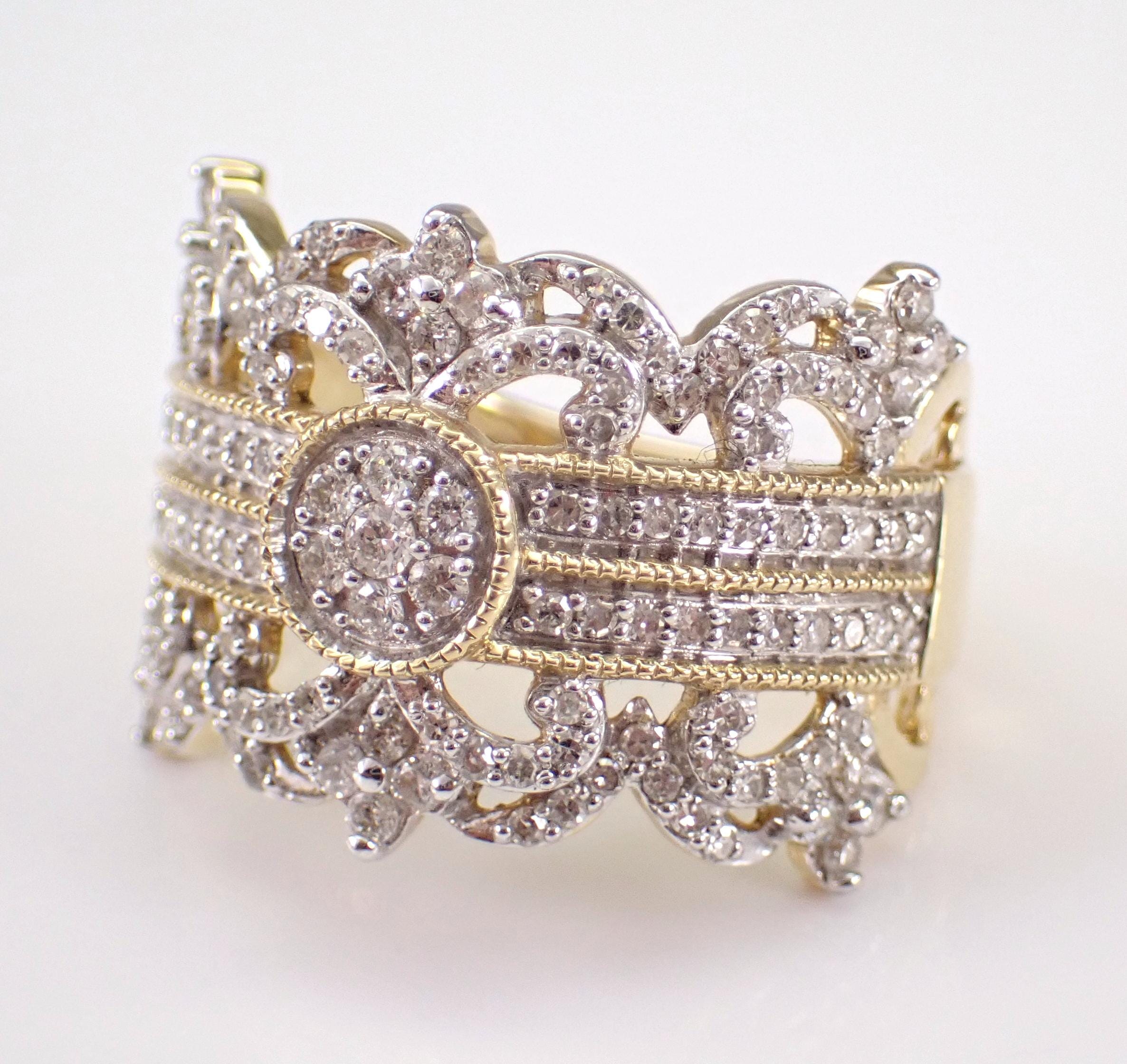14K Yellow Gold Diamond Anniversary Ring. This ring is set with one hundred and forty-one (141) genuine Round Brilliant Diamonds. These diamonds are H color, SI/I1 clarity and weigh a total of 3/4 carat. This ring is 14KT Yellow Gold, weighs 5.4 grams, measures 15 mm in width and is a finger size 7, which can be resized free of charge (please inquire about sizing with the finger size you need). This ring will be accompanied by an appraisal by a GIA Certified Diamond Grader with the retail replacement value of $3,485.00. I will ship this ring promptly in a gift box.