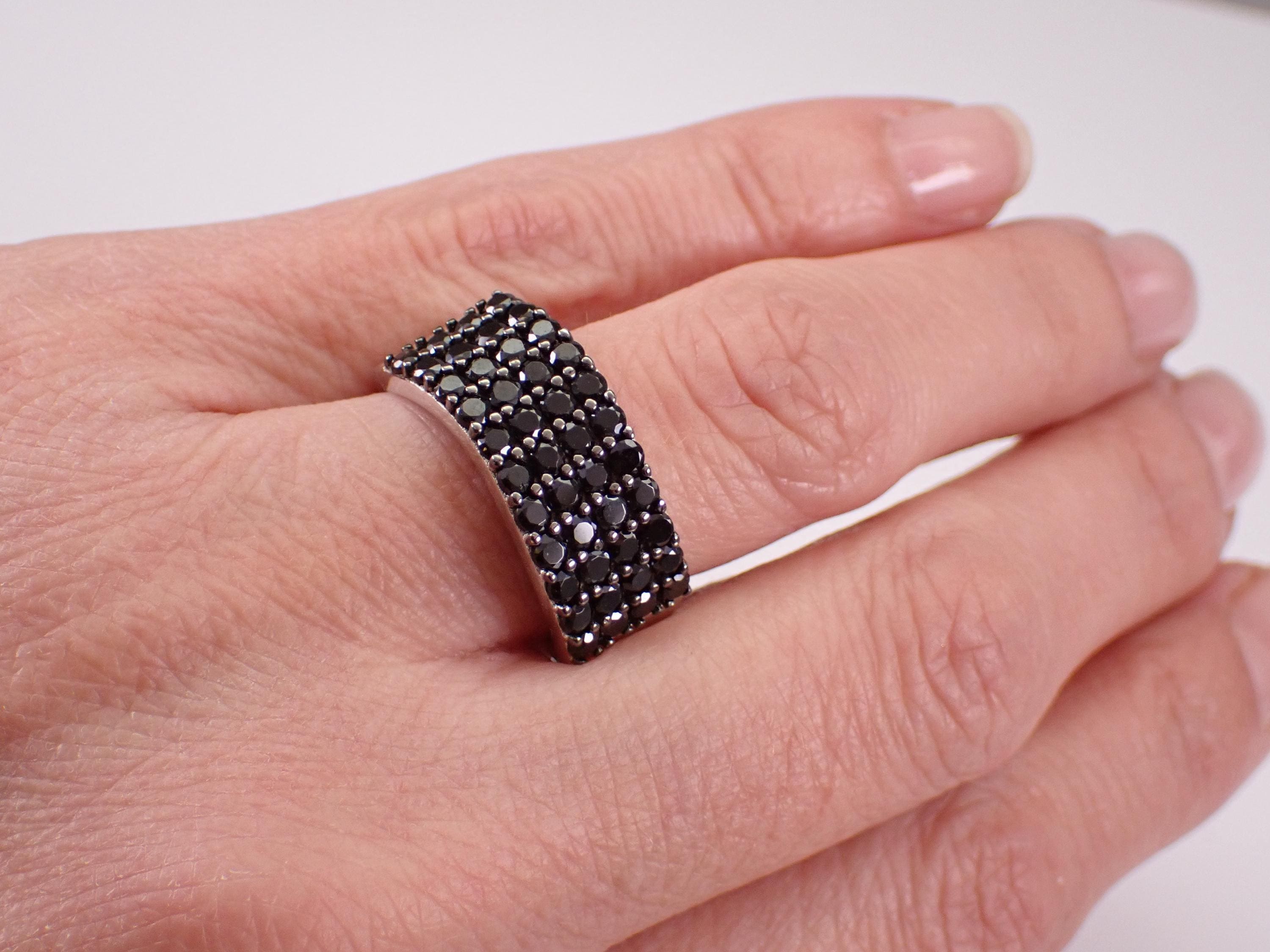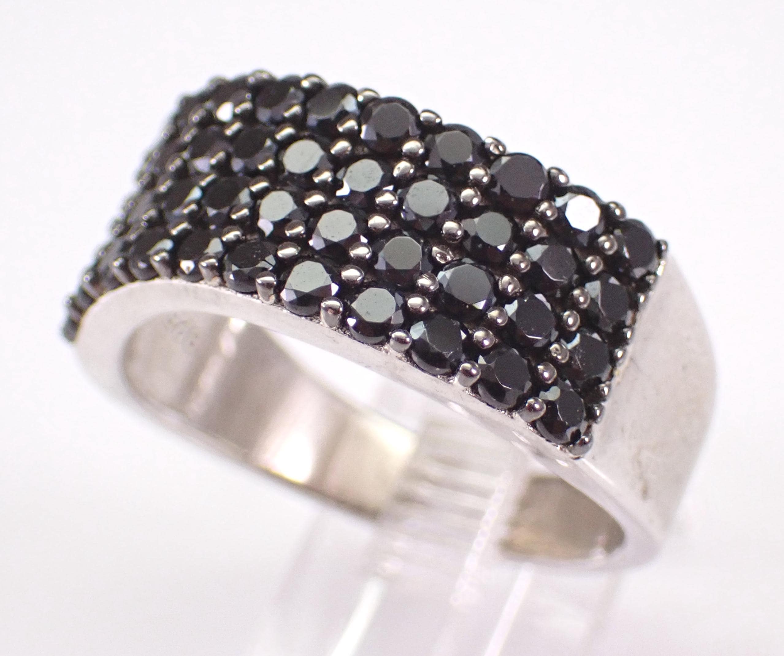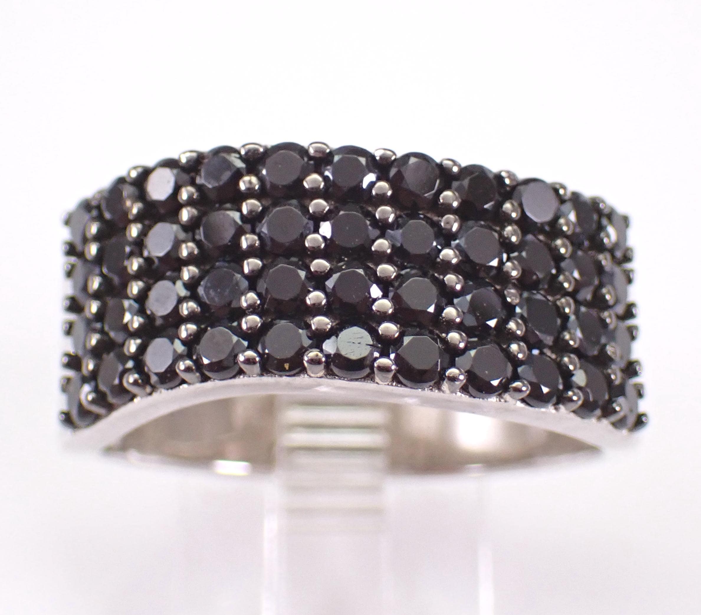 Sterling Silver Black Diamond Ring. This ring is set with forty-four genuine Round Black Diamonds. These diamonds weigh a total of 1 3/4 carat. This ring is in very good condition, stamped 925 for Sterling Silver, is finger size 10 and weighs 5.9 grams. The top of this ring measures 9 mm along the finger. This ring will be shipped promptly in a gift pouch.