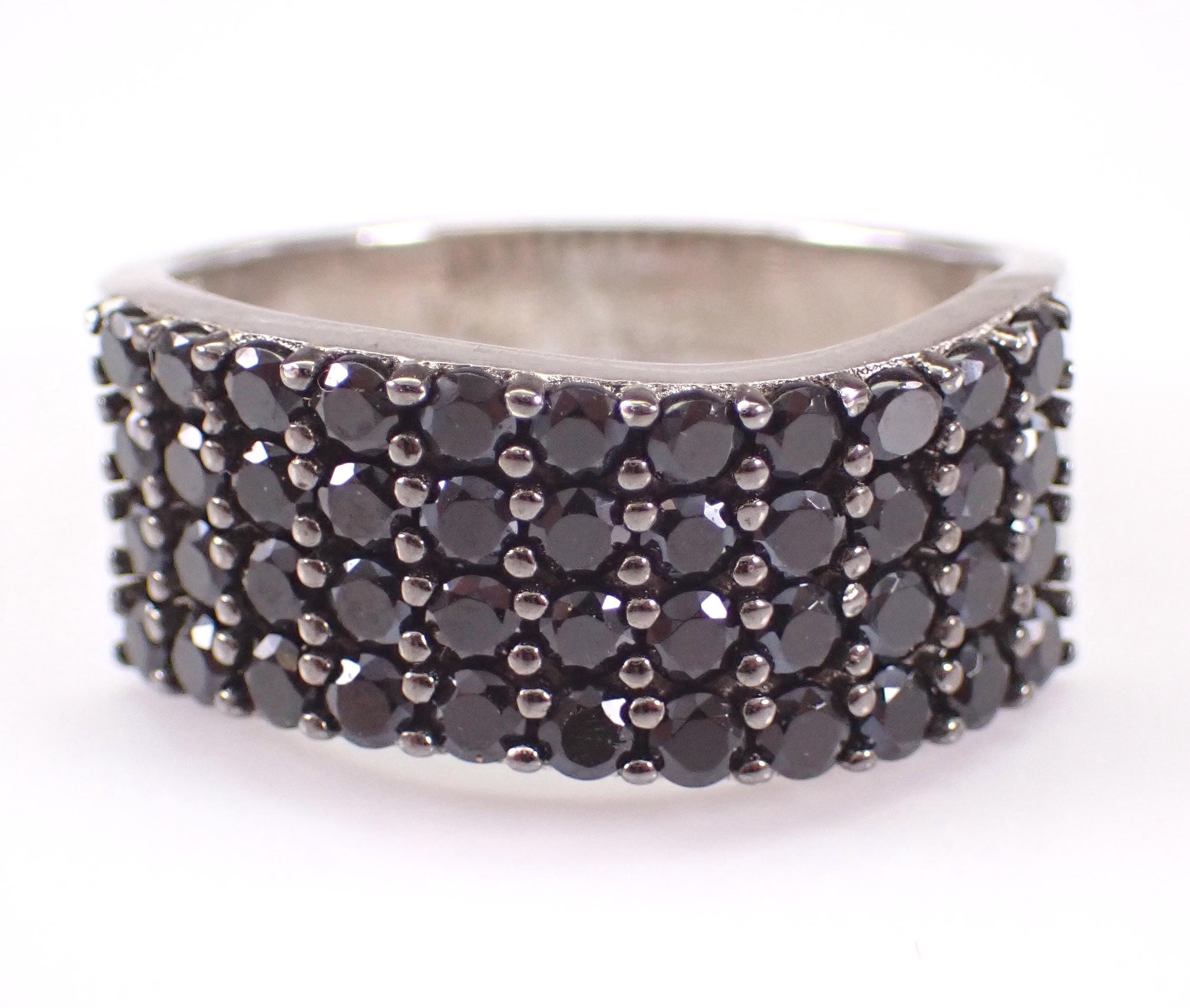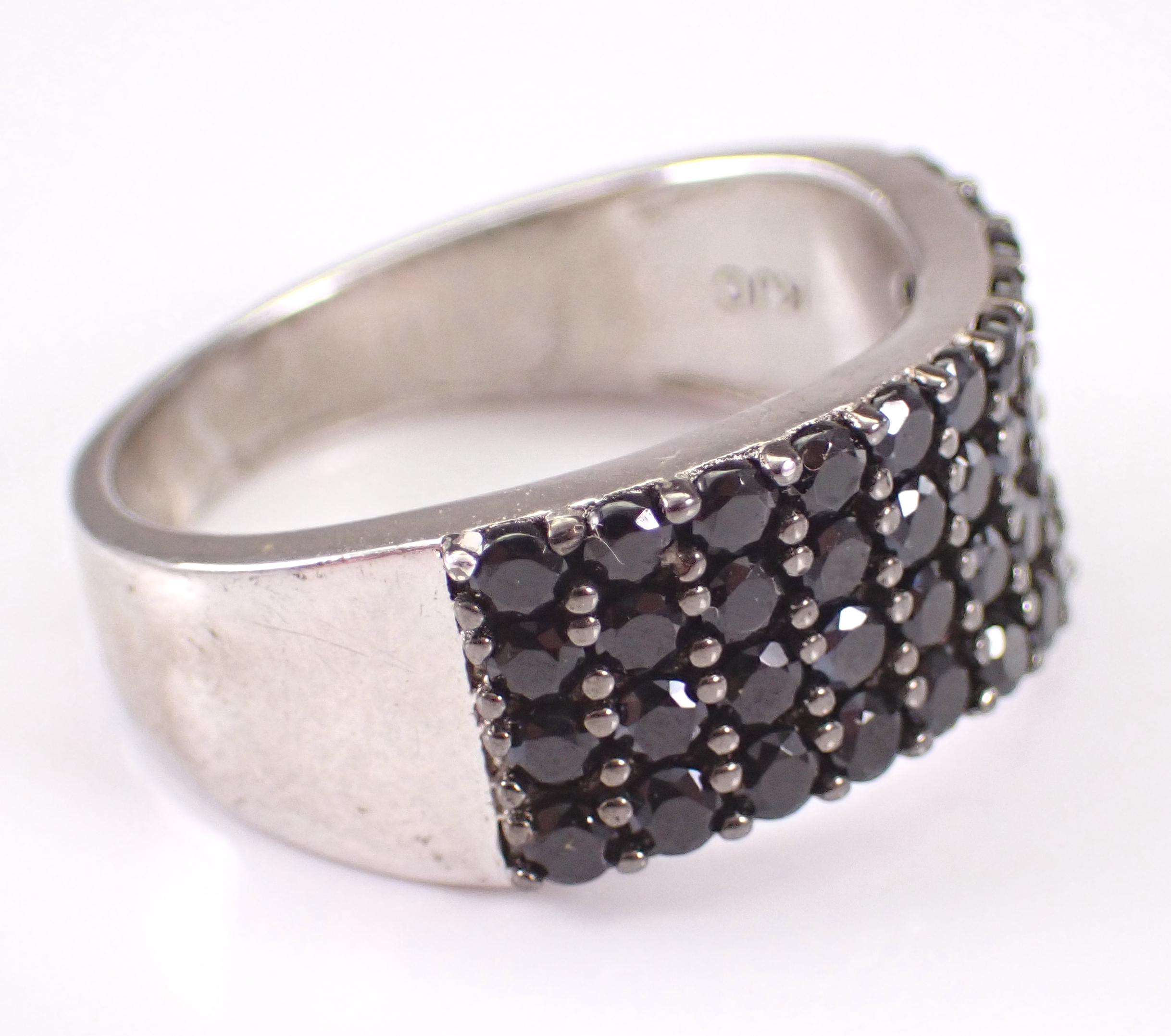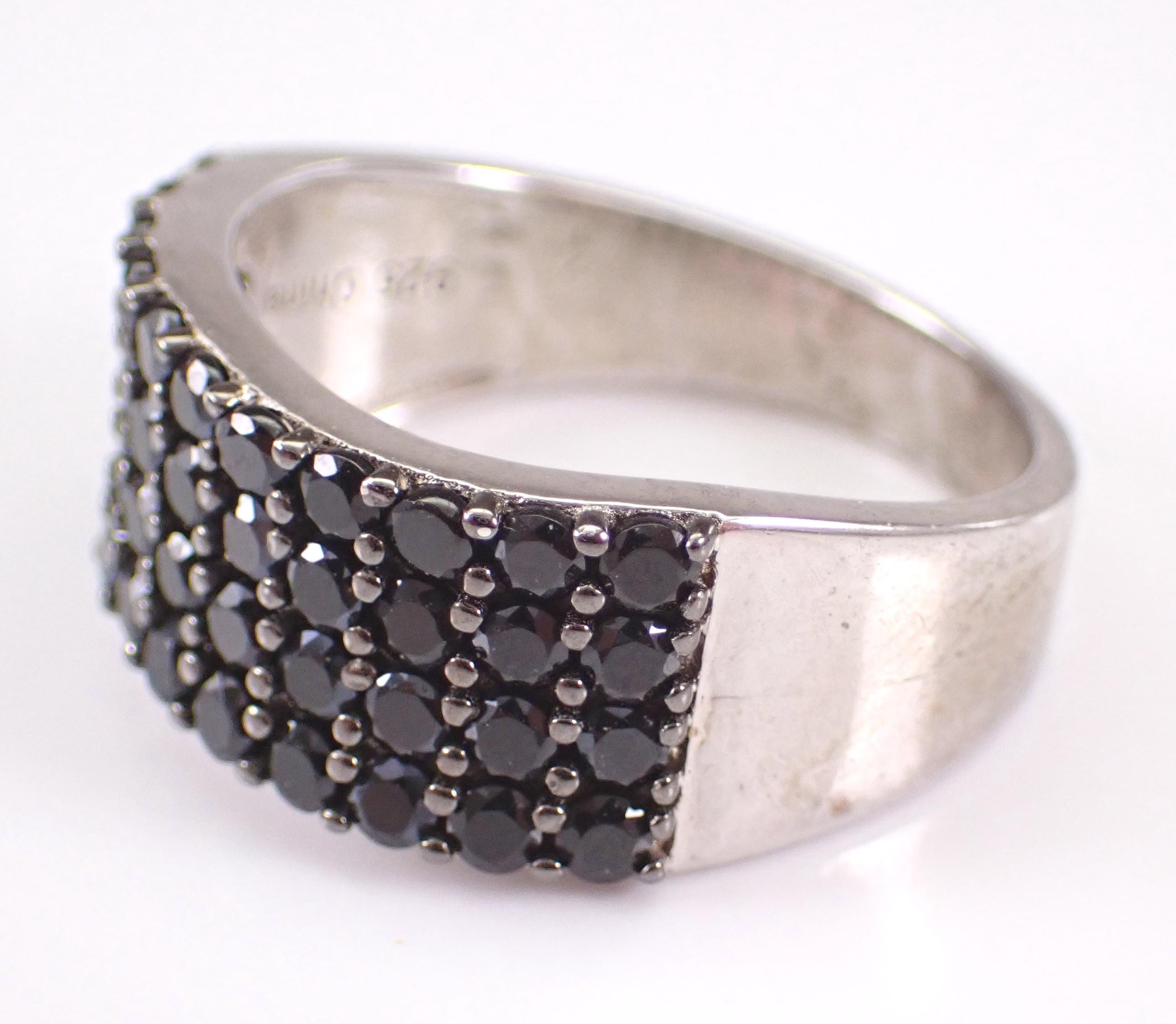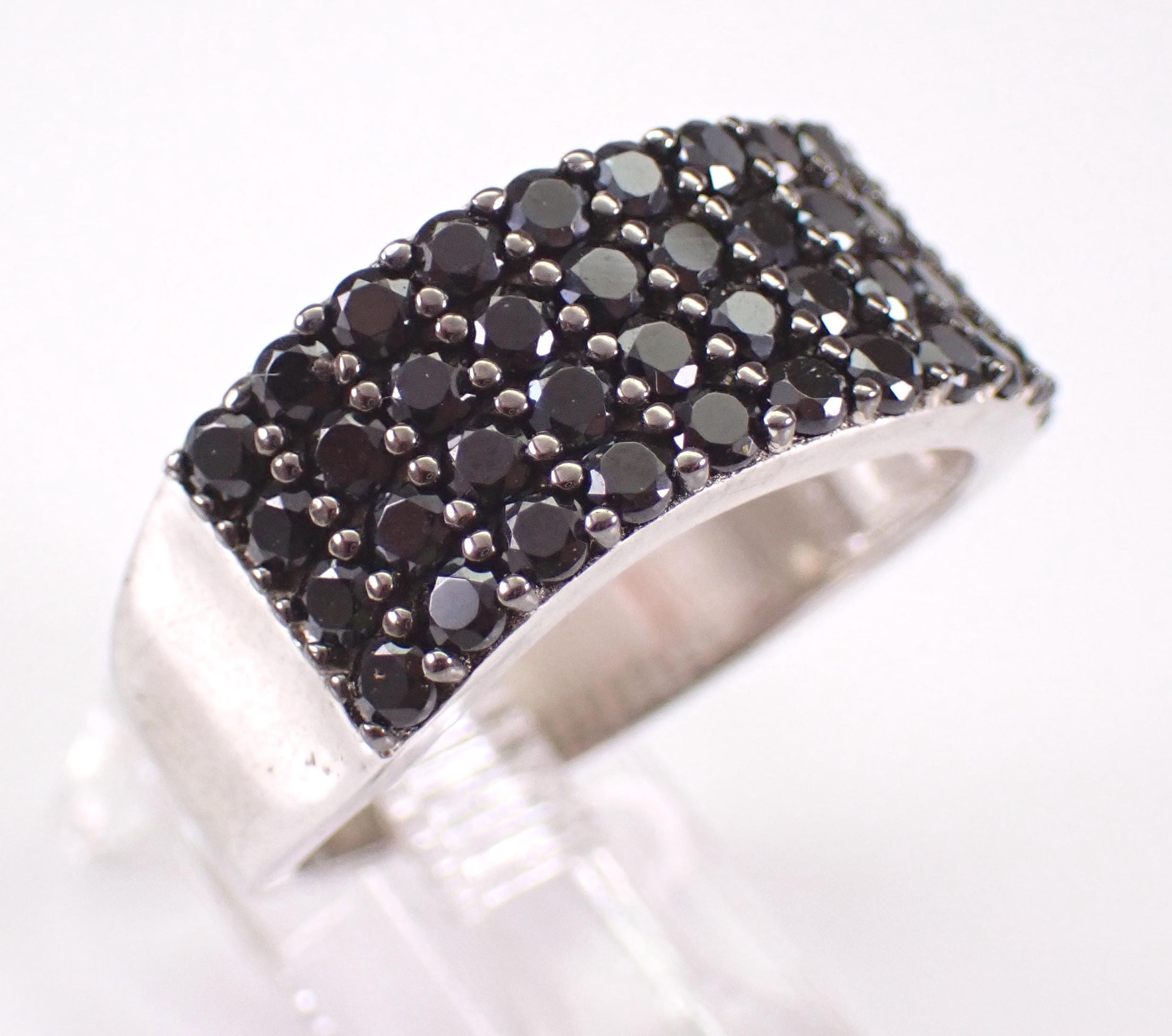 Sterling Silver Black Diamond Ring. This ring is set with forty-four genuine Round Black Diamonds. These diamonds weigh a total of 1 3/4 carat. This ring is in very good condition, stamped 925 for Sterling Silver, is finger size 10 and weighs 5.9 grams. The top of this ring measures 9 mm along the finger. This ring will be shipped promptly in a gift pouch.