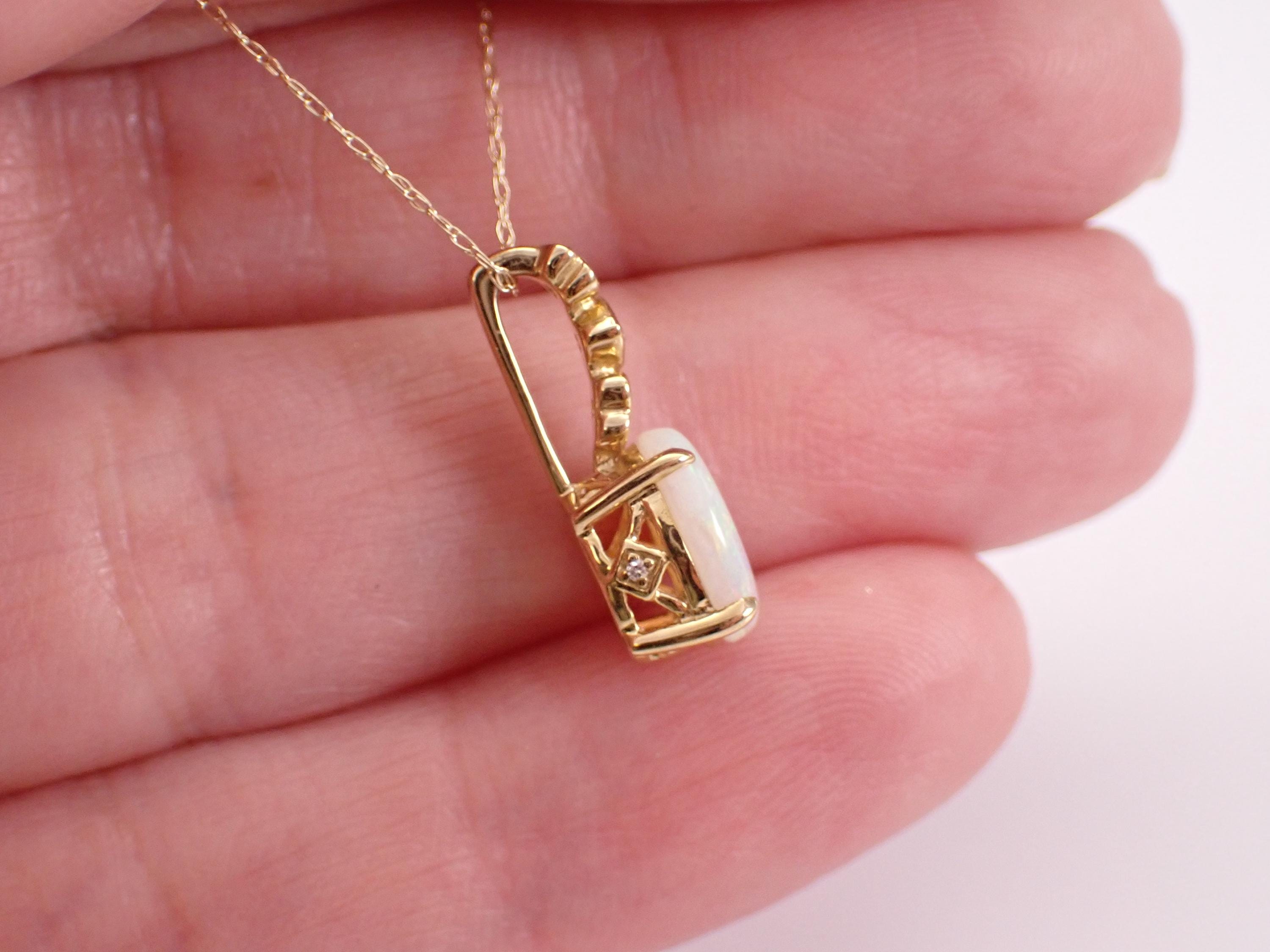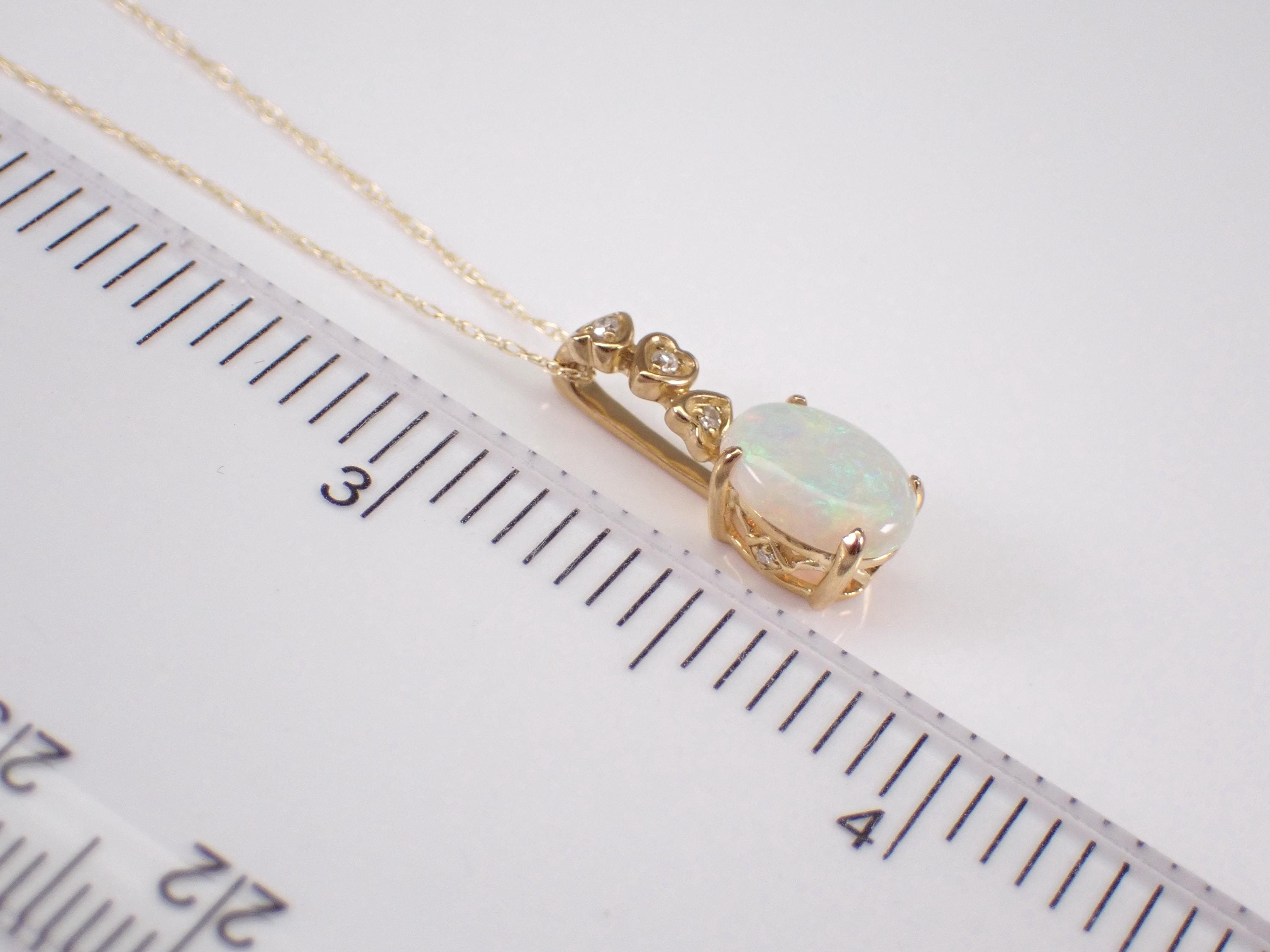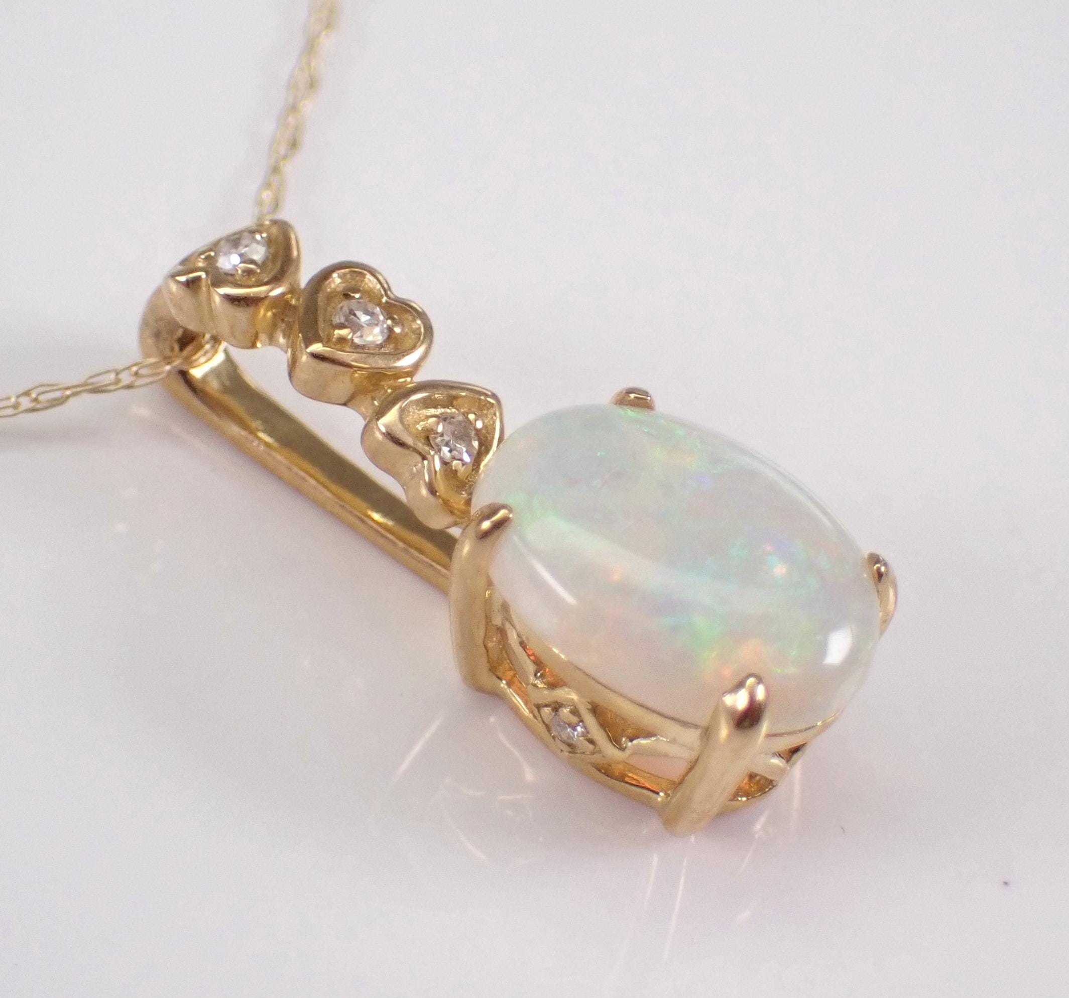Yellow Gold Diamond and Opal Pendant Necklace. The Necklace is set with one Oval Opal Cabochon in the center. This Opal measures 9 X 7 mm and weighs 1.10 carat. There are five Round Brilliant Diamonds set in this pendant. These diamonds are H color, SI/I1 clarity and weigh a total of .05 carat. The pendant is 10K Yellow Gold and comes with an 18" 10K Yellow Gold chain and together weigh 1.6 grams. The pendant measures 17.5 mm in length. This necklace will be accompanied by an appraisal with the retail replacement value of $1,085.00. I will ship this necklace promptly in a gift box.