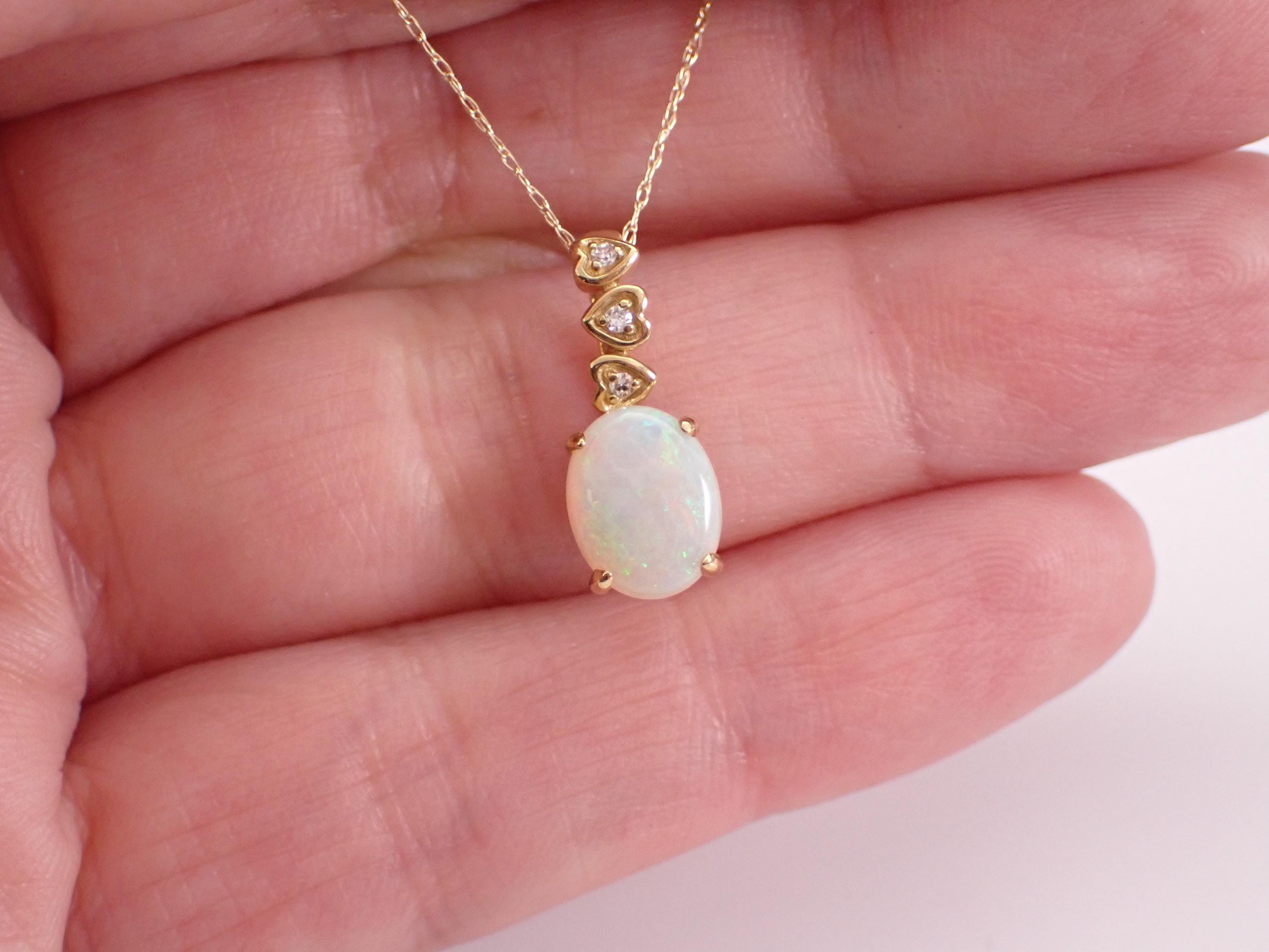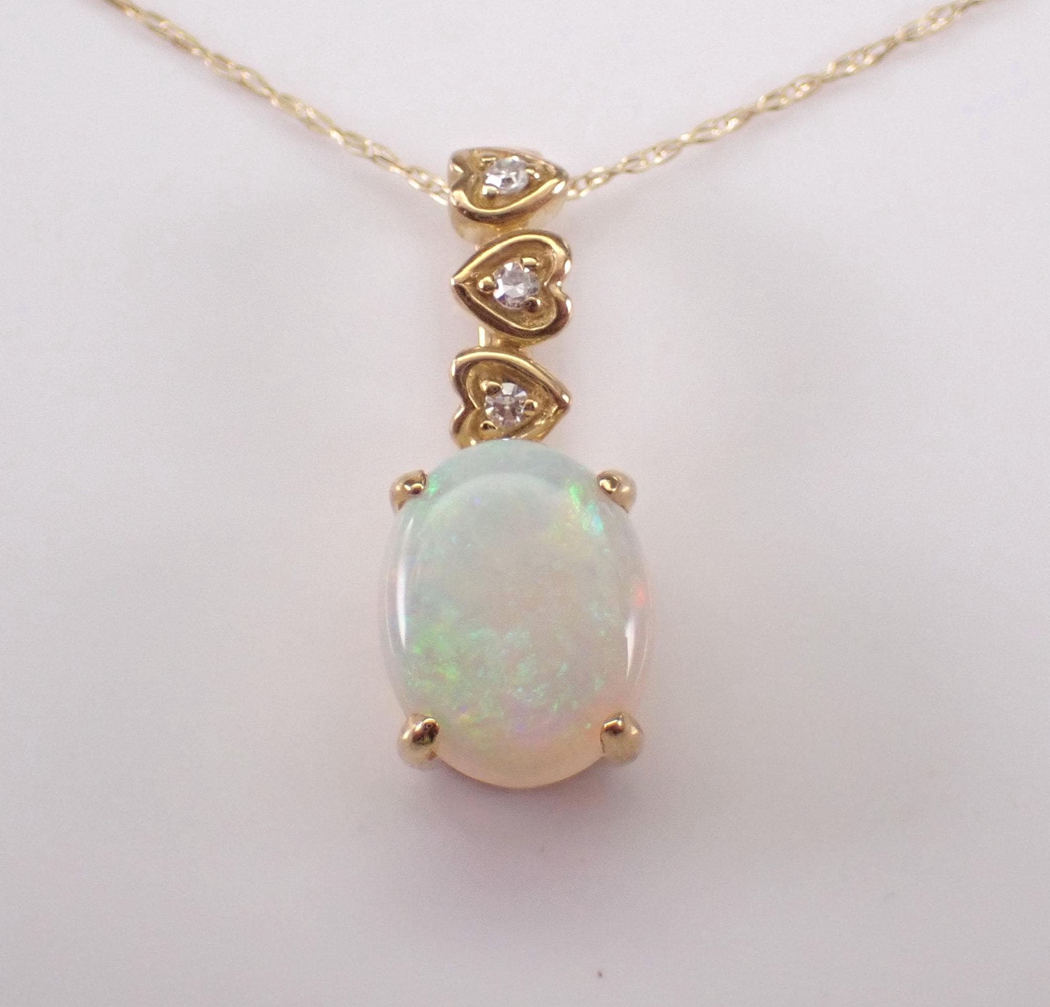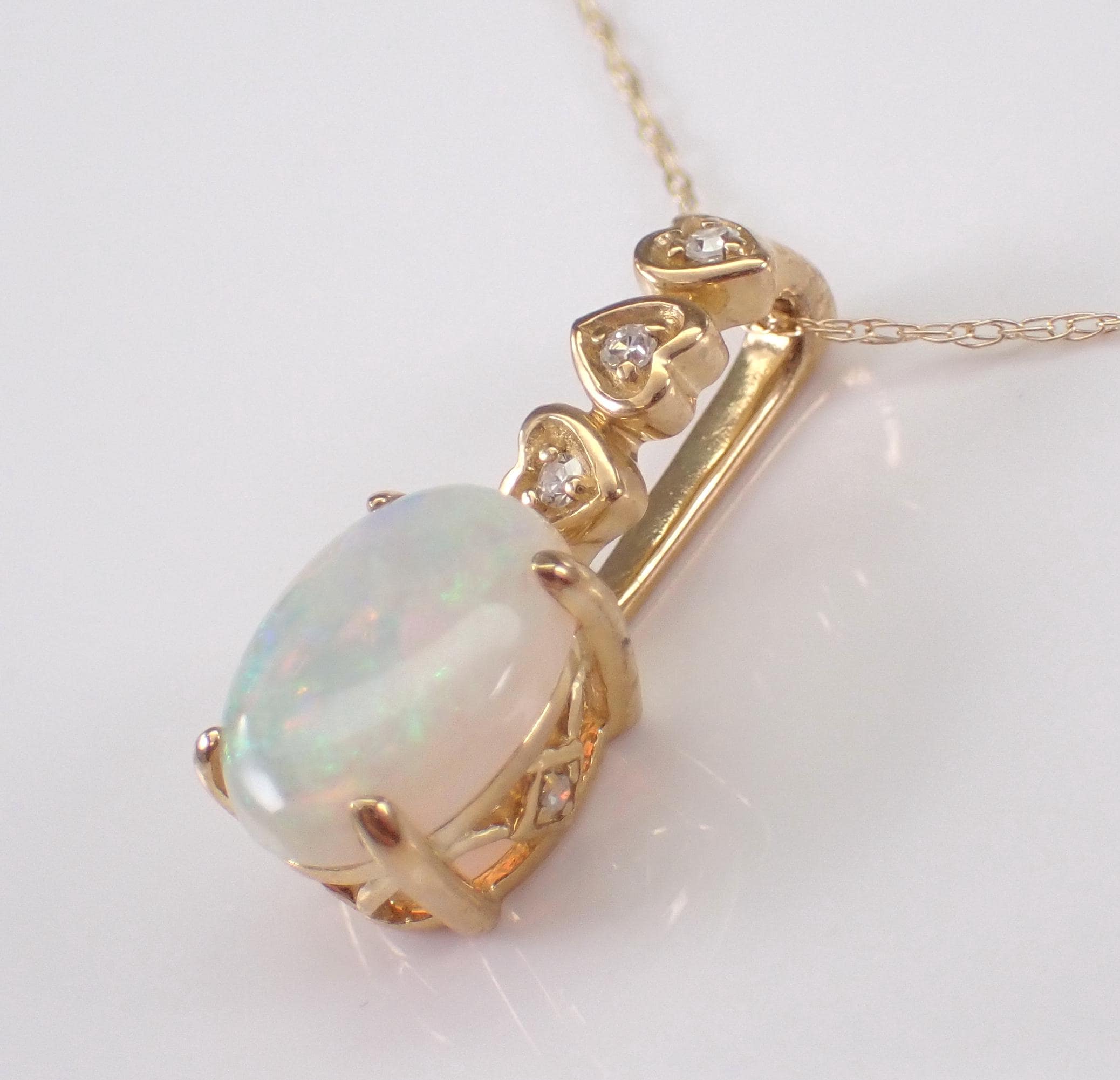 Yellow Gold Diamond and Opal Pendant Necklace. The Necklace is set with one Oval Opal Cabochon in the center. This Opal measures 9 X 7 mm and weighs 1.10 carat. There are five Round Brilliant Diamonds set in this pendant. These diamonds are H color, SI/I1 clarity and weigh a total of .05 carat. The pendant is 10K Yellow Gold and comes with an 18" 10K Yellow Gold chain and together weigh 1.6 grams. The pendant measures 17.5 mm in length. This necklace will be accompanied by an appraisal with the retail replacement value of $1,085.00. I will ship this necklace promptly in a gift box.