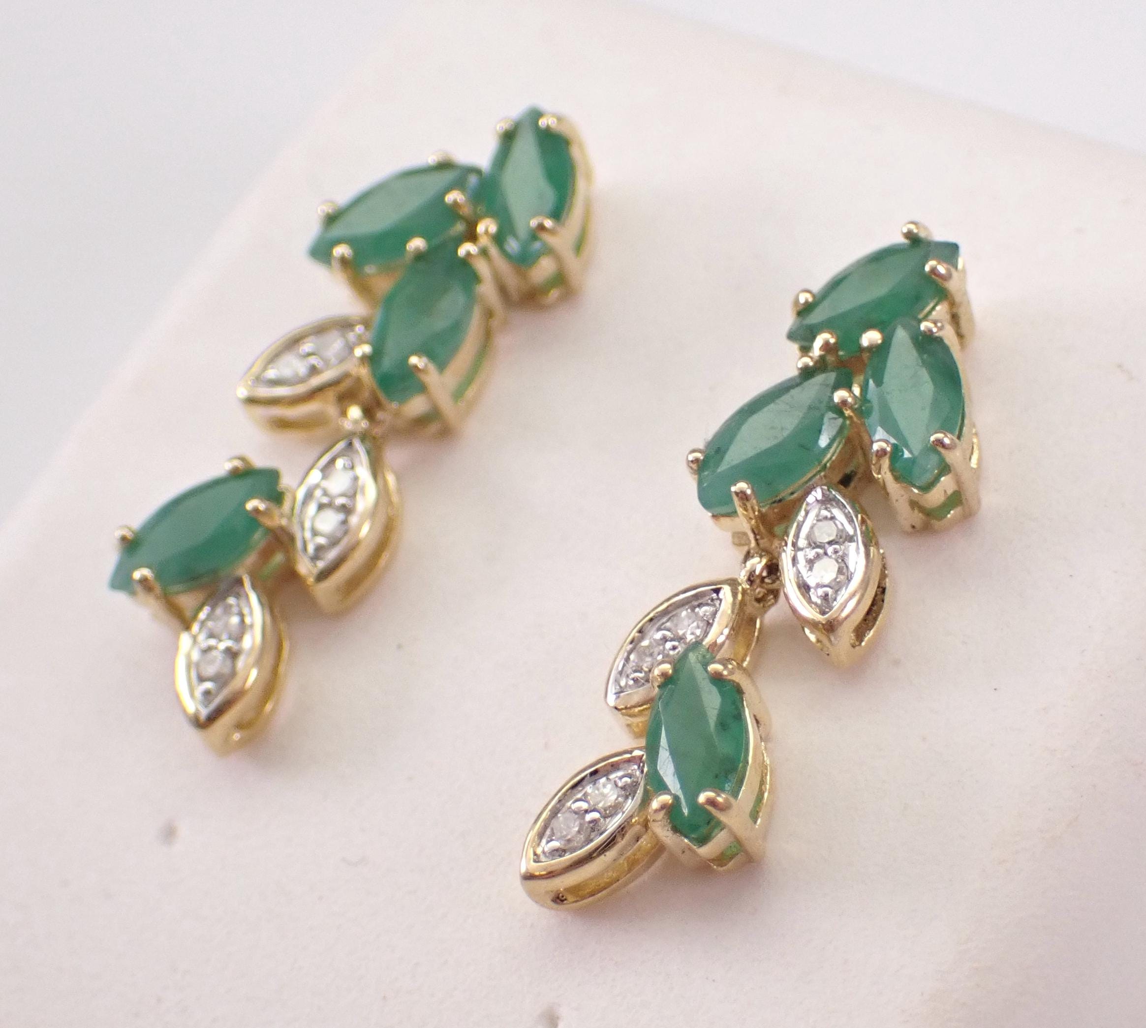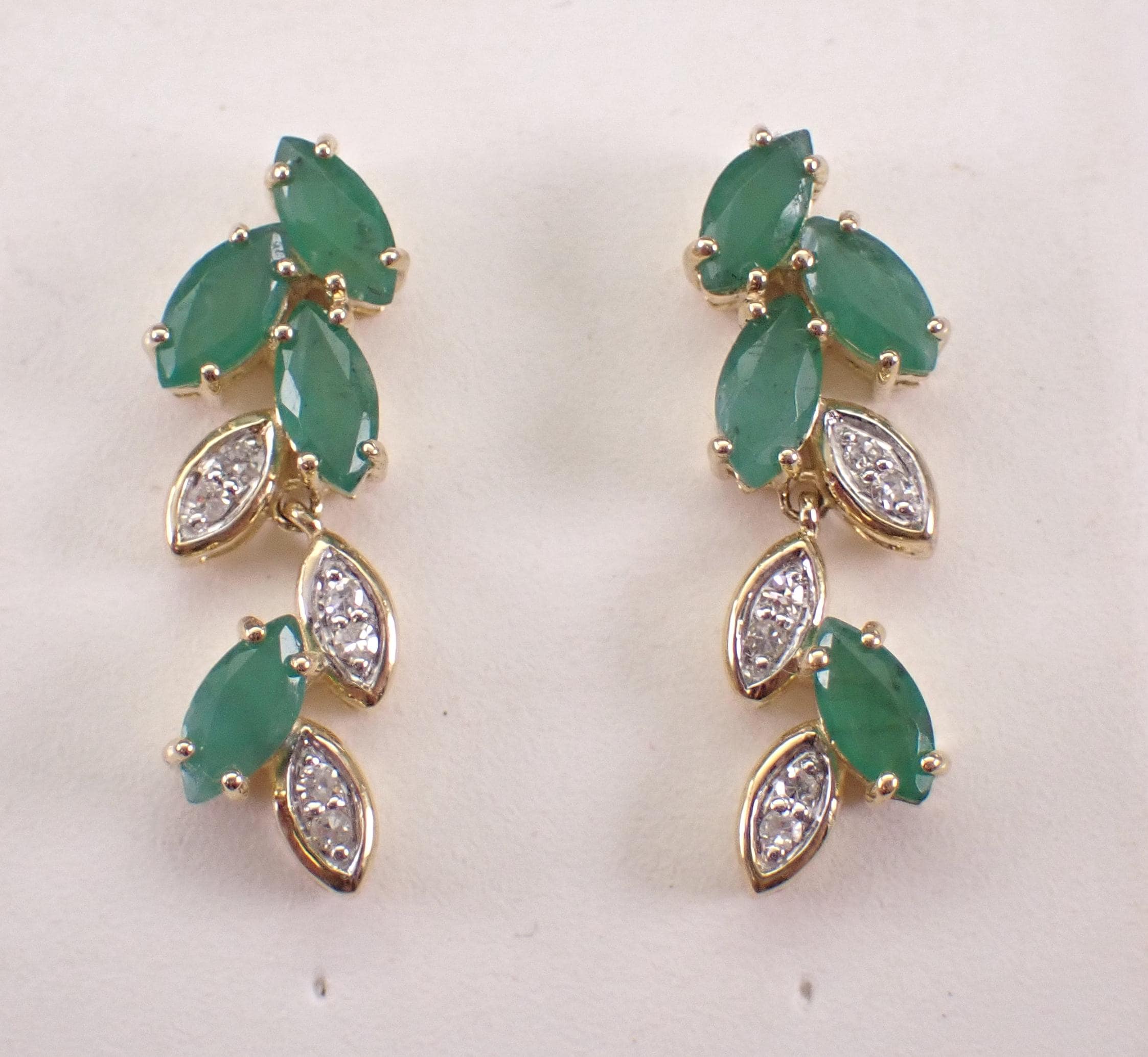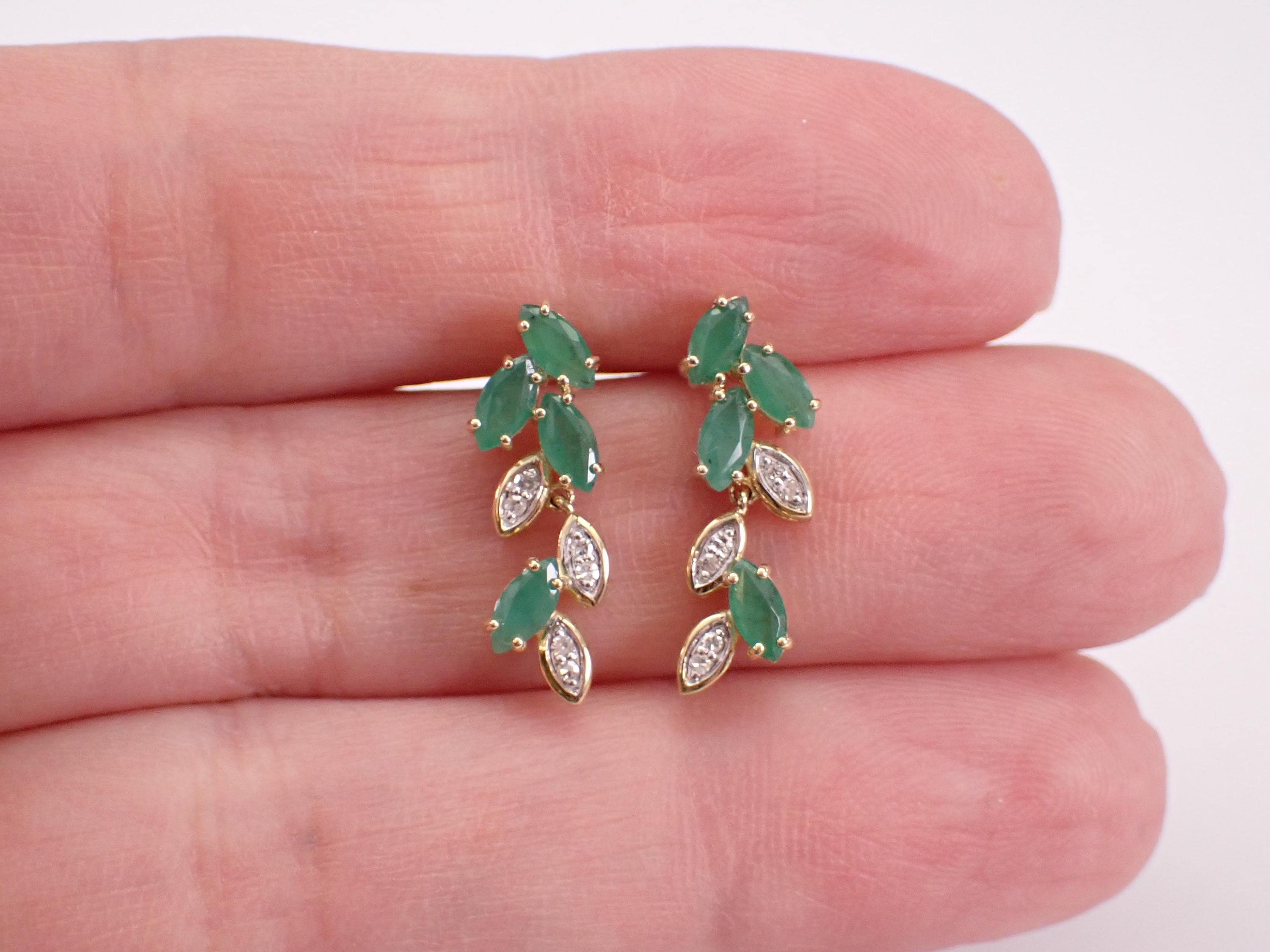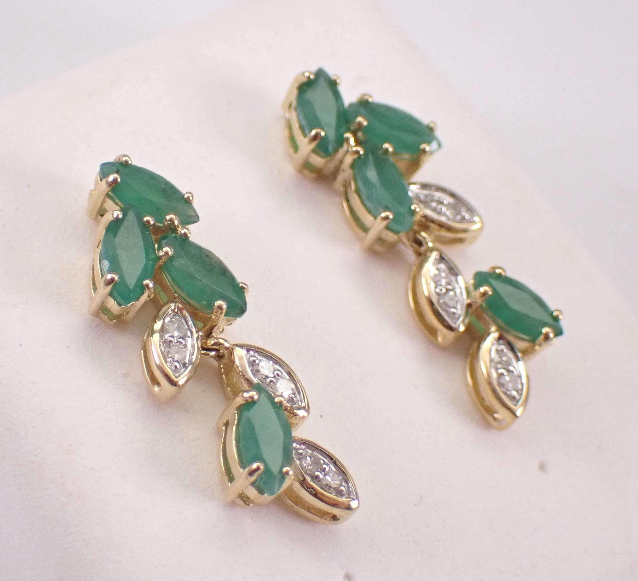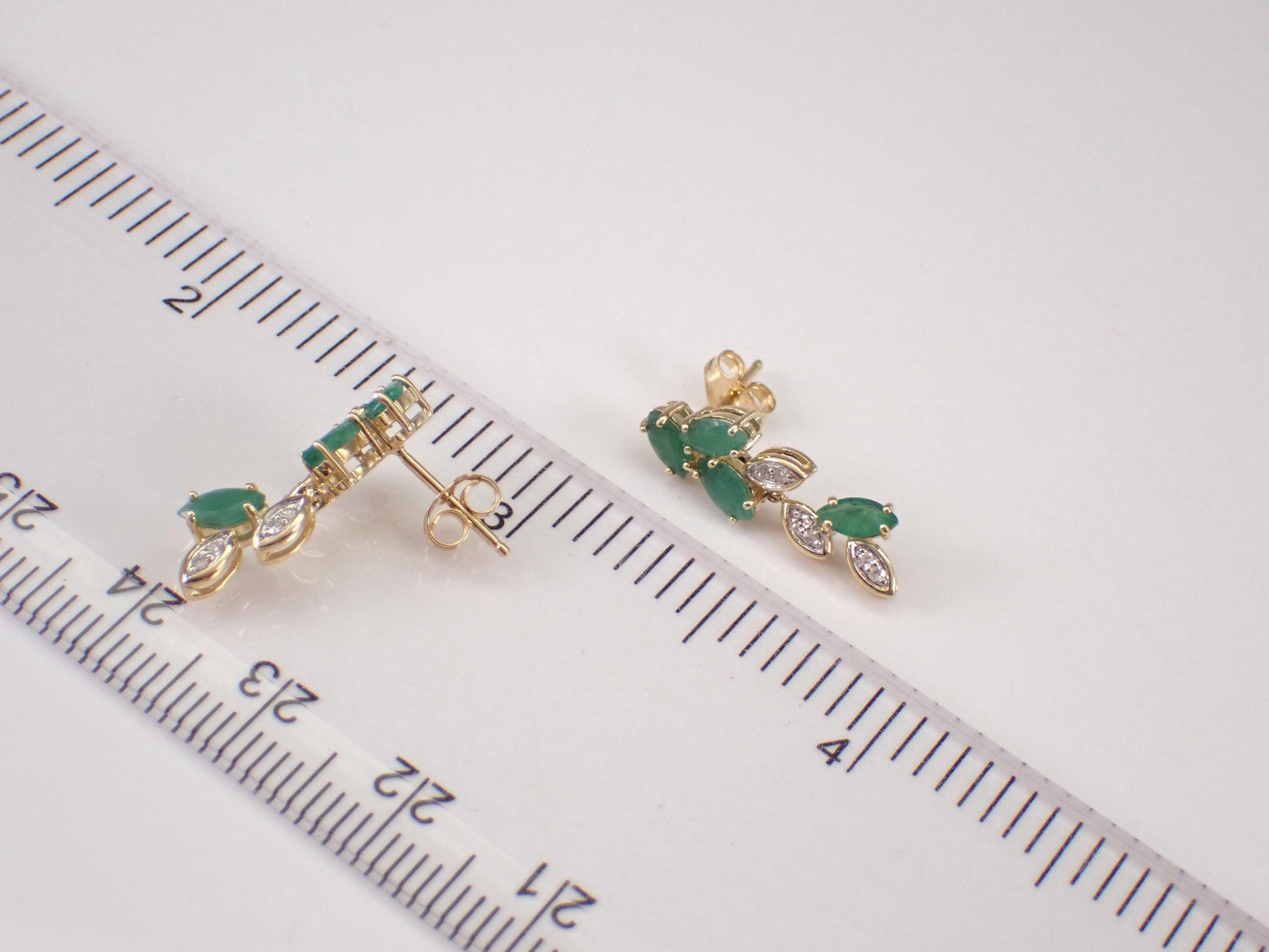 Yellow Gold Diamond and Emerald Dangle Earrings. There are six Round Brilliant Diamonds and four Marquise shaped Emeralds set in EACH earring. The Emeralds combine to a total weight of 3/4 carats. The diamonds in these earrings are H color, SI/I1 clarity and weigh a total of .10 carat. These earrings are 10KT Yellow Gold, measure 18.5 mm in length and weigh a total of 2.0 grams. These earrings are for pierced ears and have friction post backings. These earrings will be accompanied by an appraisal written by a GIA Certified Diamond Grader with the retail replacement value of $1,475.00. I will ship these earrings promptly in a gift box.