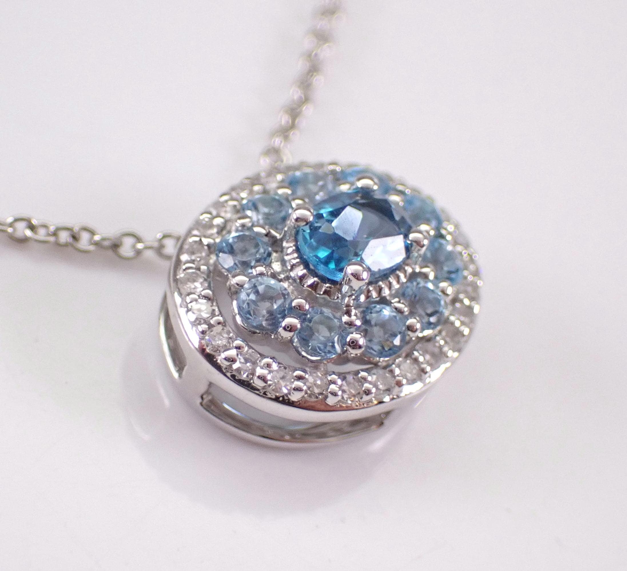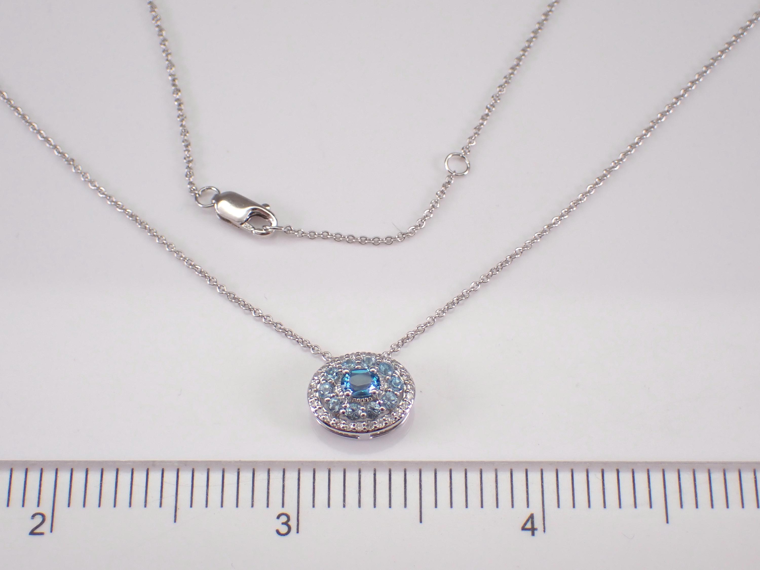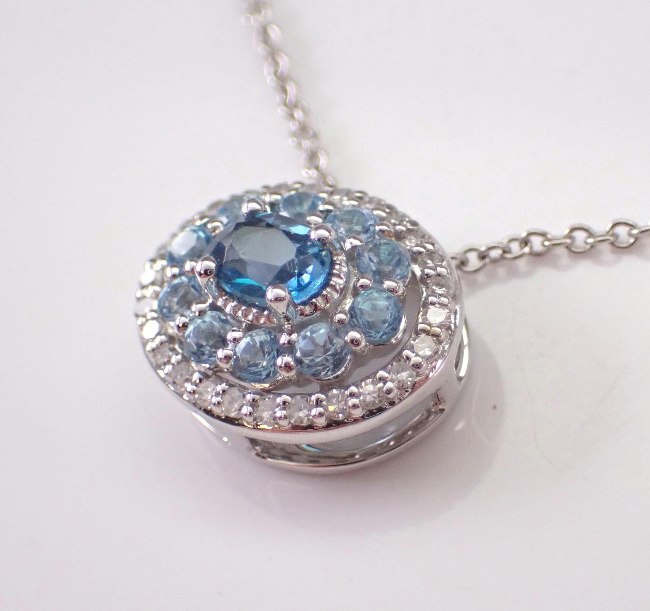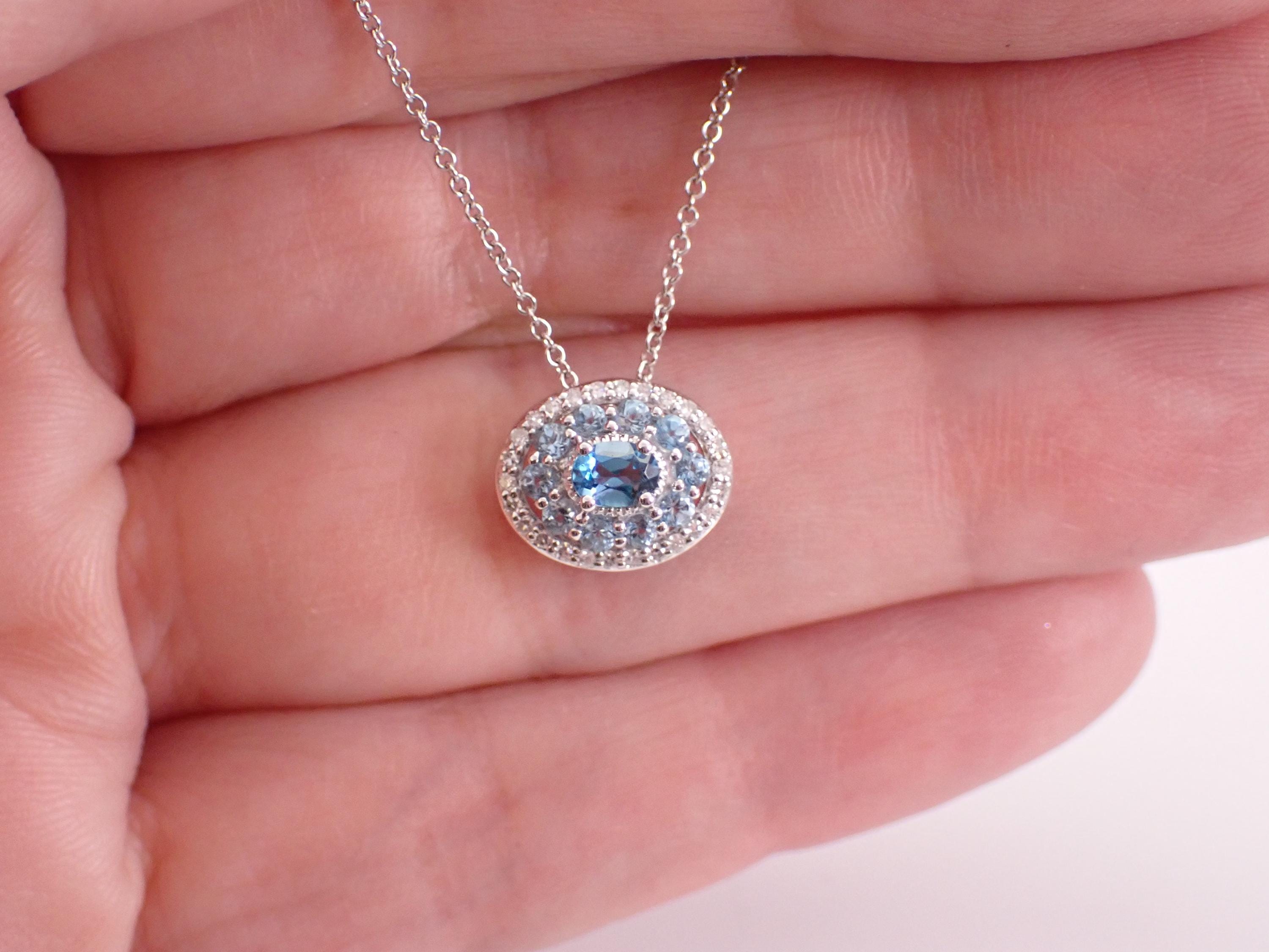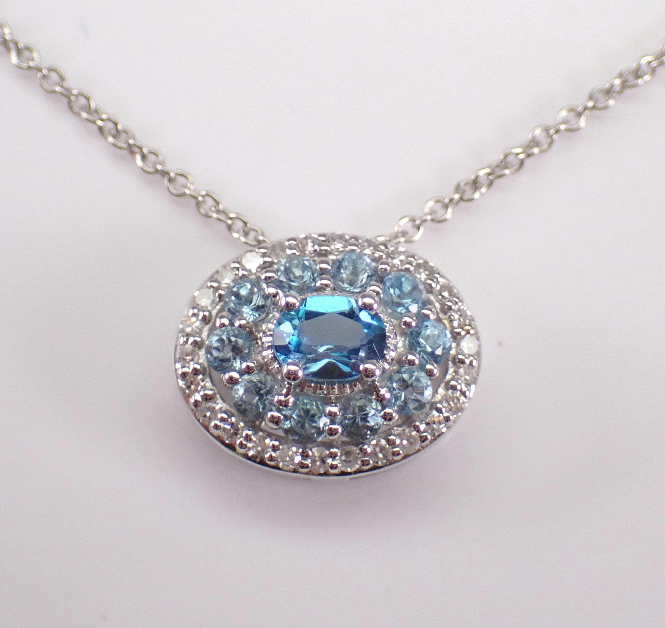 White Gold Diamond and Blue Topaz Pendant Necklace Chain. This pendant is set with one Oval Blue Topaz in the center, ten Round Blue Topaz and twenty-six natural round diamonds. These diamonds are H color, SI clarity and weigh a total of .10 carat. The Blue Topaz in the center measures 4 X 3 mm and all the blue topaz combine to a total weight of 1/2 carat. This pendant is 10KT White Gold and comes with an 18" 10KT White Gold chain. Both the pendant and chain weigh a total of 2.4 grams and the pendant measures 11 X 9 mm. This necklace will be accompanied by an appraisal written by a GIA Certified Diamond Grader with the retail replacement value of $1,395.00. I will ship this necklace promptly in a beautiful gift box.