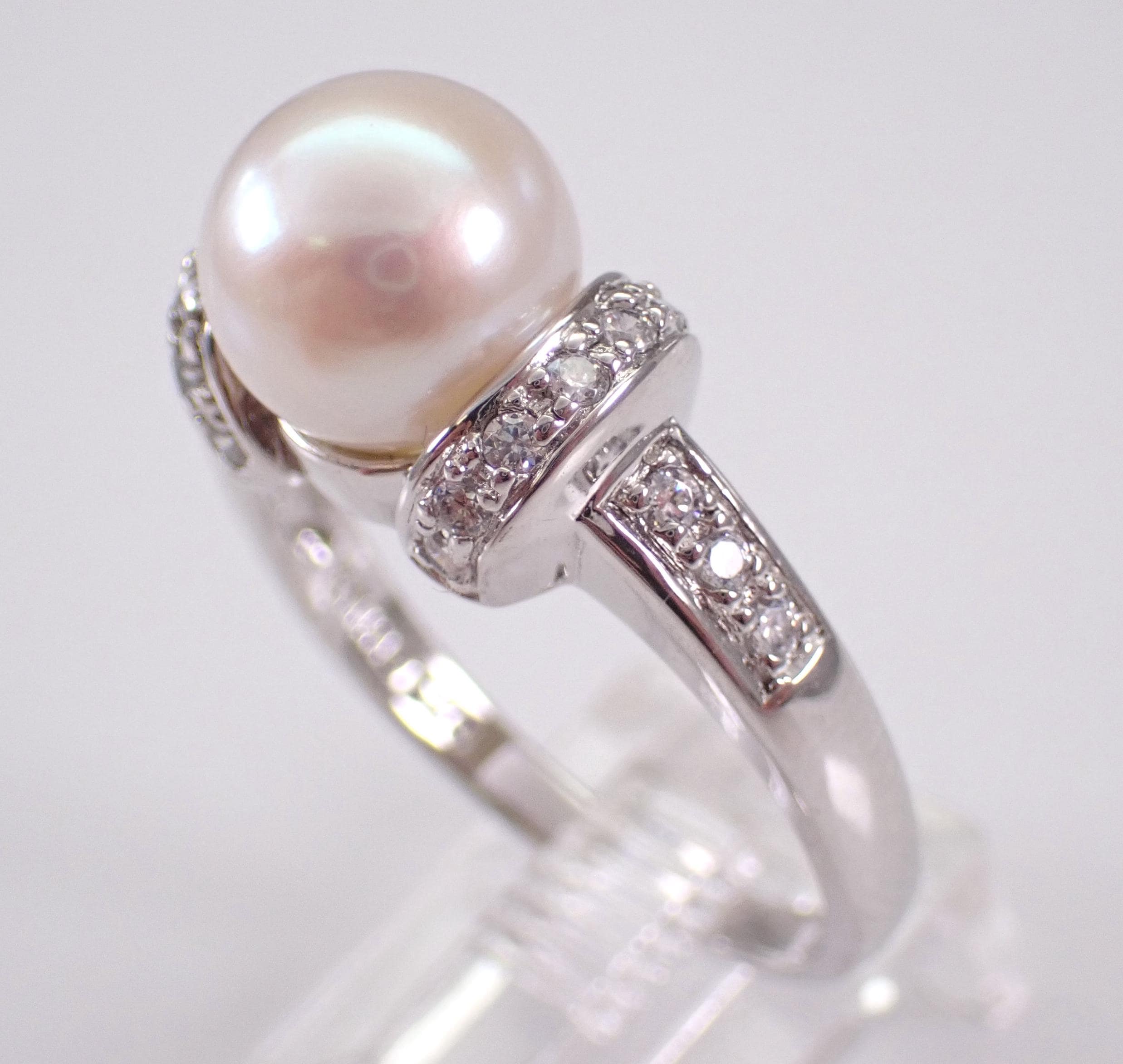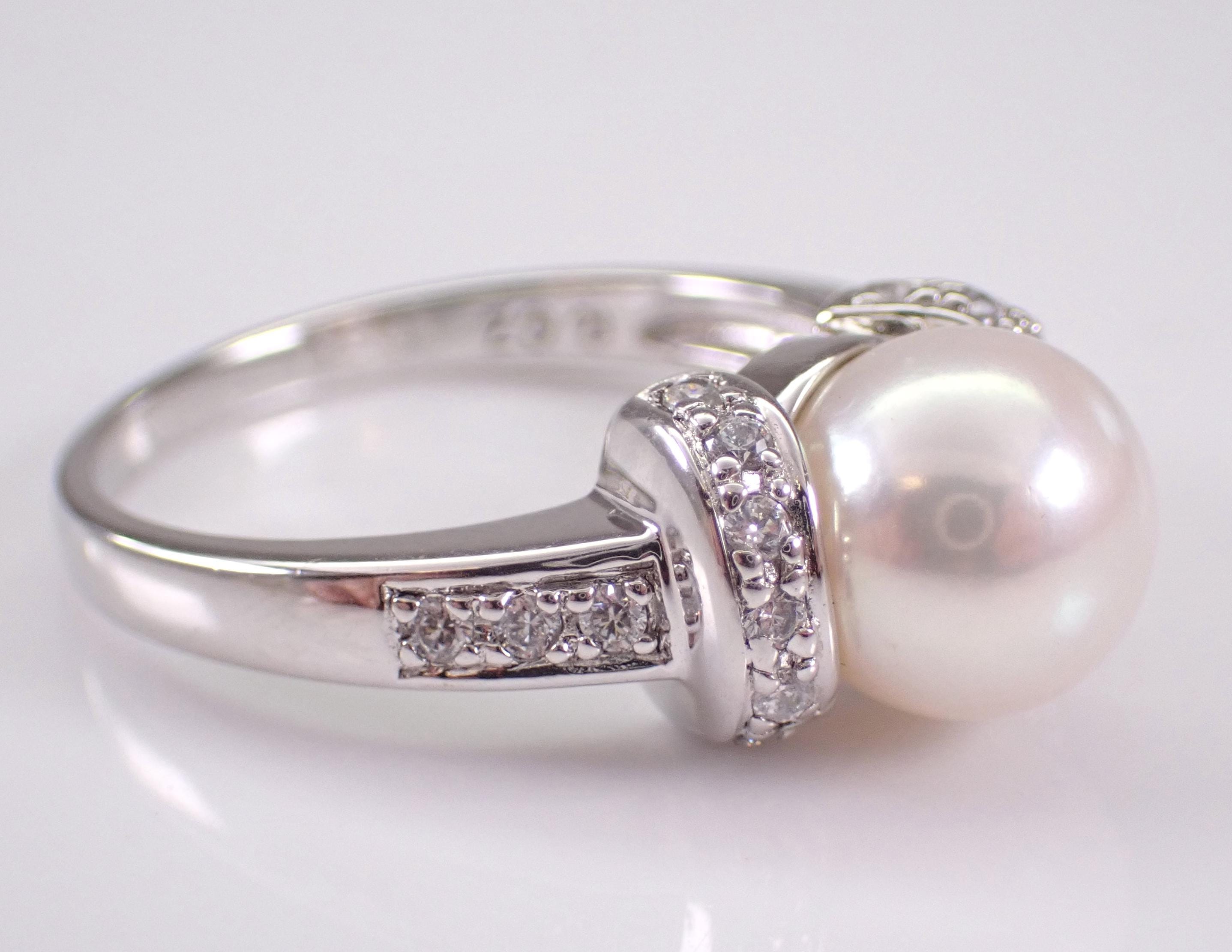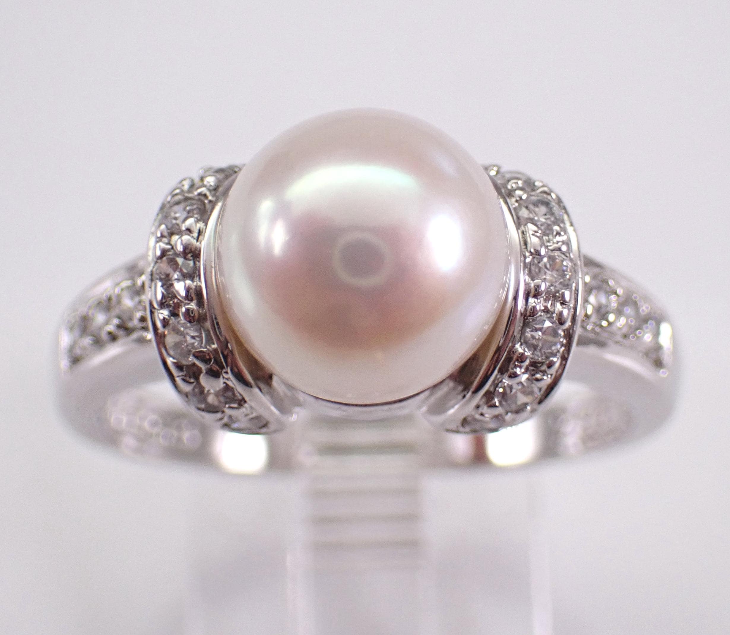 Sterling Silver Pearl and CZ Engagement Ring. There is one Round Pearl set in the center of this ring. This Pearl measures 9 mm in diameter. There are also twenty Round Cubic Zirconia set throughout this ring. This ring is Sterling Silver, weighs 4.8 grams and is a finger size 9 1/4. I will ship this ring promptly in a gift pouch.