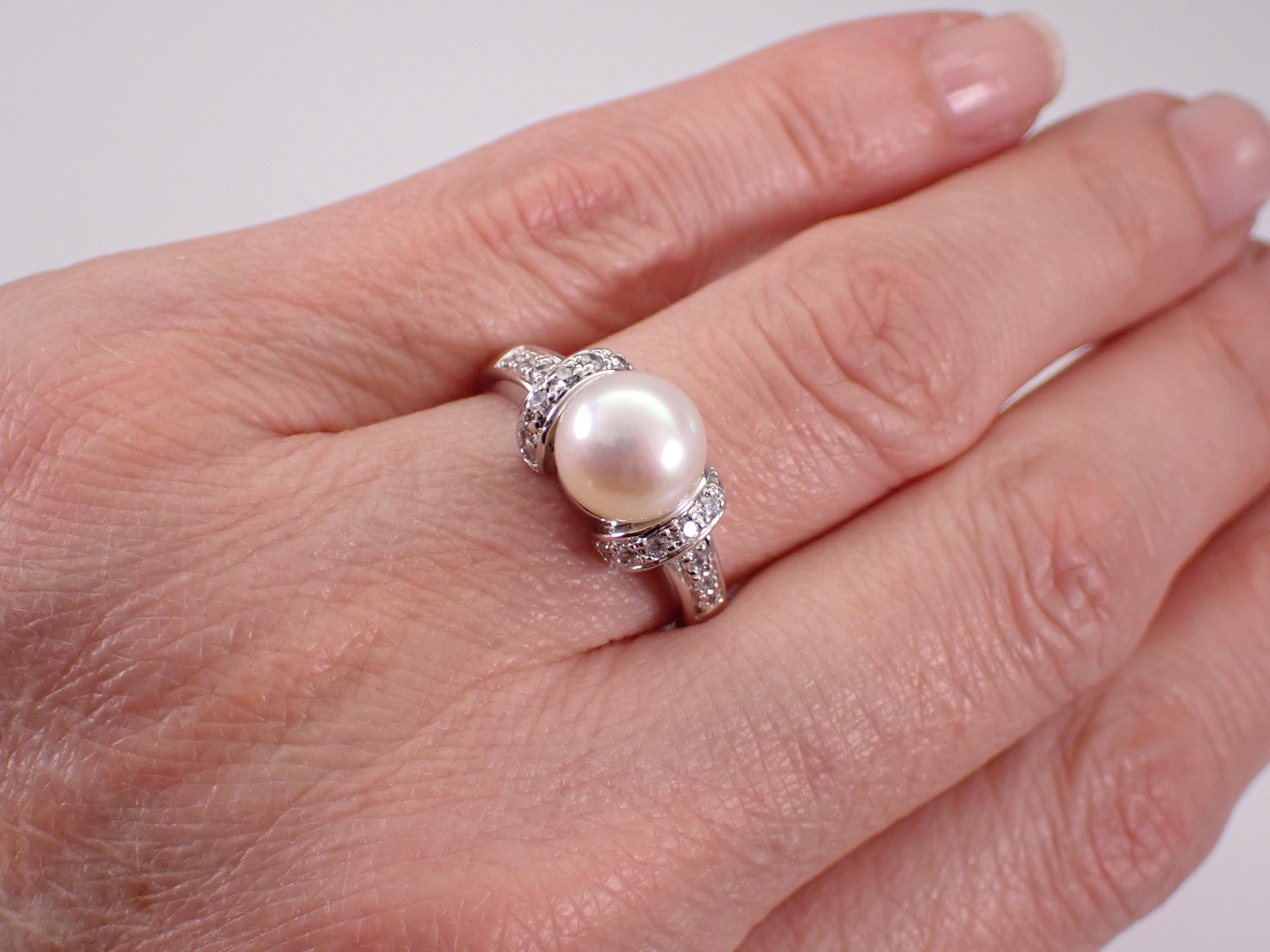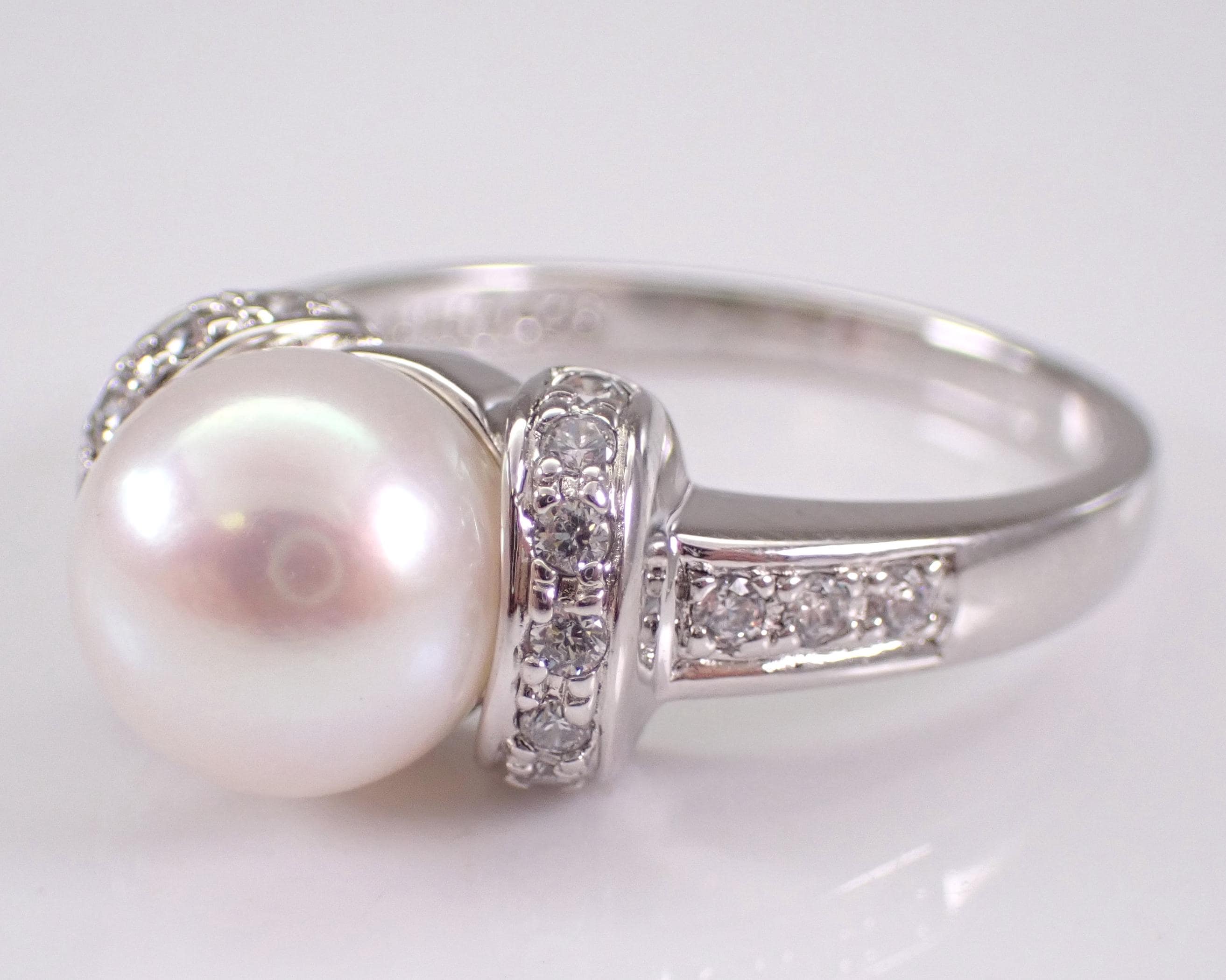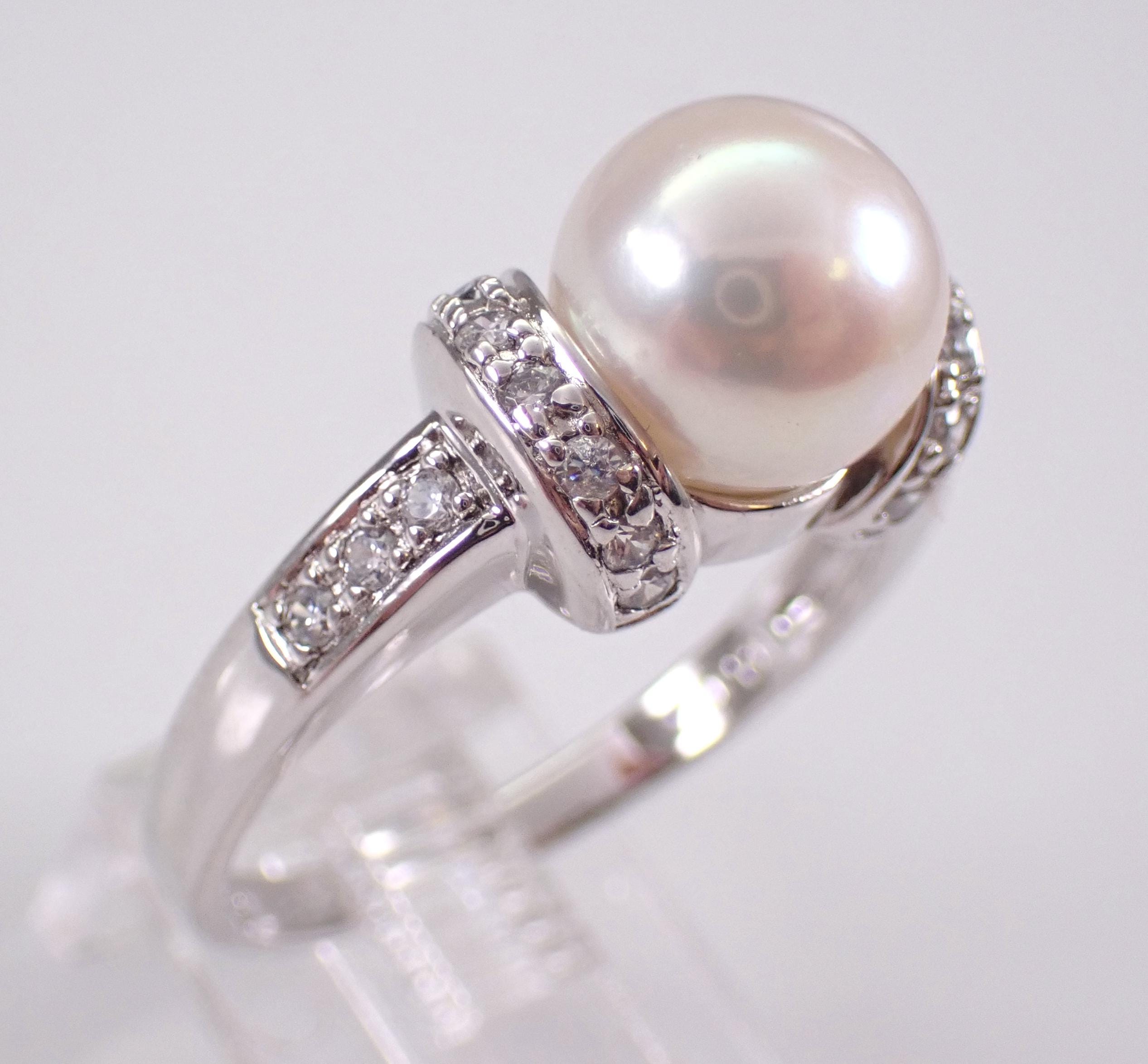 Sterling Silver Pearl and CZ Engagement Ring. There is one Round Pearl set in the center of this ring. This Pearl measures 9 mm in diameter. There are also twenty Round Cubic Zirconia set throughout this ring. This ring is Sterling Silver, weighs 4.8 grams and is a finger size 9 1/4. I will ship this ring promptly in a gift pouch.