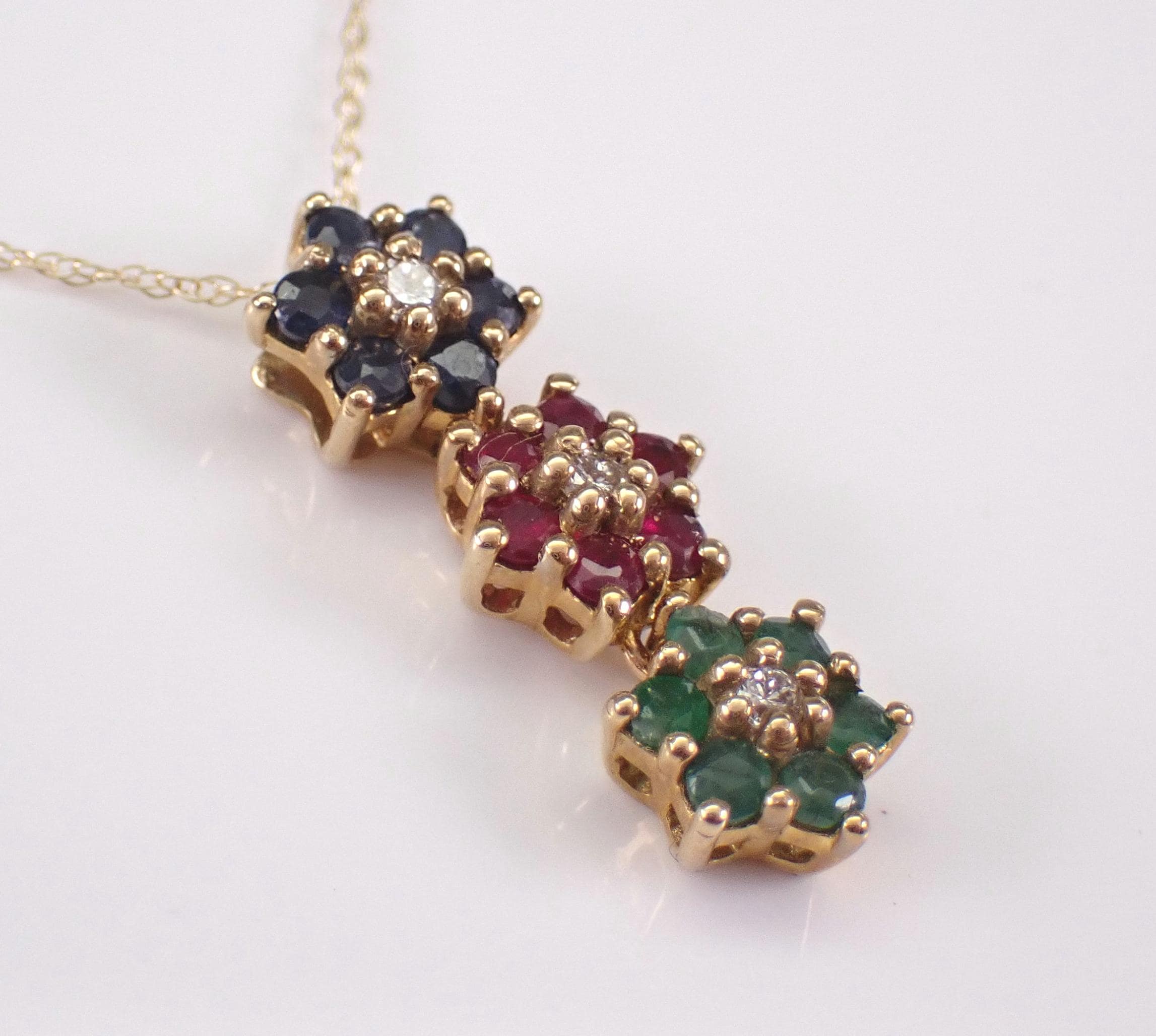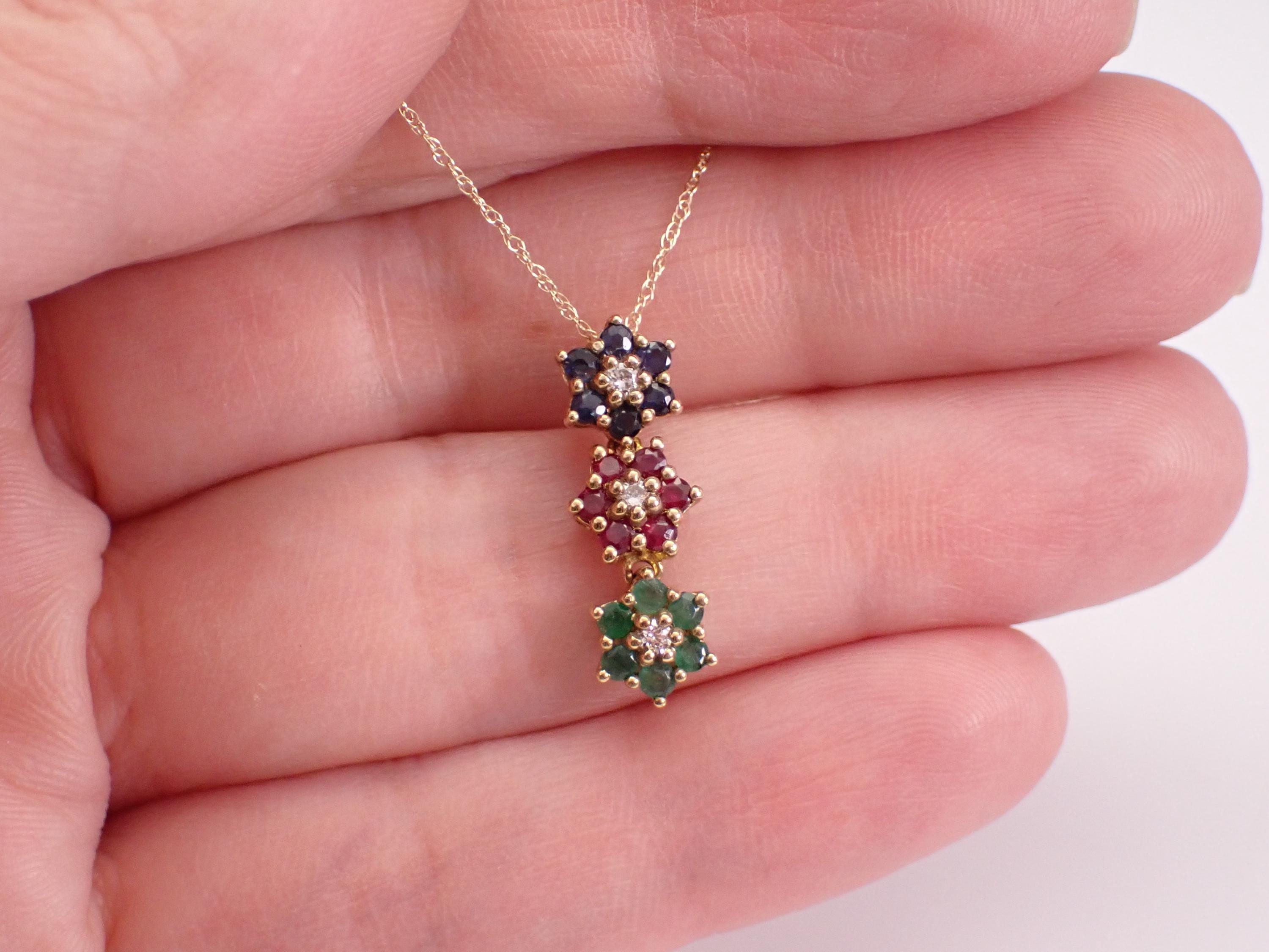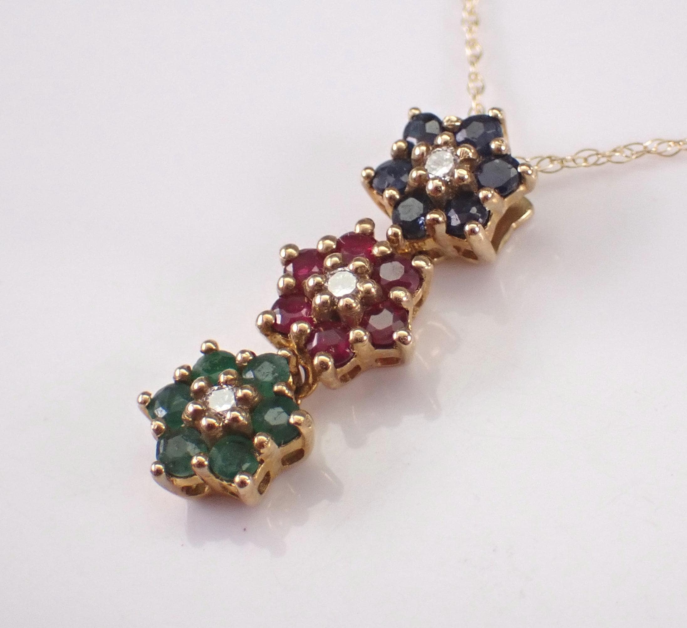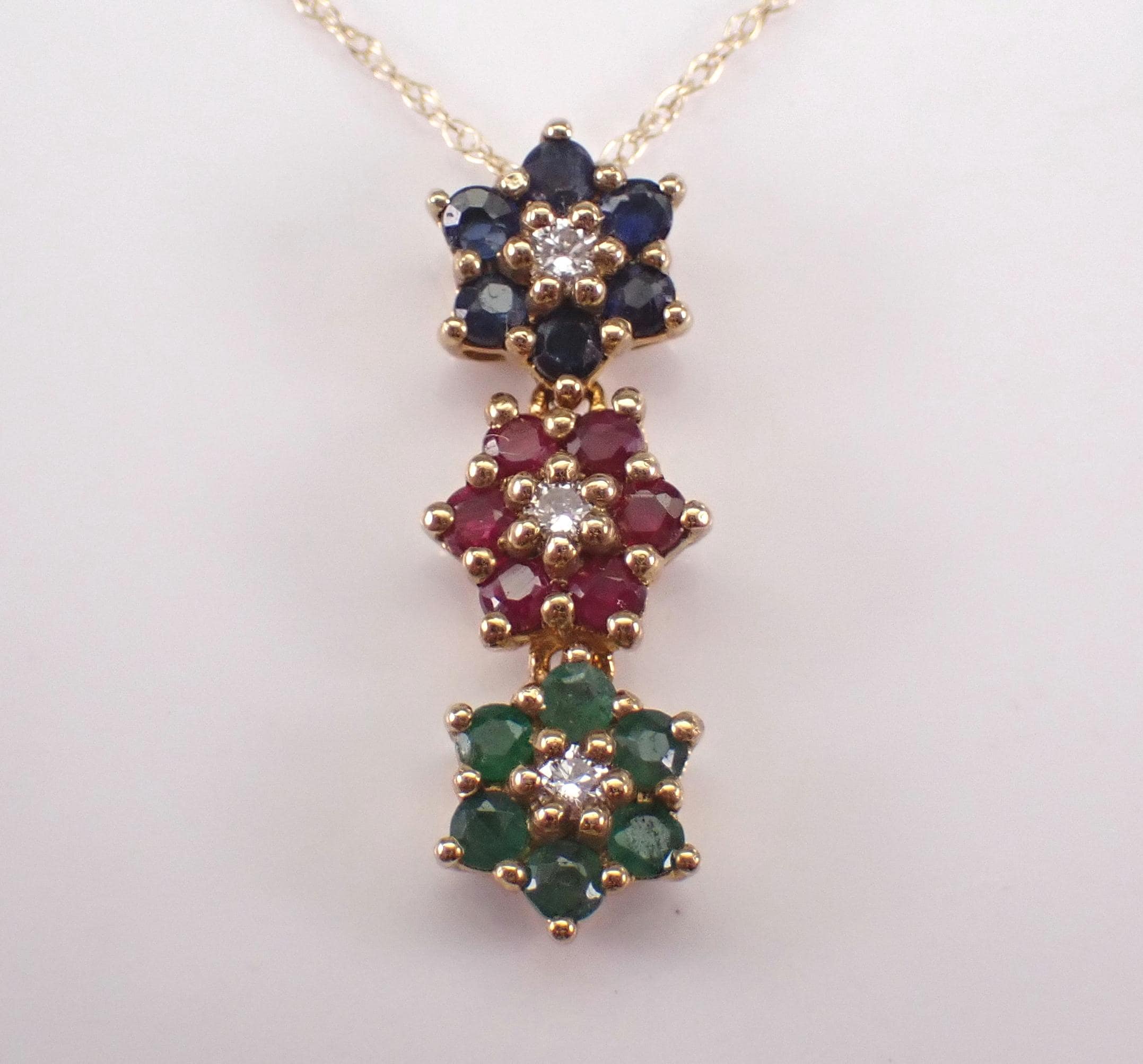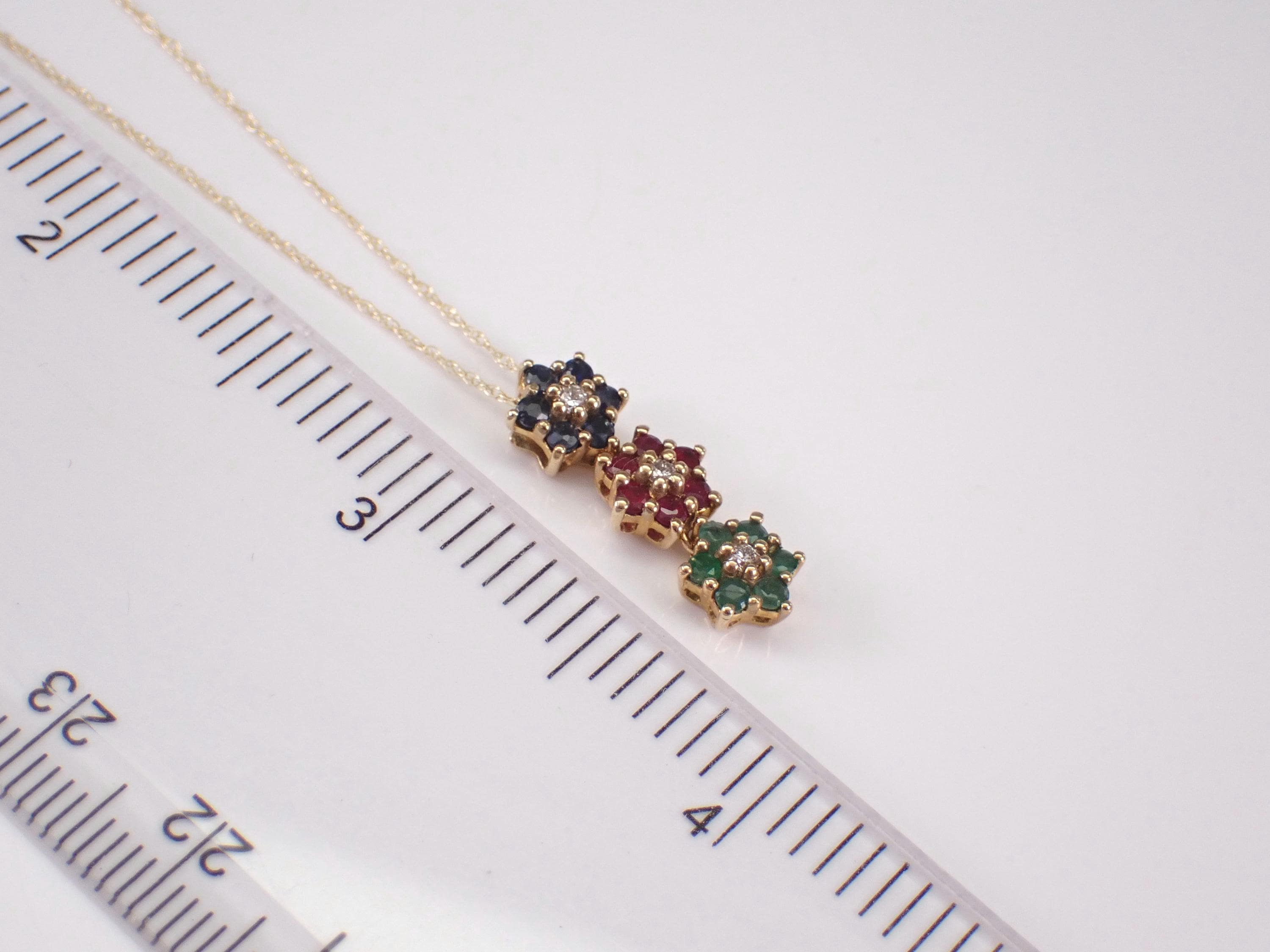Yellow Gold Diamond Flower Pendant with Chain. This pendant is set with three genuine Round Brilliant Diamonds, six Round Sapphires, six Round Rubies and six Round Emeralds. These diamonds are H color, SI clarity and weigh a total of .10 carat. The gemstones in this pendant are all 100% genuine and weigh a total of 1/2 carat. This pendant is 10KT Yellow Gold and comes with an 18" 10KT Yellow Gold chain. This necklace weighs 2.0 grams and the pendant measures 21 mm in length. This necklace will be accompanied by an appraisal written by a GIA Certified Diamond Grader with the retail replacement value of $1,479.00. I will ship this necklace promptly in a beautiful gift box.