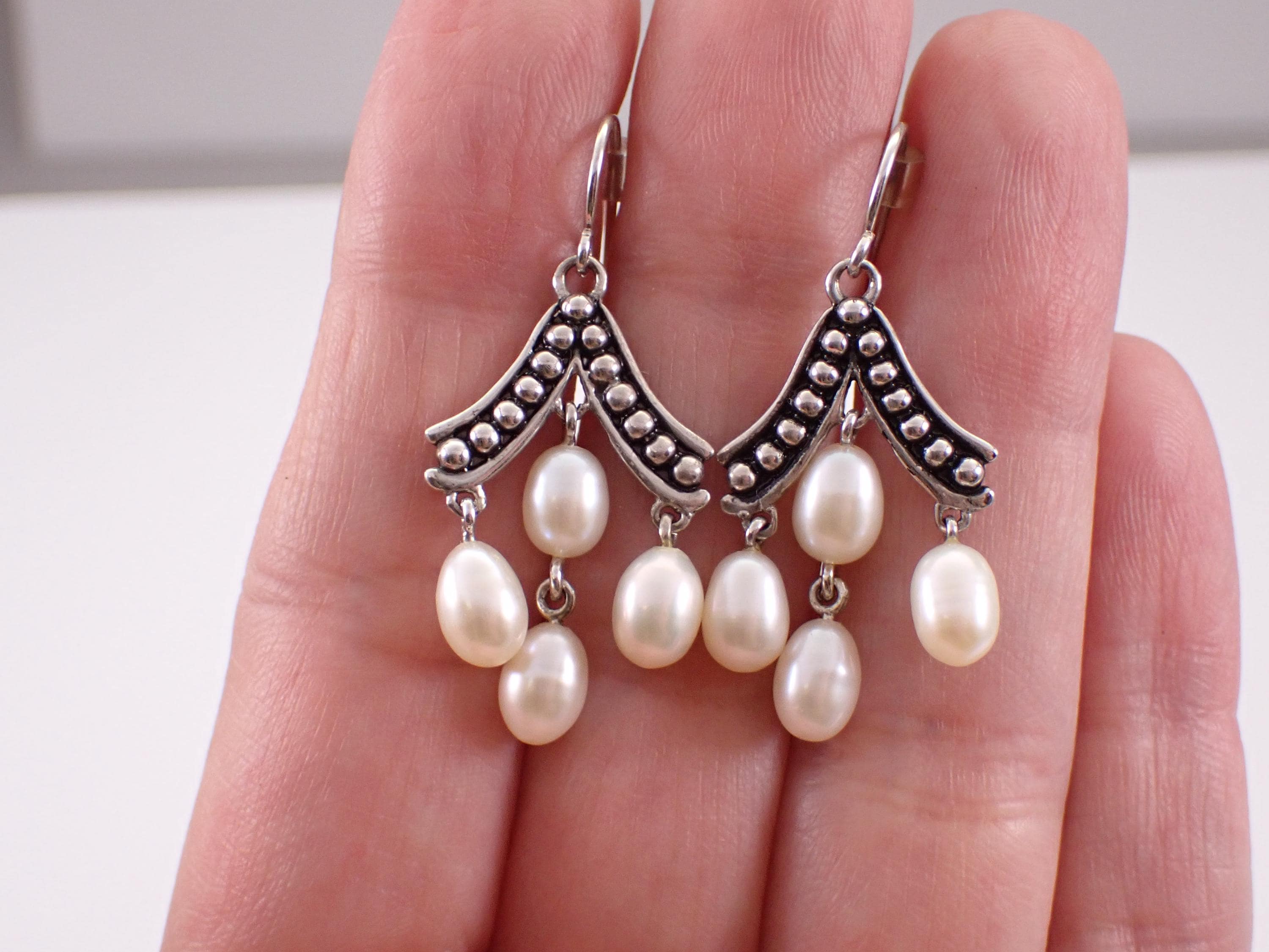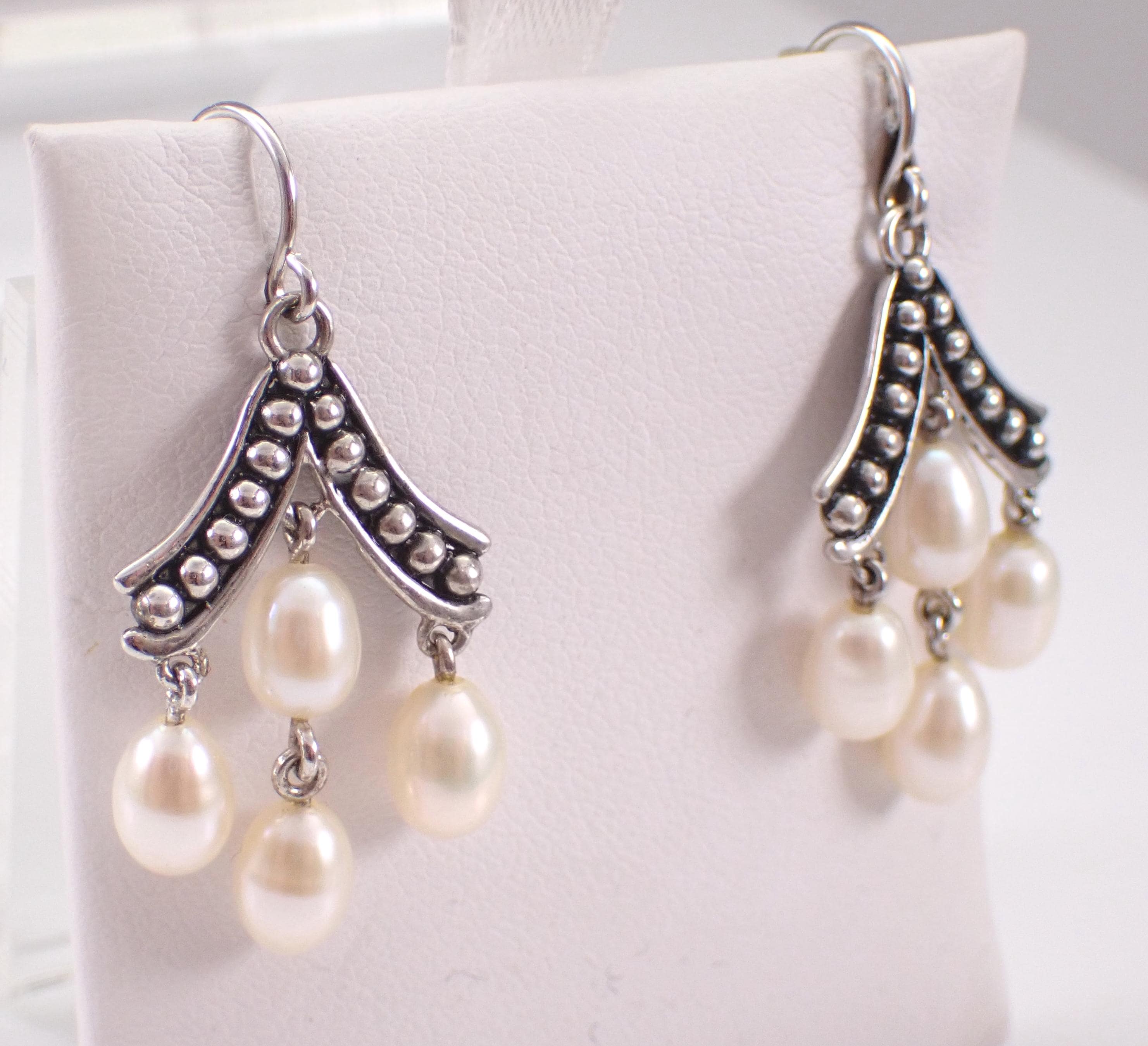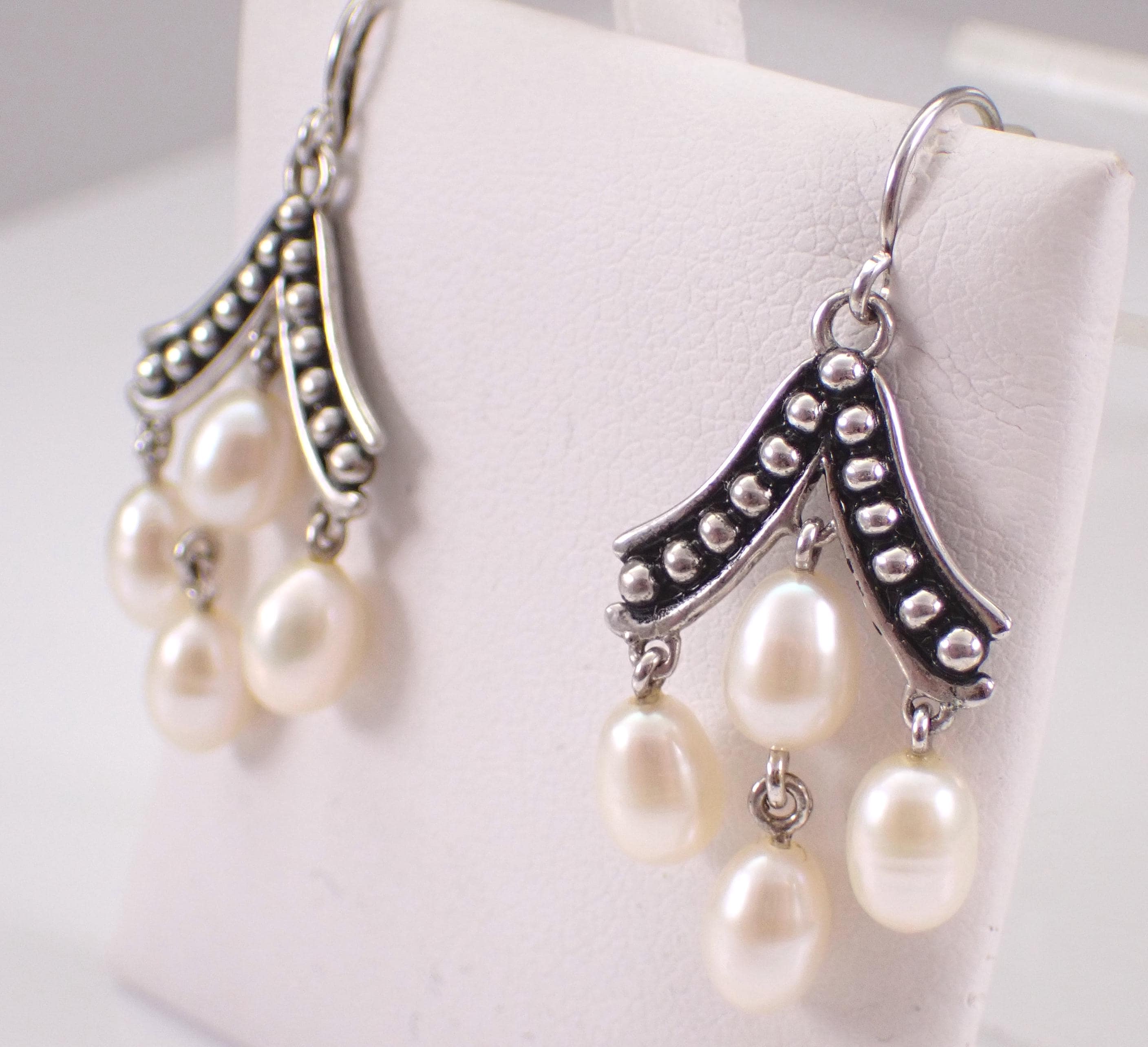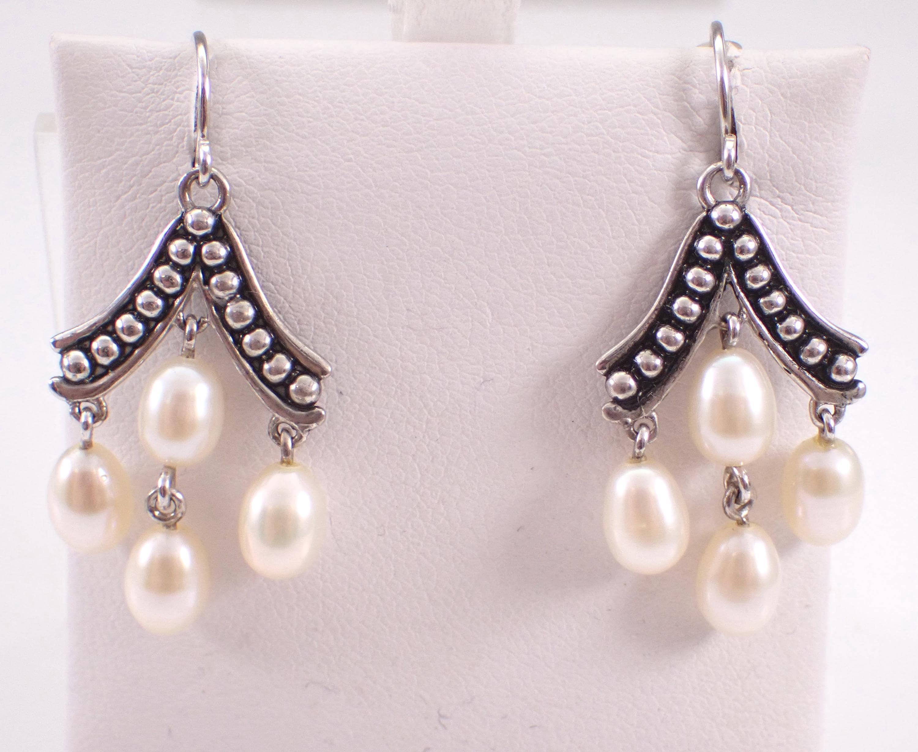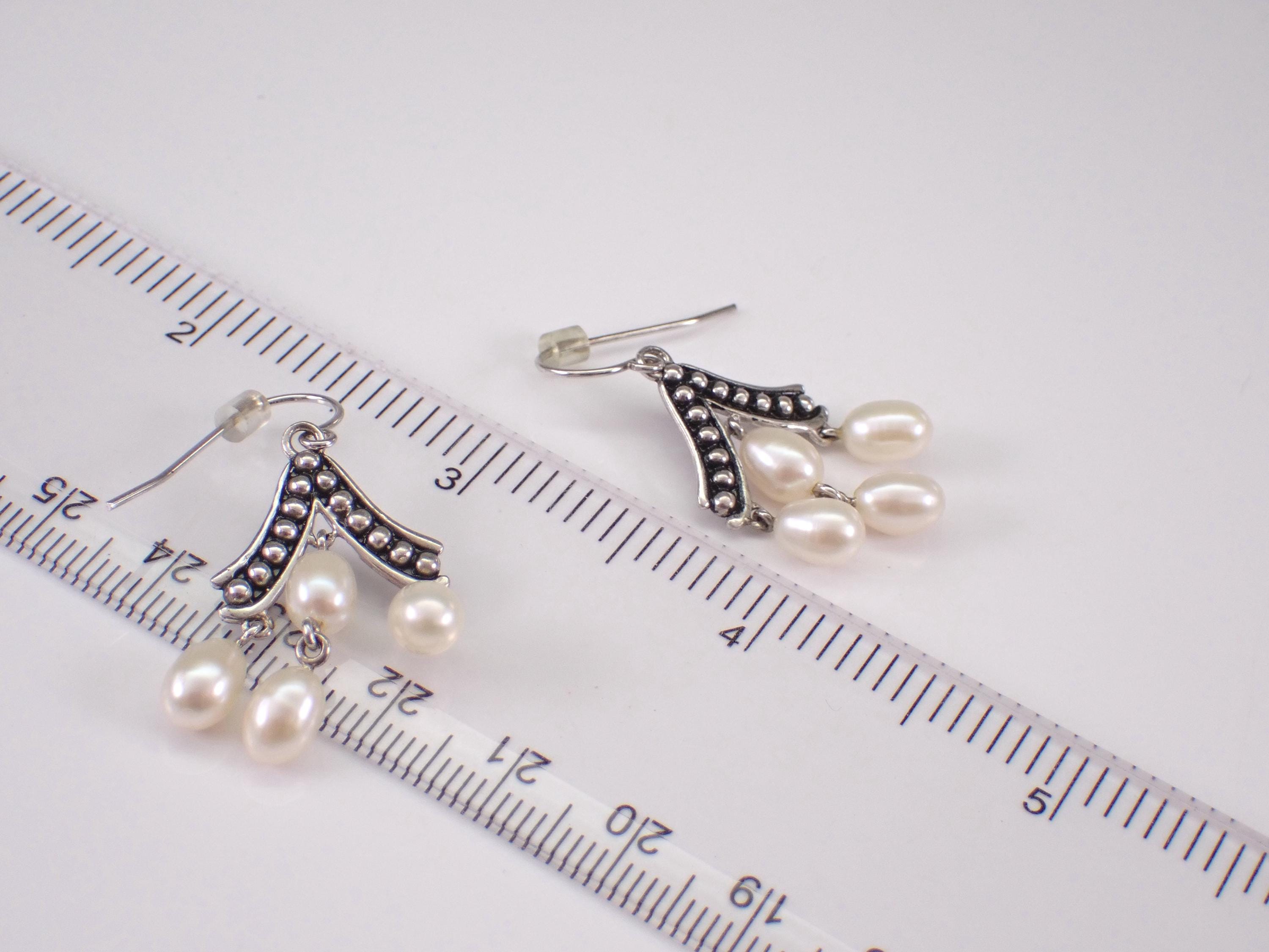 Unique Sterling Silver Dangle Earrings. These earrings are set with four pearls in each earring. These pearls are Freshwater. These earrings weigh 5.0 grams, measure 29 X 17 mm (without the wire) and have a simple Kidney wire clasps. These earrings will be shipped promptly in a gift pouch.