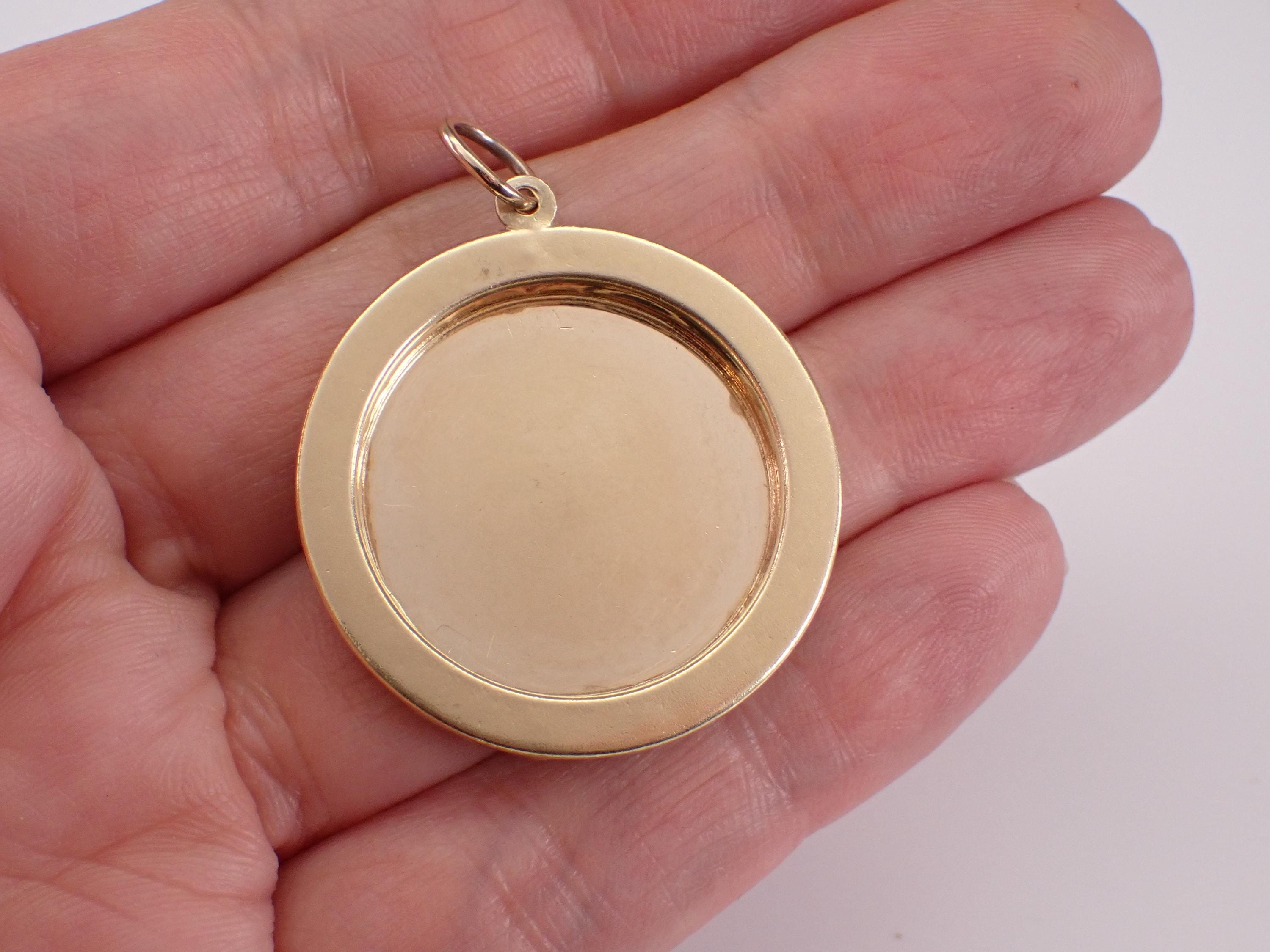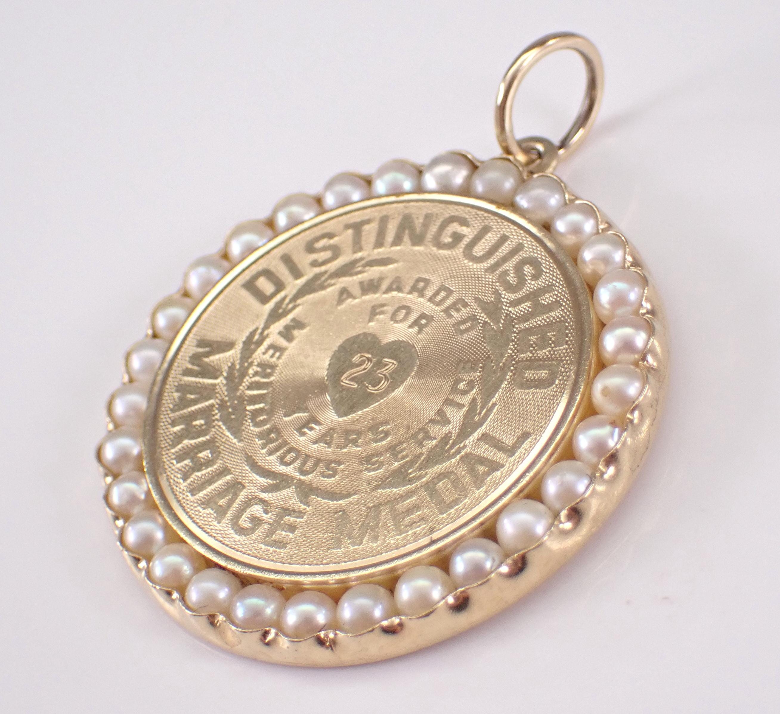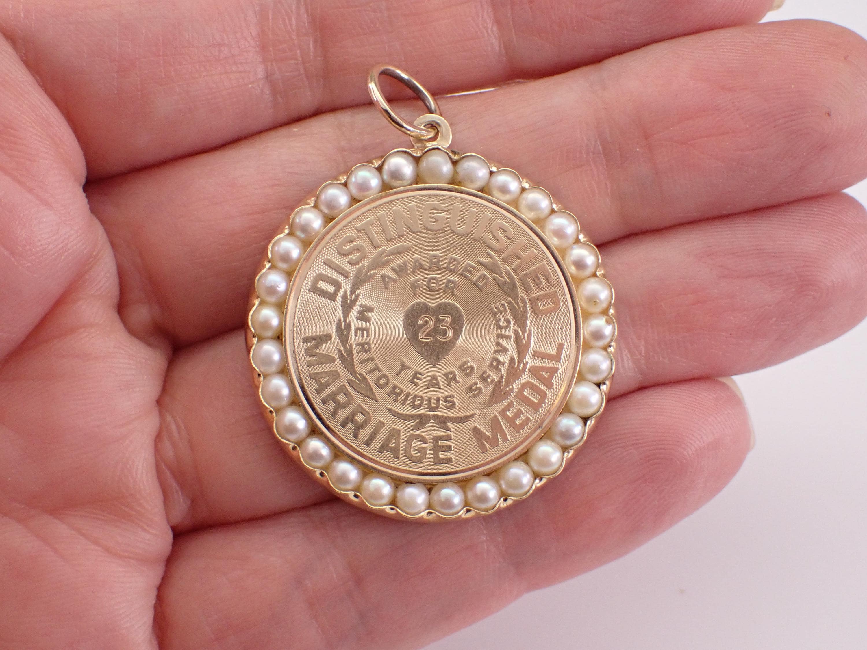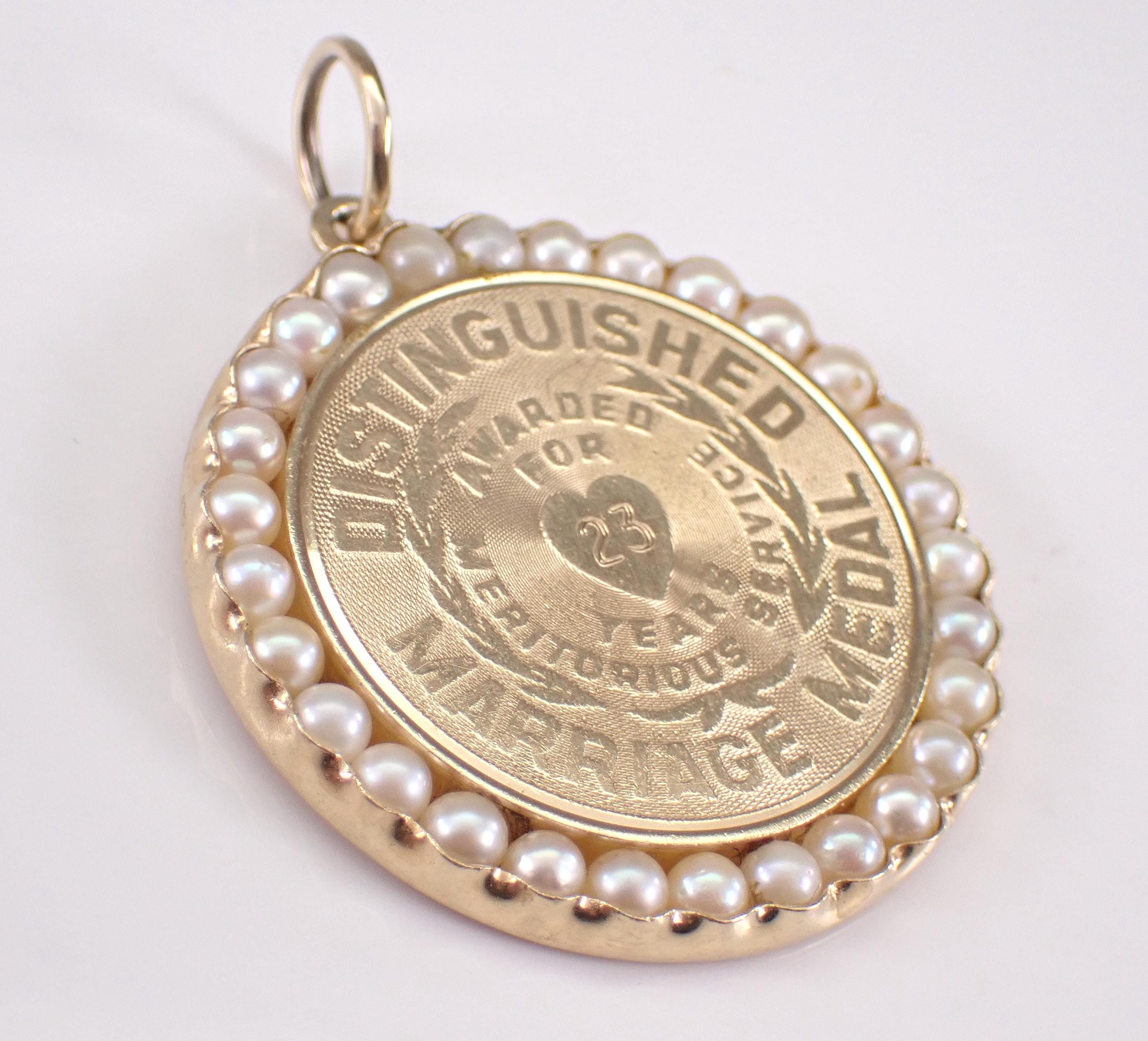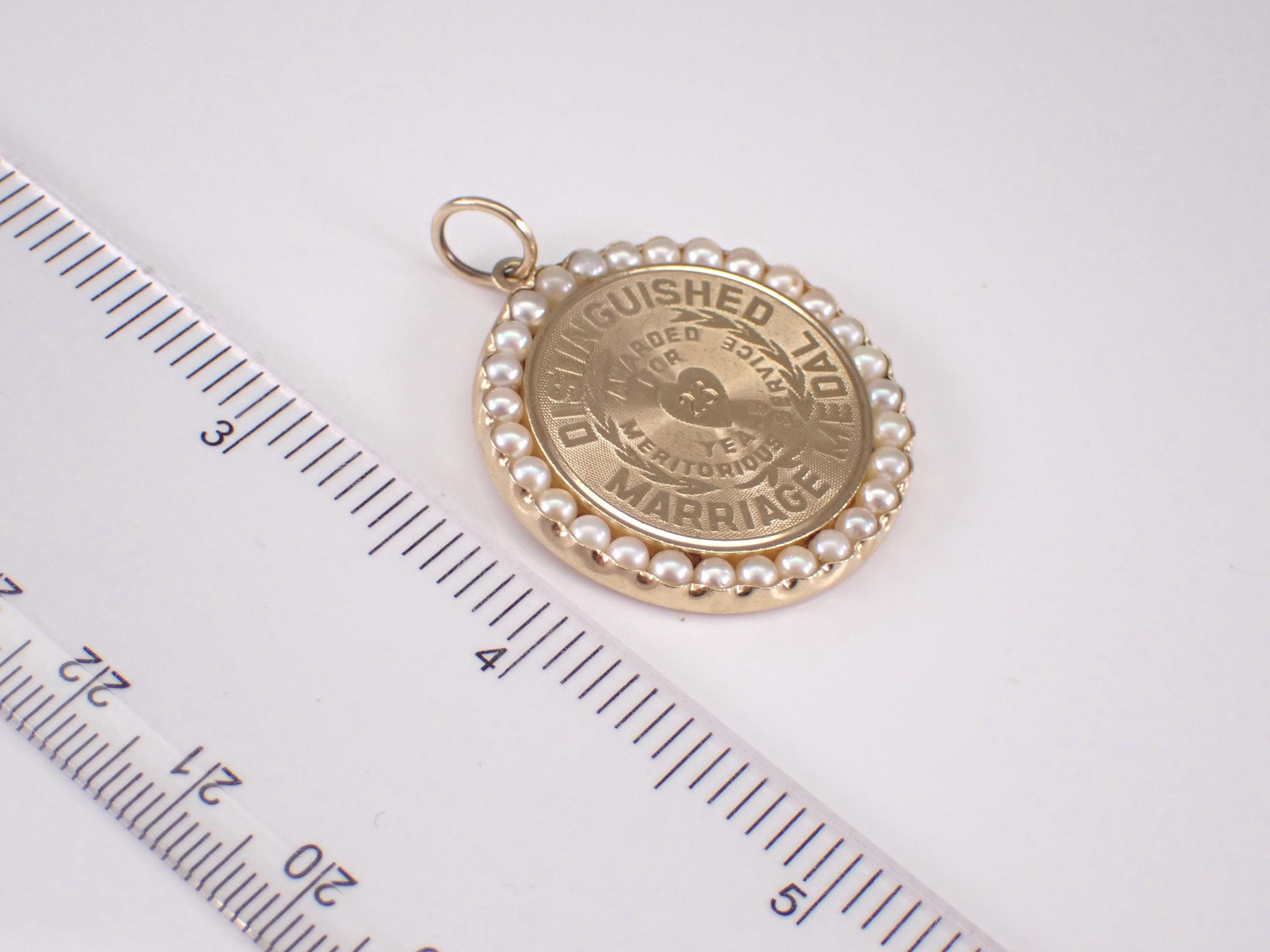 Vintage 14K Yellow Gold "Distinguished Marriage Medal" Charm Pendant. There are pearls set in a halo around the pendant. This charm is 14K Yellow gold and weighs 6.2 grams. This charm measures 32 mm in diameter and has an engraving on the front the reads "Distinguished Marriage Medal, Awarded for 23 years Meritorious Service. I will ship this pendant promptly in a gift pouch.