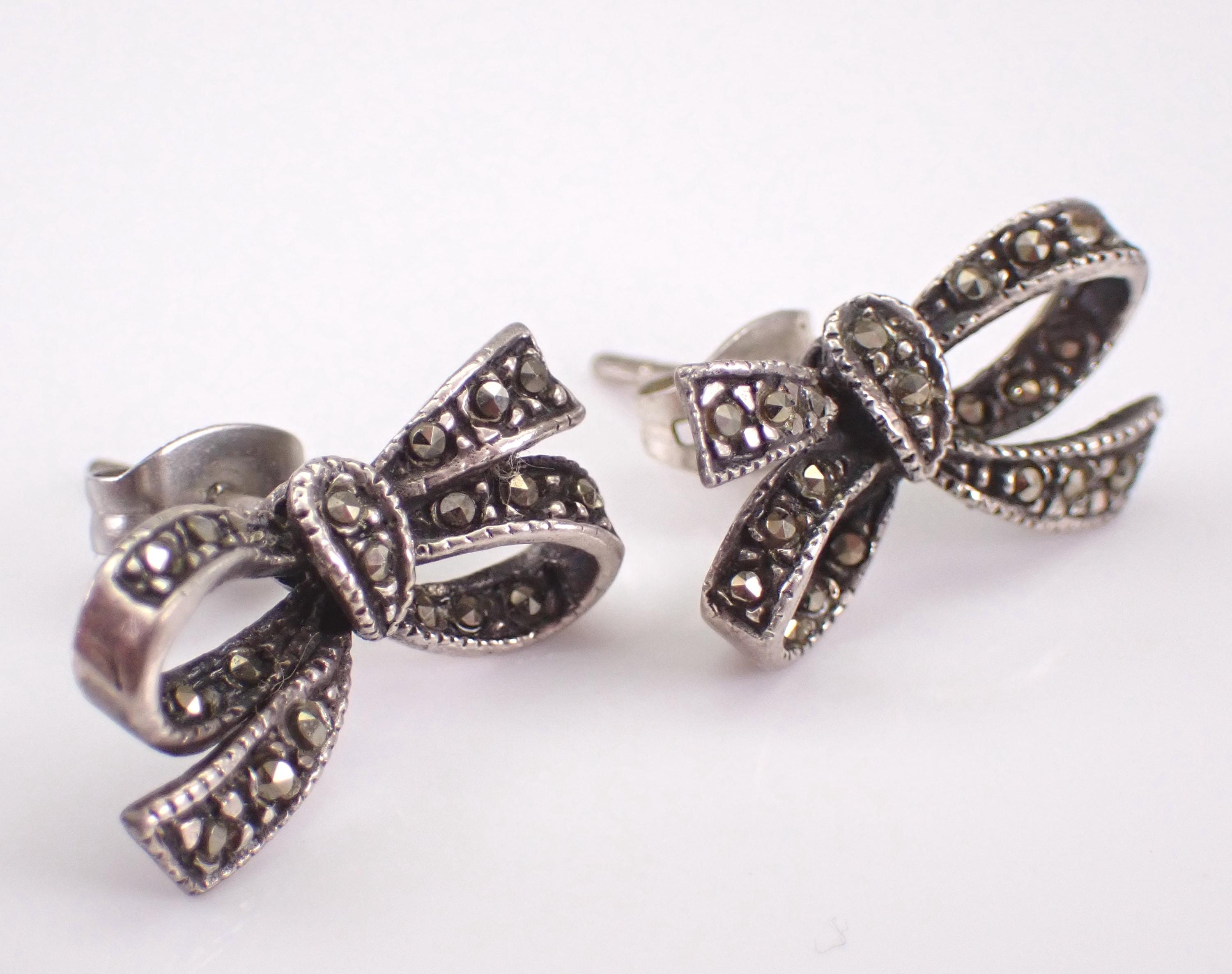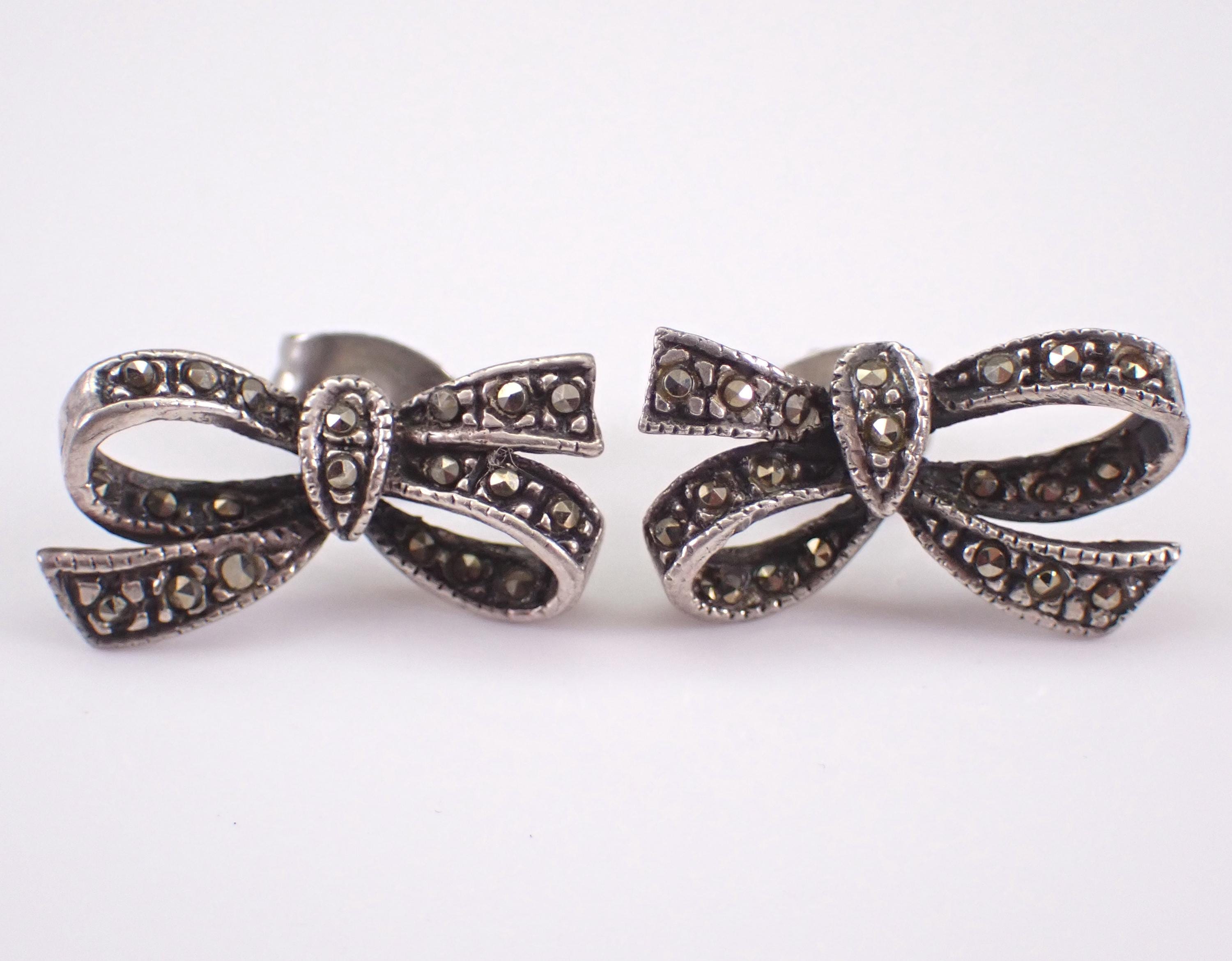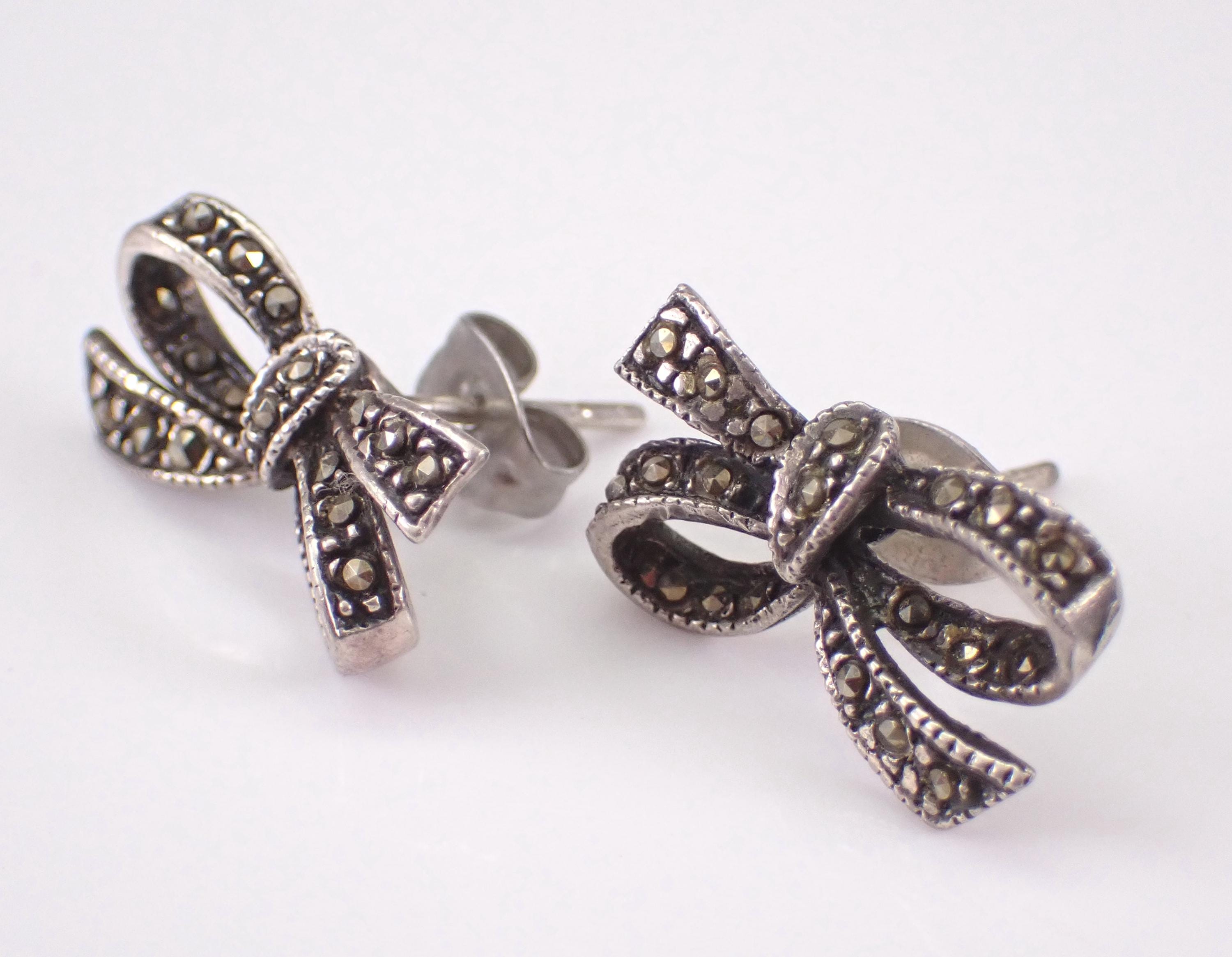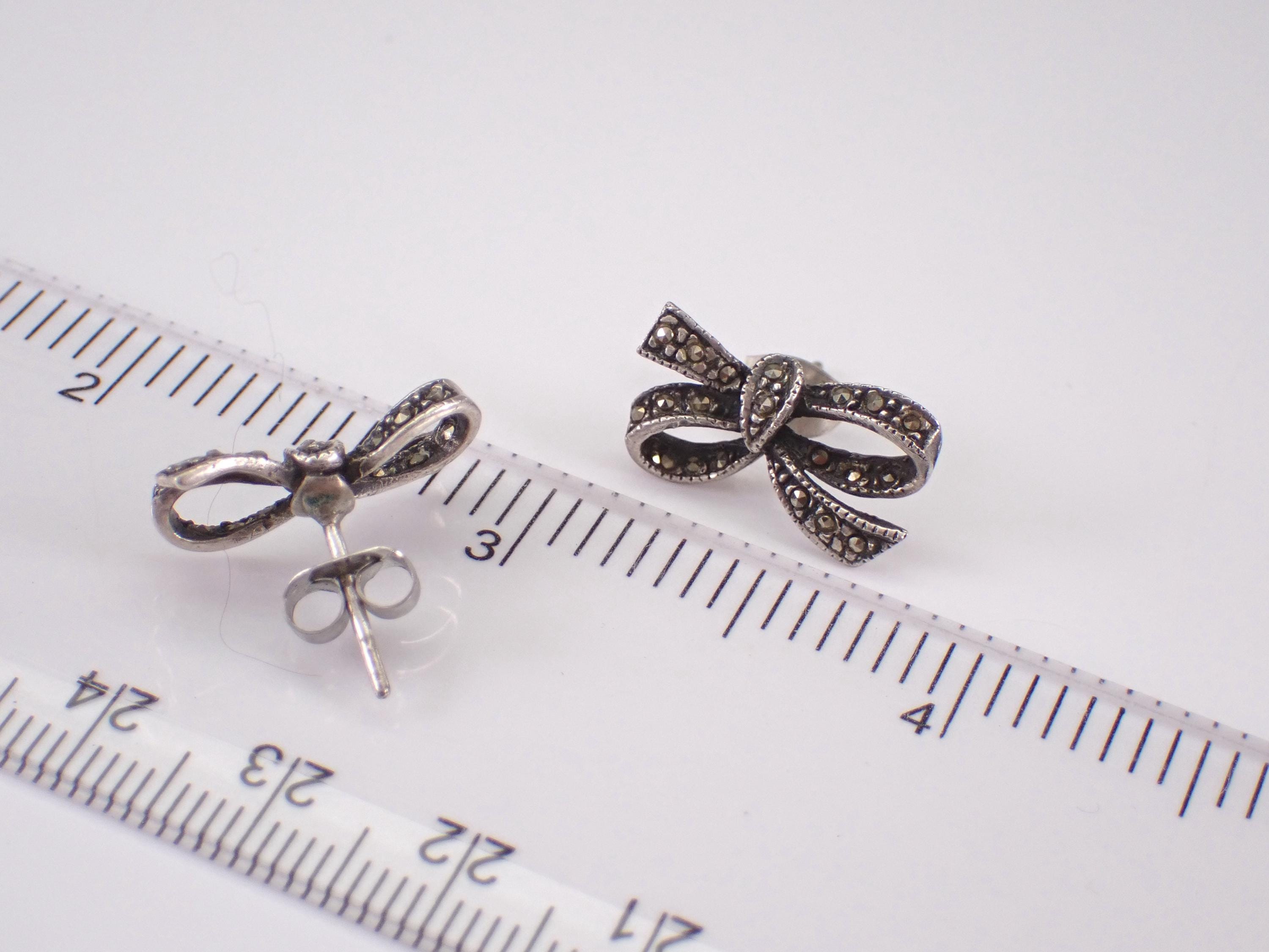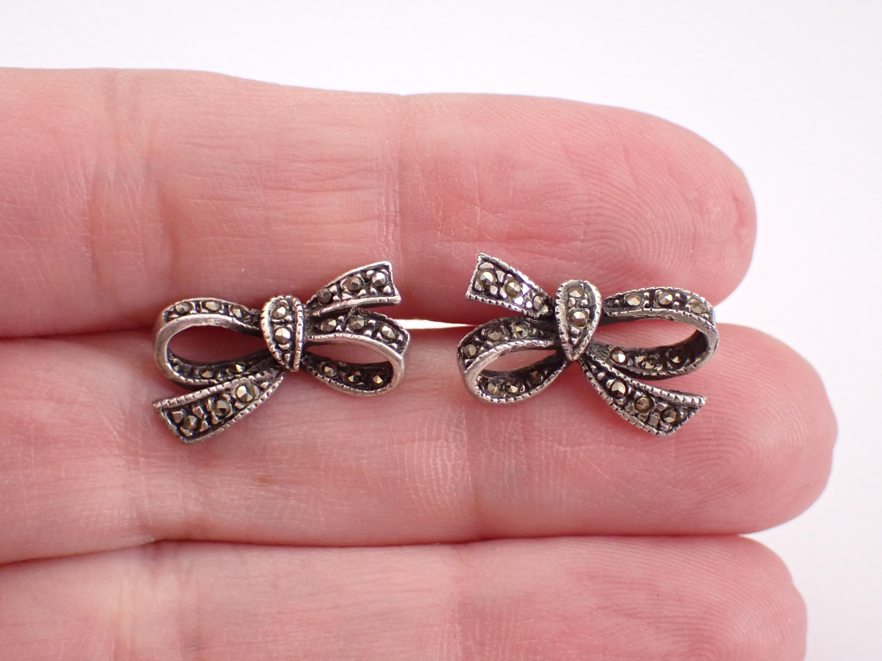 Beautiful and unique Marcasite Bow Tie Stud earrings are crafted of 925 Sterling Silver. These earrings are set with marcasite throughout. Each earring measures 10 X 18 mm. These earrings weigh a total of 2.8 grams. The earrings have friction post backings for pierced ears. These earrings will be shipped promptly in a gift pouch.