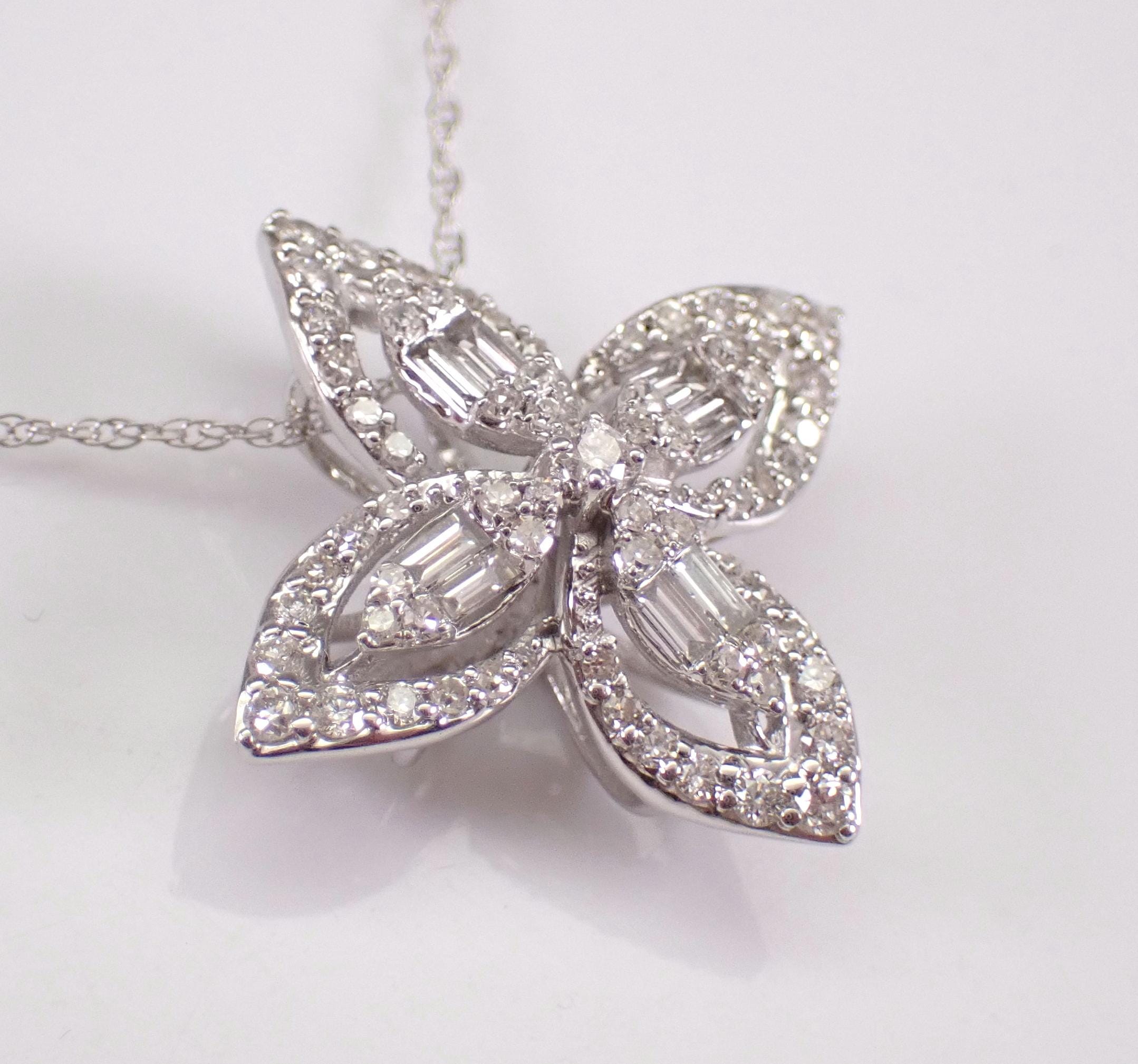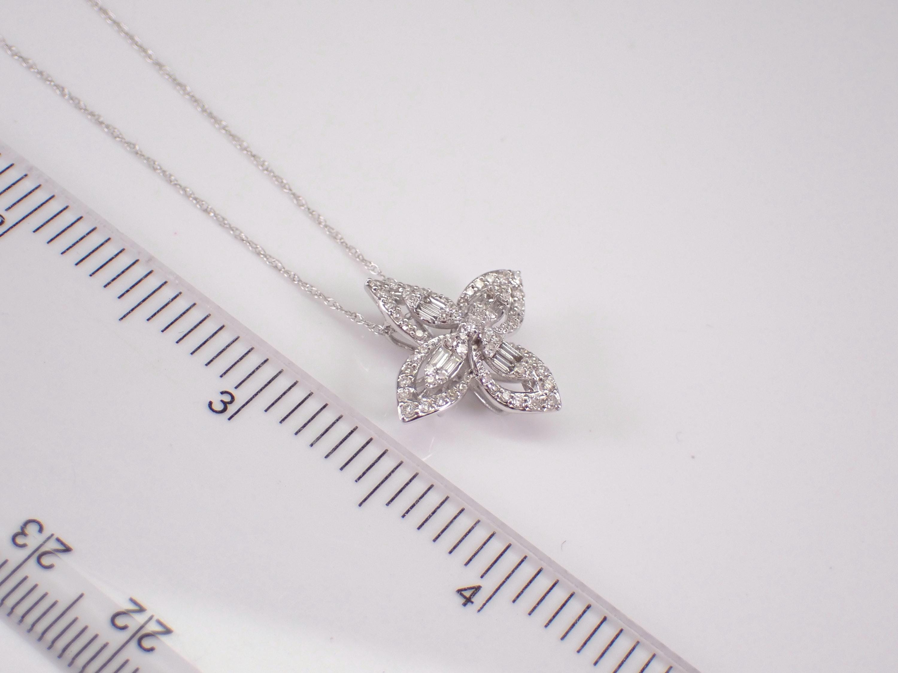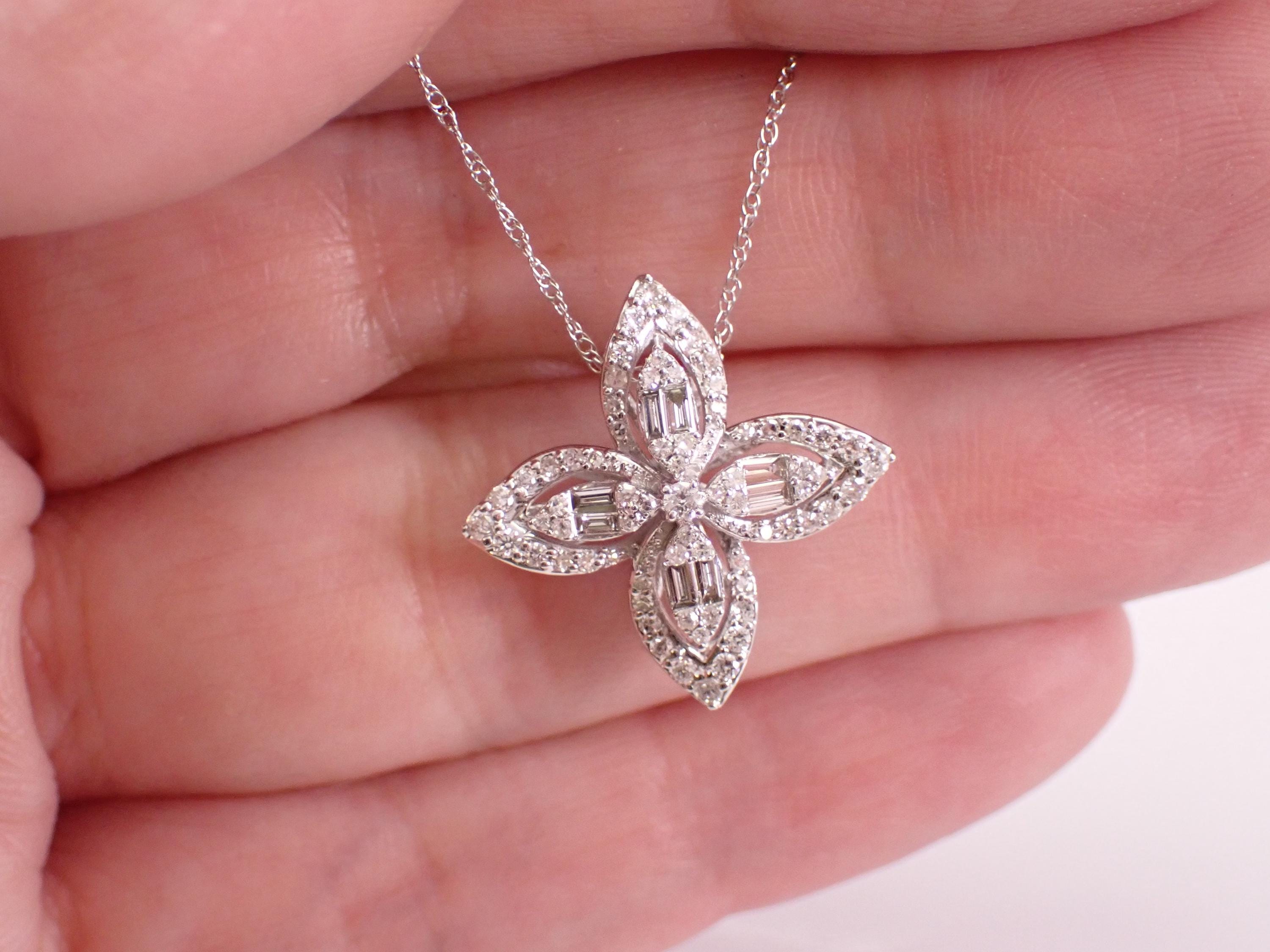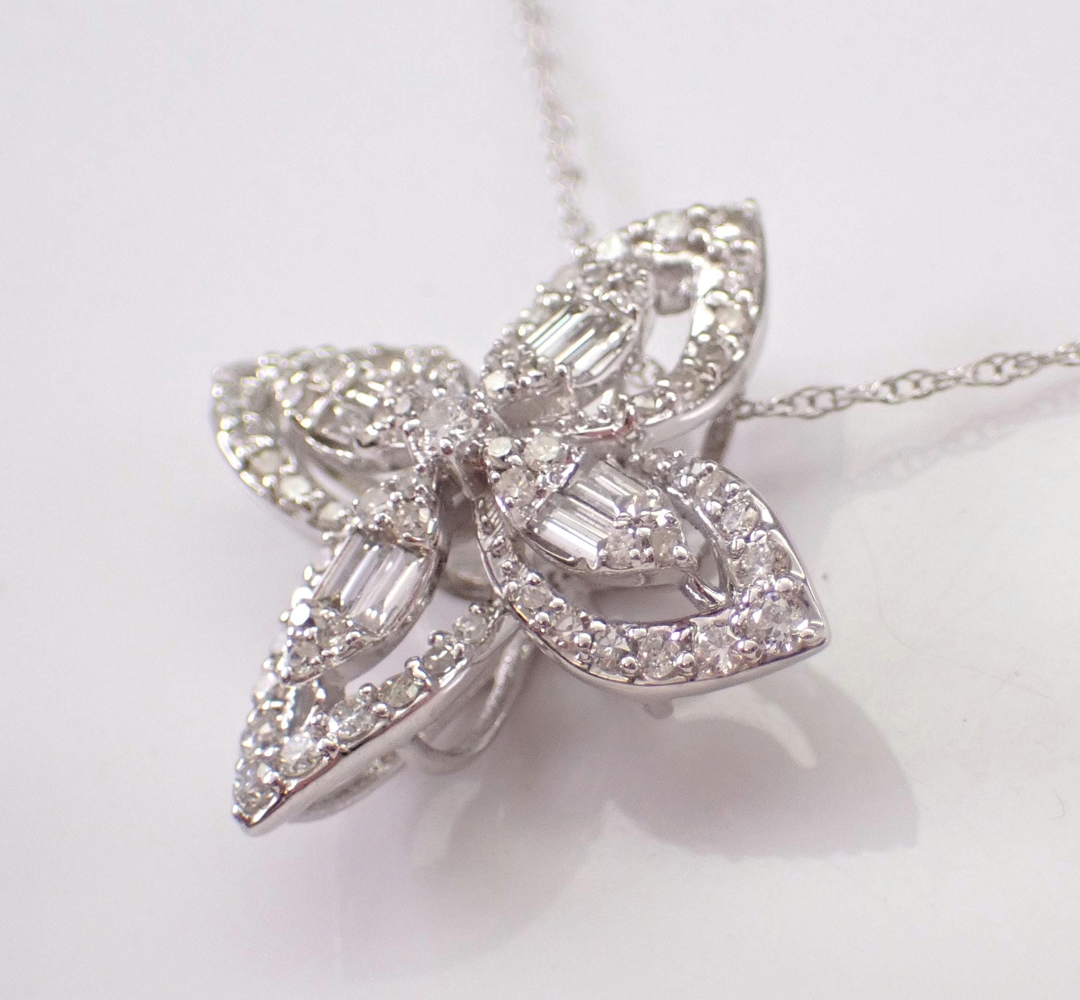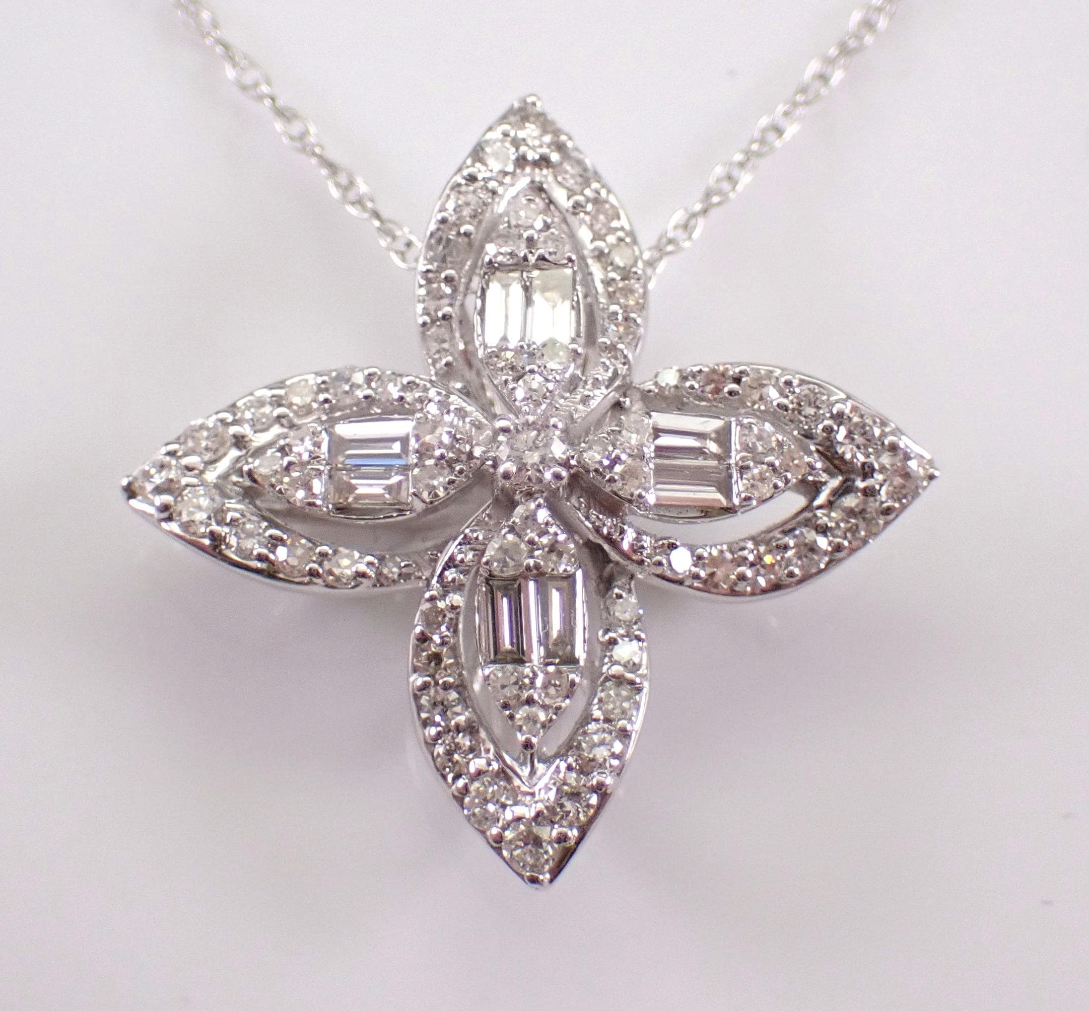 White Gold Diamond Cluster Pendant with Chain. This pendant is set with sixty-nine round brilliant diamonds and eight baguette diamonds. These diamonds are extremely sparkly and brilliant, are G/H color, SI/I1 clarity and weigh a total of .60 carat. This necklace is 10K White gold and the chain measures 18" in length. This necklace weighs 2.2 grams and the pendant measures 20 X 20 mm. This necklace will be accompanied by an appraisal written by a GIA Certified Diamond Grader with the retail replacement value of $1,795.00. I will ship this necklace promptly in a beautiful gift box.