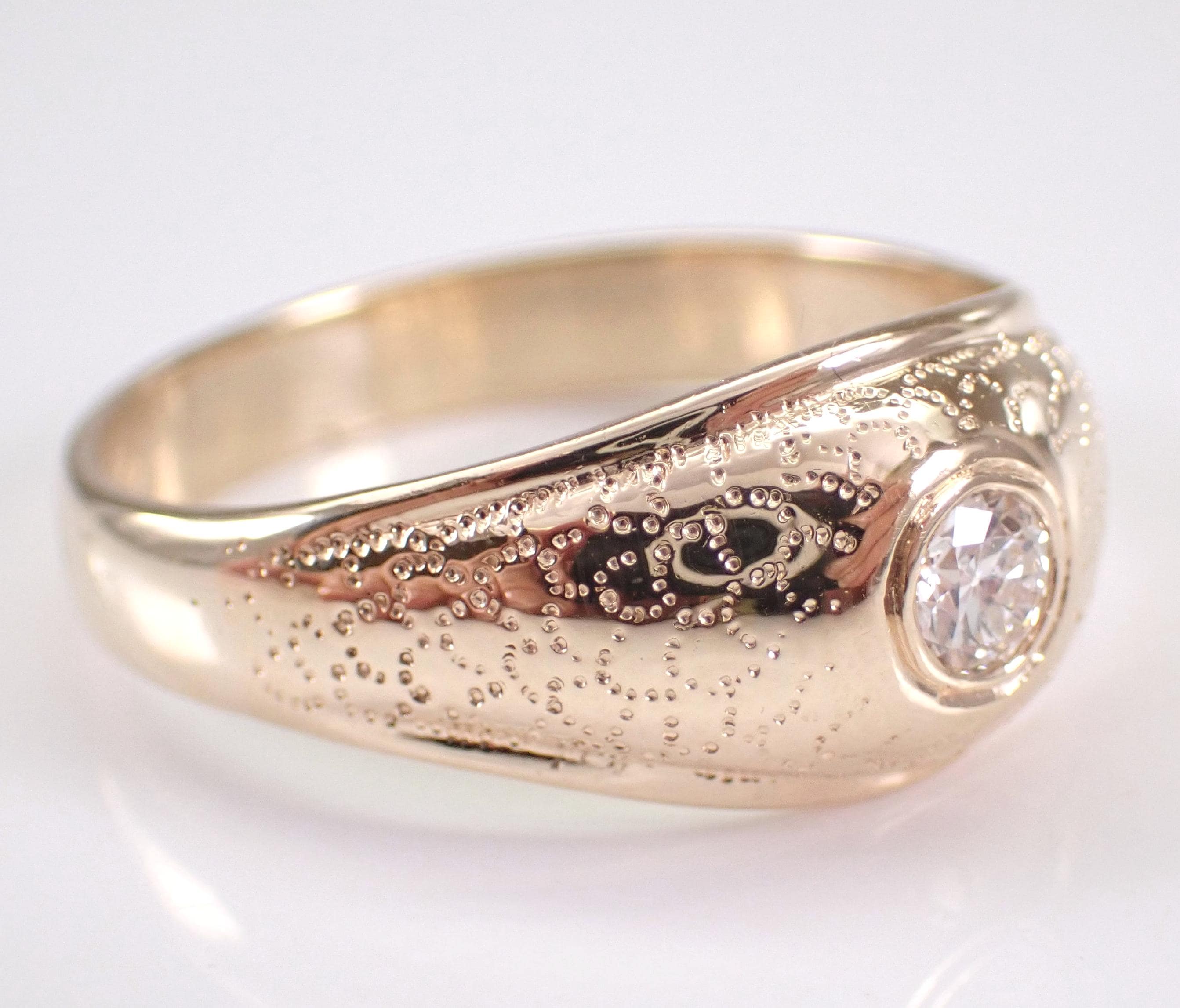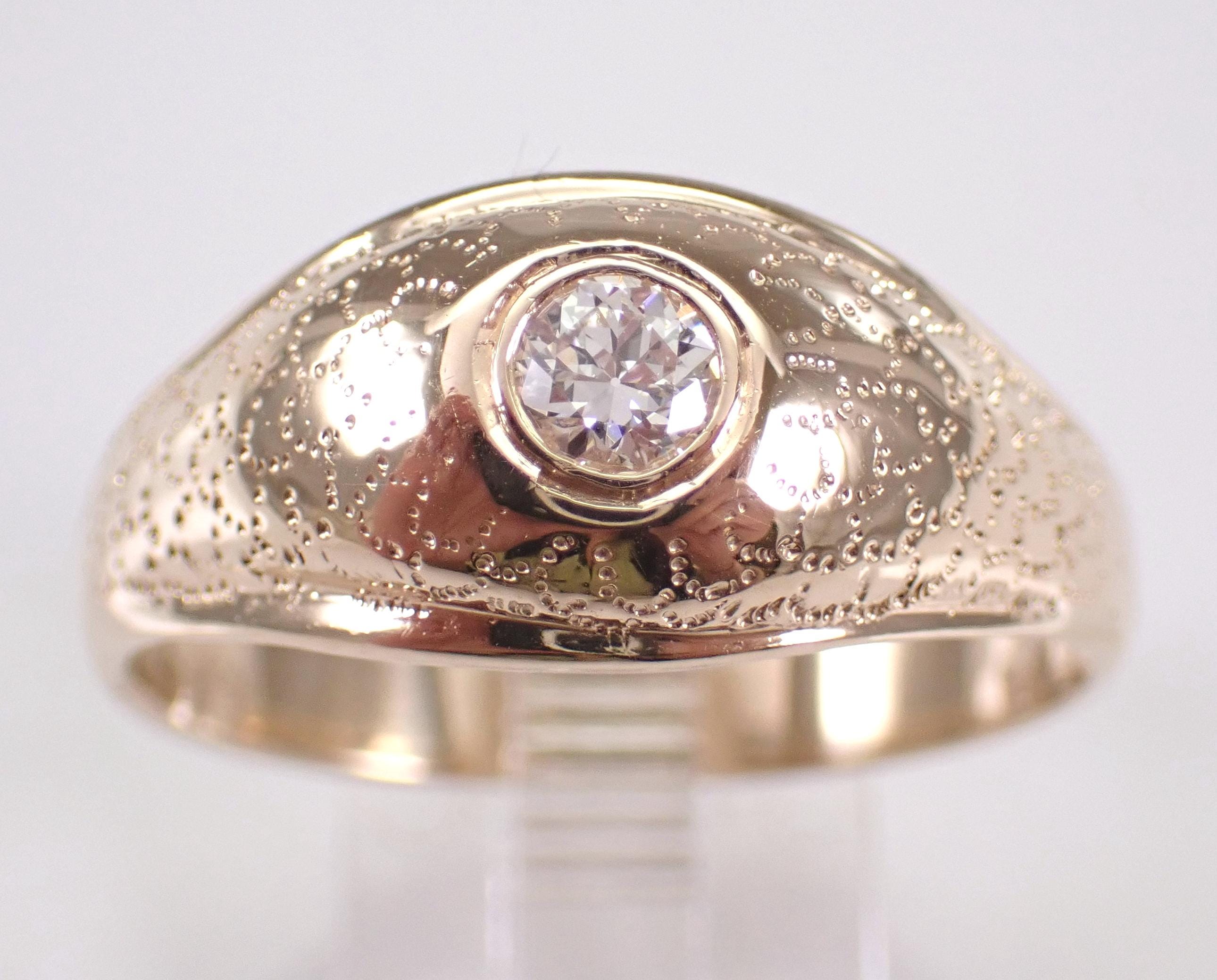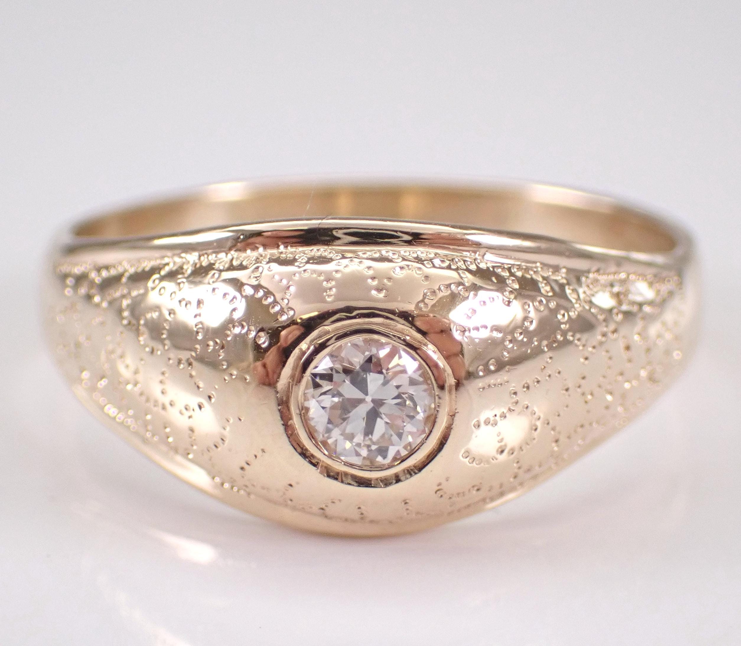 Antique 14K Yellow Gold Diamond Gypsy Ring. This ring is set with one genuine Round Diamond. This Diamond is G color, VS2 in clarity and weighs 1/4 carat. This ring is 14KT Yellow Gold, weighs 7.6 grams and measures 10 mm in width. This ring is a finger size 12 1/2, which can be resized free of charge (please inquire about sizing with the finger size that you need). This ring will be accompanied by an appraisal by a GIA Certified Diamond Grader with the retail replacement value of $3,679.00. I will ship this ring promptly in a gift box.