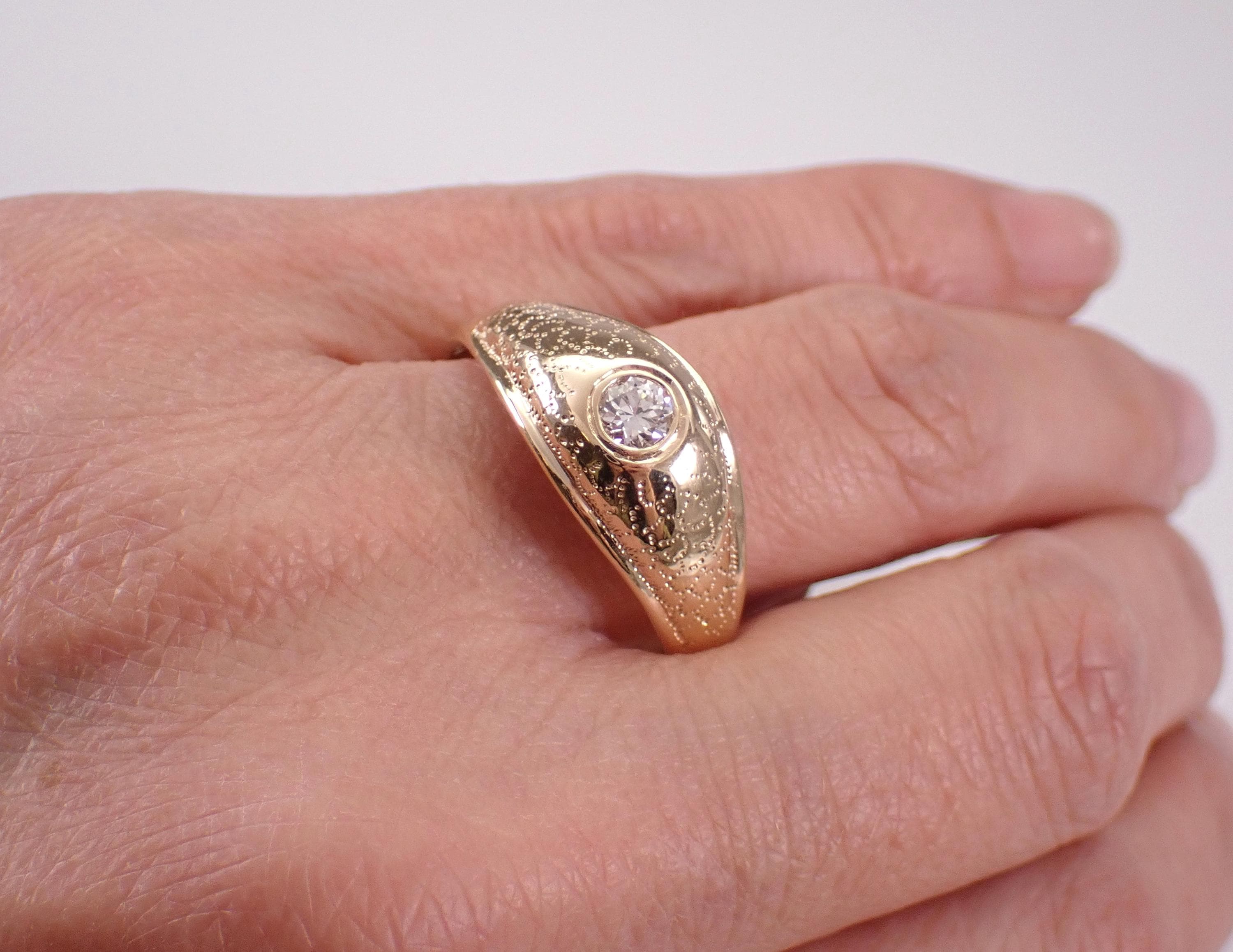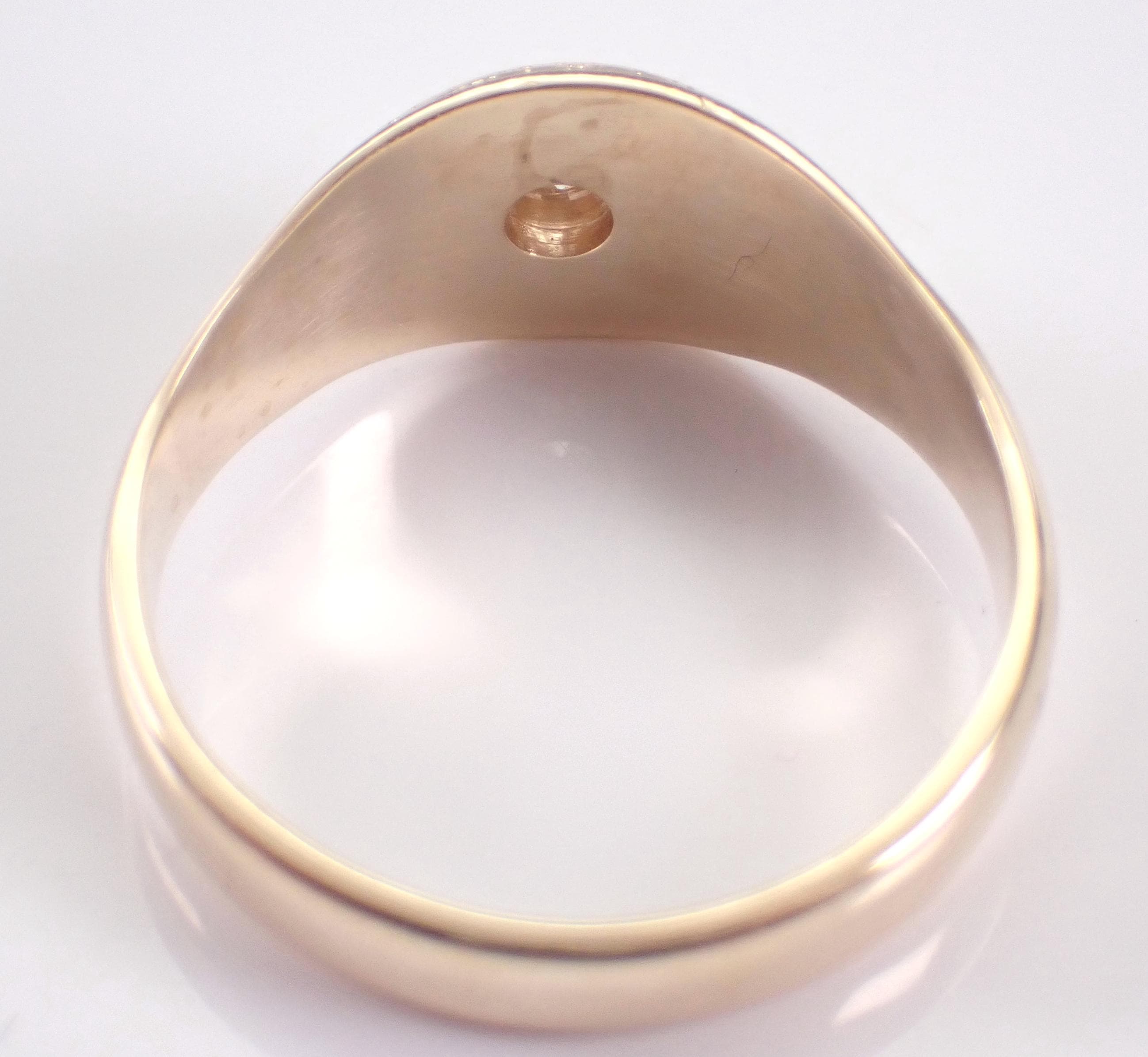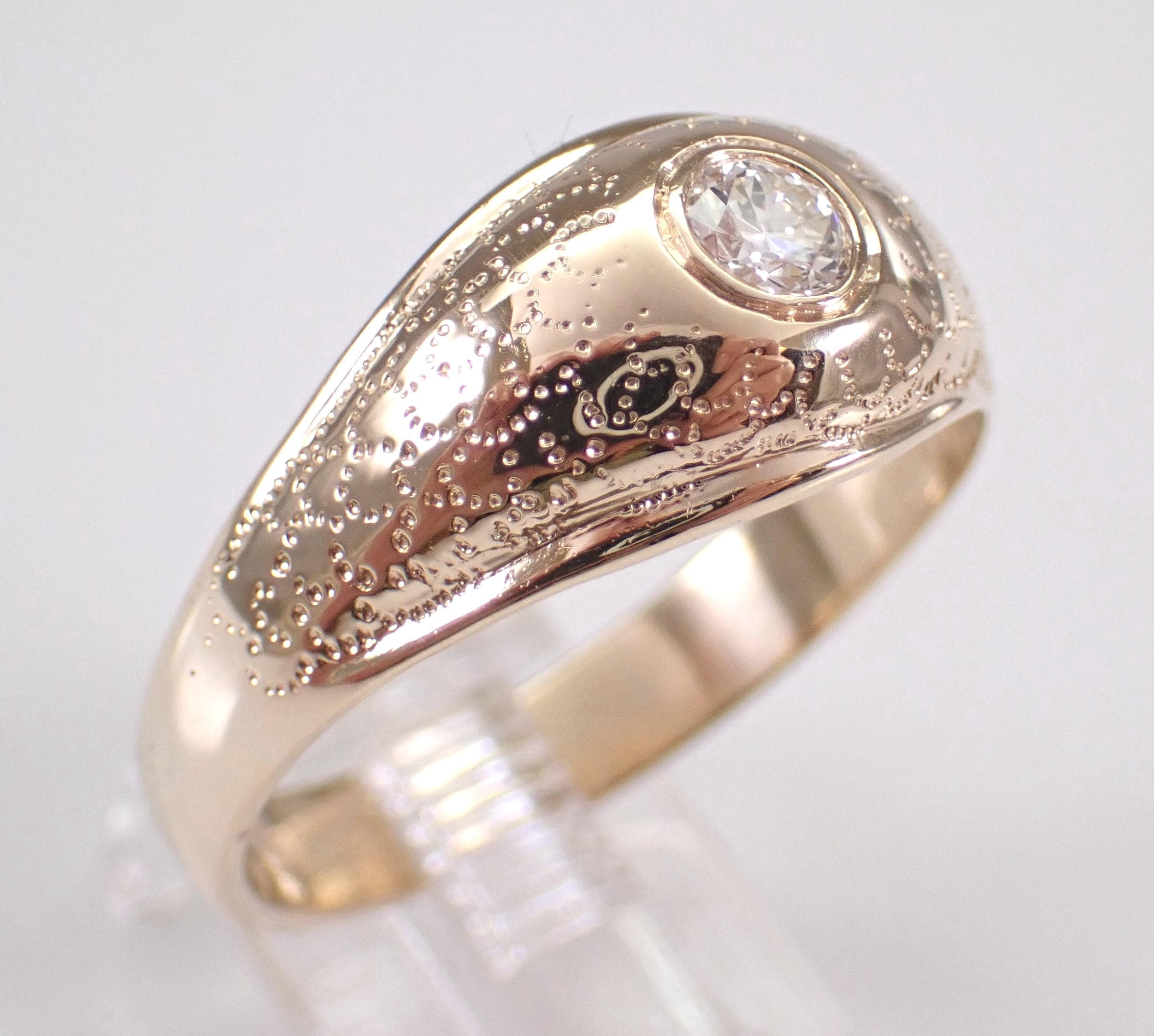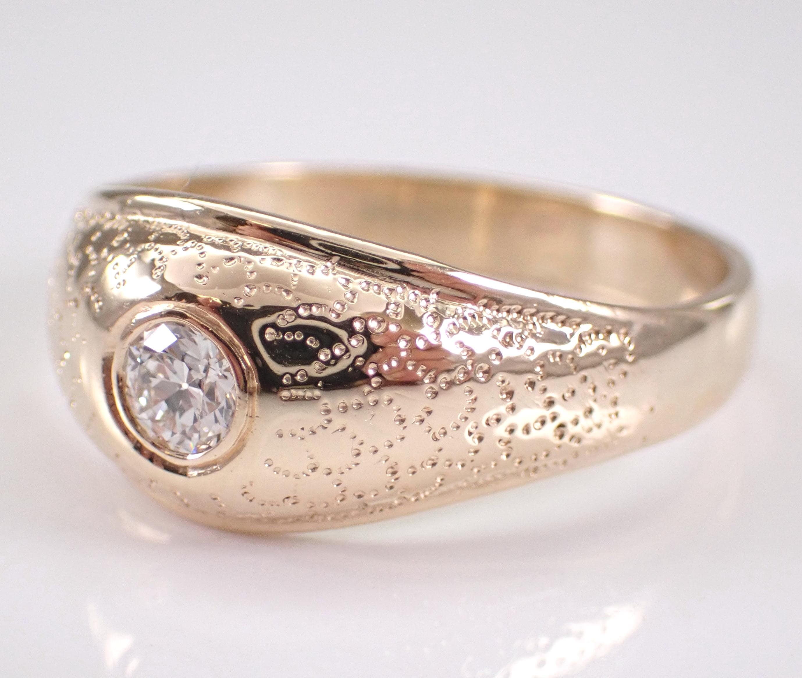 Antique 14K Yellow Gold Diamond Gypsy Ring. This ring is set with one genuine Round Diamond. This Diamond is G color, VS2 in clarity and weighs 1/4 carat. This ring is 14KT Yellow Gold, weighs 7.6 grams and measures 10 mm in width. This ring is a finger size 12 1/2, which can be resized free of charge (please inquire about sizing with the finger size that you need). This ring will be accompanied by an appraisal by a GIA Certified Diamond Grader with the retail replacement value of $3,679.00. I will ship this ring promptly in a gift box.