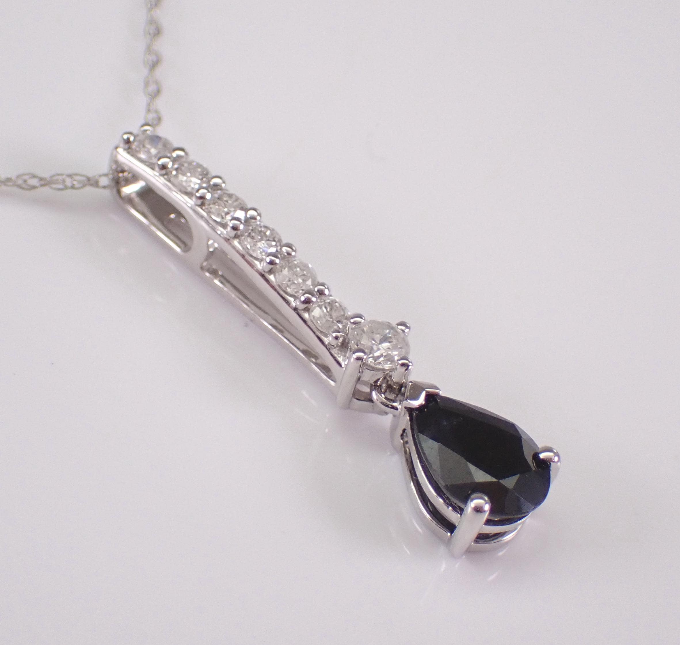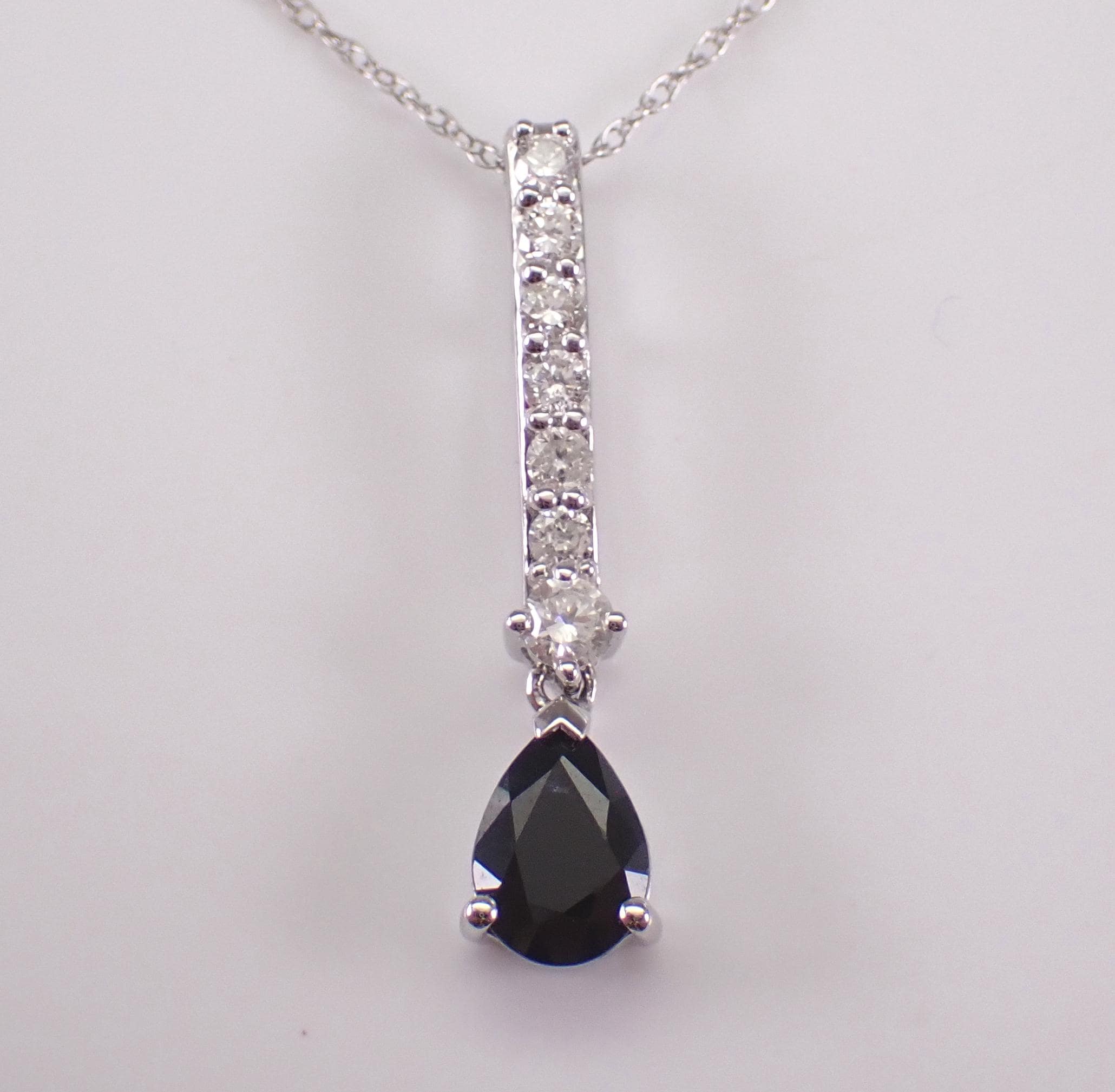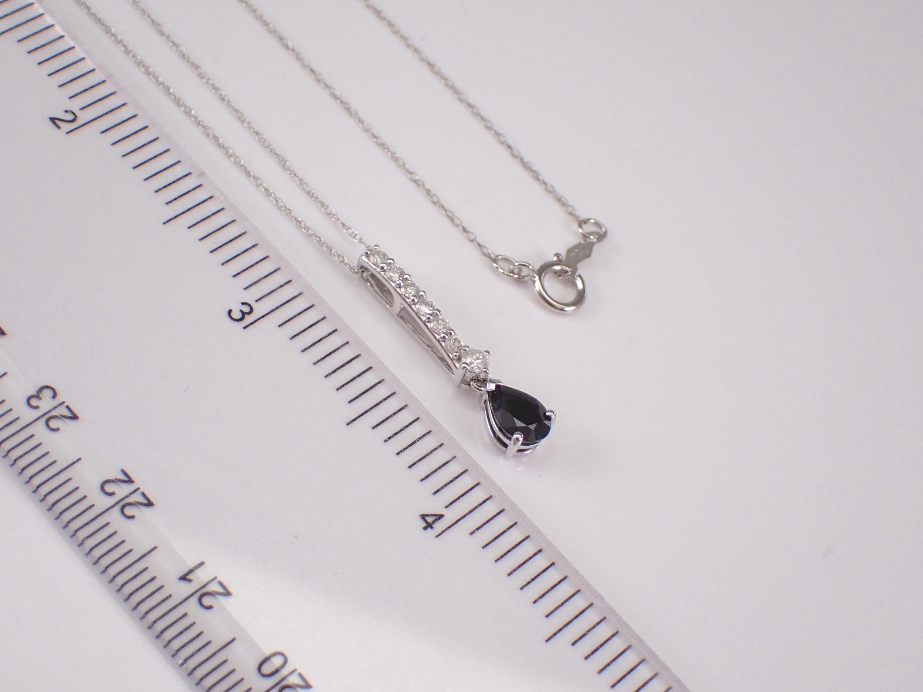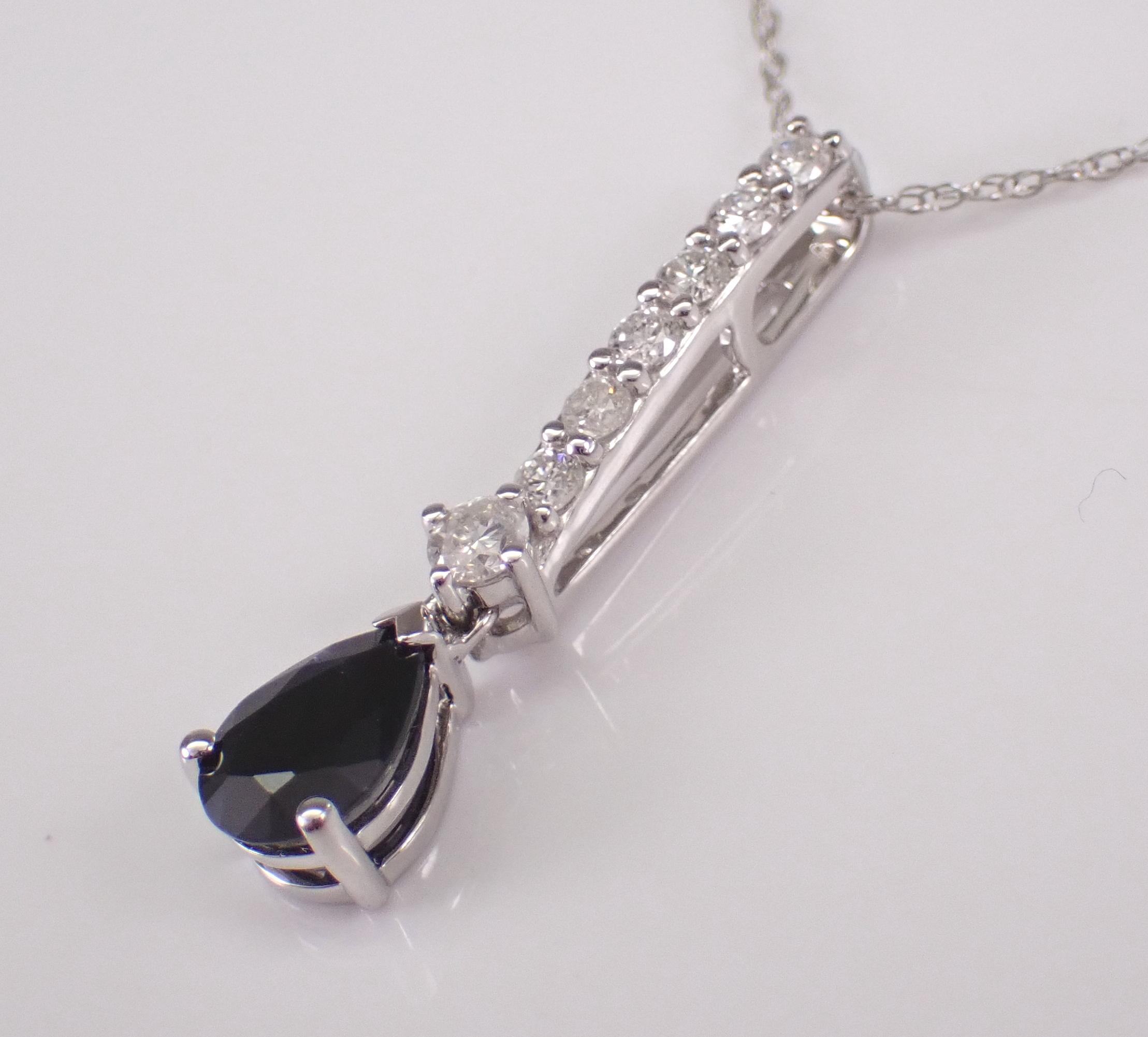 14K White Gold Diamond and Sapphire Pendant with Chain. This pendant is set with one Pear shaped Sapphire in the center and seven Round Brilliant Diamonds. The Sapphire measures 6.5 X 4.5 mm and weighs .70 carat. The diamonds are H color, I1 clarity and weigh a total of .25 carat. This necklace is 14KT White Gold and comes with an 18" 14KT White Gold chain. Both the pendant and chain weigh a total of 1.5 grams and the pendant measures 24 mm in length. This necklace will be accompanied by an appraisal written by a GIA Certified Diamond Grader with the retail replacement value of $1,495.00. I will ship this necklace promptly in a beautiful gift box.