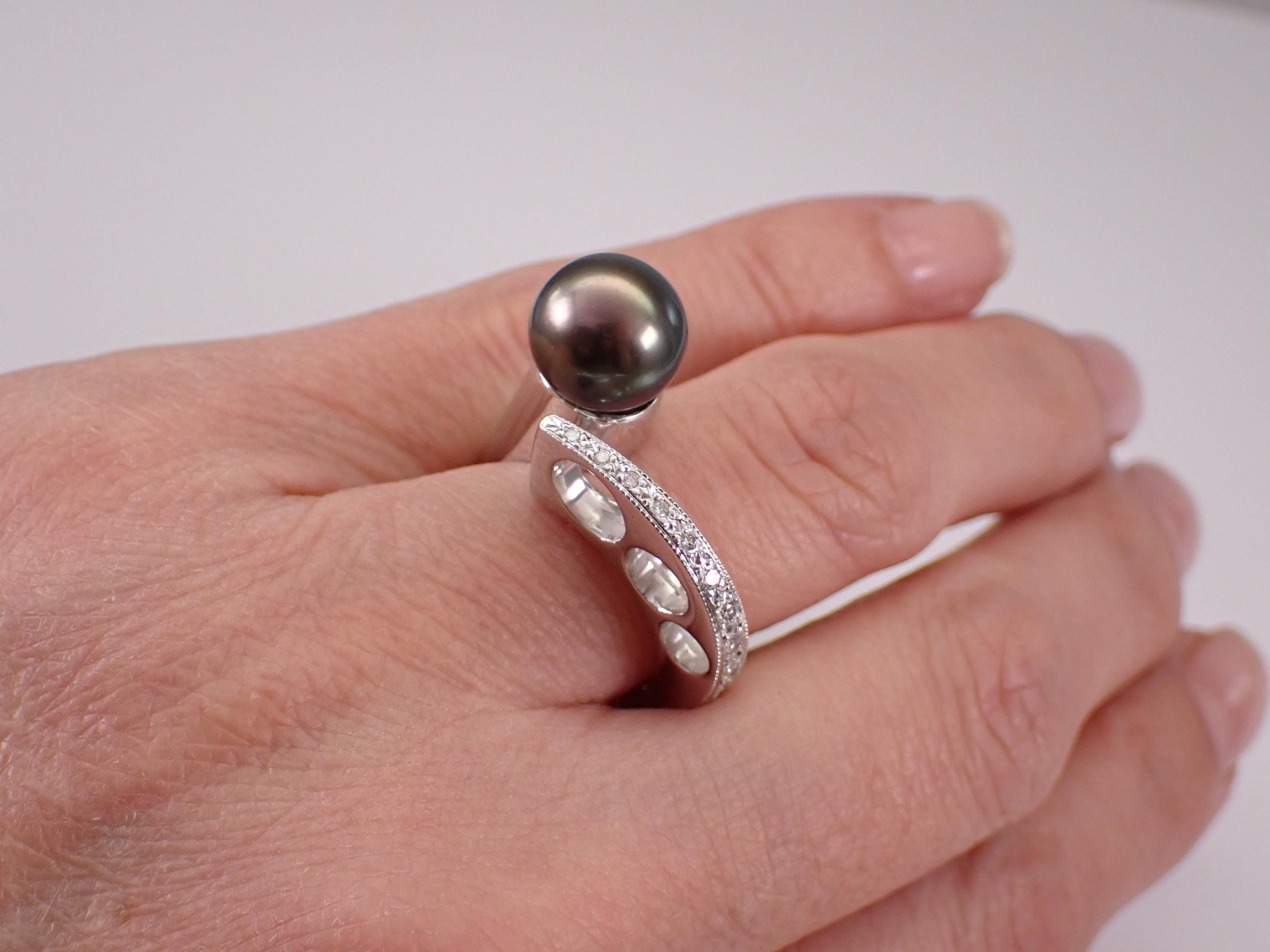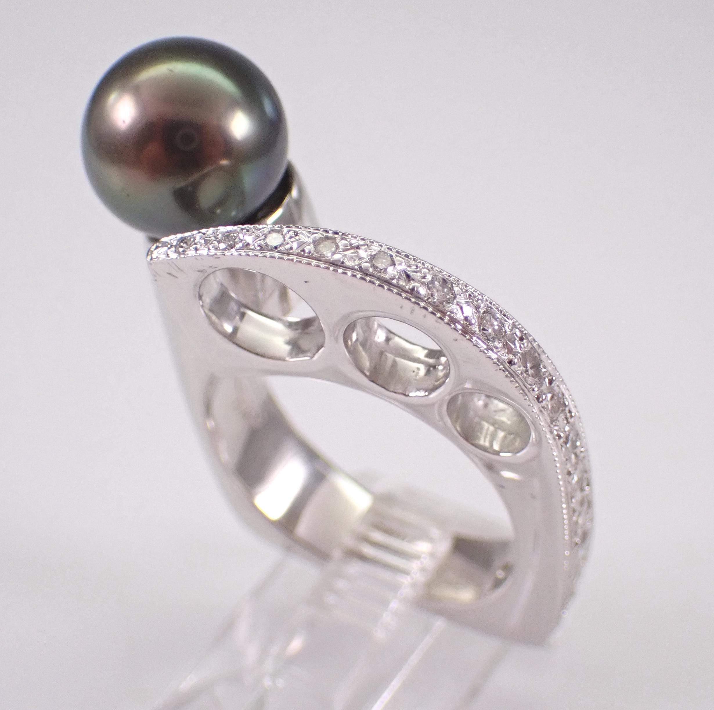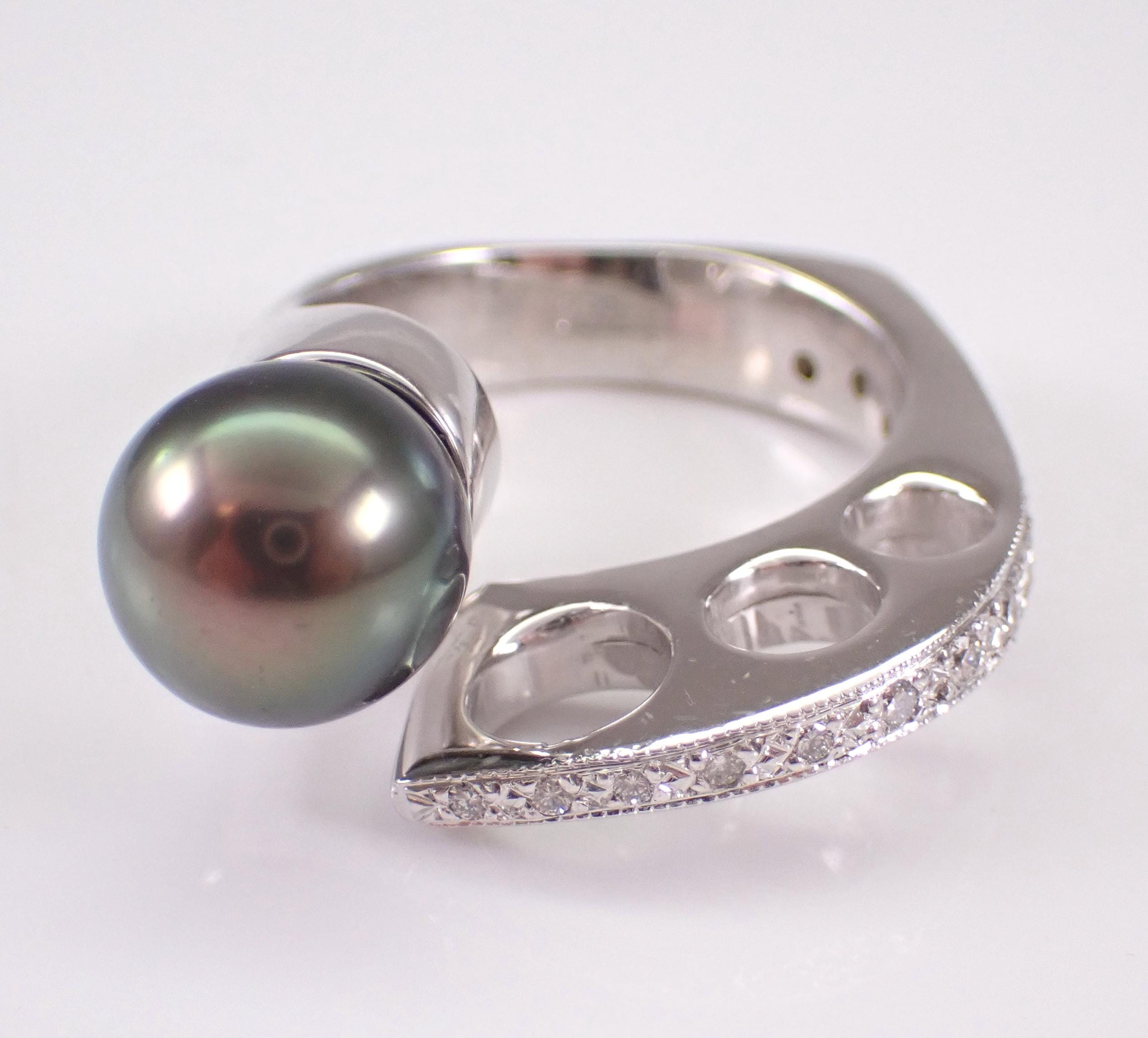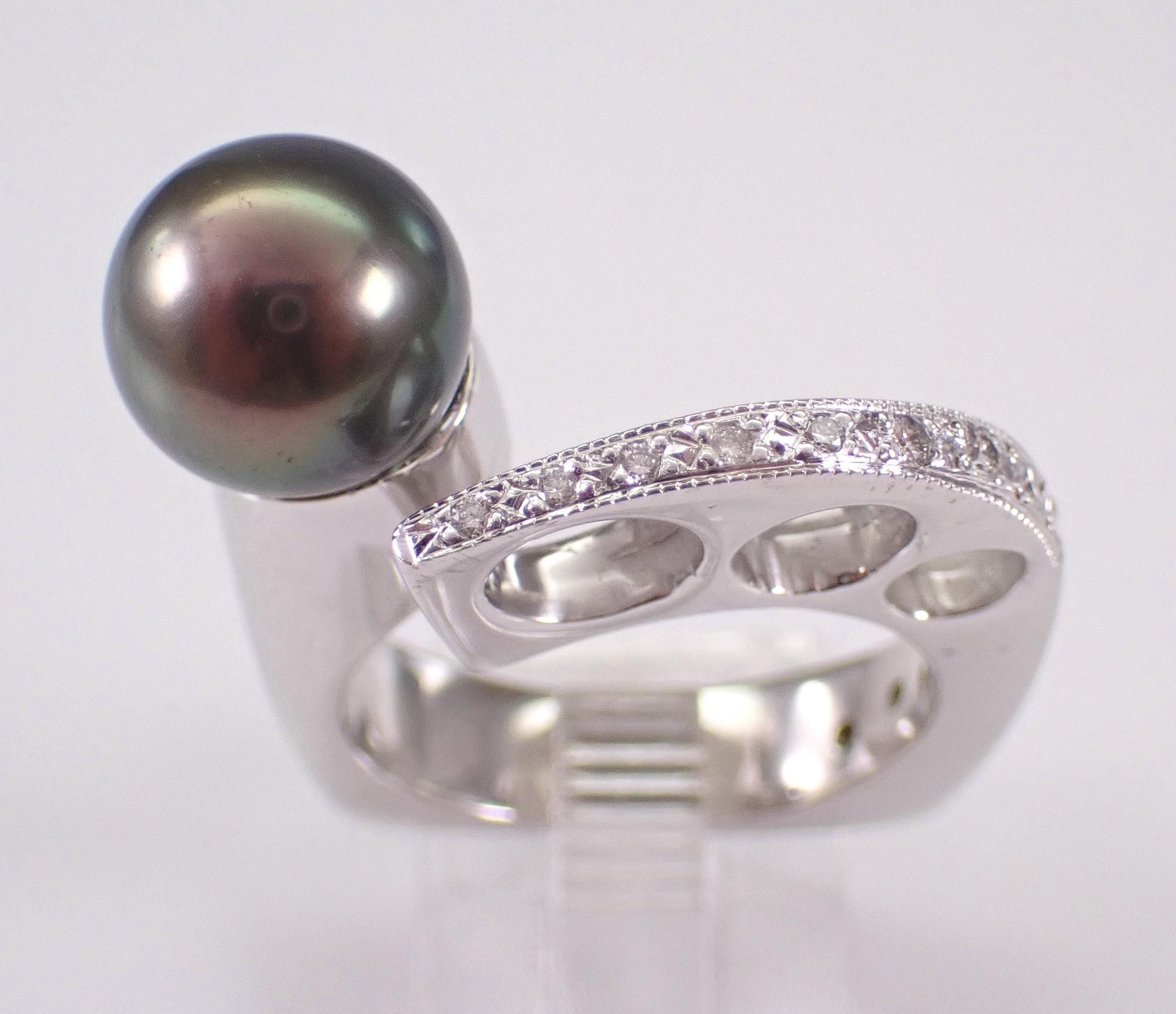 14K White Gold Diamond and Black Pearl Ring. This ring is set with one Black Tahitian Pearl and fifteen Round Brilliant Diamonds. This Pearl measures 10 mm in diameter. The Diamonds are H color, SI1 clarity and weigh a total of .38 carat. This ring is 14KT White Gold, weighs 14.6 grams and is a finger size 7 1/2, can be resized (please inquire about sizing with the finger size that you need). This ring is also accompanied by an appraisal written by a GIA Certified Diamond Grader with the retail replacement value of $6,495.00. I will ship this ring promptly in a beautiful gift box.