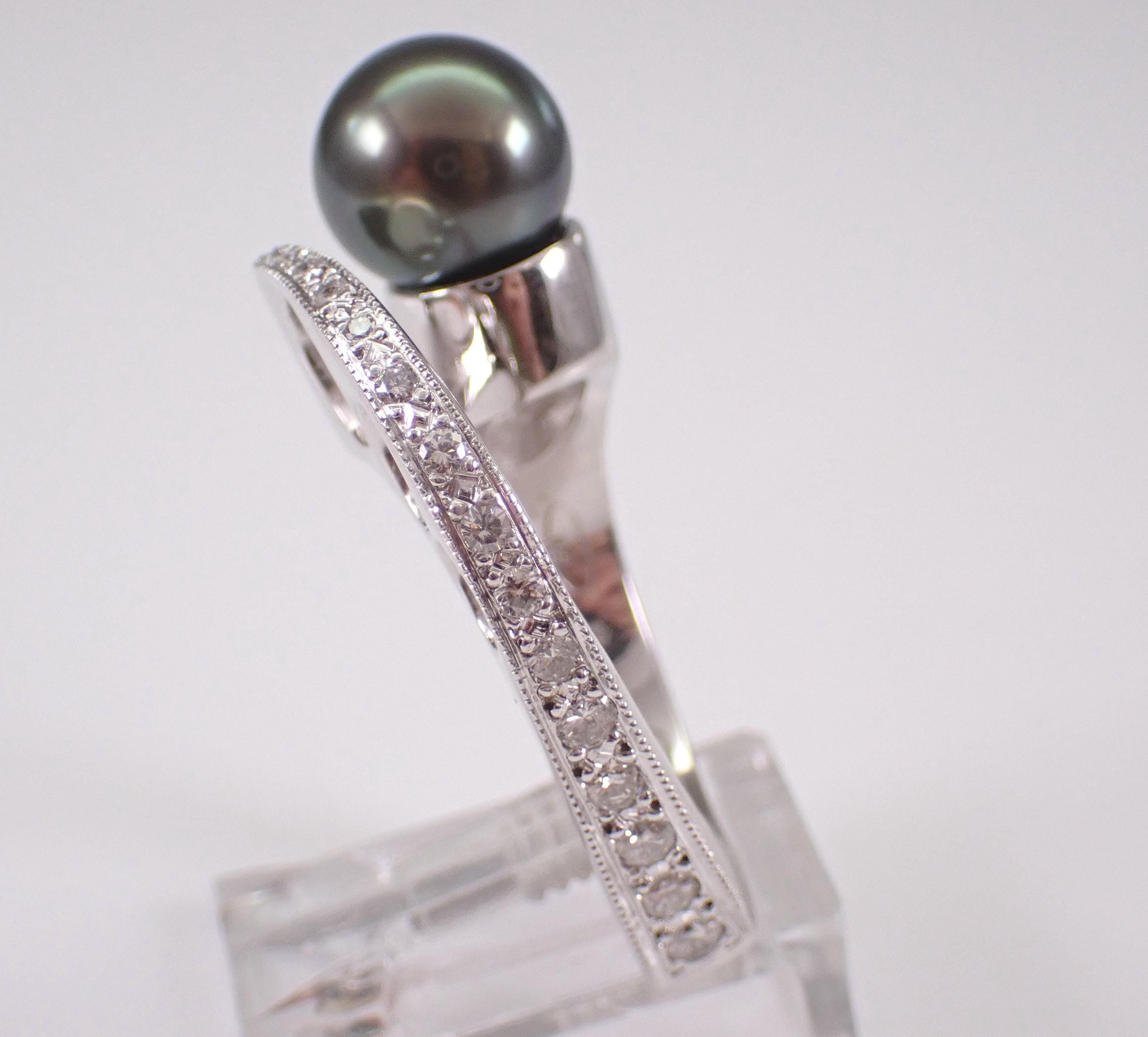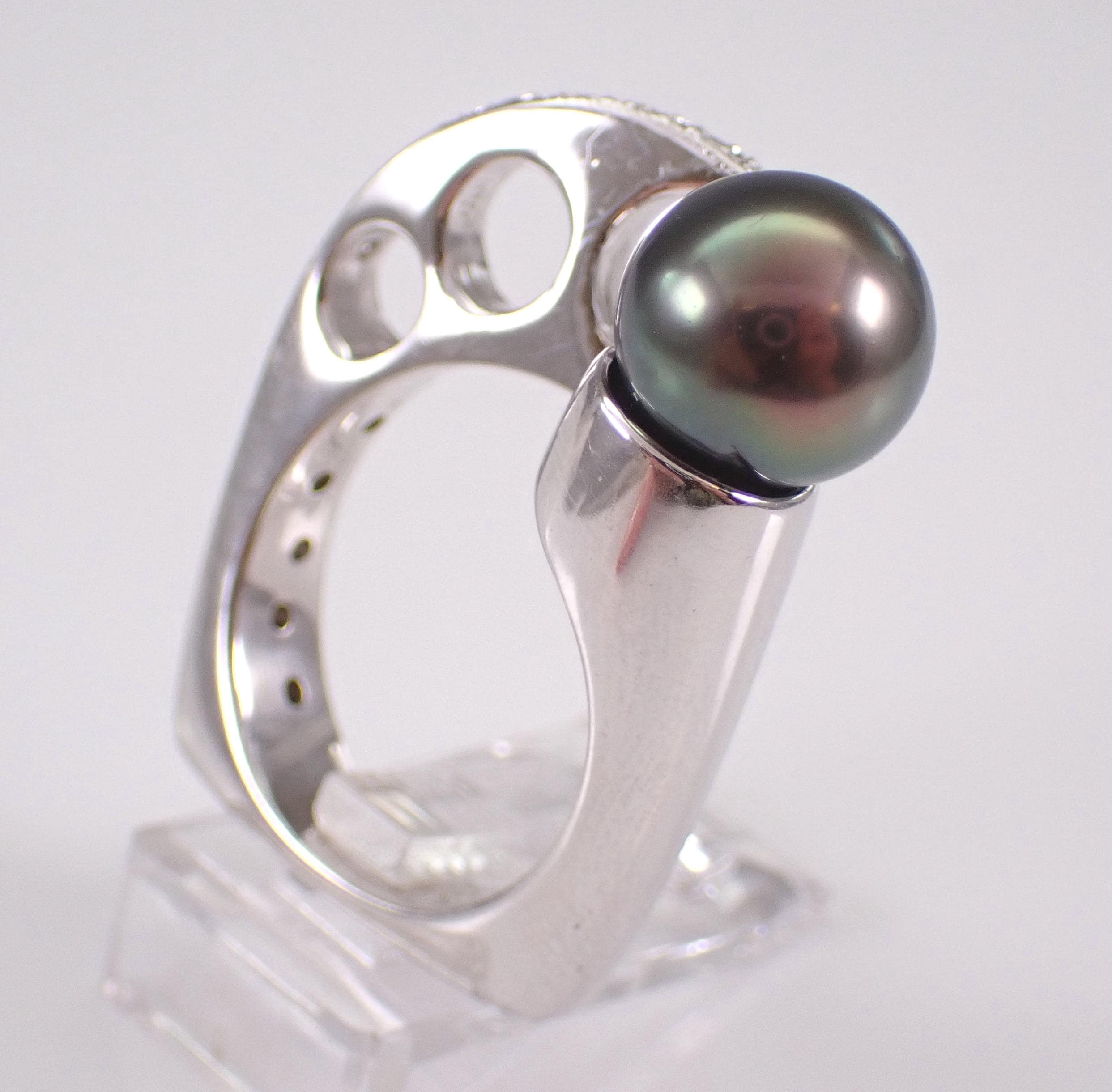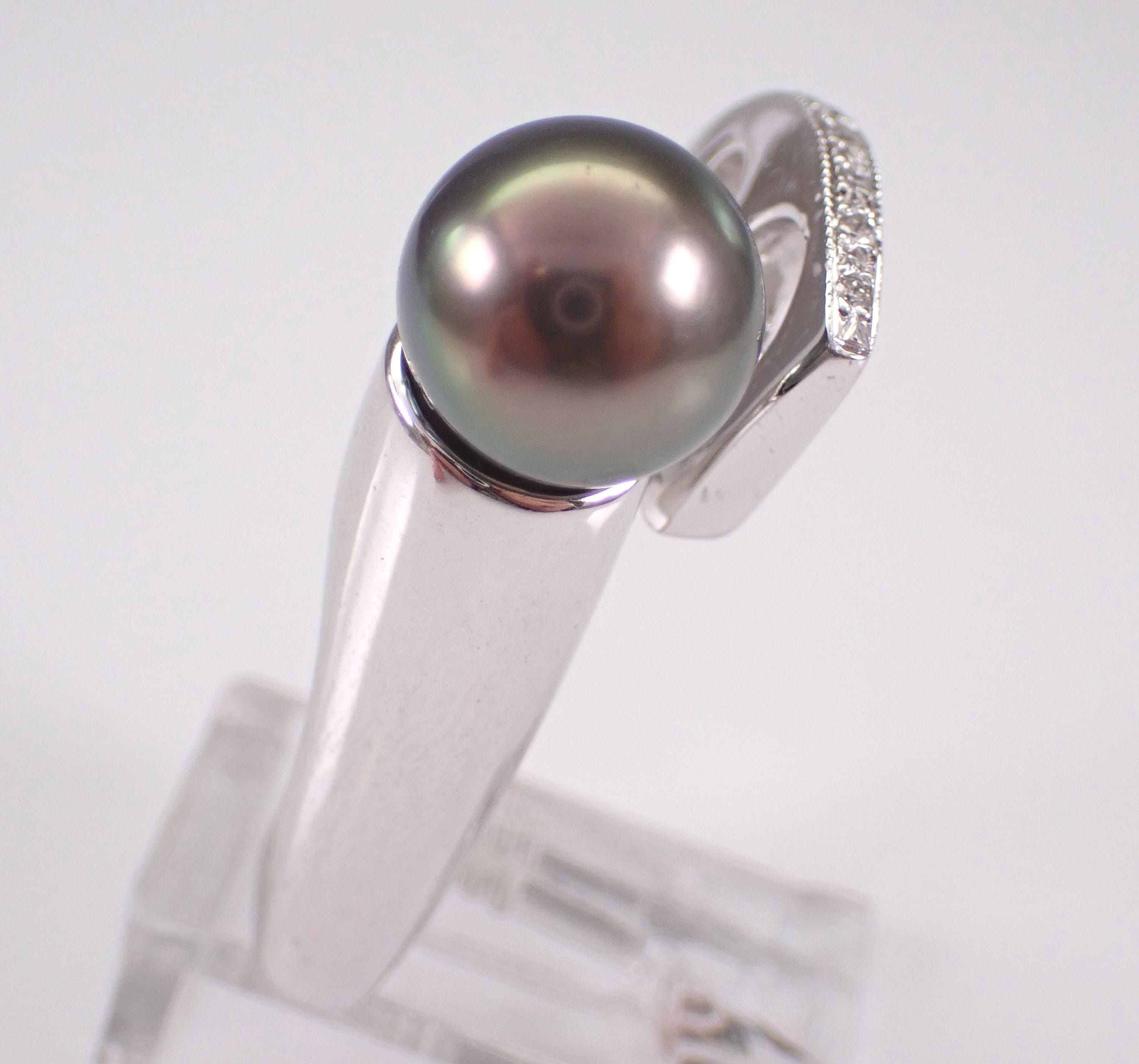 14K White Gold Diamond and Black Pearl Ring. This ring is set with one Black Tahitian Pearl and fifteen Round Brilliant Diamonds. This Pearl measures 10 mm in diameter. The Diamonds are H color, SI1 clarity and weigh a total of .38 carat. This ring is 14KT White Gold, weighs 14.6 grams and is a finger size 7 1/2, can be resized (please inquire about sizing with the finger size that you need). This ring is also accompanied by an appraisal written by a GIA Certified Diamond Grader with the retail replacement value of $6,495.00. I will ship this ring promptly in a beautiful gift box.