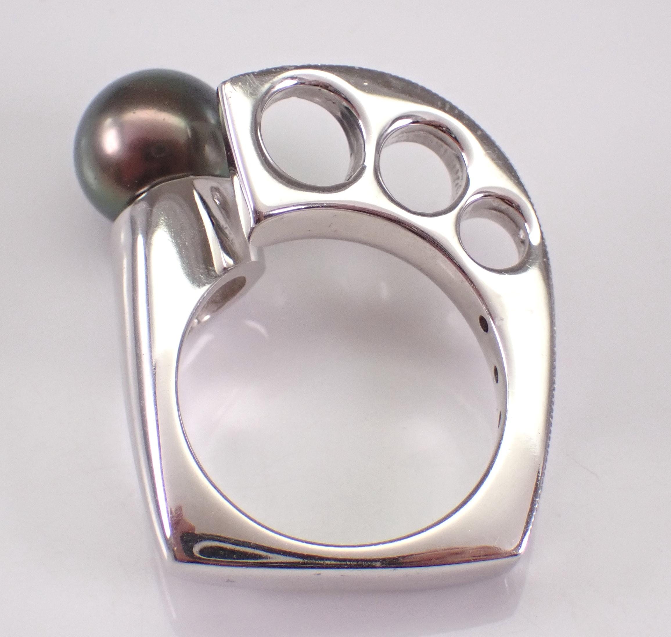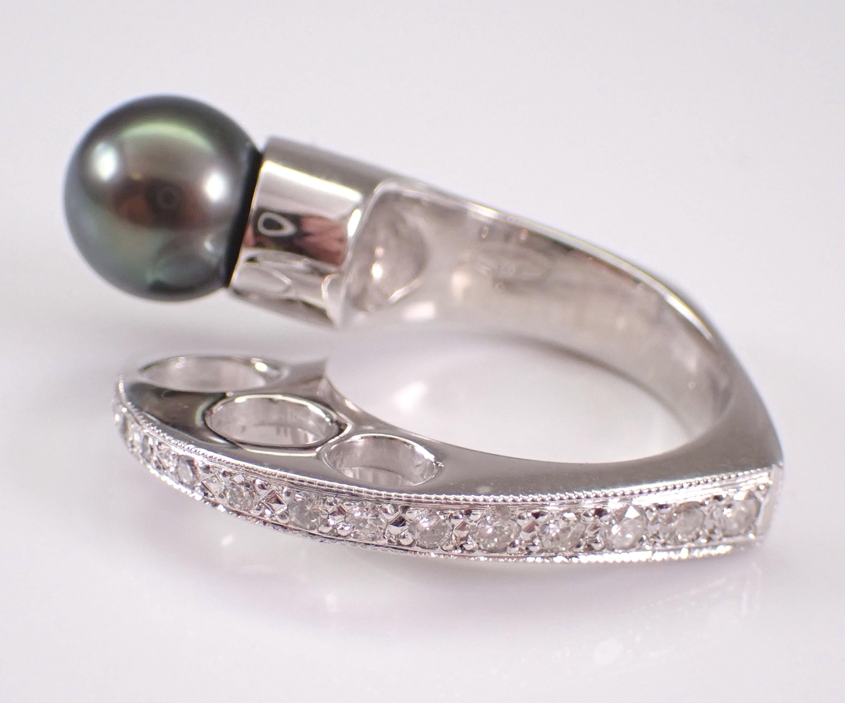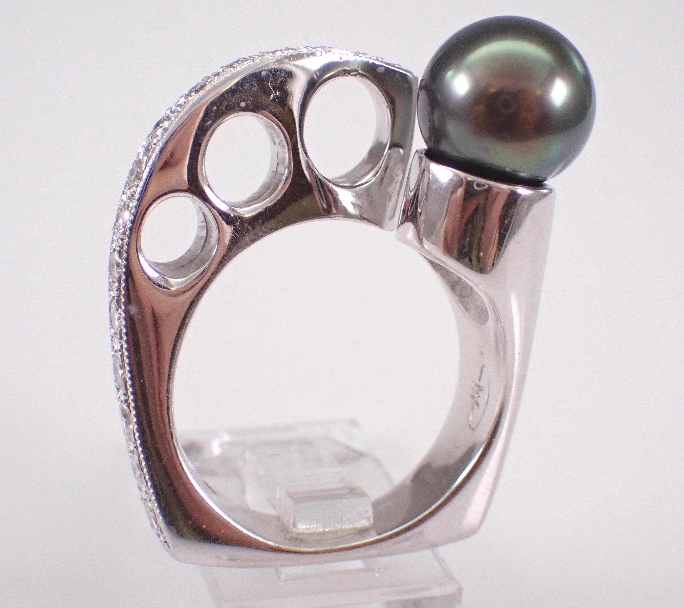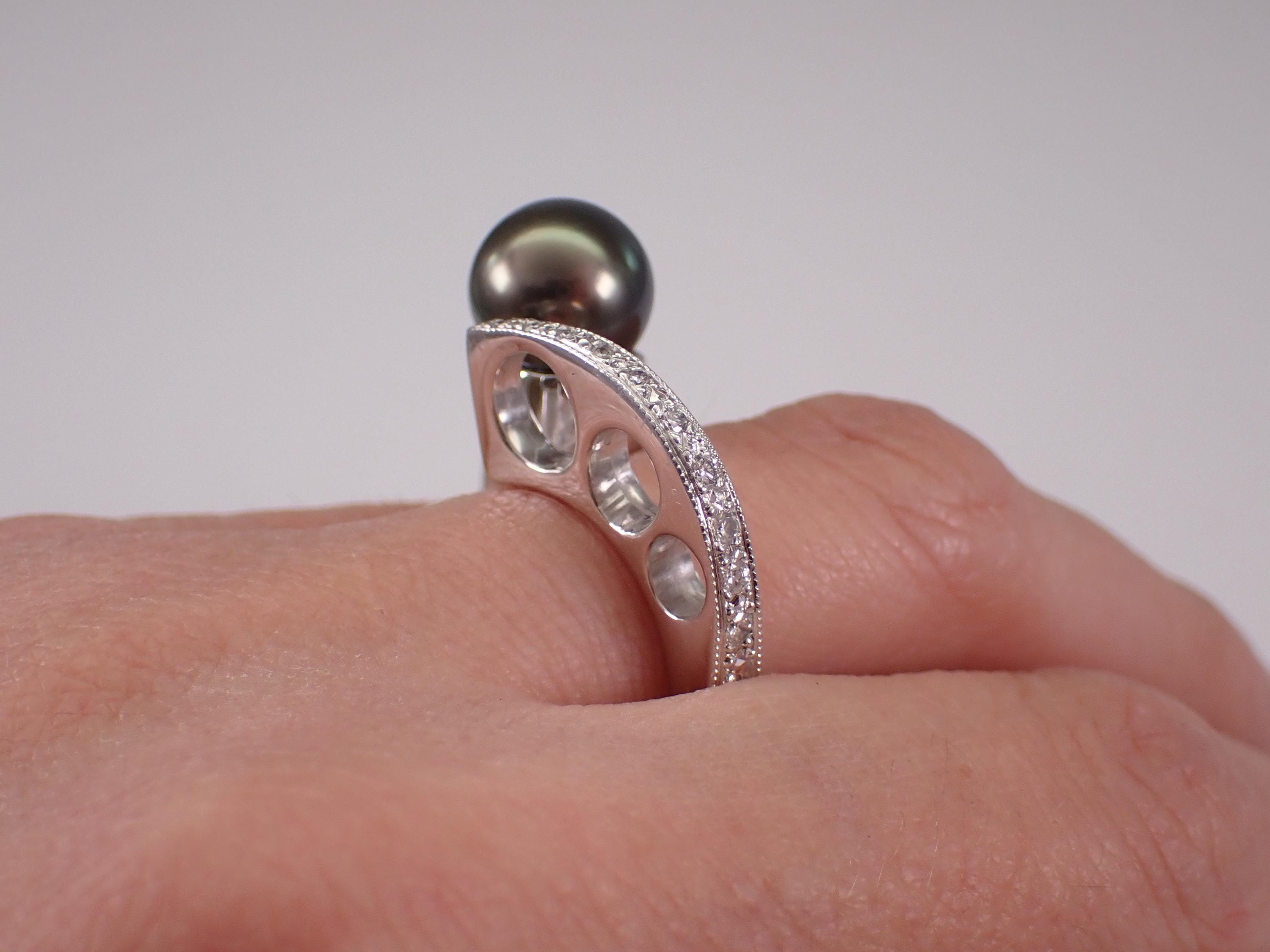 14K White Gold Diamond and Black Pearl Ring. This ring is set with one Black Tahitian Pearl and fifteen Round Brilliant Diamonds. This Pearl measures 10 mm in diameter. The Diamonds are H color, SI1 clarity and weigh a total of .38 carat. This ring is 14KT White Gold, weighs 14.6 grams and is a finger size 7 1/2, can be resized (please inquire about sizing with the finger size that you need). This ring is also accompanied by an appraisal written by a GIA Certified Diamond Grader with the retail replacement value of $6,495.00. I will ship this ring promptly in a beautiful gift box.