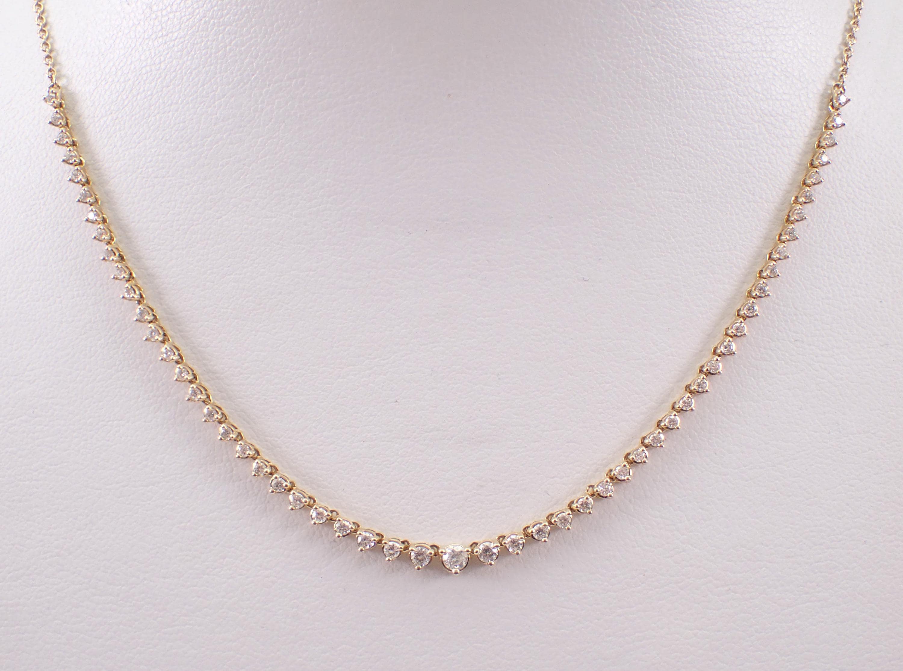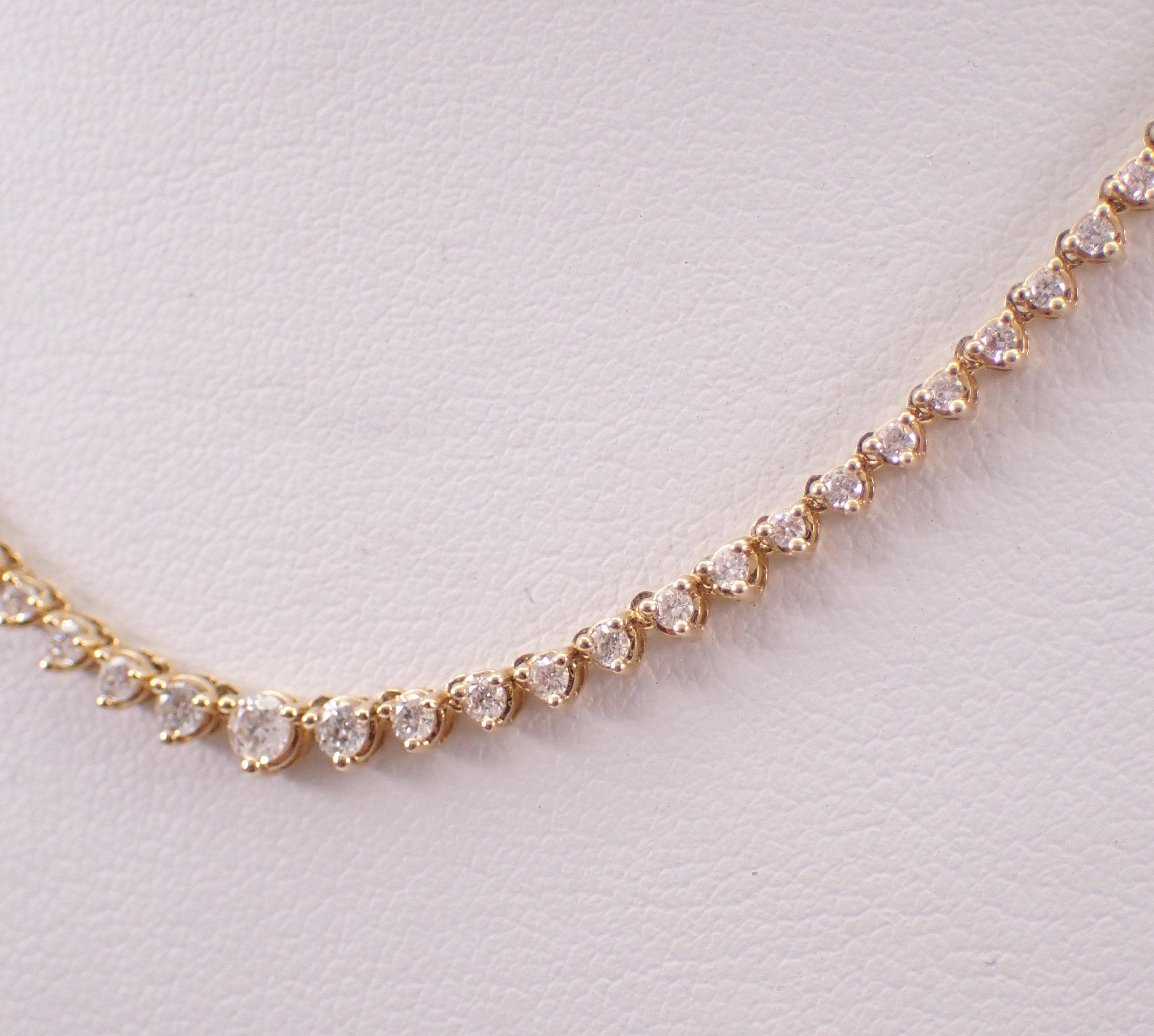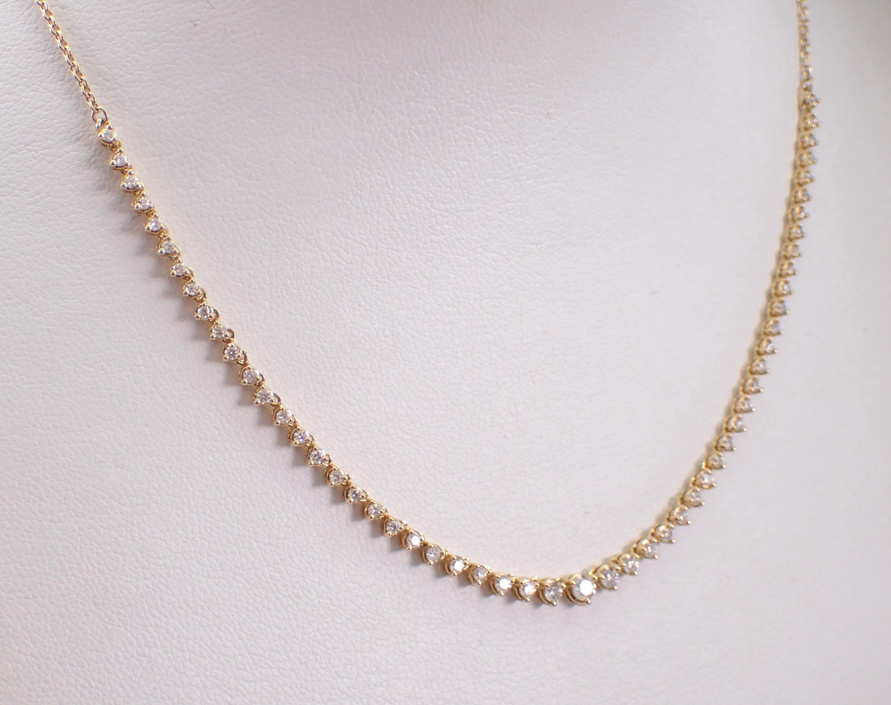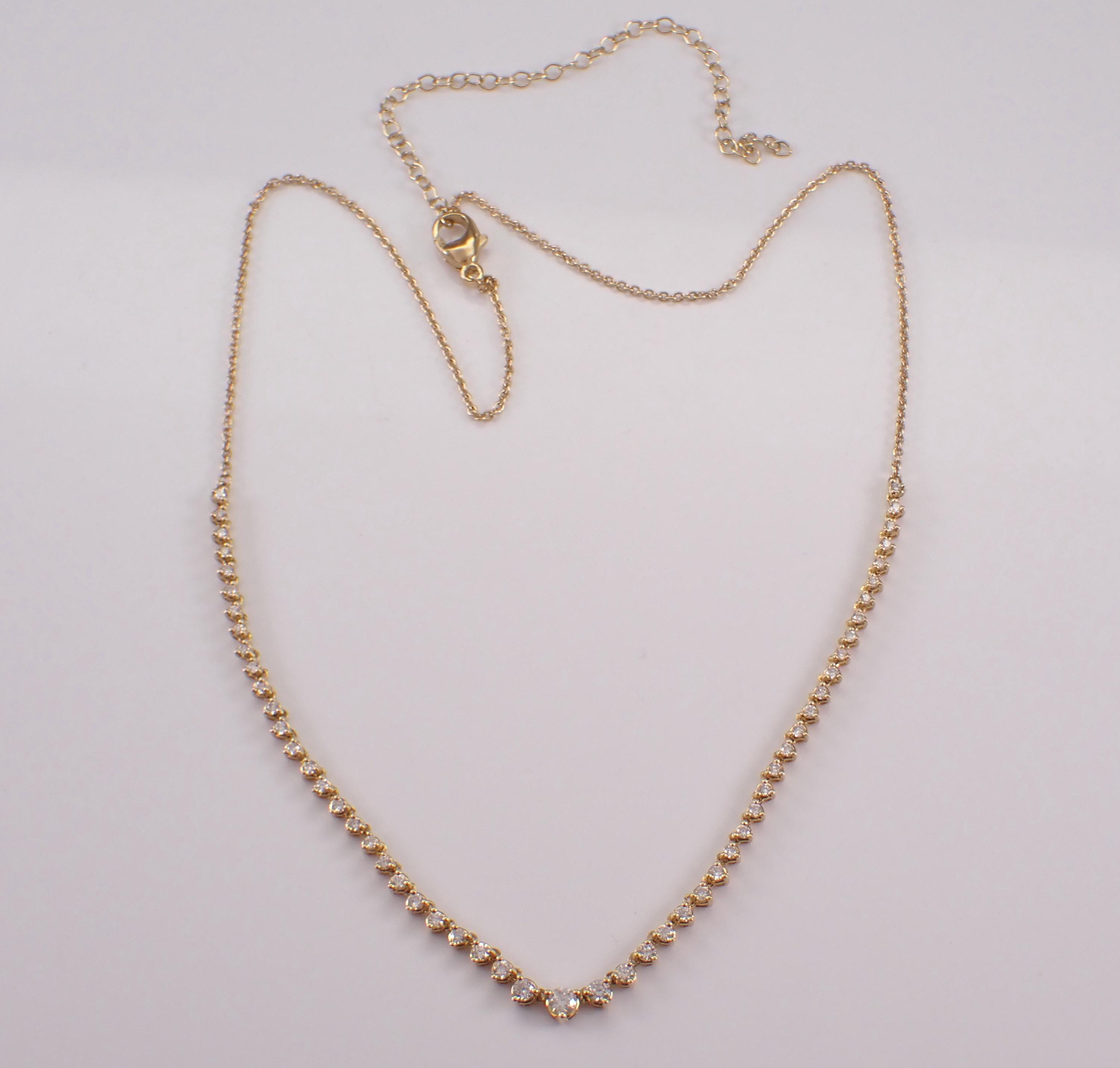14K Yellow Gold Diamond Tennis Necklace. This necklace is set with fifty-five genuine natural Round Brilliant Diamonds. These diamonds are G color, SI1 clarity and weigh a total of 1.01 carat. This necklace is 14KT Yellow Gold and measures 18" in length with a 4" adjustment available for a total length option of 22". This necklace weighs 6.5 grams and will be accompanied by an appraisal by a GIA Certified Diamond Grader with the replacement value of $4,785.00. I will ship this pin promptly in a beautiful gift box.
