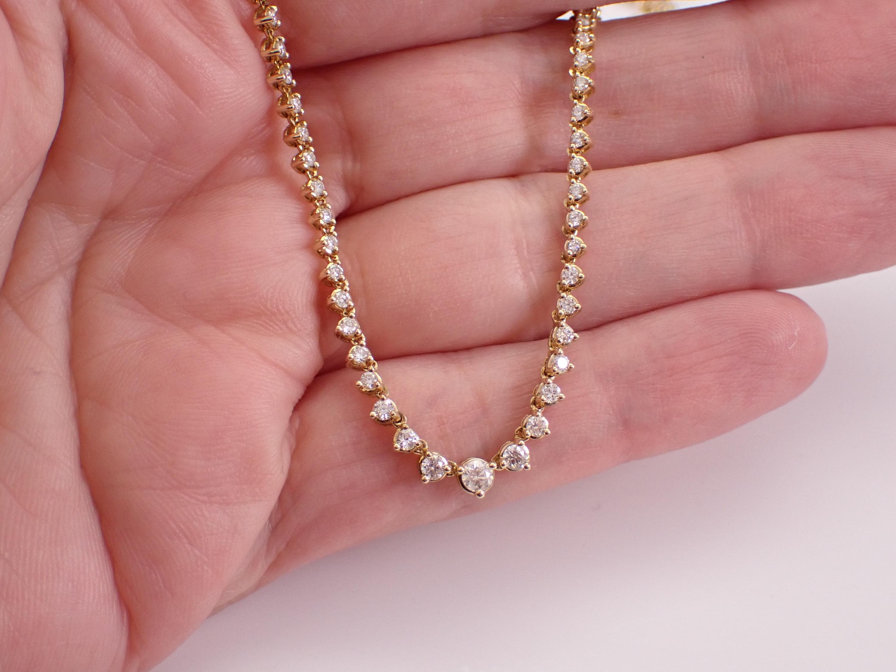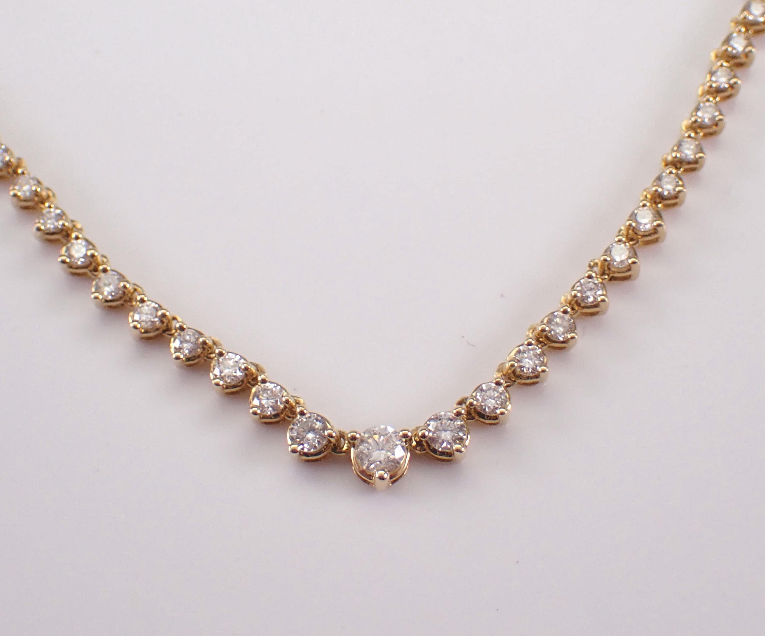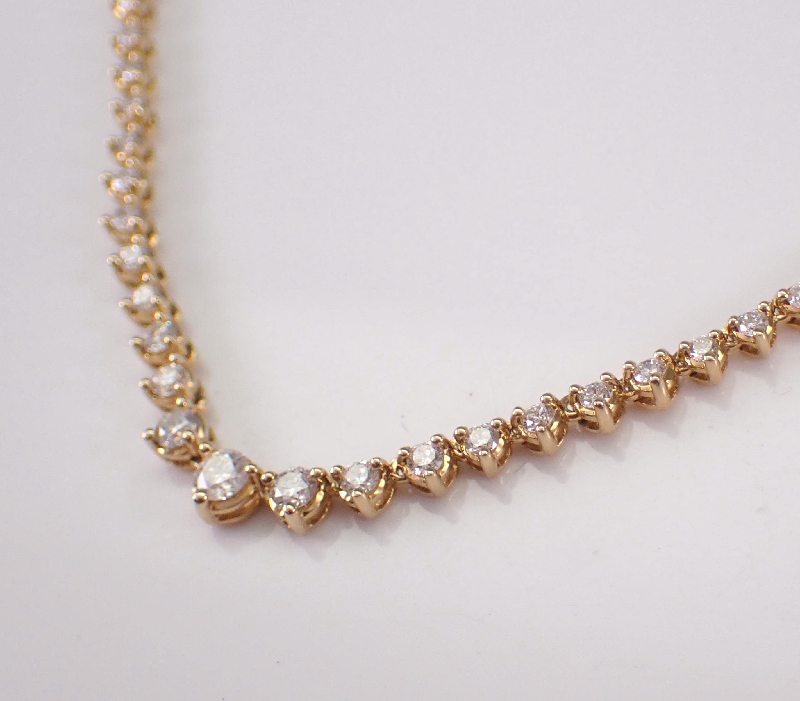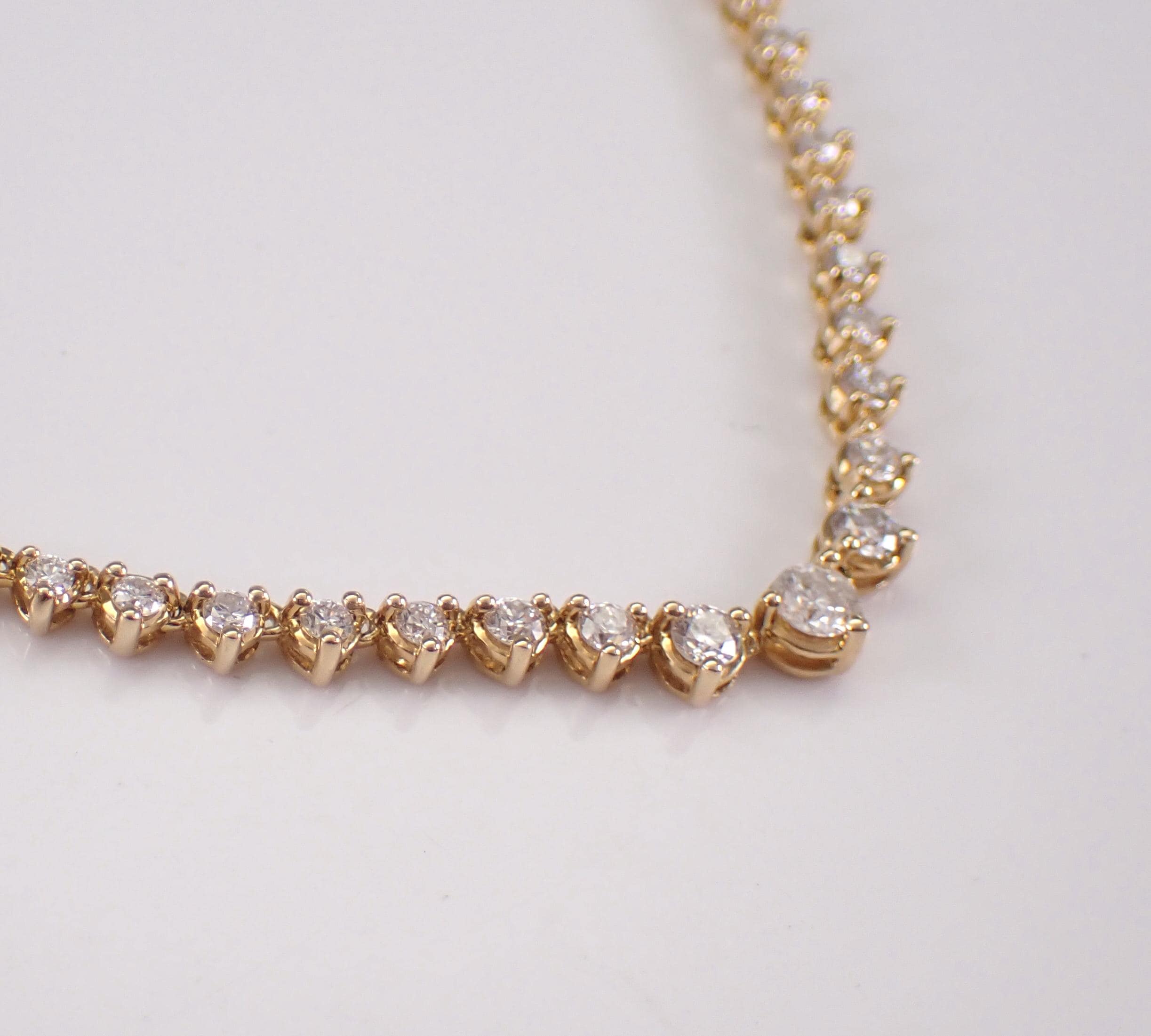 14K Yellow Gold Diamond Tennis Necklace. This necklace is set with fifty-five genuine natural Round Brilliant Diamonds. These diamonds are G color, SI1 clarity and weigh a total of 1.01 carat. This necklace is 14KT Yellow Gold and measures 18" in length with a 4" adjustment available for a total length option of 22". This necklace weighs 6.5 grams and will be accompanied by an appraisal by a GIA Certified Diamond Grader with the replacement value of $4,785.00. I will ship this pin promptly in a beautiful gift box.