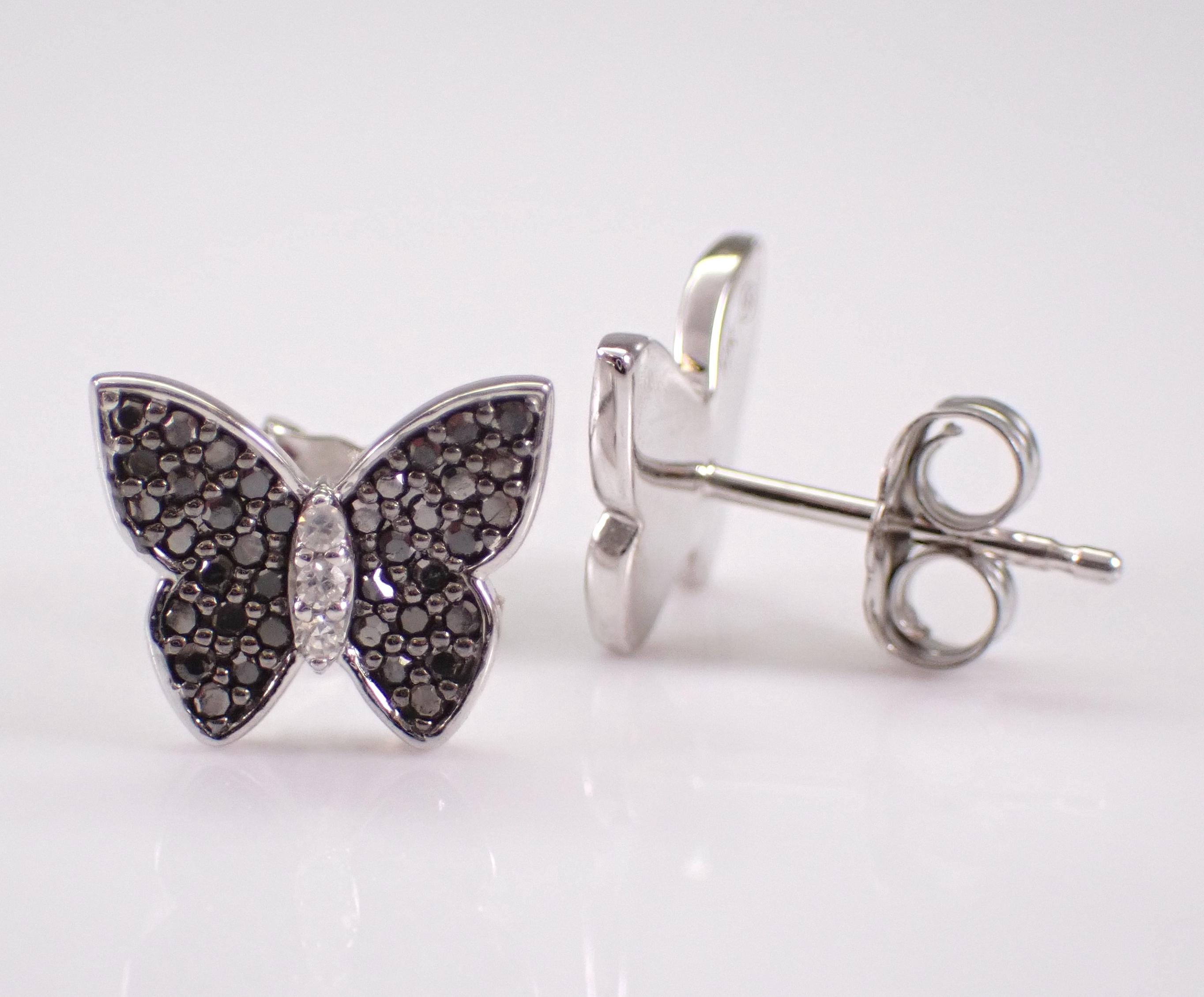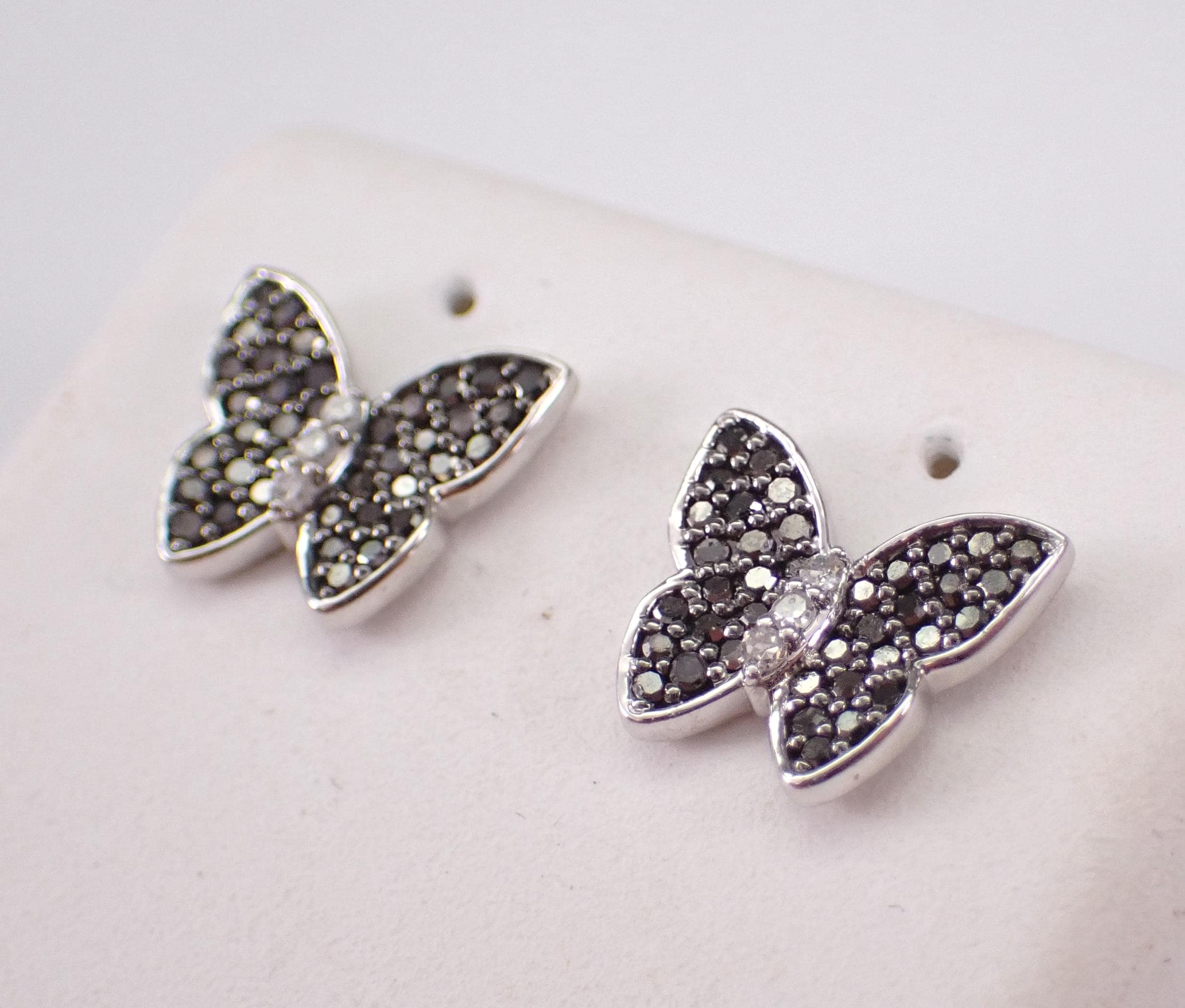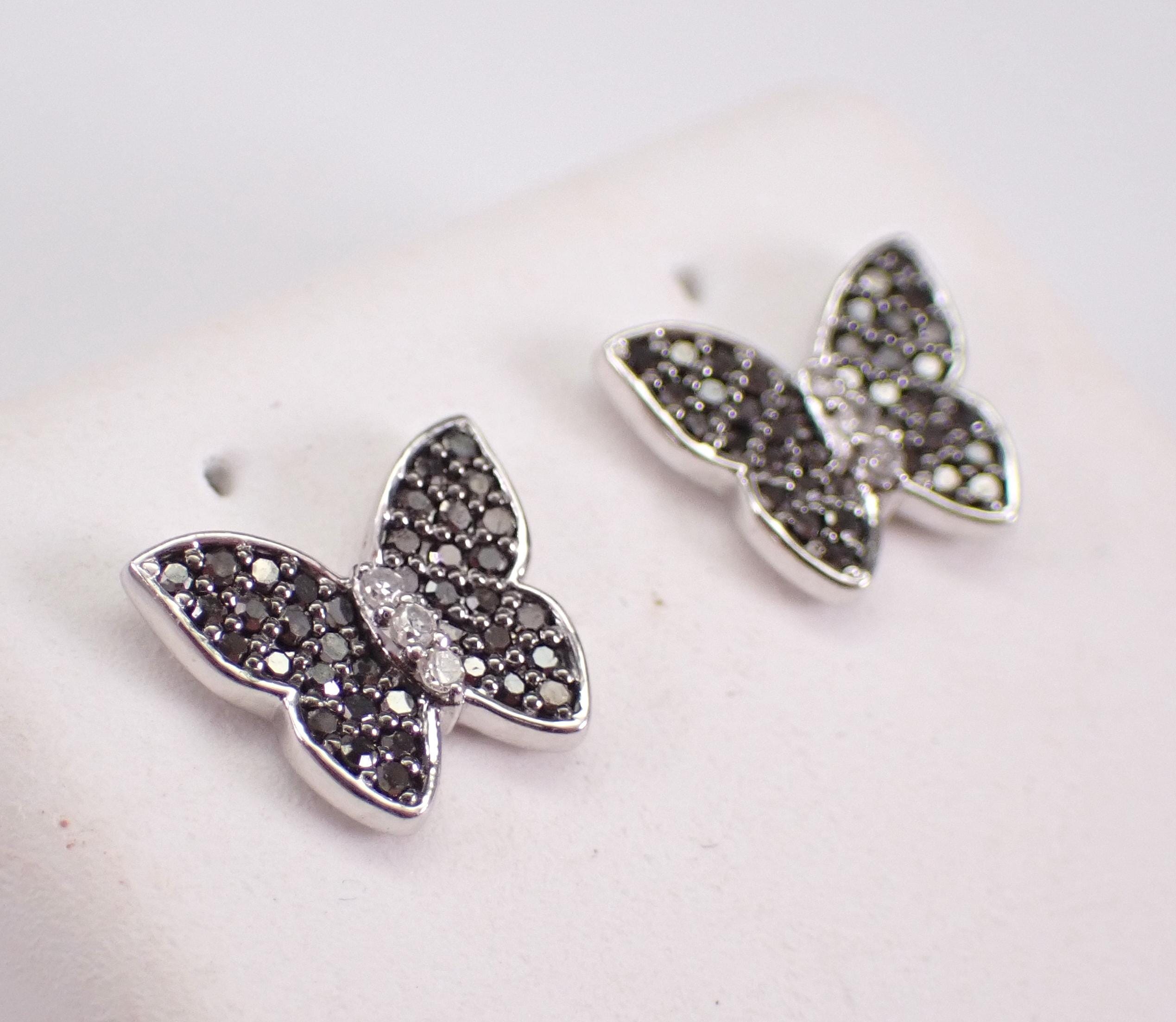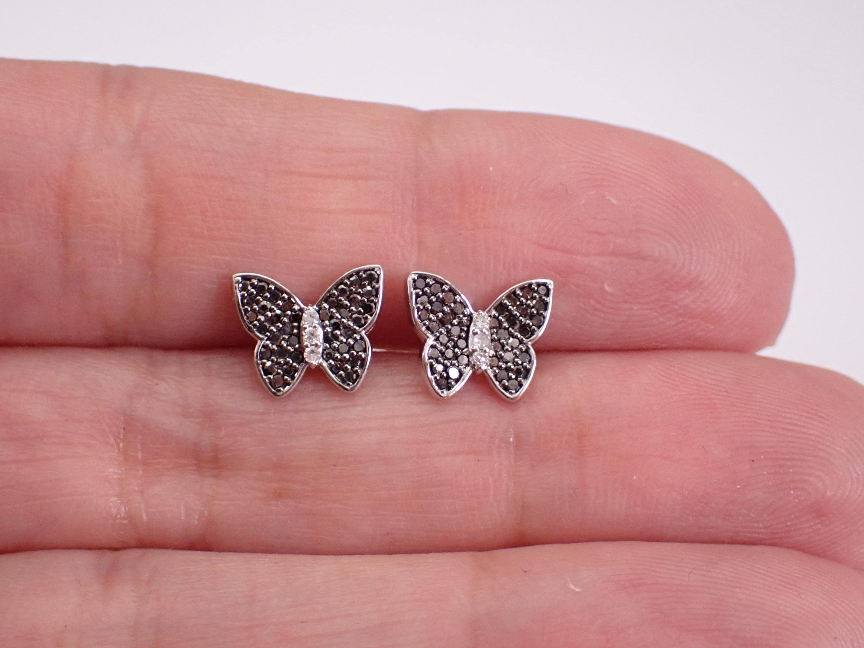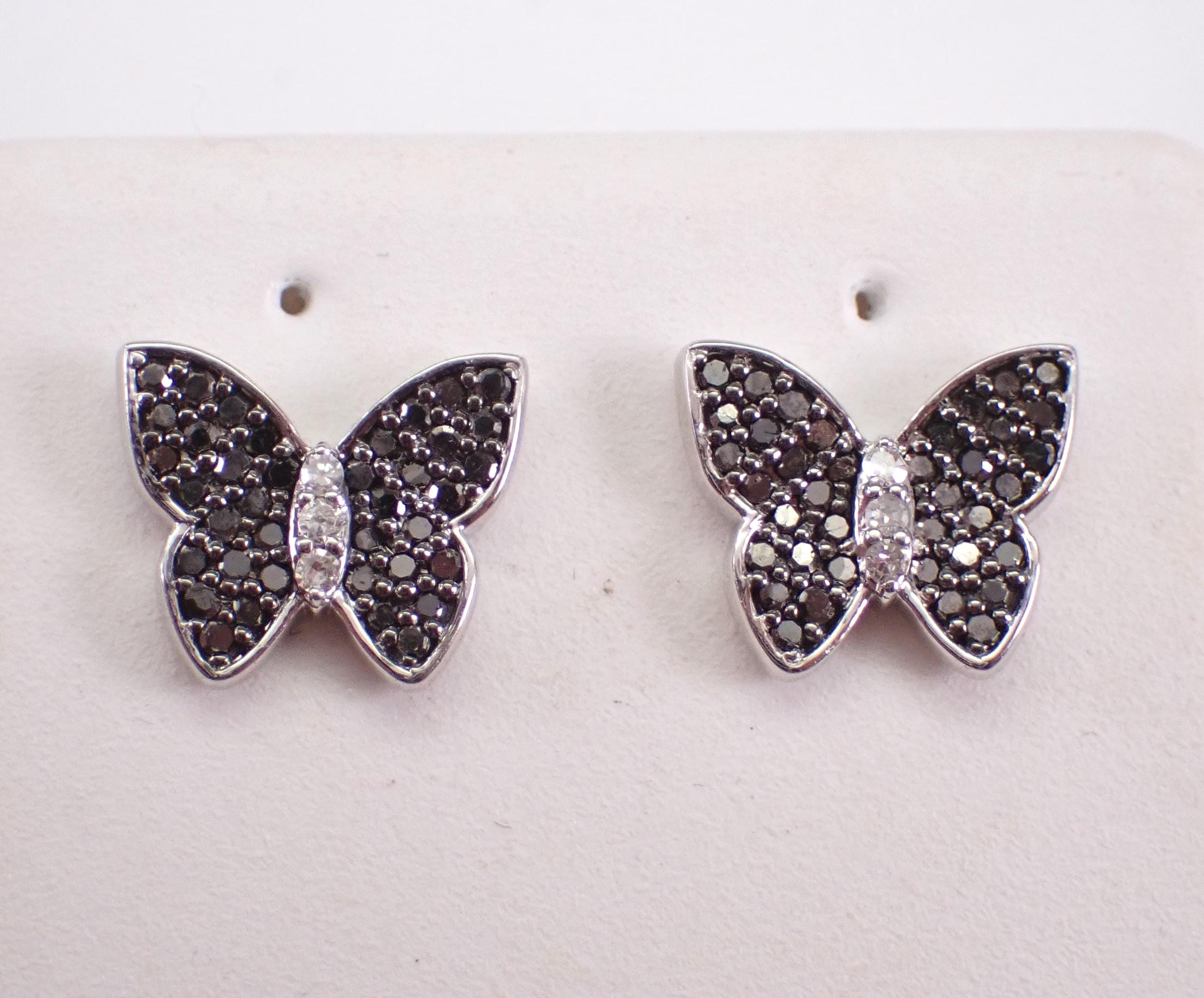 White Gold Black Diamond Butterfly Stud Earrings. These earrings are set with thirty-six genuine Round Black Diamonds and three natural colorless Round Brilliant Diamonds in EACH earring. These Diamonds are H color (white), SI/I1 clarity and amount to a total weight of 1/4 carat. These earrings are 10K White Gold, weigh 1.4 grams and measure 9 X 8 mm. These earrings are for pierced ears and the earrings have secure friction post backings. These earrings will be accompanied by an appraisal written by a GIA Certified Diamond Grader with the retail replacement value of $1,085.00. I will ship these earrings promptly in a gift box.
