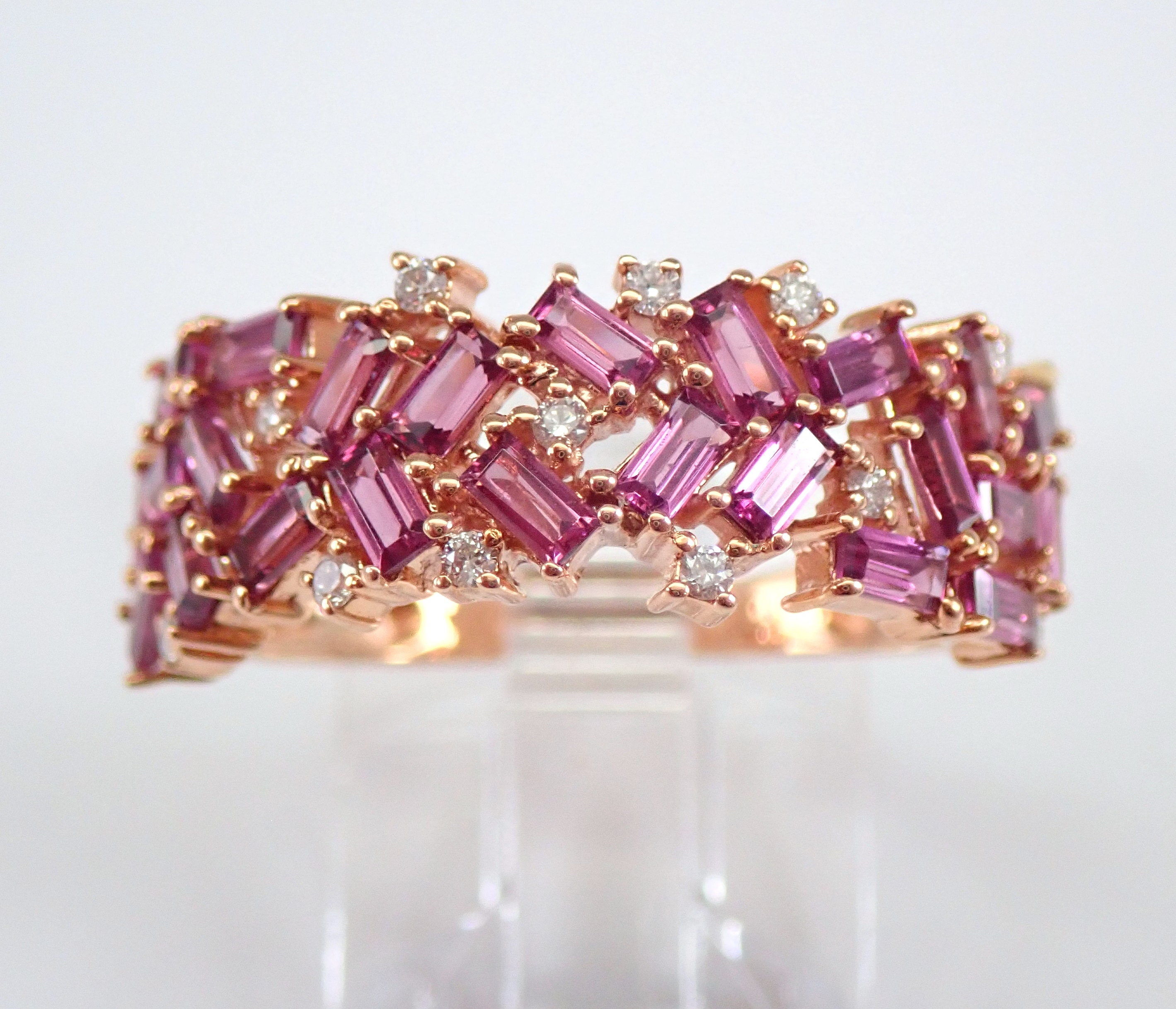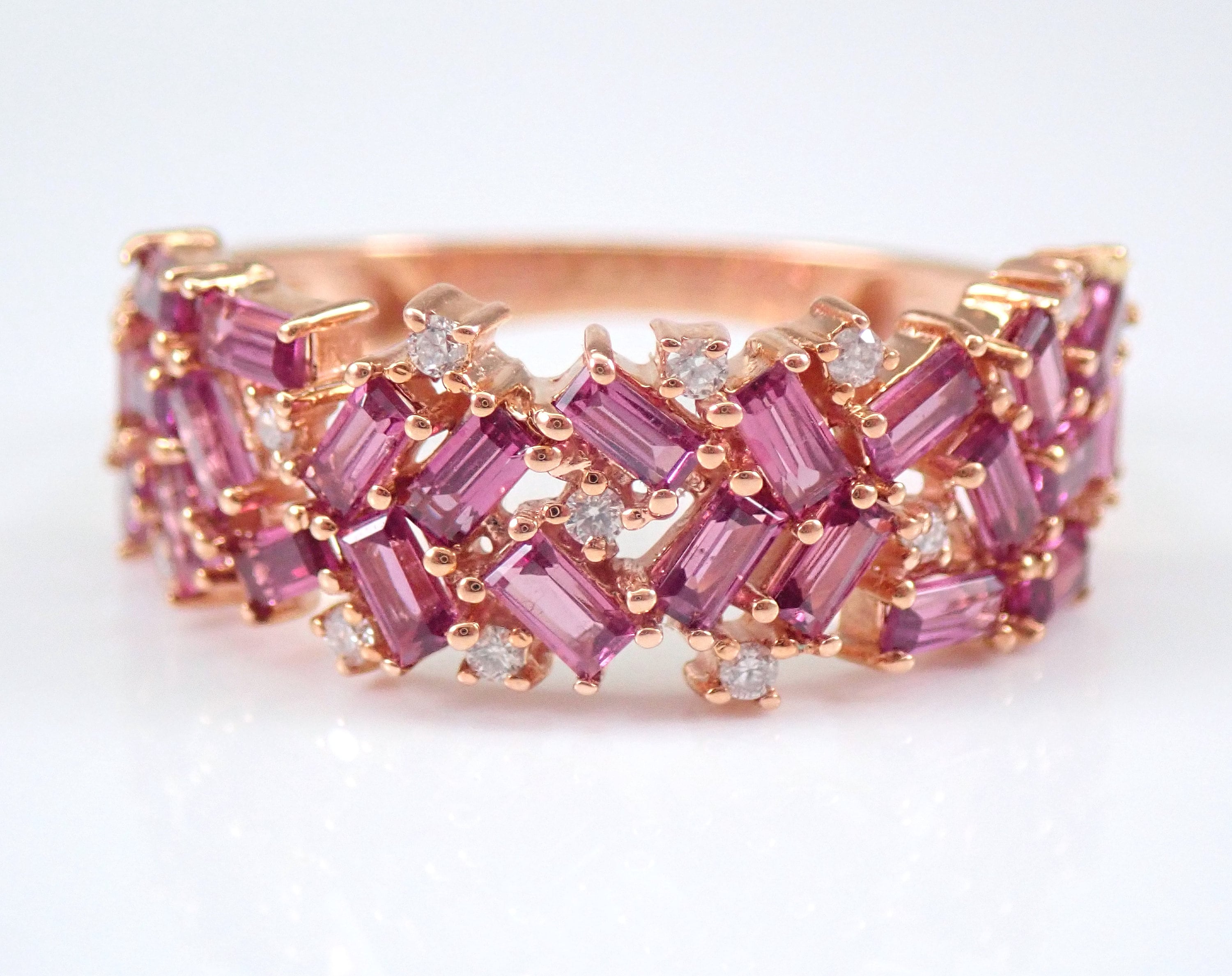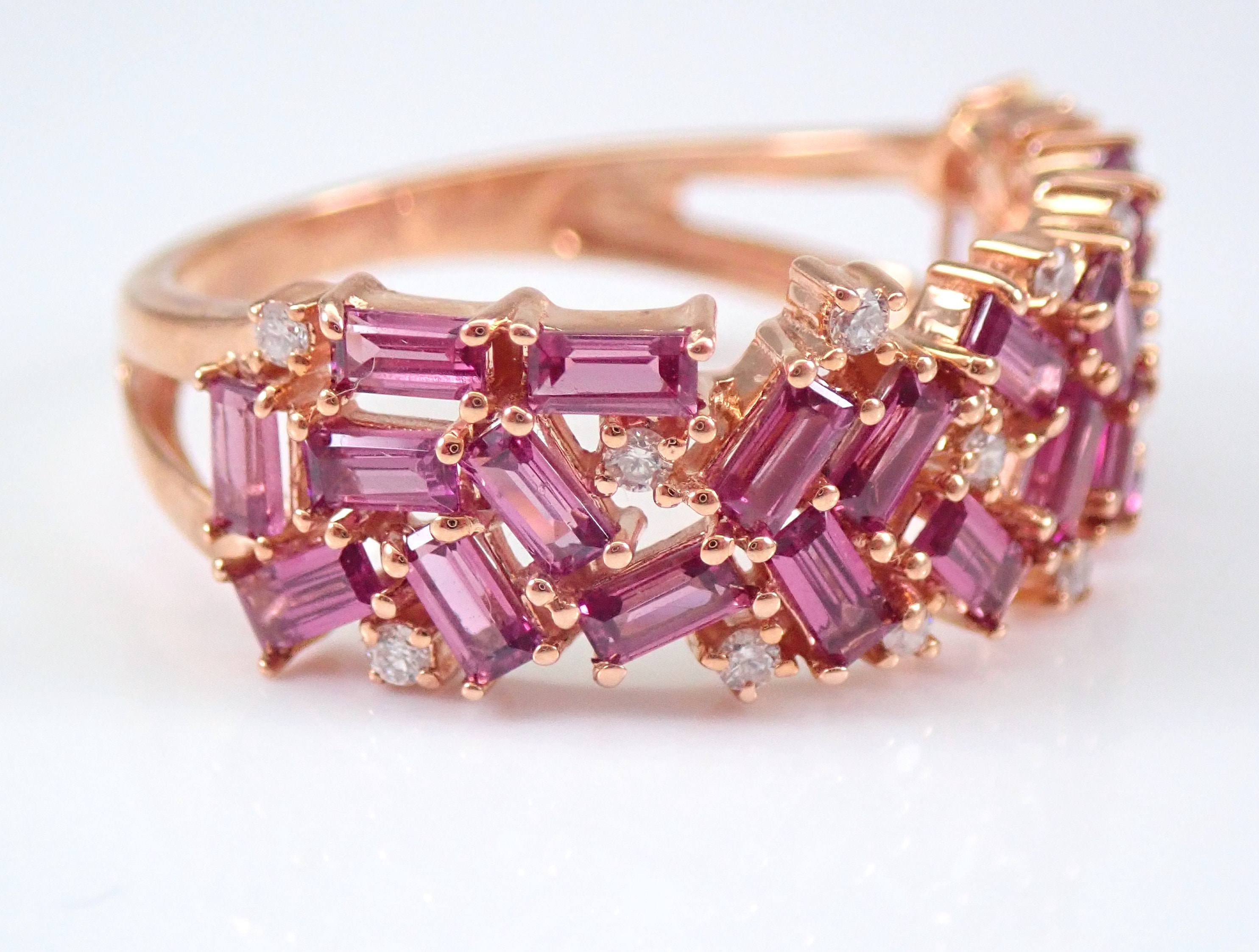 Rose Gold Diamond and Rhodolite Garnet Cluster Ring Anniversary Band. This ring is set twenty-four Baguette Rhodolite Garnets and thirteen Round Brilliant Diamonds. These Garnets are 100% genuine, have a gorgeous berry color and weigh a total of .75 carat. The diamonds in this ring are H color, SI/I clarity and weigh a total of .12 carat. This ring is 10KT Rose Gold, measures 8 mm in width, weighs 2.9 grams and is a finger size 7 1/4, which can be resized (please inquire about sizing with the finger size you need). This ring will be accompanied by an appraisal by a GIA Certified Diamond Grader with the retail replacement value of $1,495.00. I will ship this ring promptly in a gift box.