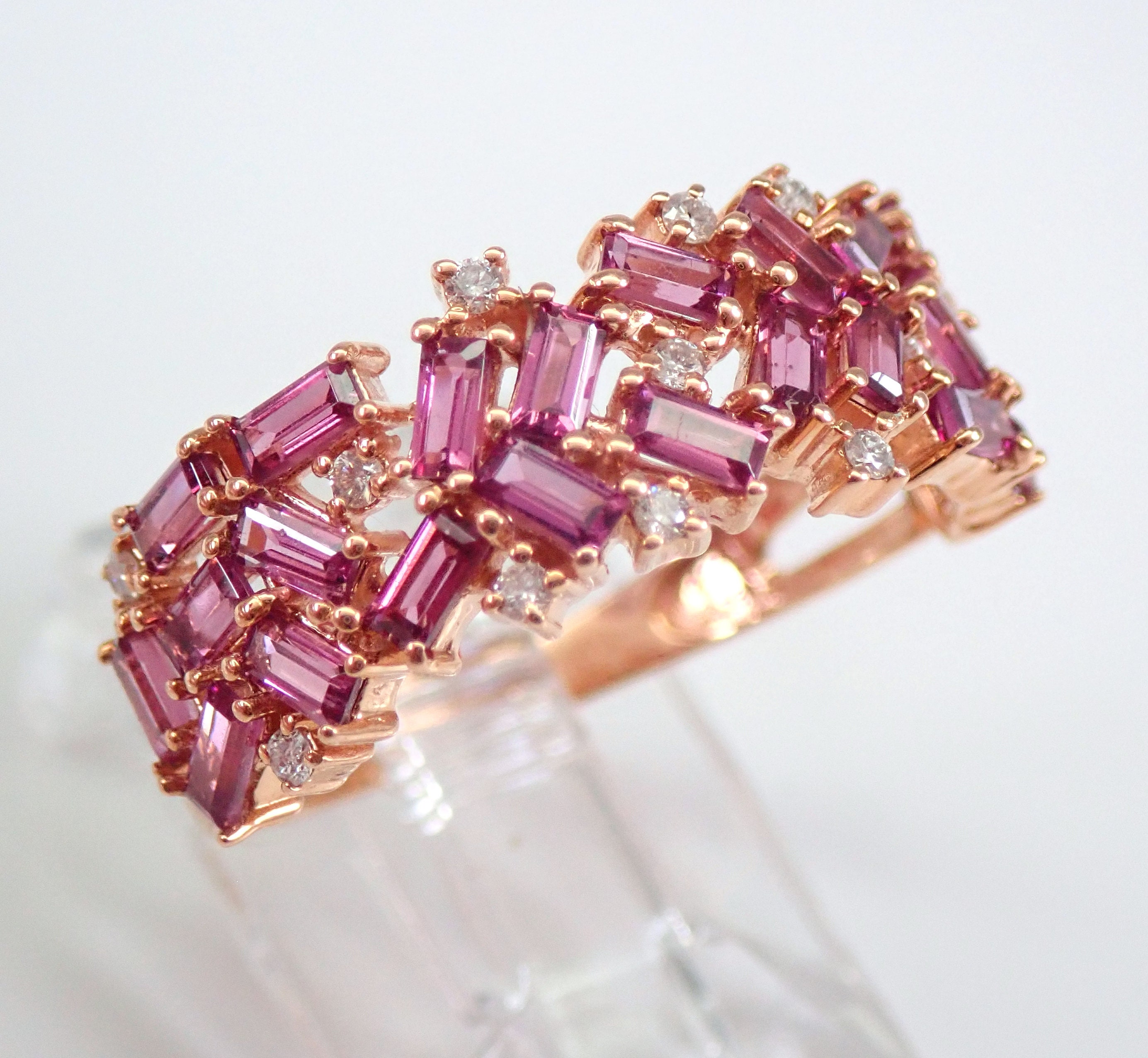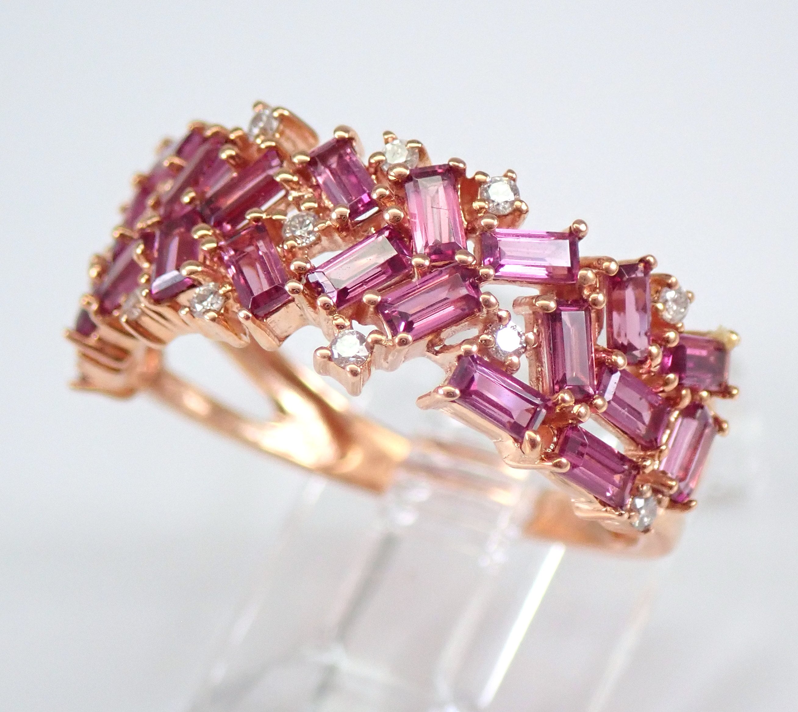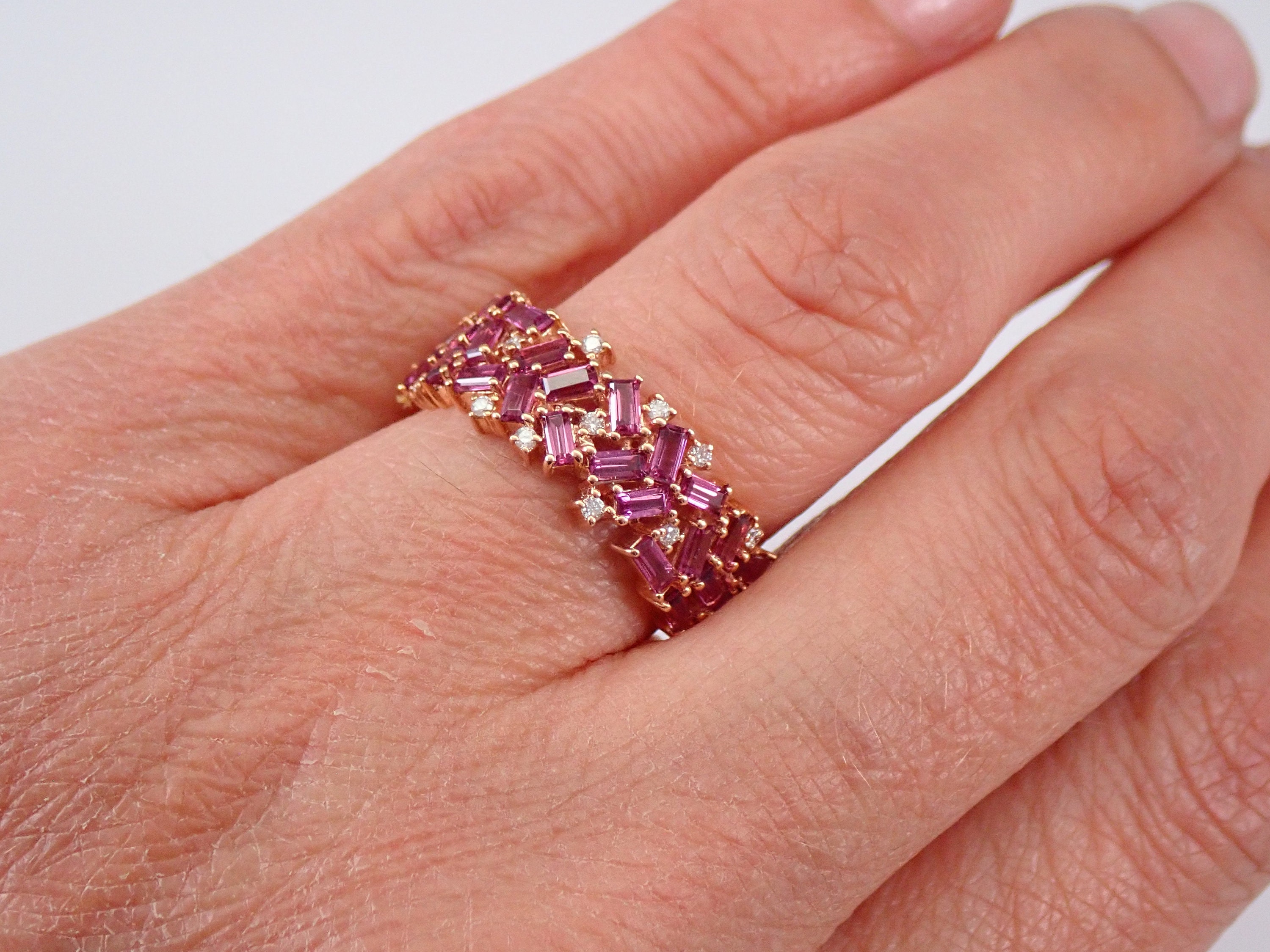 Rose Gold Diamond and Rhodolite Garnet Cluster Ring Anniversary Band. This ring is set twenty-four Baguette Rhodolite Garnets and thirteen Round Brilliant Diamonds. These Garnets are 100% genuine, have a gorgeous berry color and weigh a total of .75 carat. The diamonds in this ring are H color, SI/I clarity and weigh a total of .12 carat. This ring is 10KT Rose Gold, measures 8 mm in width, weighs 2.9 grams and is a finger size 7 1/4, which can be resized (please inquire about sizing with the finger size you need). This ring will be accompanied by an appraisal by a GIA Certified Diamond Grader with the retail replacement value of $1,495.00. I will ship this ring promptly in a gift box.