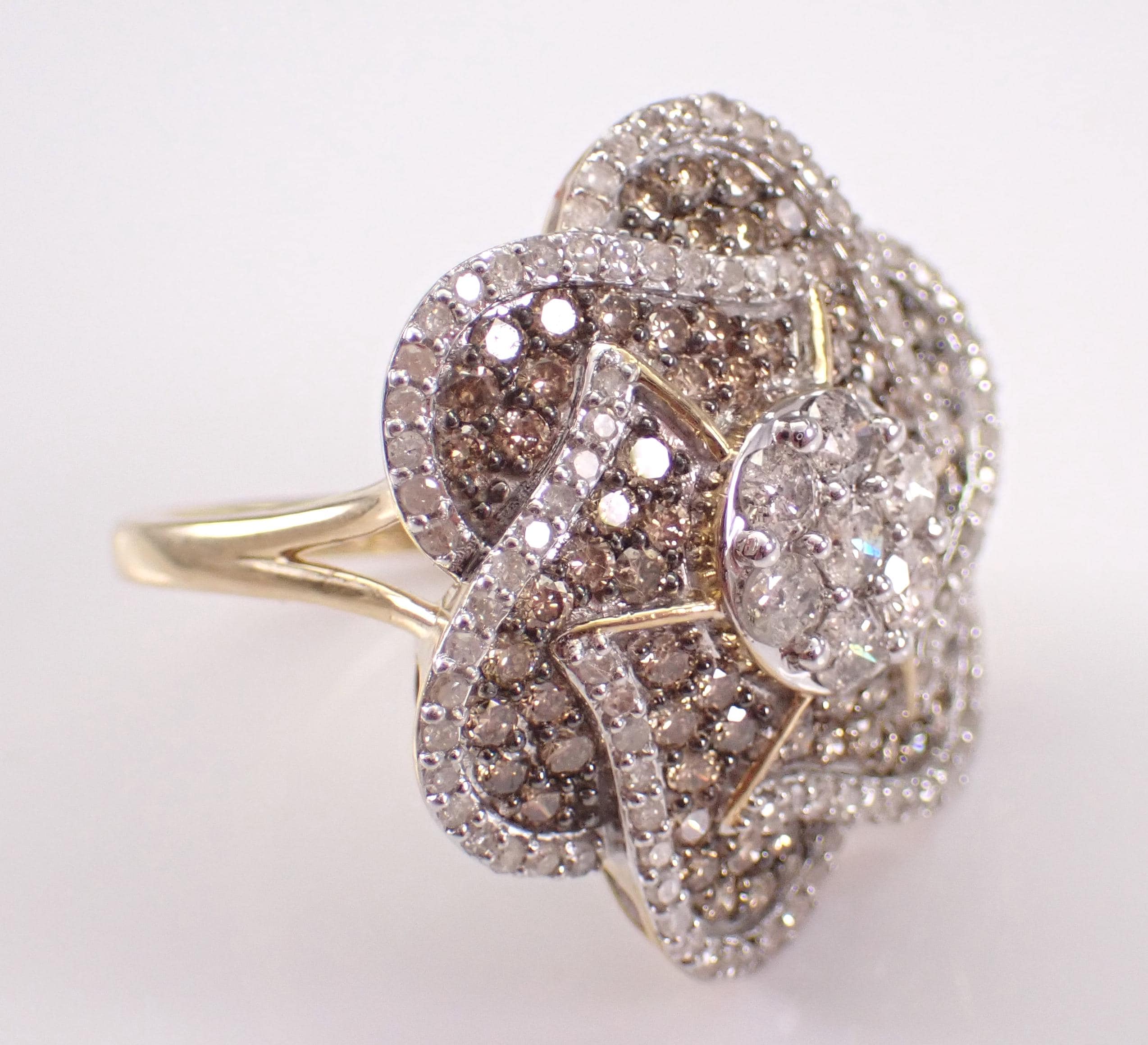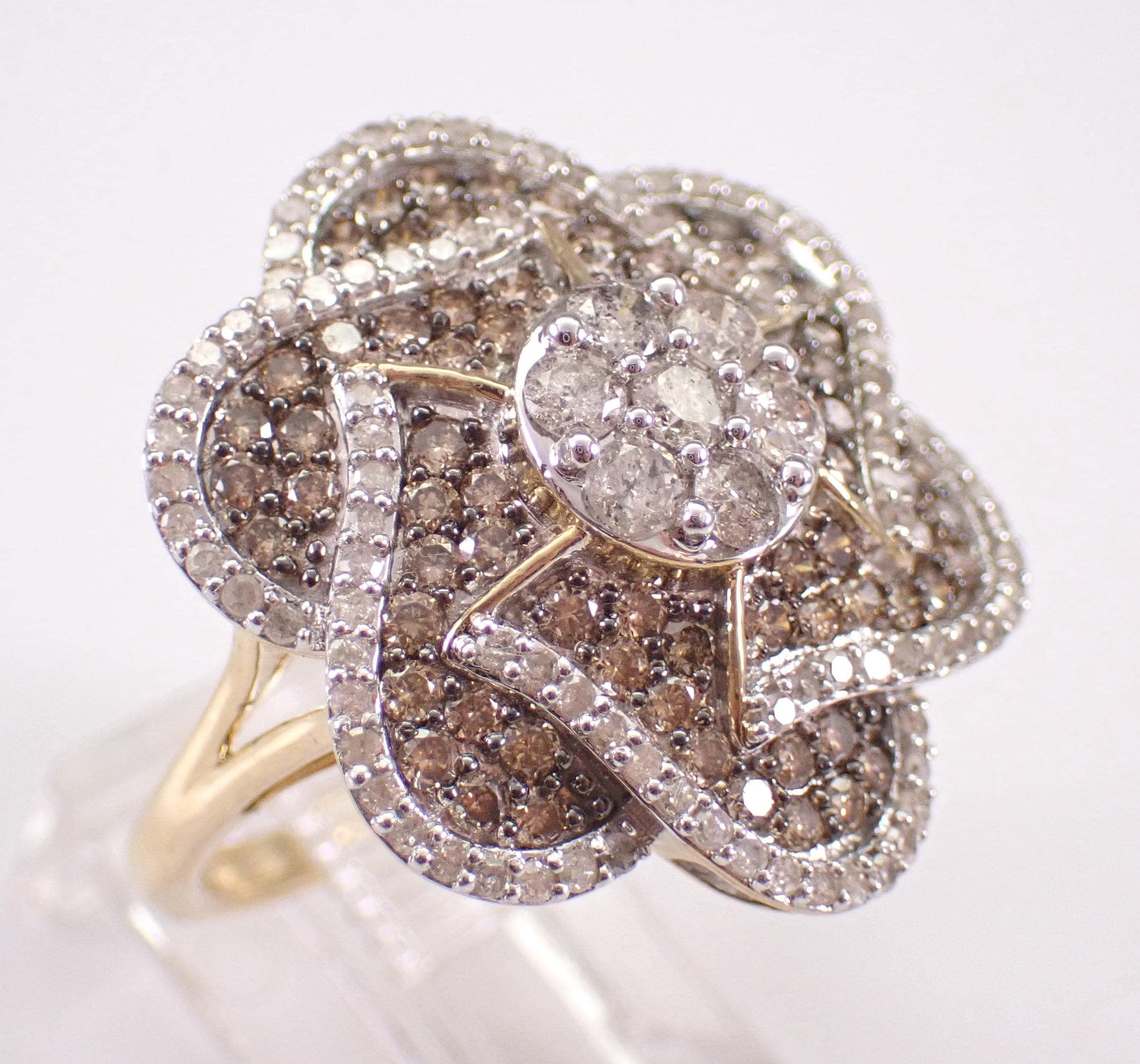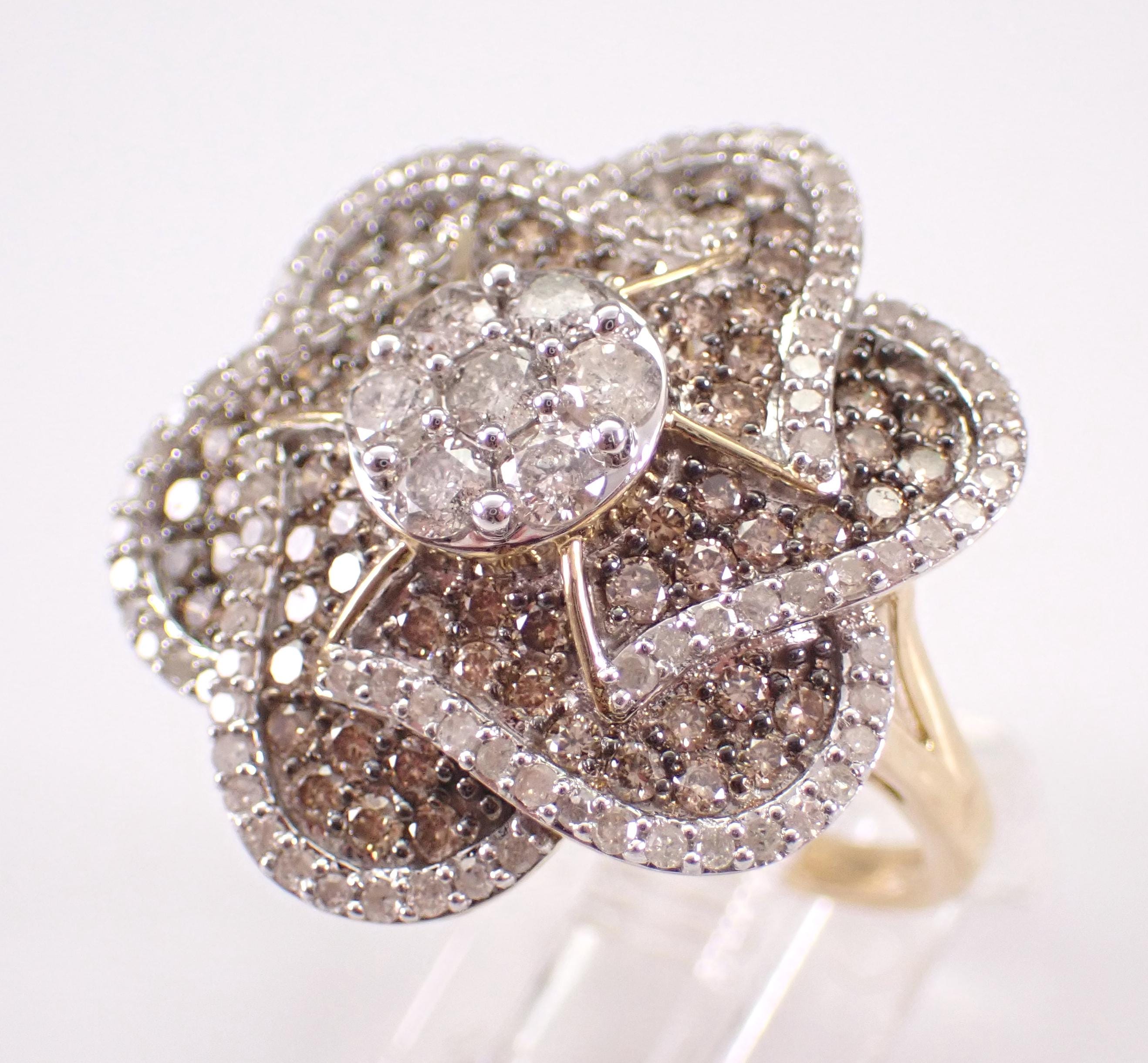 Yellow Gold Brown and White Diamond Flower Ring. This ring is set with seventy-two natural Round Brilliant Brown colored Diamonds and one hundred and three (103) genuine Round Brilliant White/Colorless Diamonds. These diamonds are J color (white diamonds), I1 clarity and weigh a total of 2 carats. This ring is 10KT Yellow Gold, weighs 6.6 grams, the top of the ring measures 24 X 22 mm and is a finger size 7, which can be sized free of charge (please inquire about sizing with the finger size you need). The ring will be accompanied by an appraisal by a GIA Certified Diamond Grader with the retail replacement value of $3,895.00. I will ship this ring promptly in a gift box.