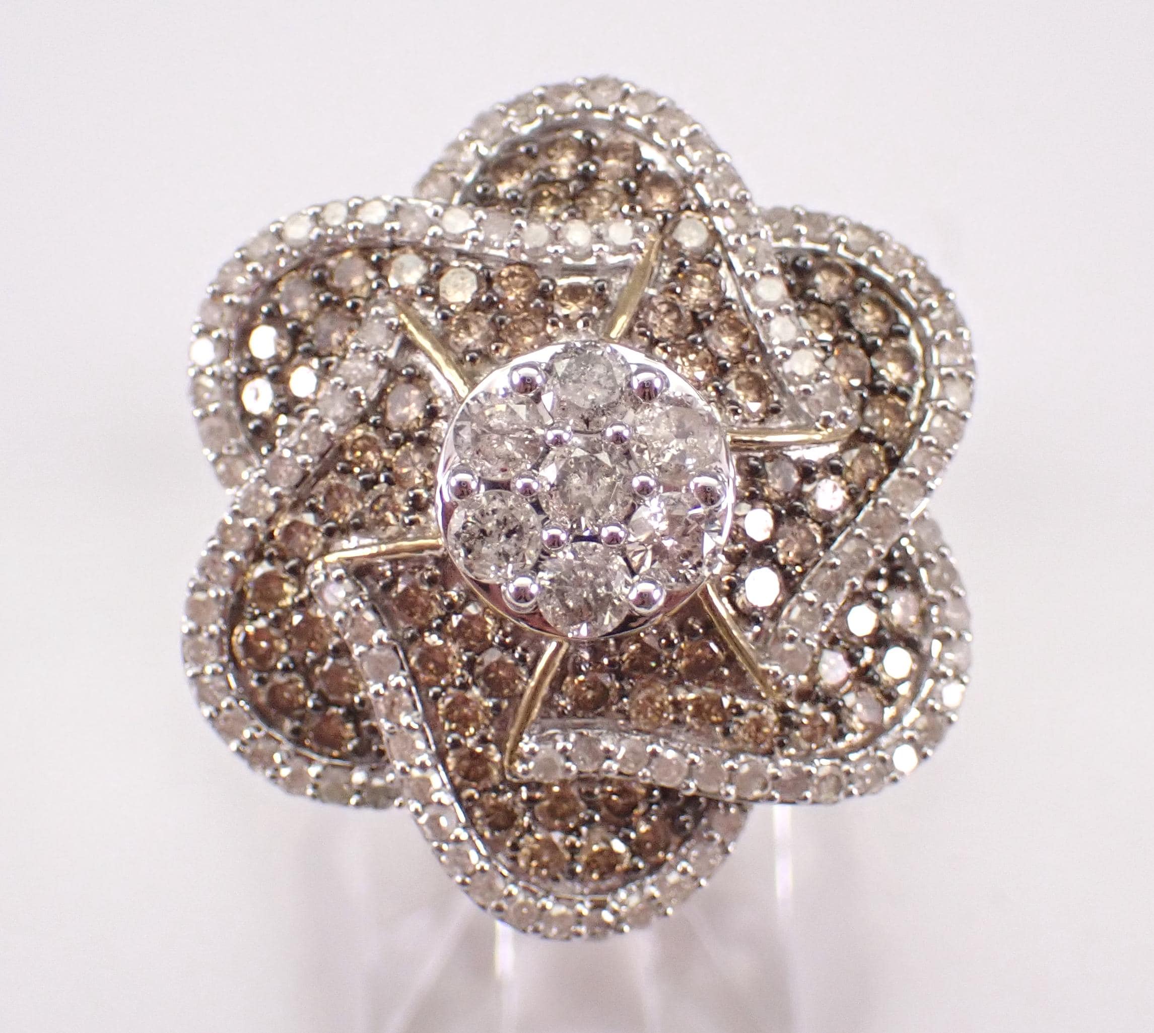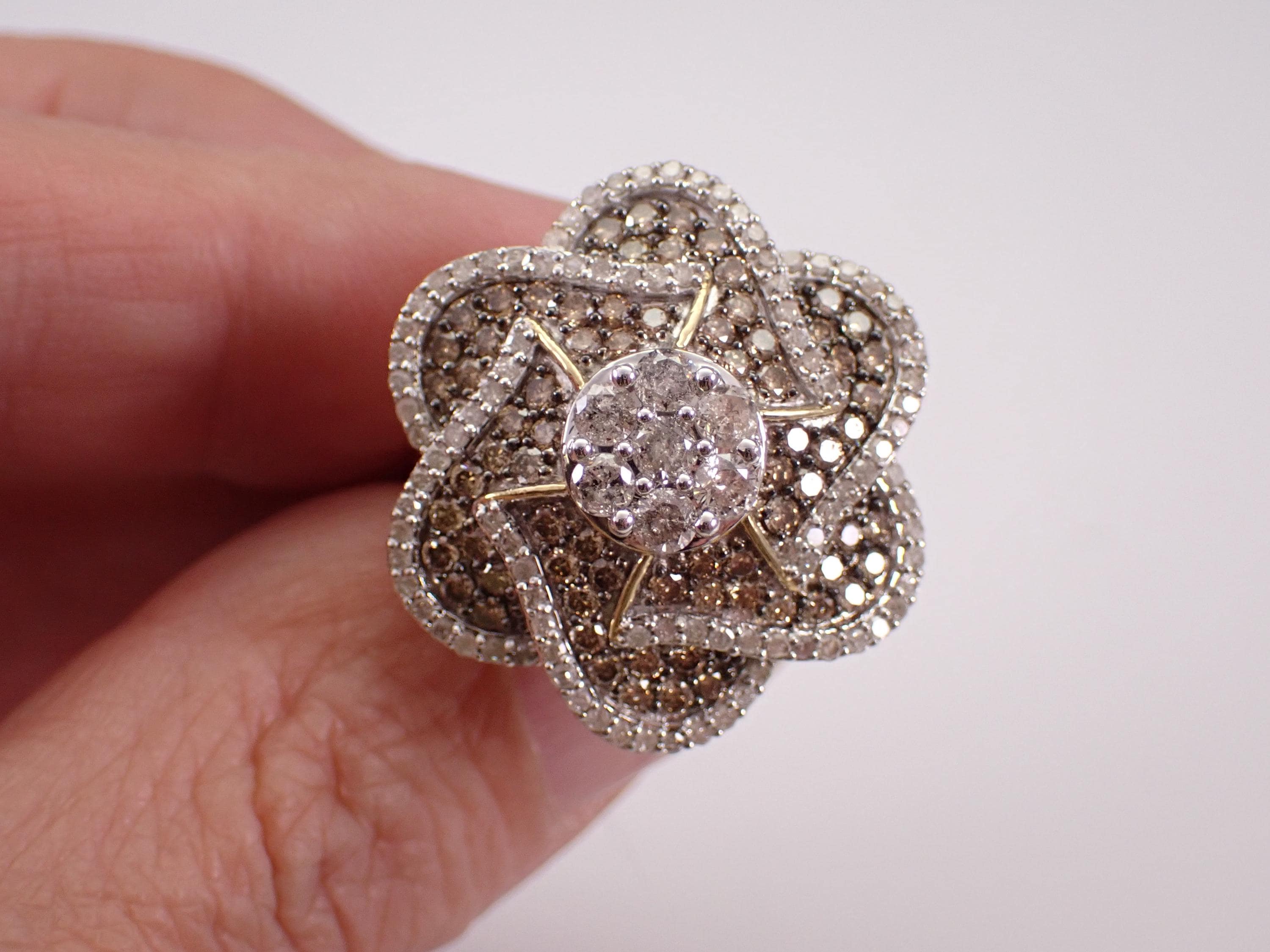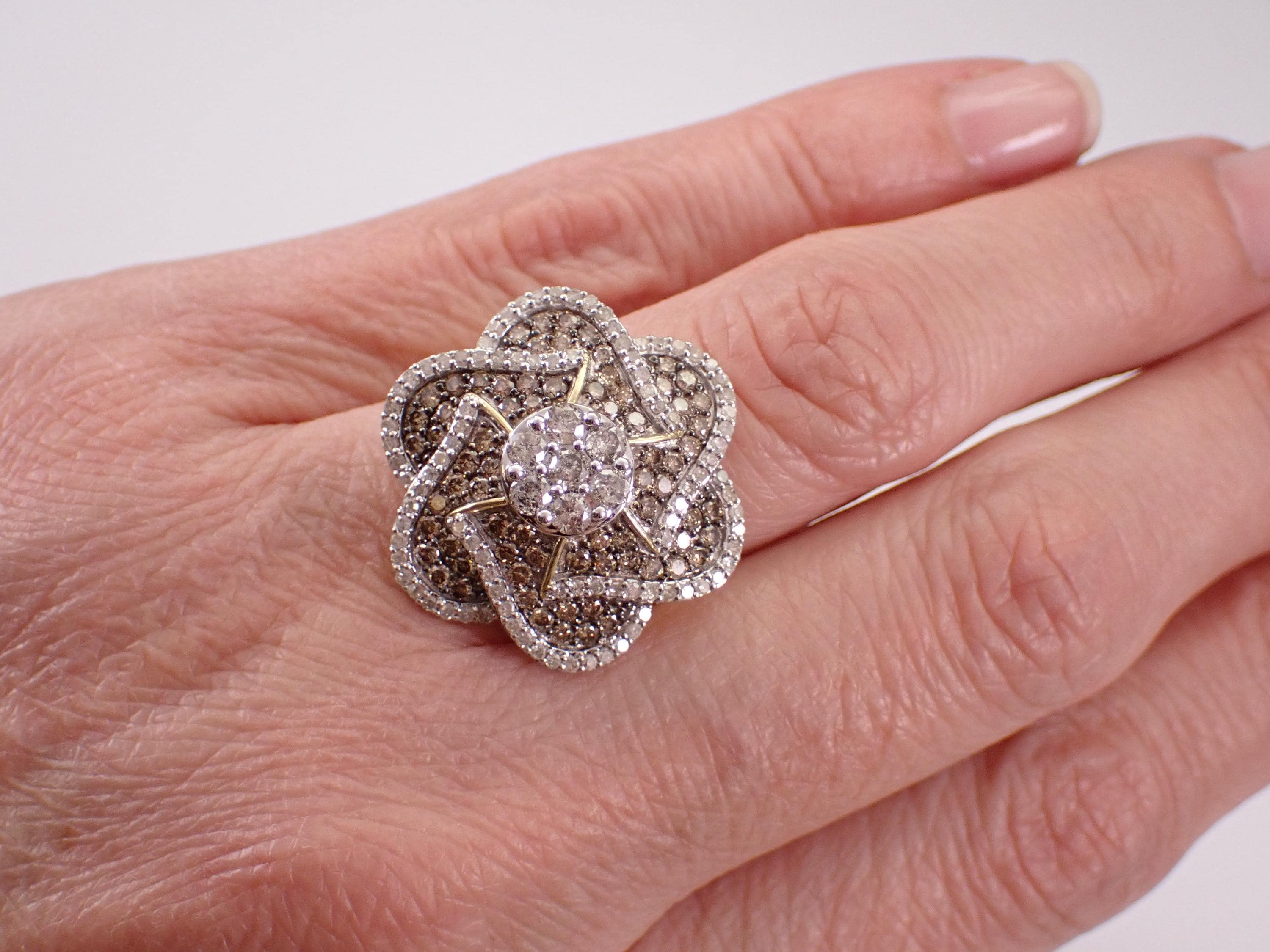 Yellow Gold Brown and White Diamond Flower Ring. This ring is set with seventy-two natural Round Brilliant Brown colored Diamonds and one hundred and three (103) genuine Round Brilliant White/Colorless Diamonds. These diamonds are J color (white diamonds), I1 clarity and weigh a total of 2 carats. This ring is 10KT Yellow Gold, weighs 6.6 grams, the top of the ring measures 24 X 22 mm and is a finger size 7, which can be sized free of charge (please inquire about sizing with the finger size you need). The ring will be accompanied by an appraisal by a GIA Certified Diamond Grader with the retail replacement value of $3,895.00. I will ship this ring promptly in a gift box.