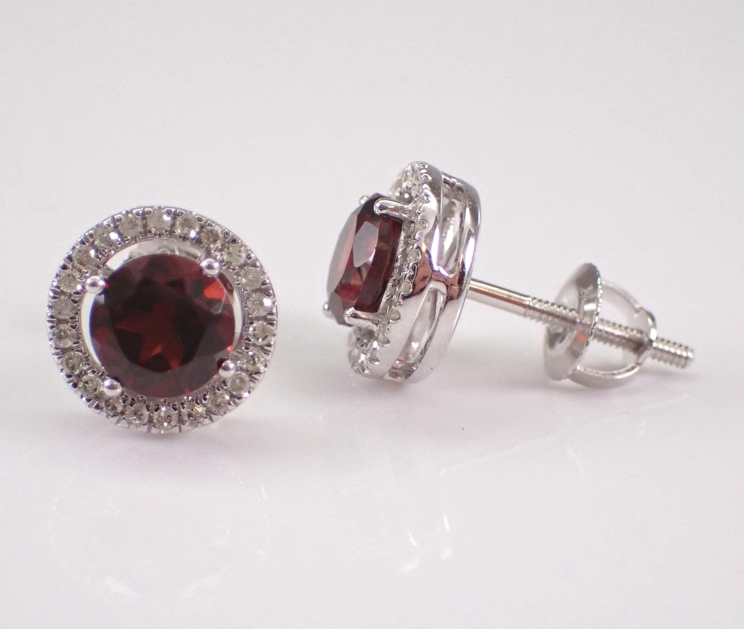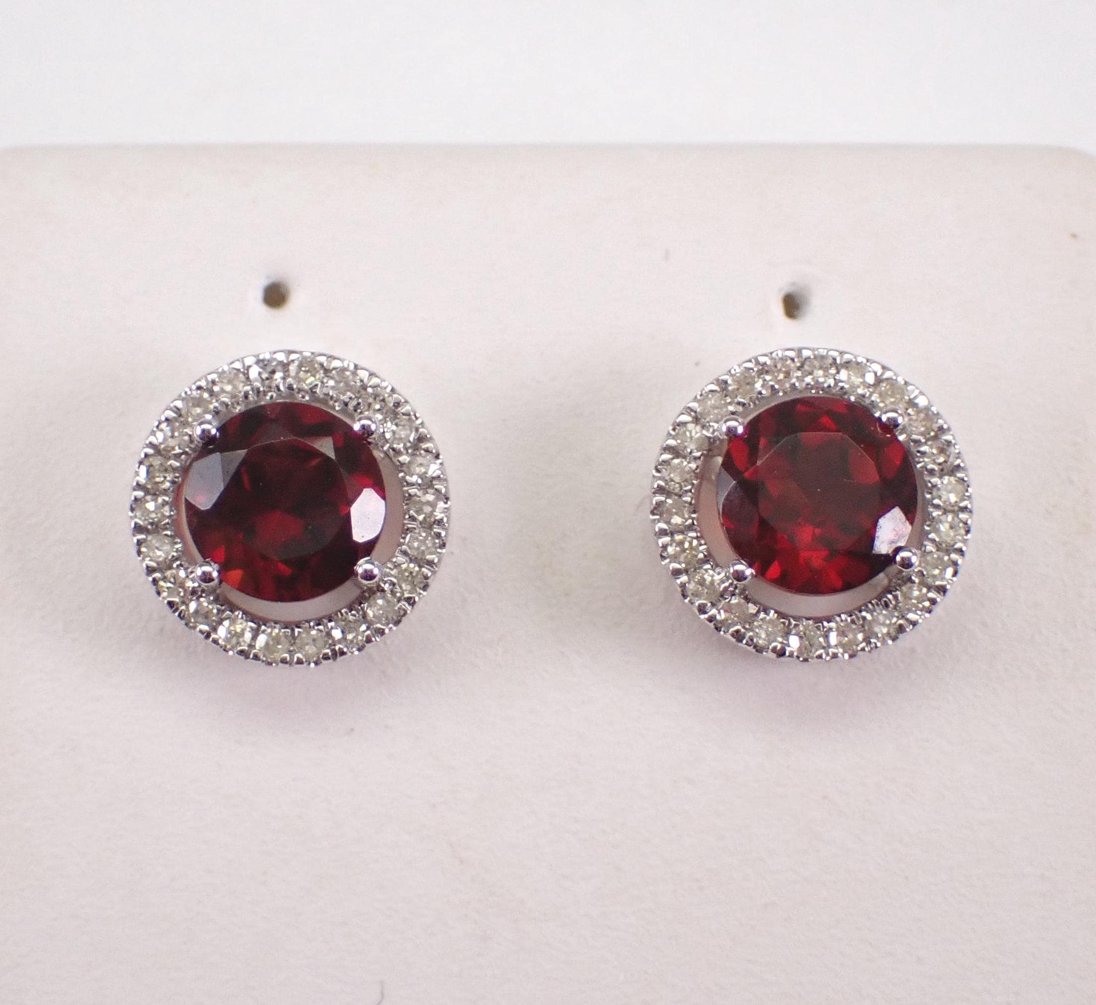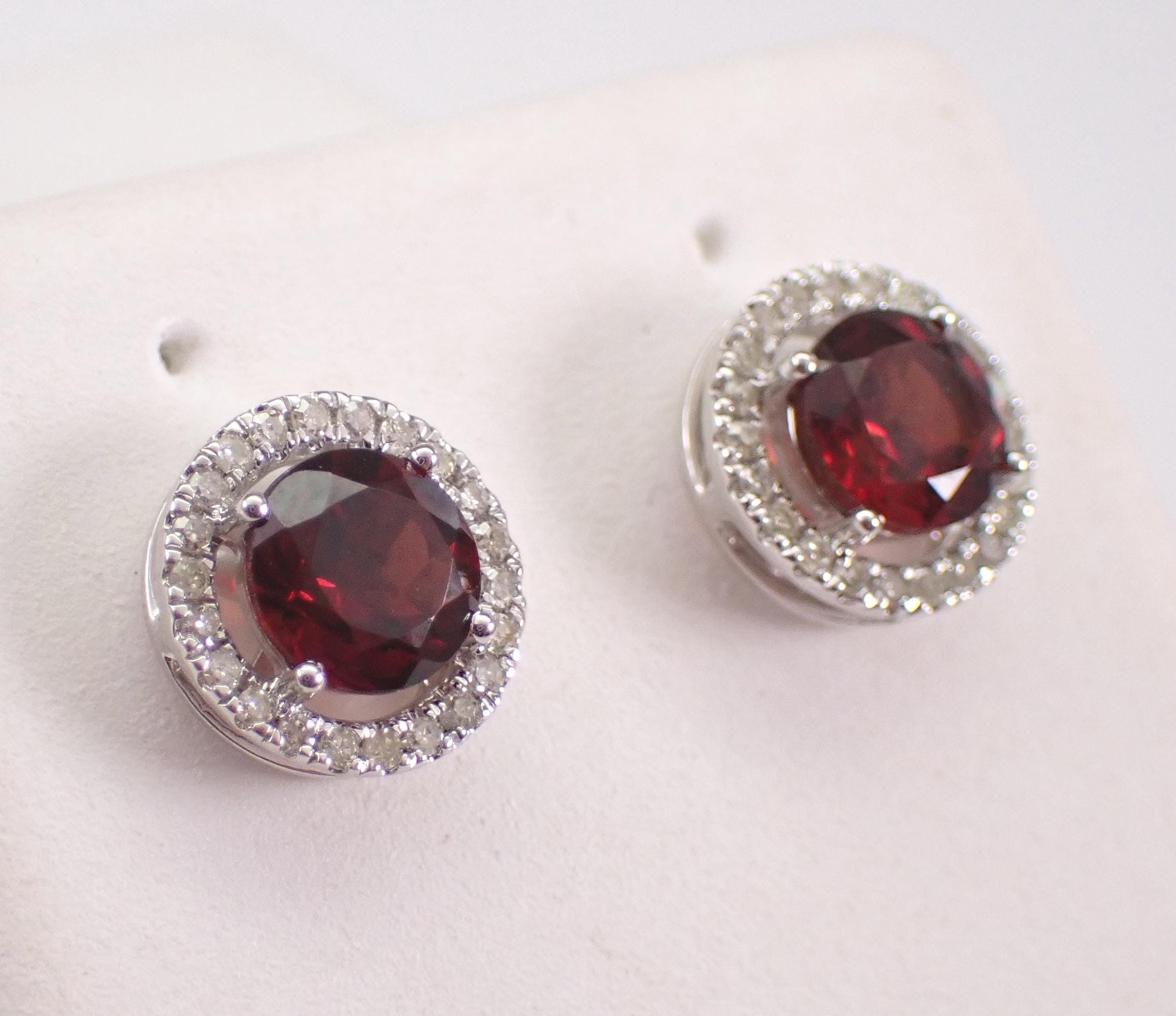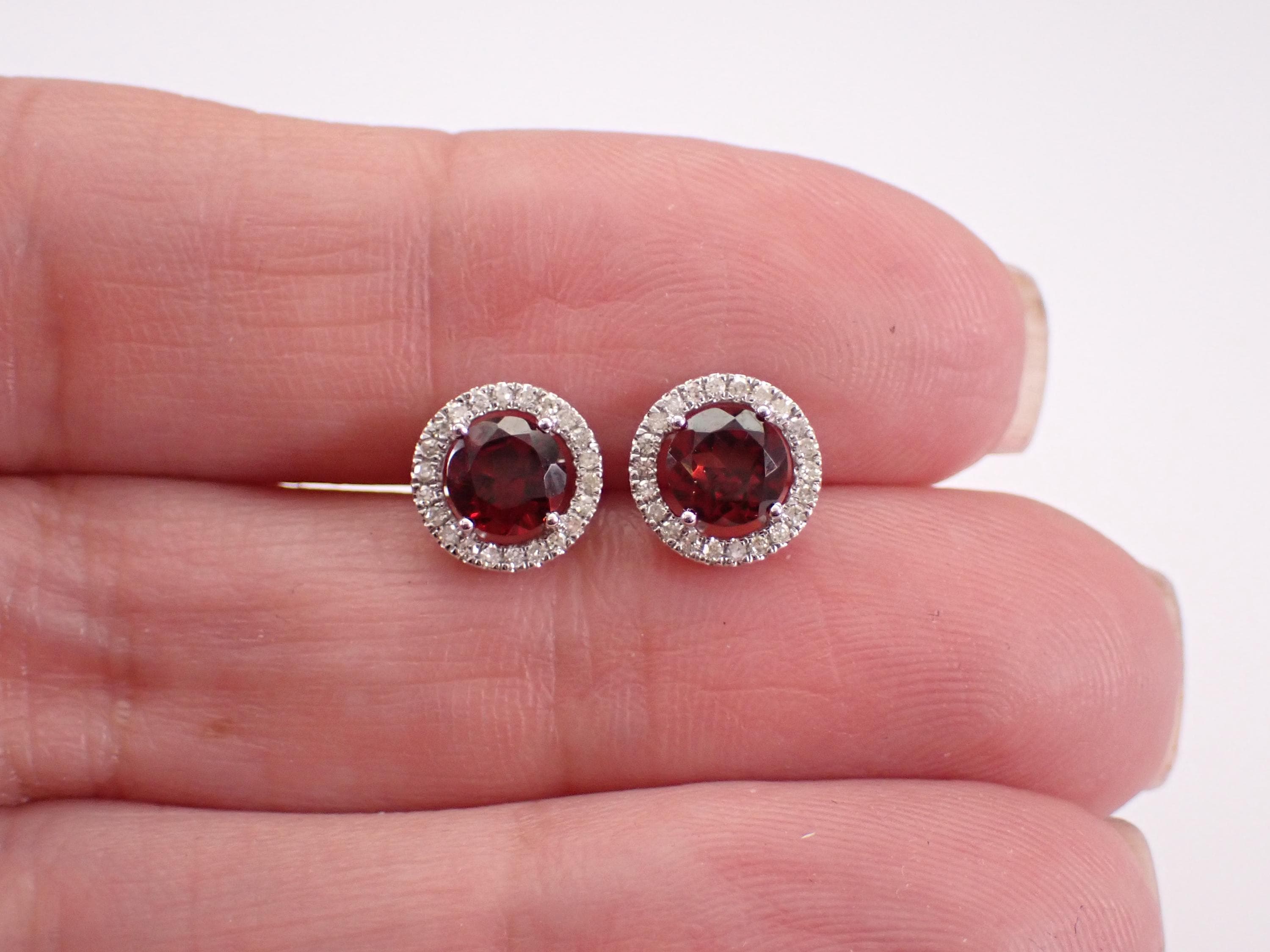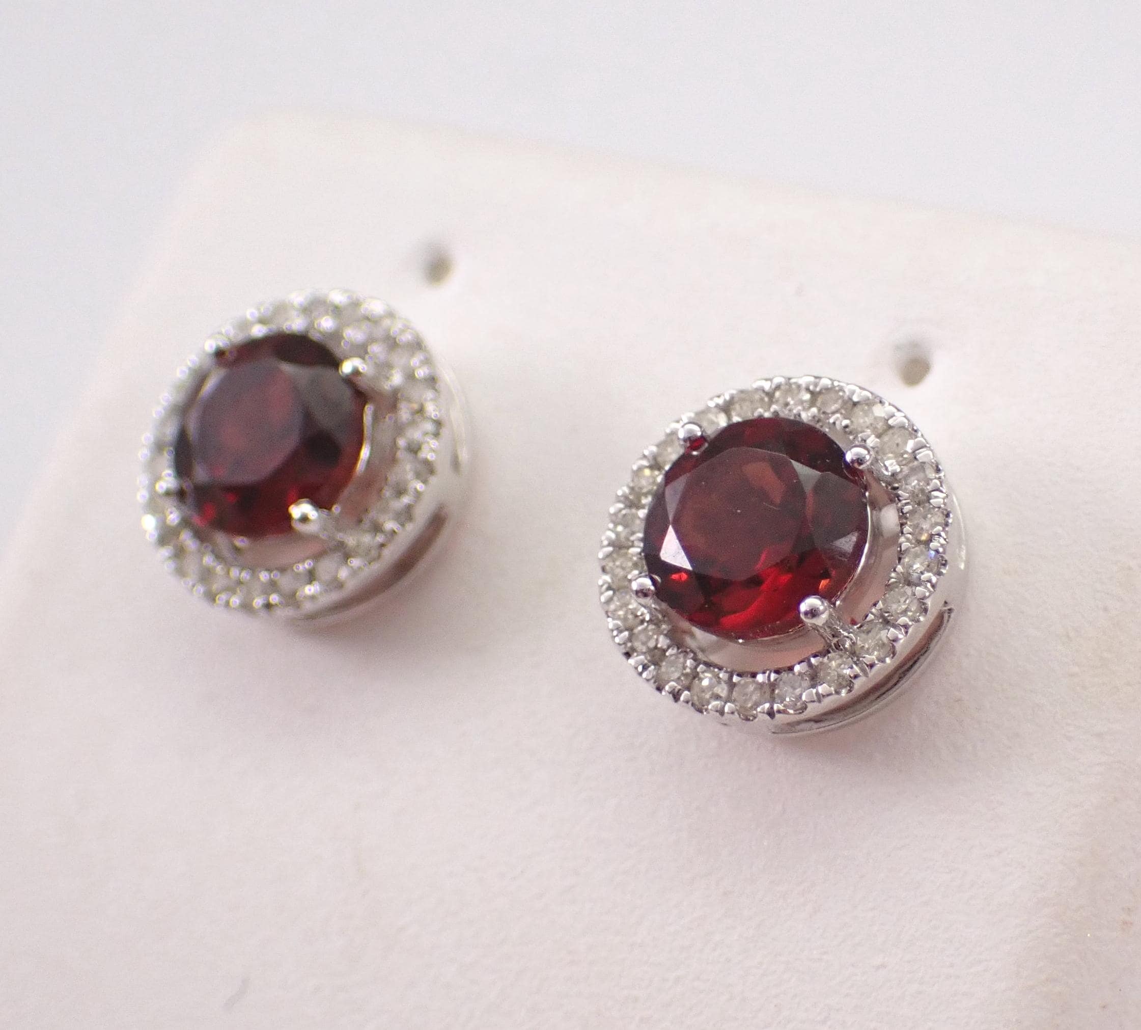 White Gold Diamond and Garnet Halo Stud Earrings.