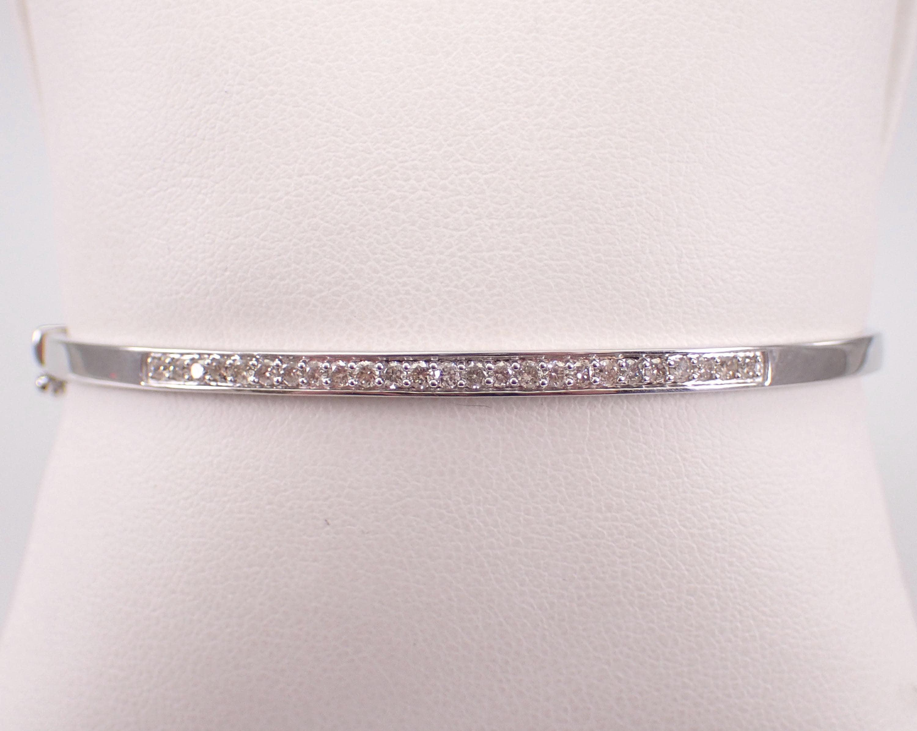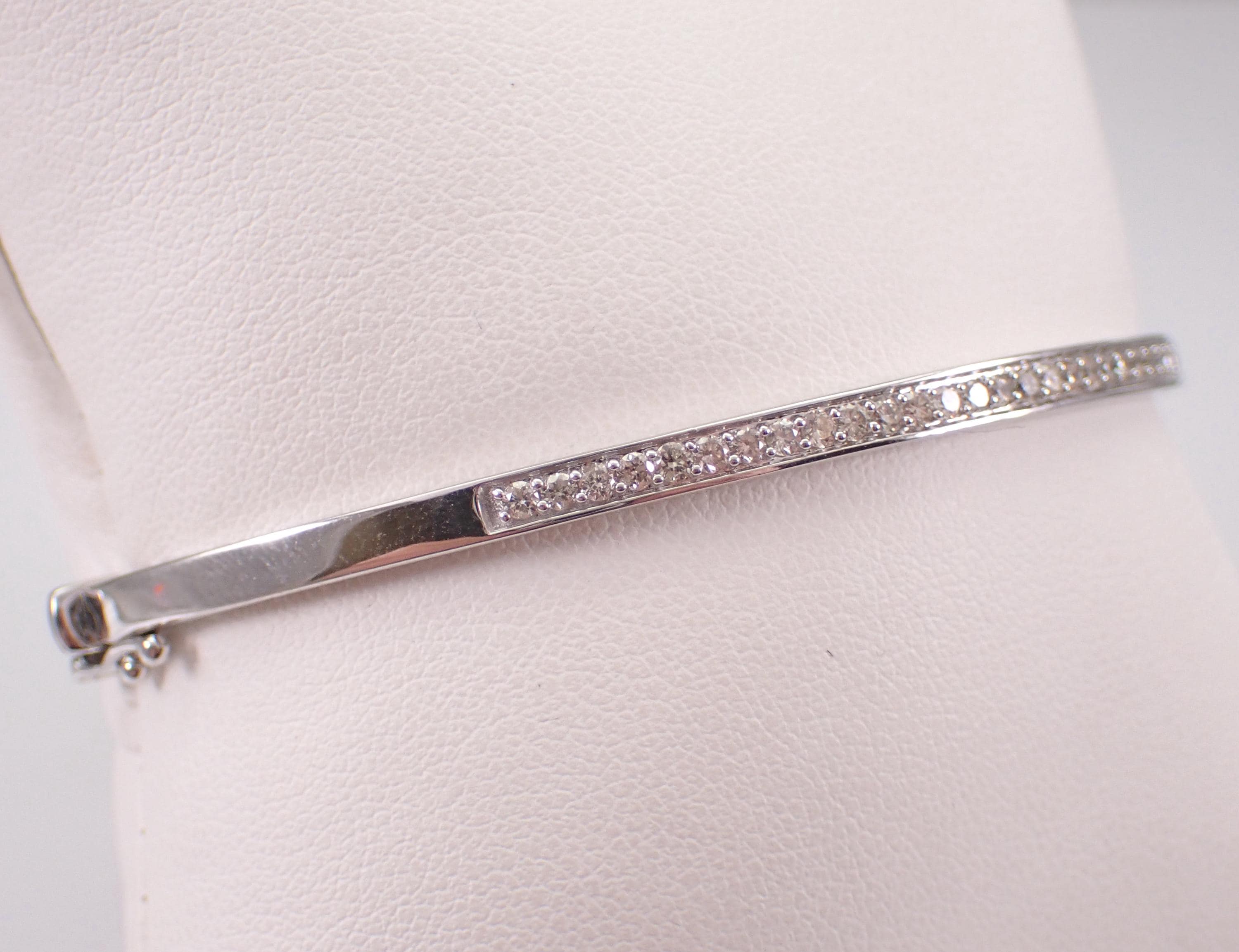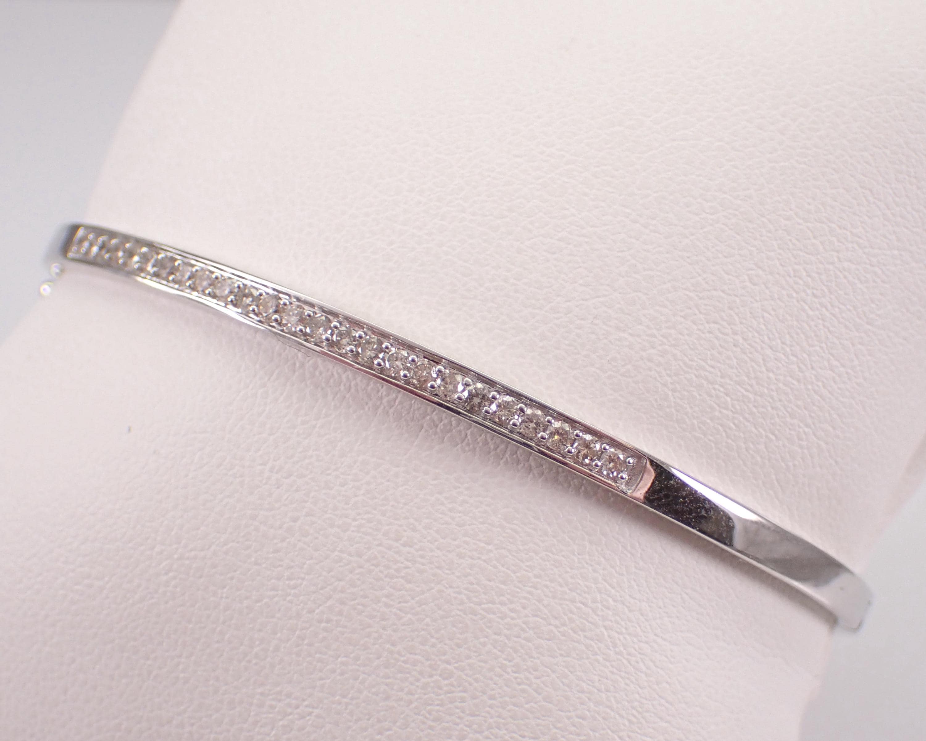 White Gold Diamond Bangle Bracelet. This bracelet is set with twent-five natural Round Brilliant Diamonds. These diamonds are H/I color, SI/I1 clarity and weigh a total of 1/2 carat. This bracelet is 10K White Gold, weighs 7.3 grams, measures 3 mm in width and fits a ladies wrist measuring 7". This bracelet will be accompanied by an appraisal by a GIA Certified Diamond Grader with the retail replacement value of $2,895.00. I will ship this bracelet promptly in a gift box.
