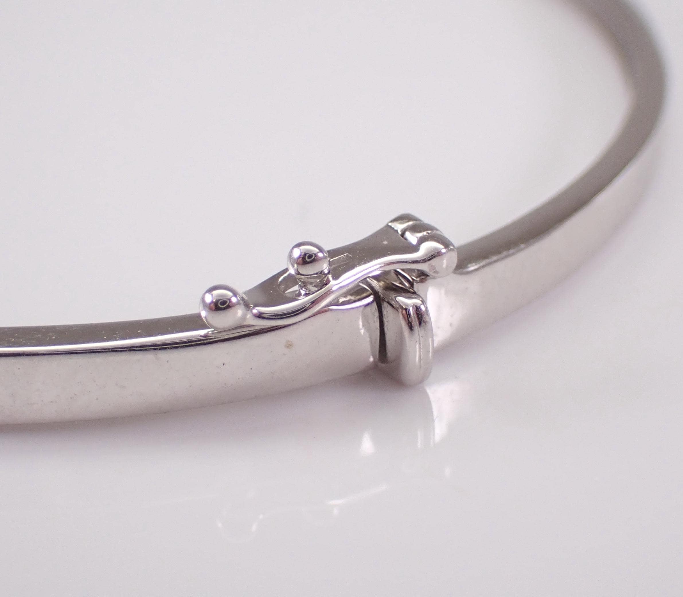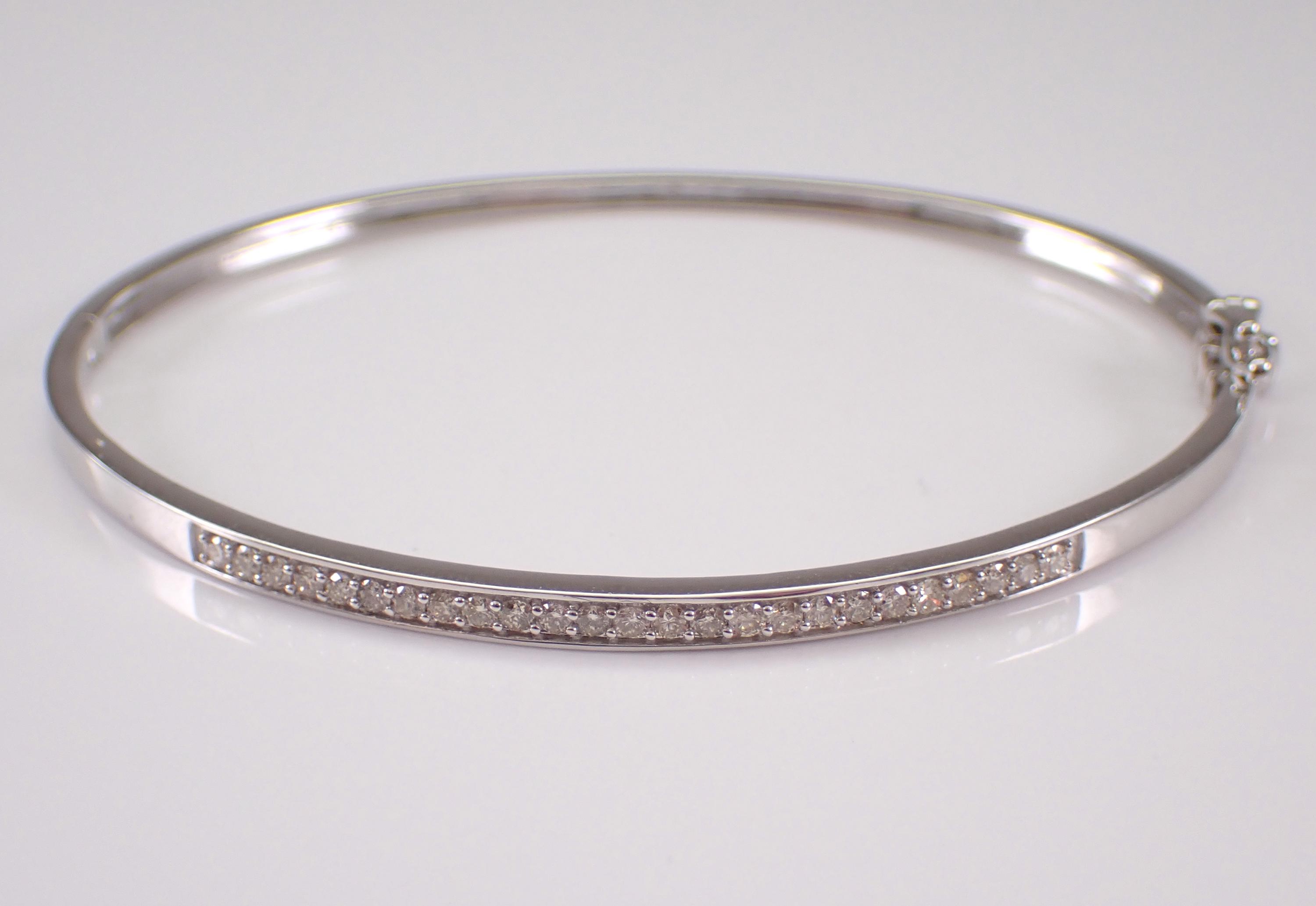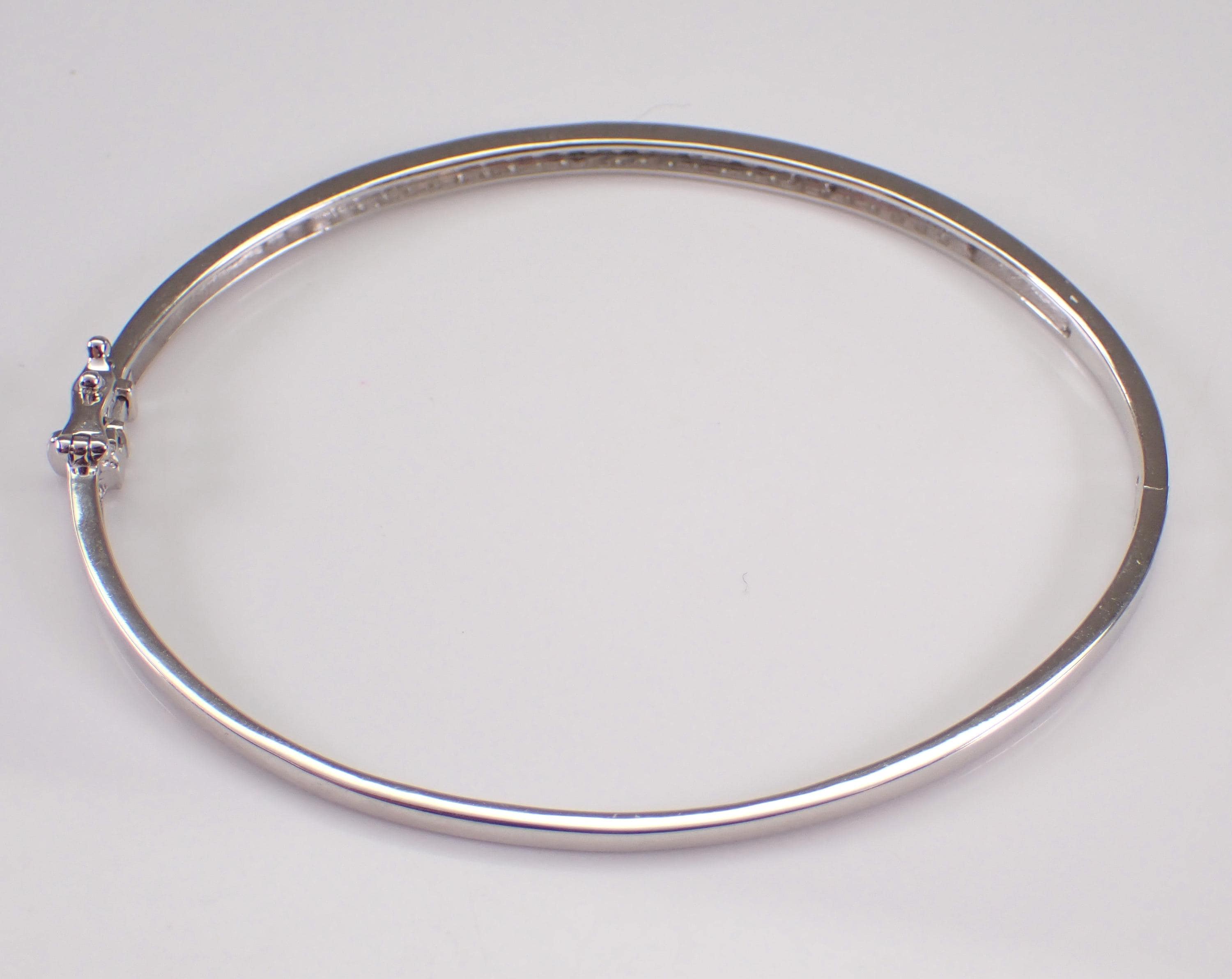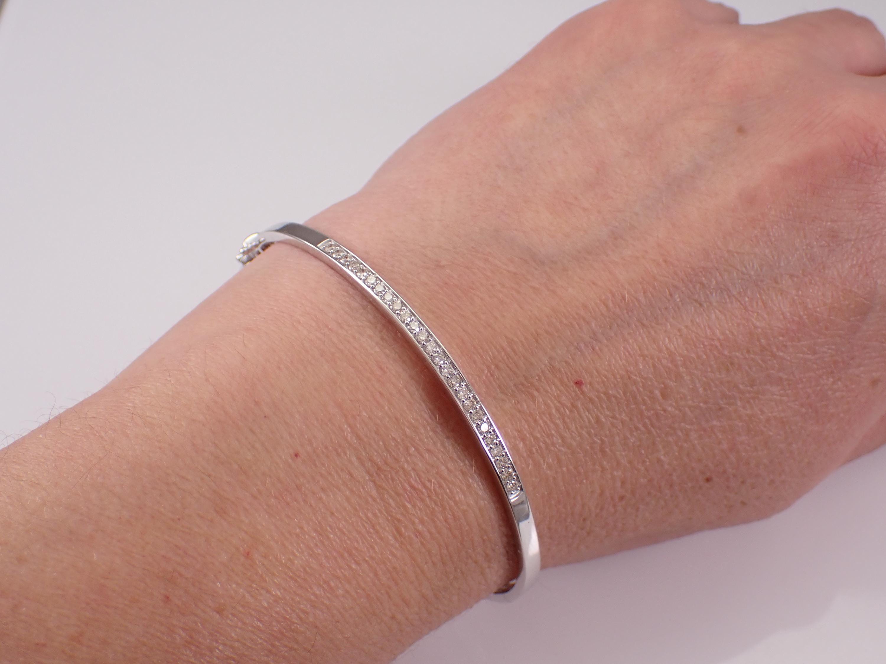 White Gold Diamond Bangle Bracelet. This bracelet is set with twent-five natural Round Brilliant Diamonds. These diamonds are H/I color, SI/I1 clarity and weigh a total of 1/2 carat. This bracelet is 10K White Gold, weighs 7.3 grams, measures 3 mm in width and fits a ladies wrist measuring 7". This bracelet will be accompanied by an appraisal by a GIA Certified Diamond Grader with the retail replacement value of $2,895.00. I will ship this bracelet promptly in a gift box.